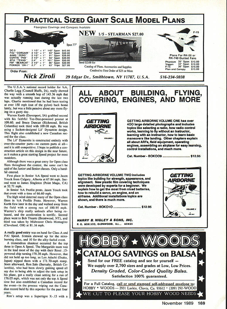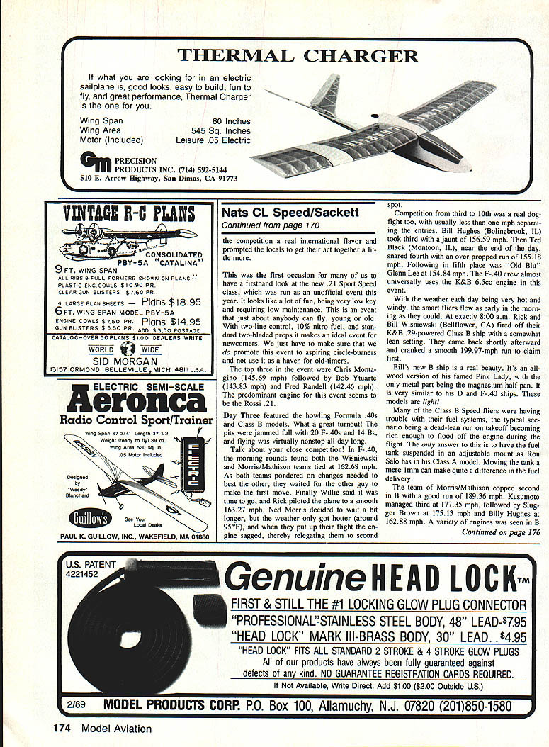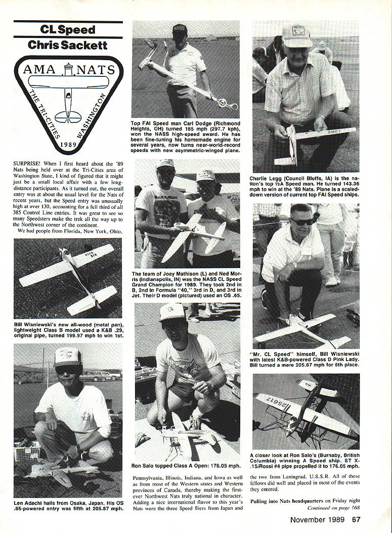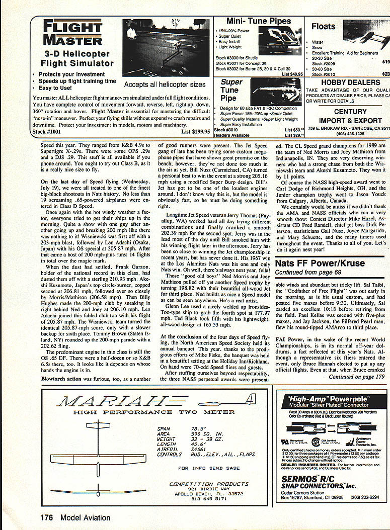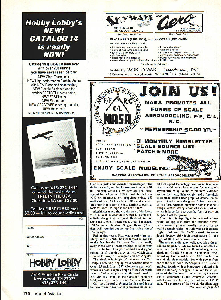 CL Speed Chris Sackett SURPRISE first heard about 89 Nats being held over Tn-Cities area Washington State kind figured might just small local affair few longdistance participants As turned out overall entry about usual level Nats recent years Speed entry unusually high over 130 accounting full third 385 Control Line entries great see Speedsters make trek way up Northwest corner continent people Florida New York Ohio Bill Wisniewskis new all-wood metal pan lightweight Class B model used K&B 29 original pipe turned 19997 mph win 1st Len Adachi hails Osaka Japan OS 65-powered entry fifth 20587 mph team ot Jocy Mathison L Ned Mor ris Indianapolis IN NASS CL Speed Grand Champion 1989 took 2nd B 2nd Formula 40 3rd D 3rd Jet D model pictured used 05 65 Pennsylvania Illinois Indiana Iowa well Western states Western provinces Canada thereby making firstever Northwest Nats truly national character Adding nice international flavor years Nats three Speed fliers Japan Mr CL Speed himself Bill Wisniewski latest K&B-powered Class D Pink Lady Bill turned mere 20587 mph 6th place closer look Ron Salos Burnaby British Columbia winning Speed ship ST X 15/Rossi #4 pipe propelled 17605 mph two Leningrad USSR fellows did well placed events entered Pulling Nats headquarters Friday night Continued page 168 November 1989 67 Top FAI Speed man Carl Dodge Richmond Heights OH turned 185 mph 2977 kph won NASS high-speed award has fine-tuning homemade engine several years now turns near-world-record speeds new asymmetric-winged plane Charlie Legg Council Bluffs IA na tions top 1/2A Speed man turned 14336 mph win 89 Nats Plane scaleddown version current top FAI Speed ships /7 Ron Salo topped Class open 17605 mph out watch get involved Combat real hit terms success midairs Nats CL Carrier/Mazur Continued page 66 Senior winner Class Rick Humphries flew K&B 40-powered Vigilante unusual model prop-driven imitation Navys jetpowered carrier-based bomber/reconnaissance supersonic craft looked very sharp Sportsman Profile Carrier held unof ficial event rules same AMA Profile Carrier event intended ginners experienced people simply dont choose pursue sport its ultimate performance levels Entry open anyone didnt enter AMA Carrier events eight people signed up Art Johnson won Melton-designed Guar dian powered K&B 58 high speed 22 seconds close Open Profile fliers Arts low speed 94 seconds gave him 2301 points Art followed Dave Carlson lightweight Guardians using Webra Speed 28 power total 2128 points Third 2015 points Glenn Salter using Midwest kit Airabonita Fox Mk VI power Sportsman allows contestants innovate thats what John Hall did entered F8U Crusader all-flying tail wing pops up leading edge full-scale Crusader wing does too increase gle attack low-speed flight worked well enough take fourth place clearly has potential 168 Model Aviation unofficial 15 Profile event held using Denver rules similar AMA Pro file except 15 engine size maximum 75mph cap high-speed scoring purposes prohibition movable devices except el evator tail hook Gerry Deneau won original Dauntless model published November 1984 issue Model Aviation Cox Conquest 15 gave him 242-second high speedvery close limiting 24-second 75 mph optimum 70second low-speed flight netted him score 1978 Melvin Schuette flying original Curtiss XFl3C right behind him great lowspeed time 92 seconds 1939 points Art Johnson flying Deneau Dauntless third 1787 takes lot people put Carrier events Nats Event director Joe Just put gether team AMA events prepared de tails months made run smoothly Joes team consisted John Hall spent two days center circle watching pilots violate J0 nose-up-angle limit Stan John son pit boss Alice Gardner scorekeeper Rick Wallace Paul Rice Bill Tucker D Reinhart David Schultz unofficial events workers Marc Kevin Warwashana Carlos Aloise Brenda Schuette Stan Johnson Paul Rice Pete Mazur After official events over Navy Carrier Society held its annual meeting headquarters motel complete buffet din ner Eugene Ely Award given annually person greatest total score three official Nats Carrier events reoardless age class presented Pete Mazur Other business meeting included thank ing Joe Just other workers excel lent job running events discussion mufflers might included Carrier events local conditions might require agreement host Sportsman Profile Carrier event 1990 Nats Nats CL Speed/Sackett Continued page 67 about 730 pm greeted l02F temperatures Hey like Texas Nats up cool air Northwest Richland Kennewick Pasco Tn-Cities semi-arid basin much akin conditions found Southwest humid ran Midwest gang AMA HQ eat ing dinner Fred Randell Al Stegens Bill Bud Hughes Chris Montagino swap ping Speed stories other locals seems like drove way Man Thats long haul Speed site wasnt perfect although quite good flat level Speed pits big enough looked good Nats Speed kicked off Sunday July 16 /2A /2A Profile Proto day started out windy rainingwhat switch guys holding off hoping improved conditions later day didnt materialize Akeshi Kusumoto Japan showed up little FAL-style /2A flew very nicely its CS 049 engine single-bladed prop Unfor tunately control problem unable complete official flight model showed real promise erform ror iuPPERFO K&B tNGINES AirplaneMarine K&B FUtLSK&B GLOW PLUGS 9 Blends4 Choices Matched Finish System BEST APPEARANCE K&B FIBERGLASS CLOTH K&B Micro-Balloons FILLER K&B SUPER FOXY RESIN K&B SUPtR FOXY THINNER K&B SUPtR POXY PRIMtR K&B SUPER POXY PAINT K&B MIXING CUPS CLEAR PLASTIC FUSELAGE VELCRO FASTENING MATERIAL HKIT INCLUDES METAL LANDING GEAR STRUTS & CLAMPS ILSTL IllIUI 01% L t G Enterprises iallzlug Vacuum Formed Helicopter Fuselages er InquIries Invited Available Local Dealer Call Direct 23015 Del Lago # 8-2 na Hills CA 92153 our Orderlng/Wlessage Recorder 714 859-2030 J USA s national record holder Y2A Charlie Legg Council Bluffs IA really showed way smooth hop 14336 mph actually running lean during last two laps Charlie mentioned testing over 150 mp