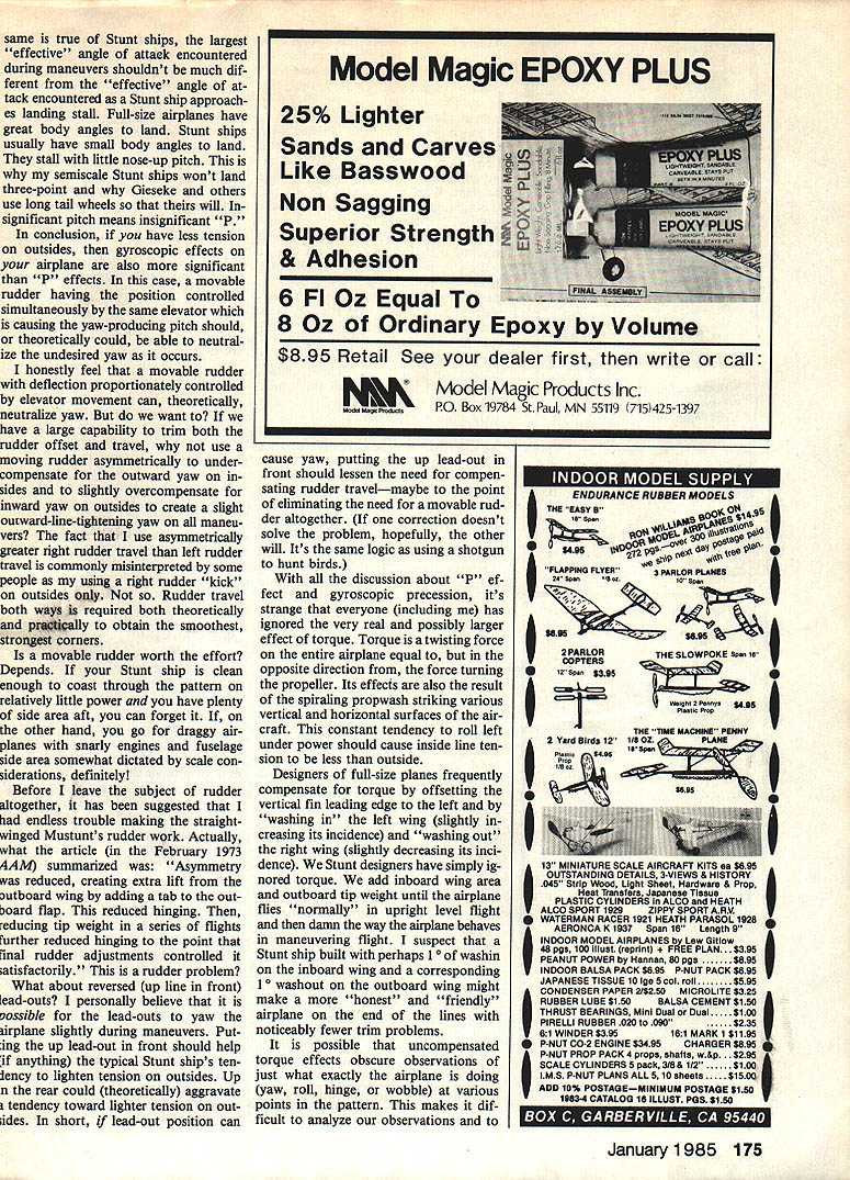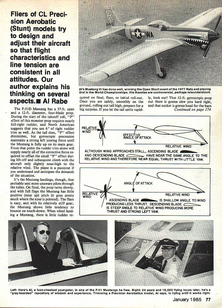 The author noted semiscale Precision Aerobatics models look great hands especially have outstanding contest record Sea Fury rearwon event 1972 1973 Nats Mustang Vwas 3rd 1974 Nats CL Stunt Design HEY GUYS long-stilled voice past Now like still somewhat controversial theories Stunt aerodynamics still think little misunderstood First have May 12 1982 employer Braniff went broke went 727 captain job airline paycheck liberal free time largely used build practice com pete Fortunately 1980 started video store something second hob Suddenly store became sole support Rabe family video hobby became 80-hour/week obsession effort survive financially Things better now Im back left seat new Braniff opening second video store Financial survival seems assured now two stores flying job doesnt appear Ill ever have time compete again Now Im about gone scene its difficult argue theories yeah theories never said exact science explain misunderstandings rebut feel Ive misquoted interest of us enjoy challenge breaking new Stunt ship saddle Im going summarize few previously-puhliied opinions offer some new ones Stunt trimming didnt always fly bent-wing dihe draled birds wiggly tails Several thousand flights very conventional Stunt ships convinced air planes yawed inward outside maneu vers particularly top outside squares top outside half square eight After talking other Stunt fliers decided experience unique set about trying explain correct tendency Like full-size plane pilots have nodding acquaintance both P ef fects gyroscopic precession full size airplane particular vividly demon strated both propeller effects 76 Model Aviation Fliers CL Preci sion Aerobatic Stunt models try design adjust aircraft flight characteristics line tension consistent attitudes author explains thinking several aspectsu Al Rabe F-51D Mustang has 37-ft span 12-ft diameter four-blade prop During start takeoff roll P effect monster prop requires nearly full-right rudder North American suggests use 6 right rudder trim well As tail rises P effect diminishes gyroscopic precession maintains strong left yawing force until Mustang fully up its main gear point rudder trim alone will supply nearly corrective force re quired offset small P effect dur ing lift-off subsequent climb aircraft slightly nose-high relative wind plane pussycat understand anticipate demands situation Its Mustang landings though probably sent unaware pilots through tulies final prop turns slowly full flaps Mustang has little positive nose up pitch goes pretty much nose pointed flare easy its relatively stiff gear Mustang shows little tendency bounce touch-dowit wheel land ing Mustang little rudder re quired final flare initial roll-out Once safely smoothly ground rolling out tail high prepare big surprise let tail settle rapidRELATiVE WIND ly look out 12-ft gyroscopic prop out gonna slew hard right sucker gonna head barn Continued page 174 f EFFEC1IVE ANGLE OFATTACK RELATIVE WfND ALTHOUGH WING APPROACHES STALL ASCENDING BLADE DESCENDING BLADE NEAR ThE SAME ANGLE TO THE RELATIVE WIND AND THEREFORE NEAR EQUAL THRUST WITH LITTLE YAW Left Heres Al fuzz-cheeked youngster P-51 Mustangs flew RIght 24 years 18000 flying hours later hes gray-bearded repository wisdom experience Trimming Precision Aerobatics model Al says trying until works right January1985 77 Als Mustang Vi has done well winning open Stunt event 1977 Nate placing 2nd World Championships theories controversial perhaps misunderstood ASCENDING BLADE HALLOW ANGLE TO WIND IS STEEP ANGLE TO RELATIVE WIND PRODUCING MORE ThRUST AND STRONG LEFT YAW ply doublers correct positions clamp rubberband place until dry Drill engine mounting holes land ing gear hole landing gear stop hole Use back-up piece wood avoid splintered exit hole Drill through engine area now fuselage can laid flat Keep drill right angle work Sand round corners Fuel proof engine area epoxy Assembly Slide main wing through fuselage wing slot sure wing positioned right angles fuselage both vertically horizontally Take time installation get correct satisfied give liberal ap plication thick CyA joint area like apply side time let ting dry doing other side Allow dry undisturbed make small fillets around wing/fuselage connection micro-balloons epoxy Wipe excess fillet material model let dry Drill holes through elevator ply doubler control horn Hinge elevator stabilizer using either small cloth hinges did own sewn hinges Insert elevator/stabilizer unit fuselage slot Make sure assembly both horizontally vertically square fuselage satisfied use CyA attaching fuselage Trial-fit fin/rudder rear fuselage Open up elevator cutout required ensure ease elevator movement Bevel rudder doublers sandpaper-covered dowel step satisfied fit align ment attach fin/rudder unit fuselage thick CyA sure sand bottom rudder match fuselage secure thick CyA surface filling repair dings final sanding Finish model like painted dope used self-stick trim sheet high lights original trim pattern shown plan use desired Form landing gear shape cut landing gear stop size Insert landing gear through fuselage landing gear stop its position Rub berband together Attach slim-type wheels favorite wheel retainers Make sure wheels rotate freely Bolt bellcrank mount Attach nylon control horn elevator doubler shape attach pushrod Shape glue tailskid bottom fuselage epoxy Attach braided cable control line leadouts bellcrank thread through ply lead-out guide make ends finished loops Glue outboard wing tip weight place thick CyA Pre-flight check model bal anced shown plans check see have equal amount up down elevator movement Select con trol horn hole provides control response want Eyeball finished model angles Check make sure nothing warped lopsided critical look over work anything looks could use bit extra work before going fly Flight time Take completed Sundancer flight lines handle battery fuel head out favorite flying site some fun Dont surprised fellow modelers walk over admire plane because has character