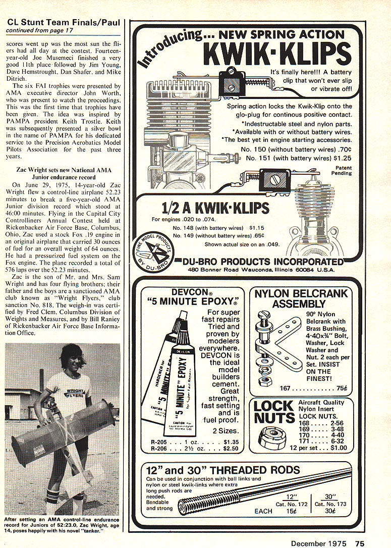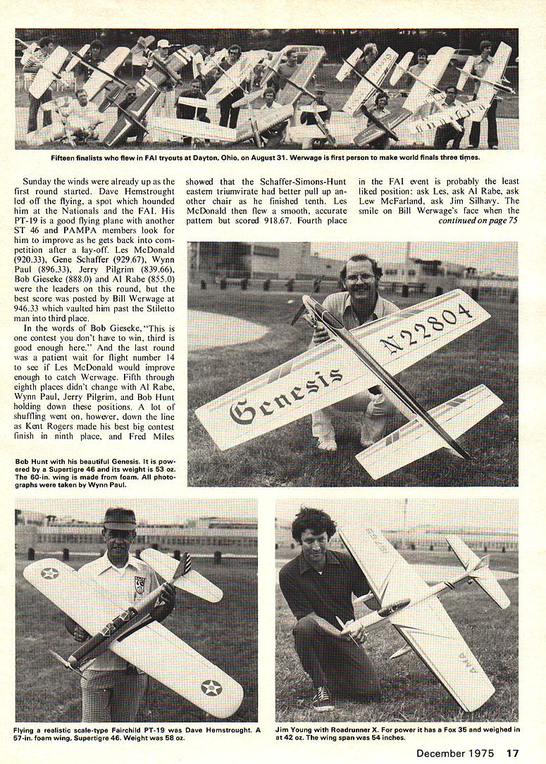 CL Stunt Wynn Paul FAI Team Finals STUNT FLIERS take note can fly backwards still win contest Clockwise-flying Gene Schaffer has abundance second-place finishes national meets won first big title piled up 188067 points August 31 FAT tryouts Dayton Ohio will lead United States team Holland 1976 World Championships Gene new airplane 47-ounce version time-tested Stunt Machine called Statesman power Supertigre 46 plane has very slim silhouette judges seemed able spot often enough awarded points New York style hard corners small figures World Champion four-time Na tional Champion Bob Gieseke flew rain Saturday able pass last flight spot cinched team What else Fox 35 up front Gieseke version Nobler steady combination put Bob team sixth time plane built 1974 utilized wing 1968 airplane real battle third place developed between two-time world champion Bill Werwage pride Miami Fla Les McDonald selection went down 14th flight 15 finalists last day Les tried pick up 21 points needed catch Bill Flying 1972 USA-I Werwage made fourth berth team will get chance come first person World Champion three times won 1970 1972 Bill started summer flying 35-powered Ares switched old plane July after deciding plane would win him Twenty-one contestants showed up Daytons two circles tryouts Keith Trostle PAMPA president acted event director flawless administration applauded contestants Judges Bernie Ash Jim Fasimpaur Bob Gialdini Roger Greene Jerry Phelps have combined total years stunt would make football veteran George Blanda en vious flying consisted two flights day best flight day being added total score procedure World Champion ships Saturday opened up Bob Hunt Greenbrook NJ leading early fliers 815 Bob flying Genesis foam wing ST 46 53 ounces Next came Al Rabe forced fly 1972 rebuilt Sea Fury ST 60 has incorporated fuel pump big engine seems working well him Als flights always have spectators watching unique sound muffled 60 sight very big airplane doing tricks eye catching However score showed 85767 usually takes 900s make team Final Standings FAI Tryouts P1 Coututmut I Gene Sclsafter 2 Bob Gieseke 3 Bill Werwage 4 Lea McDonald 5 MRabe 6 Wynn Paul 7 Jerry Pilgrim 8 Bob Hunt 9 Kent Rogers 10 Fred Miles II Joe Musumeci Jr 12 Jim Young 13 Dsvellemstrought 14 Dan Shafer 15 Mike Ditrich New City NY Irving Tx Brooklyn Ohio Miami Fla Irving Tx Lexington Ky Dallas Tx Greesibrook Ni Charlotte NC Ossining NY Richardson Tx Greenville Tx Moncha Corner SC Clayton Ohio Erie Pa Peunts 185067 187267 186467 184333 176533 172667 164767 158700 150033 149833 141600 141267 140300 136600 135800 As wind started picking up some new FAT fliers put flights Kent Rog ers Dennis Duvall Gary McClellan Fred Miles Mike Ditrich Senior Bob McDonald scored five six hundreds Bob Gieseke went up started rain finished flight downpour fortunately him wind wasnt bad scored 93867 highest round After short delay Jim Young back national competition first time since 1972 flew good looking Roadrunner X 69867 followed Wynn Paul seemed have worked out engine problems Nationals Gene Schaf fer put up 92233 good second place Jerry Pilgrim flew 808 young Joe Musemeci AMA junior cham pion 6800 Les McDonald bumped Gene second 923 Bill Werwage took over fourth 91833 first round FAT usually gives good indication top five six have mathematical chance team year no exception As second round opened Saturday afternoon winds picked up about 10-15 mph intermittent calm spells Gieseke Gene Schaffer Al Rabe Wynn Paul Kent Rogers Fred Miles Mike Ditrich Joe Musumeci Dennis Duvall Gary McClellan Bob McDonald Larry Lauer raised scores show tough fliers event Nationals finalists Dennis Duvall 9th Remel Cooper 14th failed make 15 finalists cut After Saturday top six Gieseke Gene Schaffer Les McDonald Bill Werwage Al Rabe Wynn Paul 16 Model Aviation over Gene Schaffer stood first well-known Statesman power has 46 Supertigre Weight 47 02 flies clockwise circles 188067 points Finish simple attractive Tne eam seiecteo represent Unitees States ftemnerlandsin 1976 leftto right Gene Schaffer Bob Gieseke second Bill Werwage third foreground World Cup now possession country Twentyone contestants competed Sunday winds already up first round started Dave Hemstrought led off flying spot hounded him Nationals FAI P1-19 good flying plane another ST 46 PAMPA members look him improve gets back com petition after lay-off Les McDonald 92033 Gene Schaffer 92967 Wynn Paul 89633 Jerry Pilgrim 83966 Bob Gieseke 8880 Al Rabe 8550 leaders round best score posted Bill Werwage 94633 vaulted him past Stiletto man third place words Bob Gieseke contest dont have win third good enough last round patient wait flight number 14 see Les McDonald would improve enough catch Werwage Fifth through eighth places didnt change Al Rabe Wynn Paul Jerry Pilgrim Bob Hunt holding down positions lot shuffling went however down line Kent Rogers made best big contest finish ninth place Fred Miles showed Schaffer-Sirnons-Hunt eastern triumvirate better pull up other chair finished tenth Les McDonald flew smooth accurate pattern scored 91867 Fourth place FAI event probably least liked position ask Les ask Al Rabe ask Lew McFarland ask Jim Silbavy smile Bill Werwages face continued page 75 December1975 17 Fifteen finalists flew PAl tryouts Dayton Ohio August31 Werwage first person make world finals three times Bob Hunt beautiful Genesis pow ered Supertigre 46 its weight 53 oz 60-in wing made foam photo graphs taken Wynn Paul Flying realistic scale-type Fairchild PT-iS Dave Hemstrought 57-in foam wing Supertigre 46 Weight 58 oz Jim Young Roadrunner X power has Fox 35 weighed 42 oz wing span 54 inches CL Stunt Team Finals/Paul continued page 17 scores went up sun fli ers day contest Fourteenyear-old Joe Musemeci finished very good 11th place followed Jim Young Dave Hemstrought Dan Shafer Mike Ditrich six FAI trophies presented AMA executive director John Worth present watch proceedings first time trophies have given idea inspir