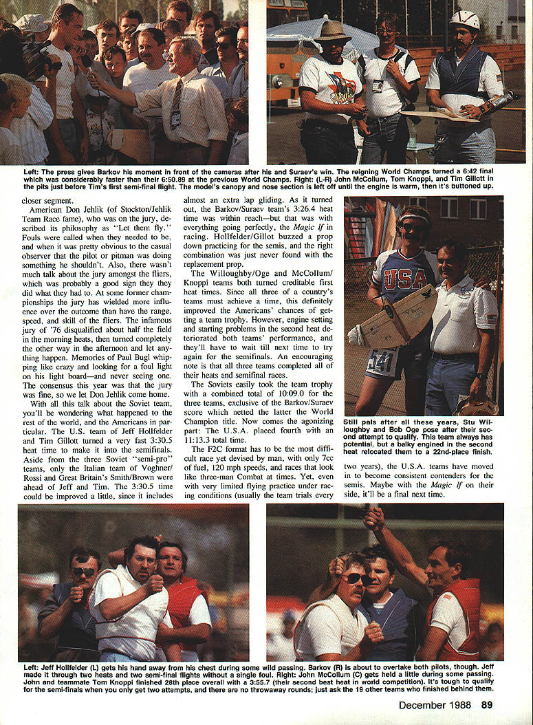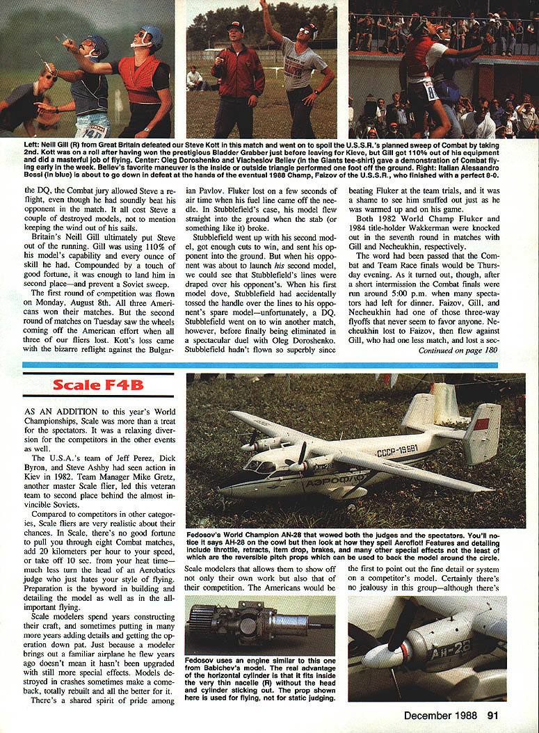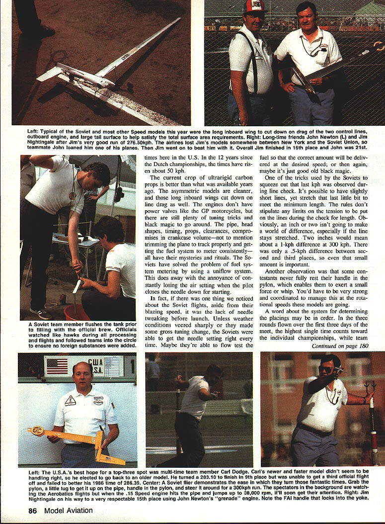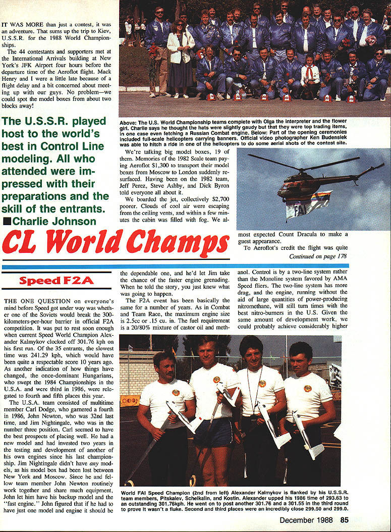 IT WAS MORE just contest adventure sums up trip Kiev USSR 1988 World Champion ships 44 contestants supporters met International Arrivals building New Yorks JFK Airport four hours before departure time Aeroflot flight Mack Henry little late because flight delay bit concerned about meet ing up guys No problemwe could spot model boxes about two blocks away USSWR played host worlds best Control Line modeling attended im pressed preparations skill entrants talking big model boxes 19 Memories 1982 Scale team pay ing Aeroflot $1300 transport model boxes Moscow London suddenly re surfaced Having 1982 team Jeff Perez Steve Ashby Dick Byron told everyone about boarded jet collectively $2700 poorer Clouds cool air escaping ceiling vents within few min utes cabin filled fog al ECharlie Johnson CL World Champs Speed F2A THE ONE QUESTION everyones mind before Speed got under way wheth er Soviets would break 300kilometers-per-hour barrier official F2A competition put rest soon enough current Speed World Champion Alex ander Kalmykov clocked off 30176 kph first run 35 entrants slowest time 24129 kph would have quite respectable score 10 years ago As another indication things have changed once-dominant Hungarians swept 1984 Championships USA third 1986 rele gated fourth fifth places year USA team consisted multitime member Carl Dodge garnered fourth 1986 John Newton 32nd last time Jim Nightingale number three position Carl seemed have best prospects placing well new model invested two years testing development another own engines since last champion ship Jim Nightingale didnt have mod els model box lost between New York Moscow Since fel low team member John Newton routinely work together share much equipment John let him have backup model fast engine John figured have just model engine should dependable hed let Jim take chance faster engine grenading told story just knew what going happen F2A event has basically same number years As Combat Team Race maximum engine size 25cc 15 cu fuel requirement 20/80% mixture castor oil meth anol Control two-line system rather Monoline system favored AMA Speed fliers two-line system has drag engine running aid large quantities power-producing nitromethane will still turn times best nitro-burners US Given same amount development work could probably achieve considerably higher December 1988 85 Above US World Championship teams complete witn uiga inc interpreter ana nower girl Charlie says thought hats slightly gaudy top trading items case fetching Russian Combat engine Below Part opening ceremonies included full-scale helicopters carrying banners Official video photographer Ken Budensiek able hitch ride helicopte o some aerial shots contest site expected Count guest appearance Aeroflots credit flight quite Continued page 178 World FAI Speed Champion 2nd left Alexander Kalmykov flanked USSR team members Pitskalev Schelkalin Kostin Alexander upped 1986 time 29363 outstanding 301 76kph went post another 30176 30155 third round prove wasnt fluke Second third places incredibly close 29950 2990 Left Typical Soviet other Speed models year long inboard wing cut down drag two control lines outboard engine large tail surface help satisfy total surface area requirements Right Long-time friends John Newton 1 Jim Nightingale after Jims very good run 2765okph airlines lost Jims models somewhere between New York Soviet Union teammate John loaned him planes Jim went beat him Overall Jim finished 15th place John 21st times US 12 years since Dutch championships times have ris en about 50 kph current crop ultrarigid carbon props better what available years ago asymmetric models cleaner long inboard wings cut down line drag well engines dont have power valves like GP motorcycles still plenty tuning tricks black magic go around pipe head shapes timing props clearances compro mises crankcase volumenot mention trimming plane track properly get ting fuel system meter consistently have mysteries rituals So viets have solved problem fuel sys tem metering using umfiow system does away annoyance con stantly losing air setting pilot closes needle down starting fact thing noticed about Soviet flights aside blazing speed lack needle tweaking before launch Unless weather conditions veered sharply made some gross tuning change Soviets able get needle setting right time Maybe theyre able flow test fuel correct amount will deliv ered desired speed again maybe its just good old black magic tricks used Soviets squeeze out last kph observed dur ing line check Its possible have slightly short lines yet stretch last little bit meet minimum length rules dont stipulate limits tension put lines during check length Ob viously inch two isnt going make world difference especially line stays stretched Two inches would mean about 1-kph difference 300 kph 5-kph difference between sec ond third places small amount important Another observation some con testants never fully rest handle pylon enables exert small force whip Youd have very strong coordinated manage rota tional speeds models going word about system determining placings may order three rounds flown over first three days meet highest single time counts toward individual championships team Continued page 180 Left USA s best hope top-three spot multi-time team member arls newer faster model didnt seem e handling right elected go back older model turned 28310 finish place unable get third official flight oft failed better 1986 time 28639 Center Soviet flier demonstrates ease turn fantastic times Grab pylon little tug get up pipe handle pylon steer around 300kph run spectatora background ara watch ing Aerobatics flights 15 Speed engine hits pipe jumps up 38000 rpm itll soon get attention Right Jim Nightingale way very respectable 15th place using John Newtons grenade engine Note FAI handle locks yoke 86 Model Aviation oviex team filling tne oniciai orew UTTICISIS watched like hawks during processing flights followed teams circle ensure no foreign substances added m