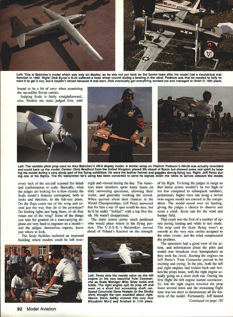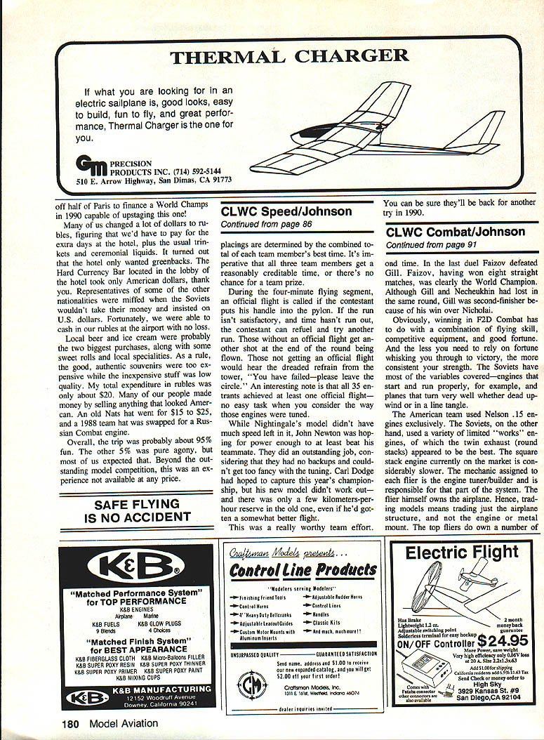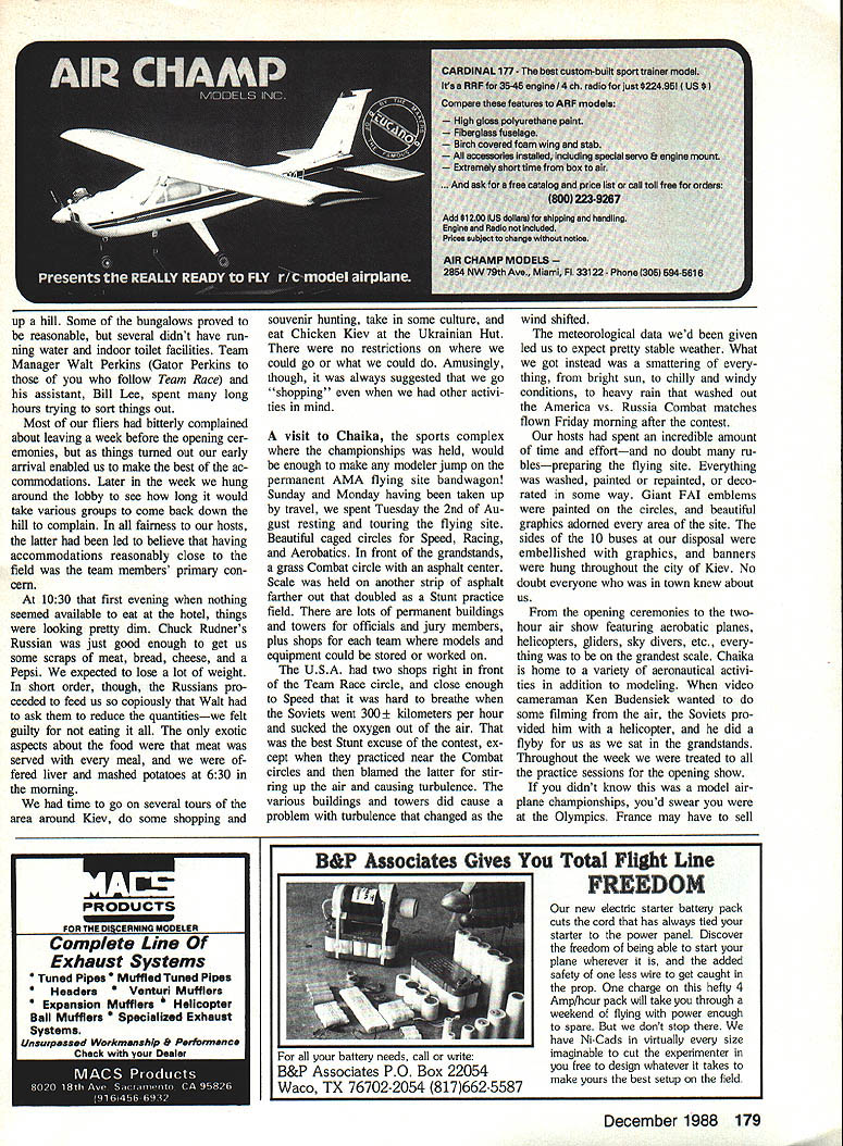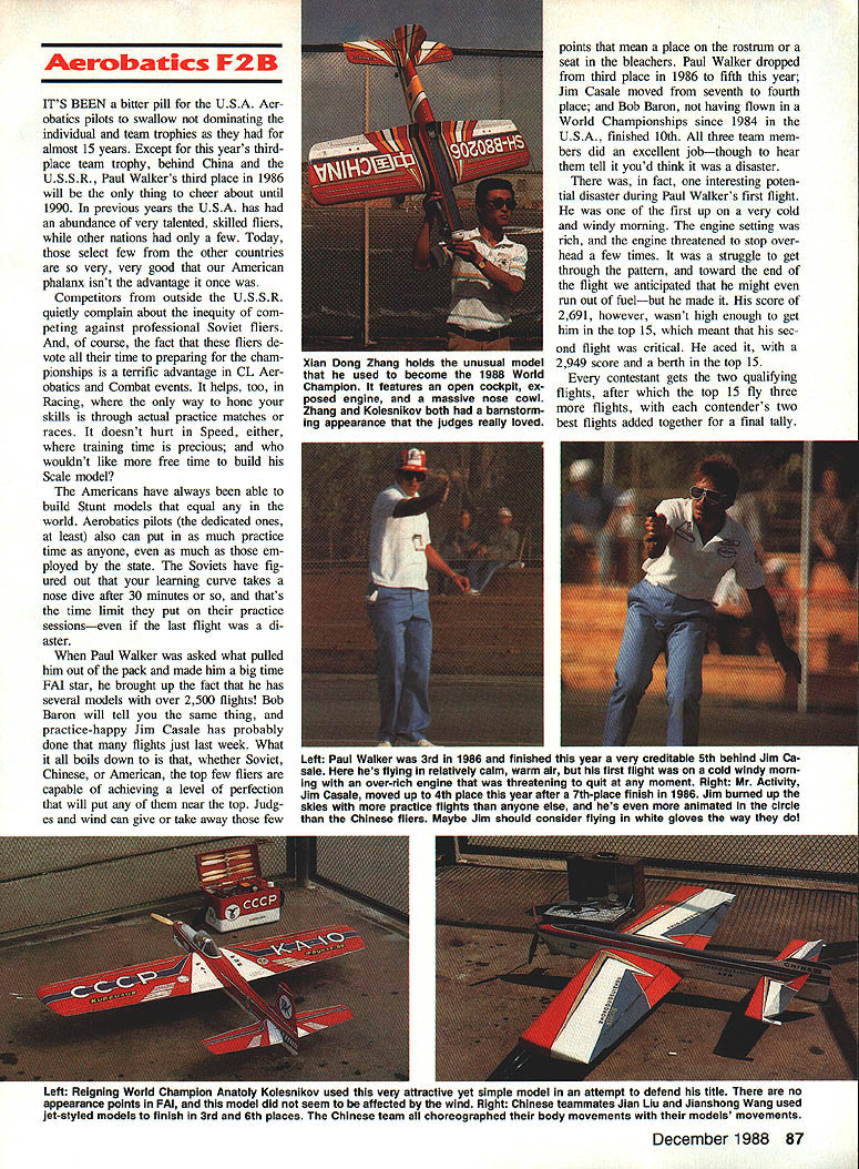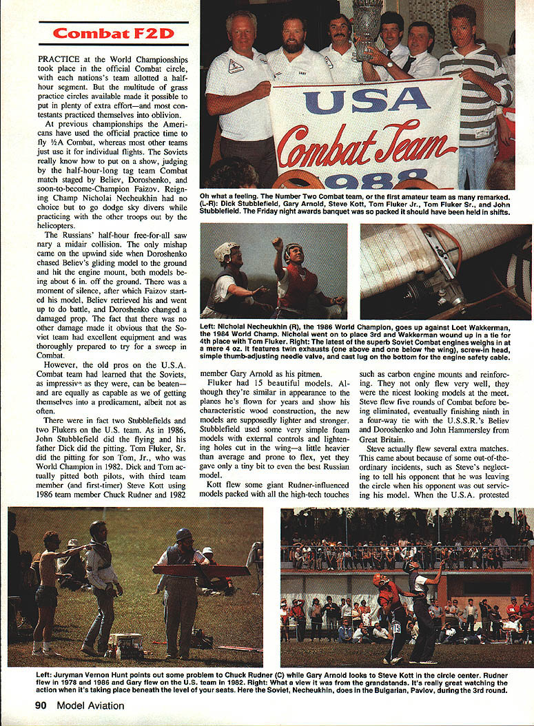 IT WAS MORE just contest adventure sums up trip Kiev USSR 1988 World Champion ships 44 contestants supporters met International Arrivals building New Yorks JFK Airport four hours before departure time Aeroflot flight Mack Henry little late because flight delay bit concerned about meet ing up guys No problemwe could spot model boxes about two blocks away USSWR played host worlds best Control Line modeling attended im pressed preparations skill entrants talking big model boxes 19 Memories 1982 Scale team pay ing Aeroflot $1300 transport model boxes Moscow London suddenly re surfaced Having 1982 team Jeff Perez Steve Ashby Dick Byron told everyone about boarded jet collectively $2700 poorer Clouds cool air escaping ceiling vents within few min utes cabin filled fog al ECharlie Johnson CL World Champs Speed F2A THE ONE QUESTION everyones mind before Speed got under way wheth er Soviets would break 300kilometers-per-hour barrier official F2A competition put rest soon enough current Speed World Champion Alex ander Kalmykov clocked off 30176 kph first run 35 entrants slowest time 24129 kph would have quite respectable score 10 years ago As another indication things have changed once-dominant Hungarians swept 1984 Championships USA third 1986 rele gated fourth fifth places year USA team consisted multitime member Carl Dodge garnered fourth 1986 John Newton 32nd last time Jim Nightingale number three position Carl seemed have best prospects placing well new model invested two years testing development another own engines since last champion ship Jim Nightingale didnt have mod els model box lost between New York Moscow Since fel low team member John Newton routinely work together share much equipment John let him have backup model fast engine John figured have just model engine should dependable hed let Jim take chance faster engine grenading told story just knew what going happen F2A event has basically same number years As Combat Team Race maximum engine size 25cc 15 cu fuel requirement 20/80% mixture castor oil meth anol Control two-line system rather Monoline system favored AMA Speed fliers two-line system has drag engine running aid large quantities power-producing nitromethane will still turn times best nitro-burners US Given same amount development work could probably achieve considerably higher December 1988 85 Above US World Championship teams complete witn uiga inc interpreter ana nower girl Charlie says thought hats slightly gaudy top trading items case fetching Russian Combat engine Below Part opening ceremonies included full-scale helicopters carrying banners Official video photographer Ken Budensiek able hitch ride helicopte o some aerial shots contest site expected Count guest appearance Aeroflots credit flight quite Continued page 178 World FAI Speed Champion 2nd left Alexander Kalmykov flanked USSR team members Pitskalev Schelkalin Kostin Alexander upped 1986 time 29363 outstanding 301 76kph went post another 30176 30155 third round prove wasnt fluke Second third places incredibly close 29950 2990 Left Typical Soviet other Speed models year long inboard wing cut down drag two control lines outboard engine large tail surface help satisfy total surface area requirements Right Long-time friends John Newton 1 Jim Nightingale after Jims very good run 2765okph airlines lost Jims models somewhere between New York Soviet Union teammate John loaned him planes Jim went beat him Overall Jim finished 15th place John 21st times US 12 years since Dutch championships times have ris en about 50 kph current crop ultrarigid carbon props better what available years ago asymmetric models cleaner long inboard wings cut down line drag well engines dont have power valves like GP motorcycles still plenty tuning tricks black magic go around pipe head shapes timing props clearances compro mises crankcase volumenot mention trimming plane track properly get ting fuel system meter consistently have mysteries rituals So viets have solved problem fuel sys tem metering using umfiow system does away annoyance con stantly losing air setting pilot closes needle down starting fact thing noticed about Soviet flights aside blazing speed lack needle tweaking before launch Unless weather conditions veered sharply made some gross tuning change Soviets able get needle setting right time Maybe theyre able flow test fuel correct amount will deliv ered desired speed again maybe its just good old black magic tricks used Soviets squeeze out last kph observed dur ing line check Its possible have slightly short lines yet stretch last little bit meet minimum length rules dont stipulate limits tension put lines during check length Ob viously inch two isnt going make world difference especially line stays stretched Two inches would mean about 1-kph difference 300 kph 5-kph difference between sec ond third places small amount important Another observation some con testants never fully rest handle pylon enables exert small force whip Youd have very strong coordinated manage rota tional speeds models going word about system determining placings may order three rounds flown over first three days meet highest single time counts toward individual championships team Continued page 180 Left USA s best hope top-three spot multi-time team member arls newer faster model didnt seem e handling right elected go back older model turned 28310 finish place unable get third official flight oft failed better 1986 time 28639 Center Soviet flier demonstrates ease turn fantastic times Grab pylon little tug get up pipe handle pylon steer around 300kph run spectatora background ara watch ing Aerobatics flights 15 Speed engine hits pipe jumps up 38000 rpm itll soon get attention Right Jim Nightingale way very respectable 15th place using John Newtons grenade engine Note FAI handle locks yoke 86 Model Aviation oviex team filling tne oniciai orew UTTICISIS watched like hawks during processing flights followed teams circle ensure no foreign substances added m