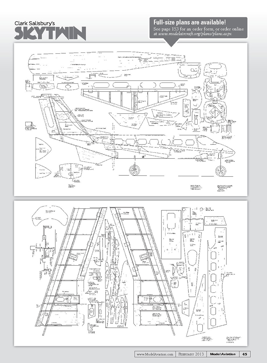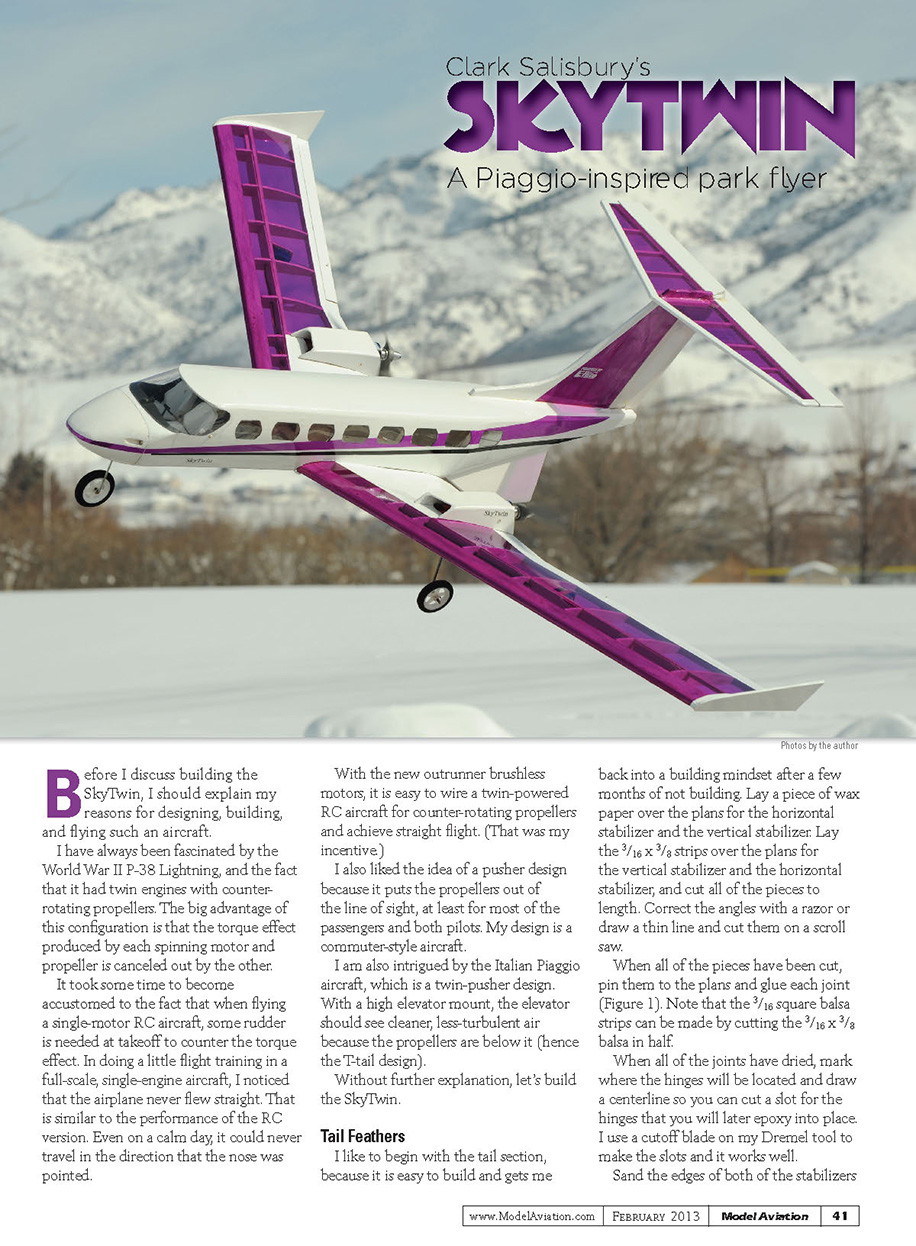 Final Assembly and Covering Install the motors into their mounts on both sides of the wing. Because the motors counter rotate, wire the three wires differently on the left side as compared to the right side. Looking at the airplane from the rear, my right motor turns counterclockwise and the left motor turns clockwise. I am not sure if doing this opposite would make any difference. Make sure you mount the propellers so the airplane has forward thrust. Do not have the propellers installed during the radio setup process. Install them after the wing is covered. The propellers should be installed with the writing side (on the center of the propeller) facing the front of the aircraft. After all of the wiring is completed, check to ensure that the propellers turn at the same speed through the entire range of throttle settings. If they don’t, you can swap propellers or speed controllers, or try different combinations of wiring to the motor, changing the three wires to each motor. It is important to check the speeds before flight. You could have asymmetric thrust during flight, which is difficult to correct. After everything has been tested electrically, epoxy in the hinges and cover the entire wing assembly. The fuselage and tail section should be covered separately, then glue in the tail section. The hinges can be epoxied into the wing where they stick through the balsa so there is no danger of getting any epoxy in the hinge pin. This same process can be used on the rudder and elevator hinges. After you slide the covered control surfaces (rudder, elevator, ailerons) over the hinges, drill a small hole in the bottom of the control surface through the nylon hinge and fill that hole with epoxy. Flying The SkyTwin is not a trainer. It is a fast aircraft with aerobatic capability. It requires at least 200 feet of smooth runway for takeoff. Its flight is smooth, even at high speeds, and the airplane is capable of all maneuvers. Rolls are not fast, and the pilot should allow a good margin for error (altitude) before attempting them. Tight loops are not recommended because they can stress the horizontal stabilizer. The airplane should be brought in for landing with some throttle to avoid stalling. It penetrates a slight breeze well. During my test flight, I found that pushing the SkyTwin beyond 7 minutes with the 1300 mAh three-cell LiPo battery pack that I recommend is not a good idea. I saw some variation between left- and right-motor speed. Both motors spin the same speed for less than 7 minutes. I verified it with a tachometer. Have fun! The SkyTwin is pretty to watch in flight, especially on a sunny day with the light coming through its transparent wings. —Clark Salisburyclarksalisbury@hotmail.comSOURCES: Innov8tive Designs(760) 468-8838www.innov8tivedesigns.comFIGURE 15Type: RC park flyerSkill level: Intermediate builder; intermediate pilotWingspan: 46 inchesLength: 35 inchesWeight: 32 ouncesMotors: E-flite 370 1080 Kv brushless outrunnerESCs: Two Scorpion 25-amp brushless motor speed controllersPropellers: APC 8 x 6, APC 8 x 6 EP pusher Battery: Venom Power three-cell 1300 mAh LiPoRadio: Three channels, four HS 55 microservosConstruction: Balsa, plywoodFinish: MonoKote44Model Aviation February 2013www.ModelAviation.com041