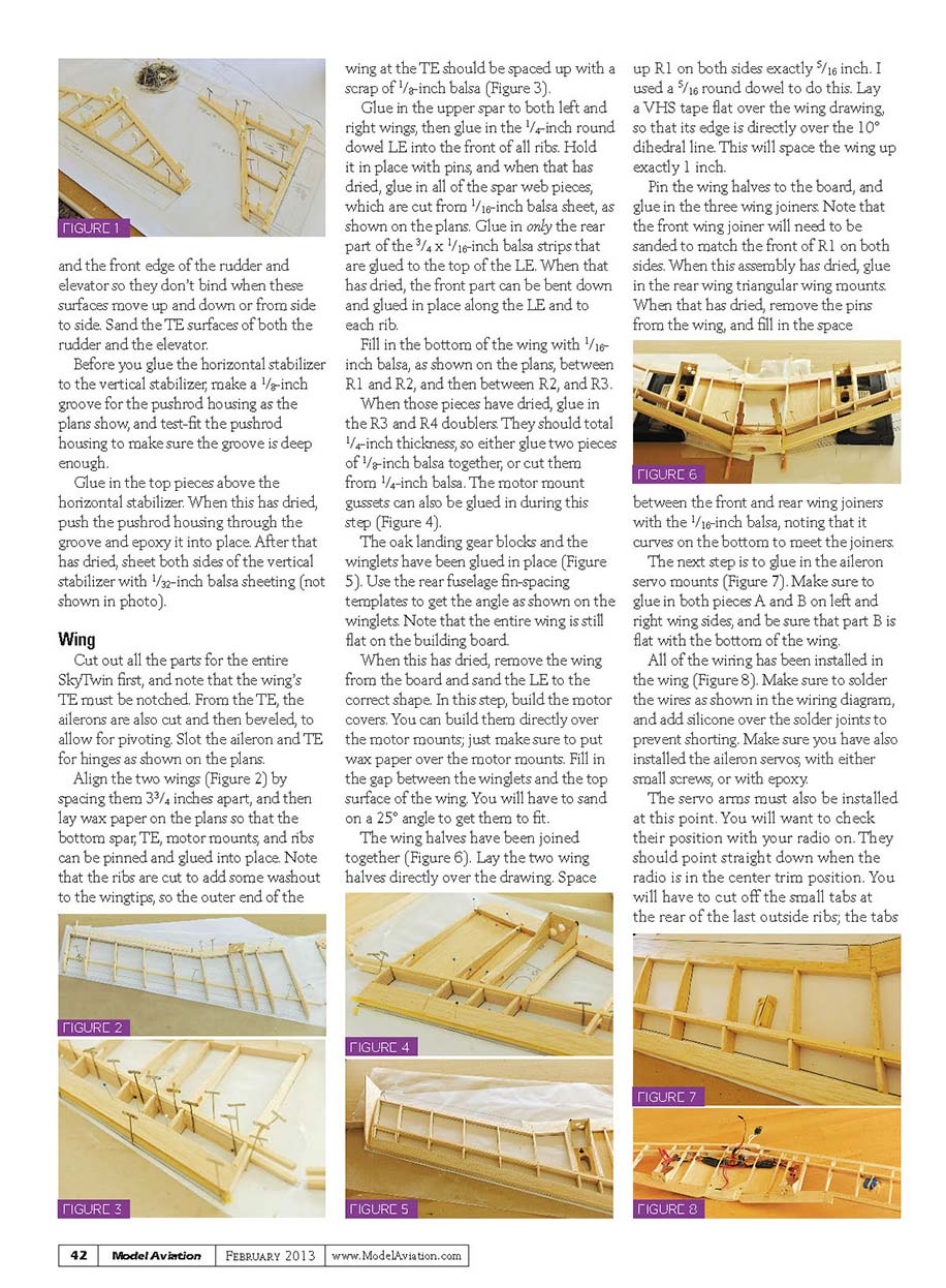 and the front edge of the rudder and elevator so they don’t bind when these surfaces move up and down or from side to side. Sand the TE surfaces of both the rudder and the elevator. Before you glue the horizontal stabilizer to the vertical stabilizer, make a 1/8-inch groove for the pushrod housing as the plans show, and test-fit the pushrod housing to make sure the groove is deep enough. Glue in the top pieces above the horizontal stabilizer. When this has dried, push the pushrod housing through the groove and epoxy it into place. After that has dried, sheet both sides of the vertical stabilizer with 1/32-inch balsa sheeting (not shown in photo). Wing Cut out all the parts for the entire SkyTwin first, and note that the wing’s TE must be notched. From the TE, the ailerons are also cut and then beveled, to allow for pivoting. Slot the aileron and TE for hinges as shown on the plans. Align the two wings (Figure 2) by spacing them 33/4 inches apart, and then lay wax paper on the plans so that the bottom spar, TE, motor mounts, and ribs can be pinned and glued into place. Note that the ribs are cut to add some washout to the wingtips, so the outer end of the wing at the TE should be spaced up with a scrap of 1/8-inch balsa (Figure 3). Glue in the upper spar to both left and right wings, then glue in the 1/4-inch round dowel LE into the front of all ribs. Hold it in place with pins, and when that has dried, glue in all of the spar web pieces, which are cut from 1/16-inch balsa sheet, as shown on the plans. Glue in only the rear part of the 3/4 x 1/16-inch balsa strips that are glued to the top of the LE. When that has dried, the front part can be bent down and glued in place along the LE and to each rib. Fill in the bottom of the wing with 1/16-inch balsa, as shown on the plans, between R1 and R2, and then between R2, and R3. When those pieces have dried, glue in the R3 and R4 doublers. They should total 1/4-inch thickness, so either glue two pieces of 1/8-inch balsa together, or cut them from 1/4-inch balsa. The motor mount gussets can also be glued in during this step (Figure 4). The oak landing gear blocks and the winglets have been glued in place (Figure 5). Use the rear fuselage fin-spacing templates to get the angle as shown on the winglets. Note that the entire wing is still flat on the building board. When this has dried, remove the wing from the board and sand the LE to the correct shape. In this step, build the motor covers. You can build them directly over the motor mounts; just make sure to put wax paper over the motor mounts. Fill in the gap between the winglets and the top surface of the wing. You will have to sand on a 25º angle to get them to fit. The wing halves have been joined together (Figure 6). Lay the two wing halves directly over the drawing. Space up R1 on both sides exactly 5/16 inch. I used a 5/16 round dowel to do this. Lay a VHS tape flat over the wing drawing, so that its edge is directly over the 10º dihedral line. This will space the wing up exactly 1 inch. Pin the wing halves to the board, and glue in the three wing joiners. Note that the front wing joiner will need to be sanded to match the front of R1 on both sides. When this assembly has dried, glue in the rear wing triangular wing mounts. When that has dried, remove the pins from the wing, and fill in the space between the front and rear wing joiners with the 1/16-inch balsa, noting that it curves on the bottom to meet the joiners. The next step is to glue in the aileron servo mounts (Figure 7). Make sure to glue in both pieces A and B on left and right wing sides, and be sure that part B is flat with the bottom of the wing. All of the wiring has been installed in the wing (Figure 8). Make sure to solder the wires as shown in the wiring diagram, and add silicone over the solder joints to prevent shorting. Make sure you have also installed the aileron servos, with either small screws, or with epoxy. The servo arms must also be installed at this point. You will want to check their position with your radio on. They should point straight down when the radio is in the center trim position. You will have to cut off the small tabs at the rear of the last outside ribs; the tabs FIGURE 1FIGURE 2FIGURE 3FIGURE 4FIGURE 5FIGURE 6FIGURE 7FIGURE 842Model Aviation February 2013www.ModelAviation.com041
