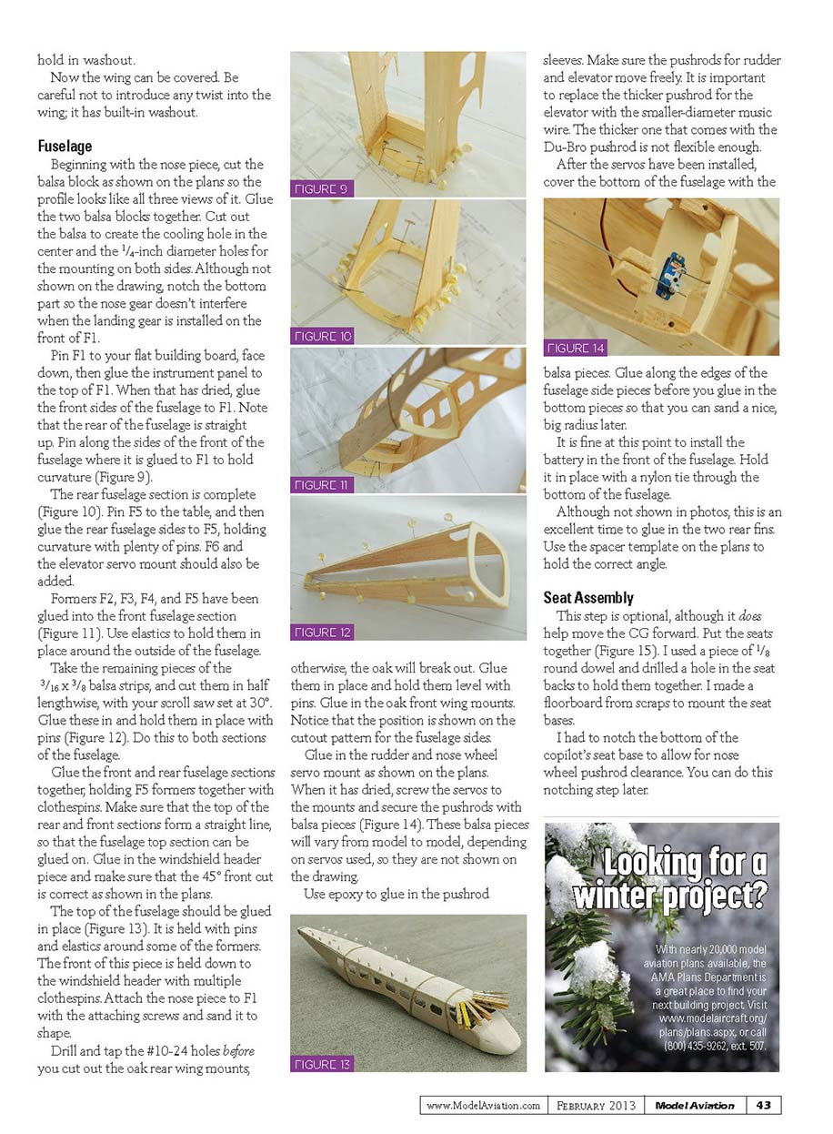 With nearly 20,000 model aviation plans available, the AMA Plans Department is a great place to find your next building project. Visit www.modelaircraft.org/plans/plans.aspx, or call (800) 435-9262, ext. 507.Looking for a winter project?hold in washout. Now the wing can be covered. Be careful not to introduce any twist into the wing; it has built-in washout. Fuselage Beginning with the nose piece, cut the balsa block as shown on the plans so the profile looks like all three views of it. Glue the two balsa blocks together. Cut out the balsa to create the cooling hole in the center and the 1/4-inch diameter holes for the mounting on both sides. Although not shown on the drawing, notch the bottom part so the nose gear doesn’t interfere when the landing gear is installed on the front of F1. Pin F1 to your flat building board, face down, then glue the instrument panel to the top of F1. When that has dried, glue the front sides of the fuselage to F1. Note that the rear of the fuselage is straight up. Pin along the sides of the front of the fuselage where it is glued to F1 to hold curvature (Figure 9). The rear fuselage section is complete (Figure 10). Pin F5 to the table, and then glue the rear fuselage sides to F5, holding curvature with plenty of pins. F6 and the elevator servo mount should also be added. Formers F2, F3, F4, and F5 have been glued into the front fuselage section (Figure 11). Use elastics to hold them in place around the outside of the fuselage. Take the remaining pieces of the 3/16 x 3/8 balsa strips, and cut them in half lengthwise, with your scroll saw set at 30º. Glue these in and hold them in place with pins (Figure 12). Do this to both sections of the fuselage. Glue the front and rear fuselage sections together, holding F5 formers together with clothespins. Make sure that the top of the rear and front sections form a straight line, so that the fuselage top section can be glued on. Glue in the windshield header piece and make sure that the 45º front cut is correct as shown in the plans. The top of the fuselage should be glued in place (Figure 13). It is held with pins and elastics around some of the formers. The front of this piece is held down to the windshield header with multiple clothespins. Attach the nose piece to F1 with the attaching screws and sand it to shape. Drill and tap the #10-24 holes before you cut out the oak rear wing mounts, otherwise, the oak will break out. Glue them in place and hold them level with pins. Glue in the oak front wing mounts. Notice that the position is shown on the cutout pattern for the fuselage sides. Glue in the rudder and nose wheel servo mount as shown on the plans. When it has dried, screw the servos to the mounts and secure the pushrods with balsa pieces (Figure 14). These balsa pieces will vary from model to model, depending on servos used, so they are not shown on the drawing. Use epoxy to glue in the pushrod sleeves. Make sure the pushrods for rudder and elevator move freely. It is important to replace the thicker pushrod for the elevator with the smaller-diameter music wire. The thicker one that comes with the Du-Bro pushrod is not flexible enough. After the servos have been installed, cover the bottom of the fuselage with the balsa pieces. Glue along the edges of the fuselage side pieces before you glue in the bottom pieces so that you can sand a nice, big radius later. It is fine at this point to install the battery in the front of the fuselage. Hold it in place with a nylon tie through the bottom of the fuselage. Although not shown in photos, this is an excellent time to glue in the two rear fins. Use the spacer template on the plans to hold the correct angle. Seat Assembly This step is optional, although it does help move the CG forward. Put the seats together (Figure 15). I used a piece of 1/8 round dowel and drilled a hole in the seat backs to hold them together. I made a floorboard from scraps to mount the seat bases. I had to notch the bottom of the copilot’s seat base to allow for nose wheel pushrod clearance. You can do this notching step later. FIGURE 9FIGURE 10FIGURE 11FIGURE 12FIGURE 13FIGURE 1443Model Aviation February 2013www.ModelAviation.com041