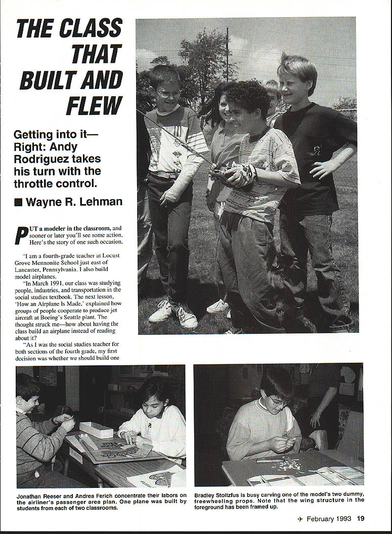 THE CLASS THAT BWLT AND FLEW Getting Right Andy Rodriguez takes turn throttle control U Wayne R Lehman pT modeler classroom sooner later youll see some action Heres story such occasion am fourth-grade teacher Locust Grove Mennonite School just east Lancaster Pennsylvania also build model airplanes March 1991 class studying people industries transportation social studies textbook next lesson Airplane Made explained groups people cooperate produce jet aircraft Boeings Seattle plant thought struck mehow about having class build airplane instead reading about jt As social studies teacher both sections fourth grade first decision whether should build Jonathan Reeser Andrea Ferich concentrate labors Bradley Stoltzfus busy carving models two dummy airliners passenger area plan plane built freewheeling props Note wing structure students two classrooms foreground has framed up February 1993 19 Left Detail showing location internal control components RC receiver under dummy cockpit floor lone servo controls models throttle airplane two Knowing young people take pride homerooms accomplishments decided go twoone class So began endeavor times seemed overwhelming end rewarding considered just what form craft should take wanted involve students much possible step needed something could rather crudely built yet fly forgiving characteristics control line model seemed appropriate cant expect 36 grade-schoolers able fly control line short notice So planned install throttle servo let kids play copilot via RC took charge ups downs handle thought worst could happen child suddenly cut throttle would landing next decision what model build wanted airliner least recognizable scale model Ideally should have manufactured 747 its configuration doesnt match building flying expectations leafed through Rolfe Dawydoffs Airplanes World several times kept returning 1930s French airliner called Dewoitine D 332 lines simple boxy look Best trimotor Since enginean OS 20a propeller nose would still scalelike would easy construct two freewheeler dummy props wings So set about drawing plans used typical dimensions 20-size ship keeping everything simple possible Ill pause mention Im including copy plans because want share cooperative building flying concept radio-assisted control line model rather aircraft itself suppose could design build around almost craft get off ground March 26 plans hand announced project classes say kids excited understatement next day formed work groups passed out cardboard templates baisa cutting boards single-edge razors Checking supply Band-Aids held breath started As expected wide range both ability razor working styles following days ribs being assembled group other teams busy working cockpit detail fashioning passenger seats carving dummy props sanding fuselage sides tail feathers Although French airliner never sported markings chose make liners Pan Am other Swissair detailed few guidelines kids painted airline colors Continued page 127 20 Model Aviation e Kids line up awaiting turn copilots After safety lesson took off full tilt authors project proved highlight school year wayne Lenman instigator school project two airliners built students 0S 20 engine swapped between two models flight sessions Joshua Smucker probable future pilot evening maiden flight classs Pan Am airliner model actually control liner Only throttle works RC Charles St info & directions call Dr Sandy Frank 817-599-7131 Sponsor WEATHERFORD AERO MODELING SOCIETY FL APR 3Fort Myers FL El 2nd Annual Swap Shop & Auction 900 am -400 pm 800 am Sellers Corkscrew Woodlands Esif 19 W off 75 Corkscrew Rd 1/4 M 75 Larger Hall Tables $10 Advance Reservations Definitely Recommended Admission $2 Paul Barfos 1002 Washington Ave Lehigh FL 33936 PH 813-368-0214 Sponsor SW FLORIDA AERO CLUB LISTING AD INFORMATION NORMAL LISTING AMA sanction issued event event will listed automatically Contest Calendar section listing will give date place name eventplus competition events flying site Contest Director name address Use Supplementary paid Ad space suggested description unusual special events deviations AMA rules significant aspects meet Paid ads may helpful promoting funfly-type meets give directions flying site SUPPLEMENTARY ADS Larger ads can inserted Contest Calendar section paying fee ads accepted AMA-sanctioned events FEE Fees based ad size whether sponsor AMAchartered club AD POLICY SIZE 1/s-in wide either /4 1/2 2/4-in high full size ad appears Contest Calendar section PRICING 3/4$8 1/2$16 2/4$24 time ad run payable advance AMA-chartered clubs pay half rate AD PREPARATION advertiser must prepare Supplementary Ad Ads must full size see above Ads made up dark black white background will reproduce well recommended ad made heavy paper lightweight cardboard PLEASE DO NOT USE PHOTOGRAPHS ON ADS SUBMITTAL DEADLINE effort will made include Supplementary Ads received 14th month issue reaching readers approximately fourth week following month However cannot guaranteed ads published space-available basis normally two-month lead time required inserting Supplementary Ad same deadline will apply sanctioned events listings Questions about either Supplementary Ads regular Sanctioned Events listings should directed Debbie Brown AMAs Competition Department Send ads AMA HO Attention Competition Dept Renew 93 Built FlewlLehman Continued page 20 tempera paints later covered engine area clear dope should also mention tops bottoms fuselages midwing sheeted areas covered classroom tablet backings As project neared completion put several hours covering wings installing hardware radio engine maiden flight Pan Am took place evening April 16 Uncertain outcome made arrangements student present Joshua Smucker young man likely become pilot accompanied full throttle airliner sluggish fresh spring grass did take off fly nicely Unfortunately covering wing began loosen after two laps bring down remarked handy have throttle control cases like too dark repairs second flight Joshua w
