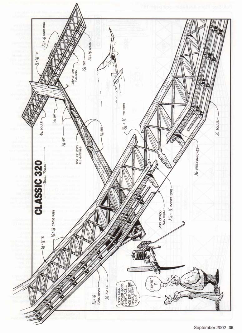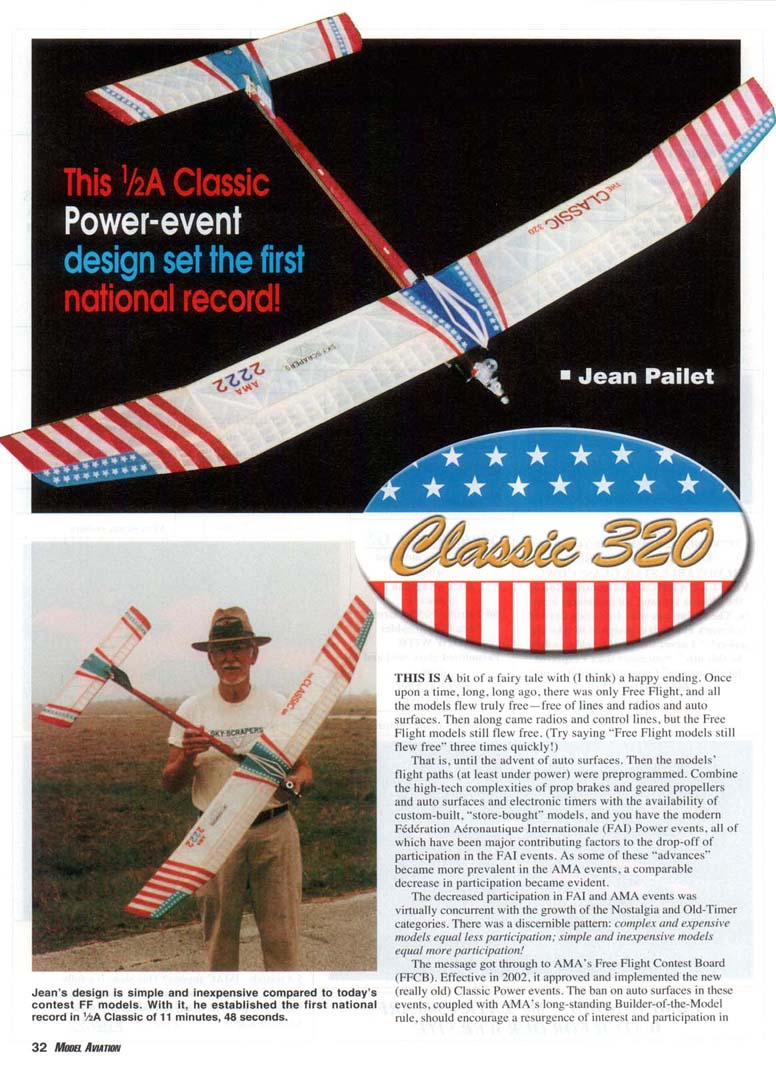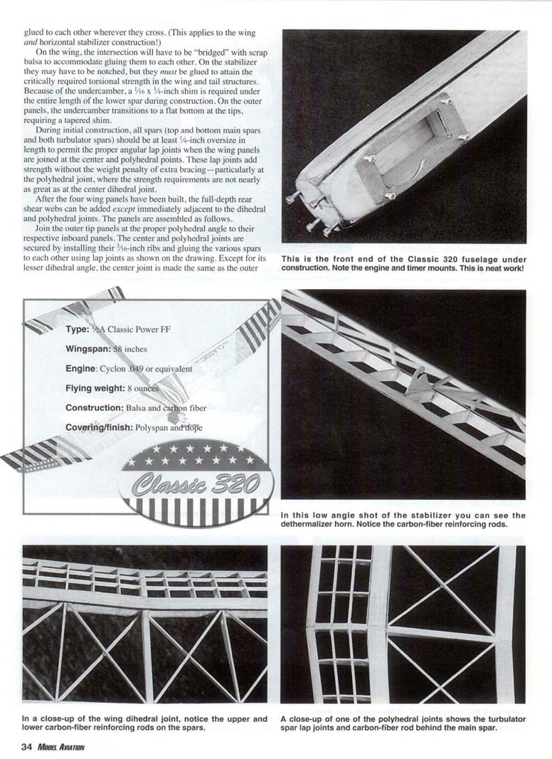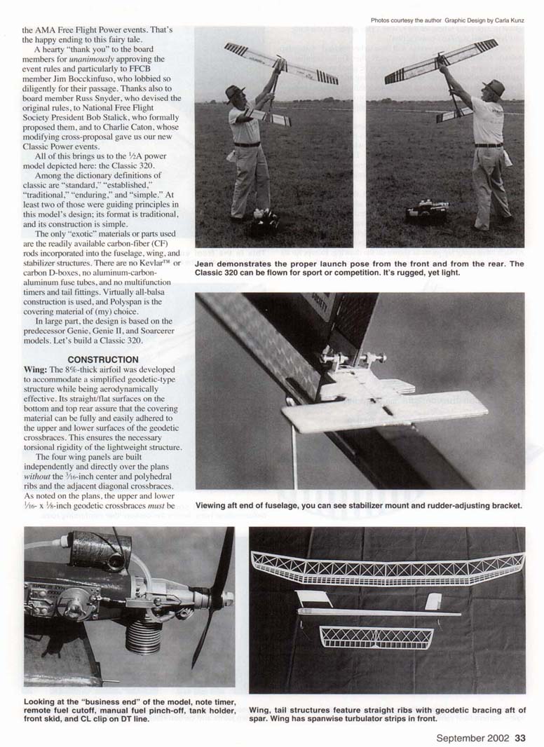 Jean's design is simple and inexpensive compared to today's contest FF models. With it, he established the first national record in 1/2A Classic of 11 minutes, 48 seconds. THIS IS A bit of a fairy tale with (I think) a happy ending. Once upon a time, long, long ago, there was only Free Flight, and all the models flew truly free—free of lines and radios and auto surfaces. Then along came radios and control lines, but the Free Flight models still flew free. (Try saying "Free Flight models still flew free" three times quickly!) That is, until the advent of auto surfaces. Then the models' flight paths (at least under power) were preprogrammed. Combine the high-tech complexities of prop brakes and geared propellers and auto surfaces and electronic timers with the availability of custom-built, "store-bought" models, and you have the modern Federation Aeronautique Internationale (FAI) Power events, all of which have been major contributing factors to the drop-off of participation in the FAI events. As some of these "advances" became more prevalent in the AMA events, a comparable decrease in participation became evident. The decreased participation in FAI and AMA events was virtually concurrent with the growth of the Nostalgia and Old-Timer categories. There was a discernible pattern: complex and expensive models equal less participation; simple and inexpensive models equal more participation! The message got through to AMA's Free Flight Contest Board (FFCB). Effective in 2002, it approved and implemented the new (really old) Classic Power events. The ban on auto surfaces in these events, coupled with AMA's long-standing Builder-of-the-Model rule, should encourage a resurgence of interest and participation in the AMA Free Flight Power events. That's the happy ending to this fairy tale. A hearty "thank you" to the board members for unanimously approving the event rules and particularly to FFCB member Jim Bocckinfuso, who lobbied so diligently tor their passage. Thanks also to board member Russ Snyder, who devised the original rules, to National Free Flight Society President Bob Stalick. who formally proposed them, and to Charlie Caton. whose modifying cross-proposal gave us our new Classic Power events. All of this brings us to the '/:A power model depicted here: the Classic 320. Among the dictionary definitions of classic are "standard," "established." "traditional," "enduring," and "simple." At least two of those were guiding principles in this model's design; its format is traditional, and its construction is simple. The only "exotic" materials or parts used are the readily available carbon-fiber (CF) rods incorporated into the fuselage, wing, and stabilizer structures. There are no Kevlar"1 or carbon D-boxes, no aluminum-carbon-aluminum fuse tubes, and no multifunction timers and tail fittings. Virtually all-balsa construction is used, and Polyspan is the covering material of (my) choice. In large part, the design is based on the predecessor Genie, Genie II, and Soarcerer models. Let's build a Classic 320. CONSTRUCTION Wing: The 8%-thick airfoil was developed to accommodate a simplified geodetic-type structure while being aerodynamically effective. Its straight/flat surfaces on the bottom and top rear assure that the covering material can be fully and easily adhered to the upper and lower surfaces of the geodetic crossbraces. This ensures the necessary torsional rigidity of the lightweight structure. The four wing panels are built independently and directly over the plans without the Vi6-inch center and polyhedral ribs and the adjacent diagonal crossbraces. As noted on the plans, the upper and lower '/i6- x '/s-inch geodetic crossbraces must be Photos courtesy the author Graphic Design by Carta Kunz Jean demonstrates the proper launch pose from the front and from the rear. The Classic 320 can be flown for sport or competition. It's rugged, yet light. Viewing aft end of fuselage, you can see stabilizer mount and rudder-adjusting bracket. ••••••••M*••••••••• Looking at the "business end" of the model, note timer, remote fuel cutoff, manual fuel pinch-off, tank holder, front skid, and CL clip on DT line. Wing, tail structures feature straight ribs with geodetic bracing aft of spar. Wing has spanwise turbulator strips in front. September 2002 33 glued to each other wherever they cross. (This applies to the wing and horizontal stabilizer construction!) On the wing, the intersection will have to be "bridged" with scrap balsa to accommodate gluing them to each other. On the stabilizer they may have to be notched, but they must be glued to attain the critically required torsional strength in the wing and tail structures. Because of the undercamber, a '/i6 x '/4-inch shim is required under the entire length of the lower spar during construction. On the outer panels, the undercamber transitions to a flat bottom at the tips, requiring a tapered shim. During initial construction, all spars (top and bottom main spars and both turbulator spars) should be at least '/4-inch oversize in length to permit the proper angular lap joints when the wing panels are joined at the center and polyhedral points. These lap joints add strength without the weight penalty of extra bracing—particularly at the polyhedral joint, where the strength requirements are not nearly as great as at the center dihedral joint. After the four wing panels have been built, the full-depth rear shear webs can be added except immediately adjacent to the dihedral and polyhedral joints. The panels are assembled as follows. Join the outer tip panels at the proper polyhedral angle to their respective inboard panels. The center and polyhedral joints are secured by installing their -Vis-inch ribs and gluing the various spars to each other using lap joints as shown on the drawing. Except for its lesser dihedral angle, the center joint is made the same as the outer This is the front end of the Classic 320 fuselage 