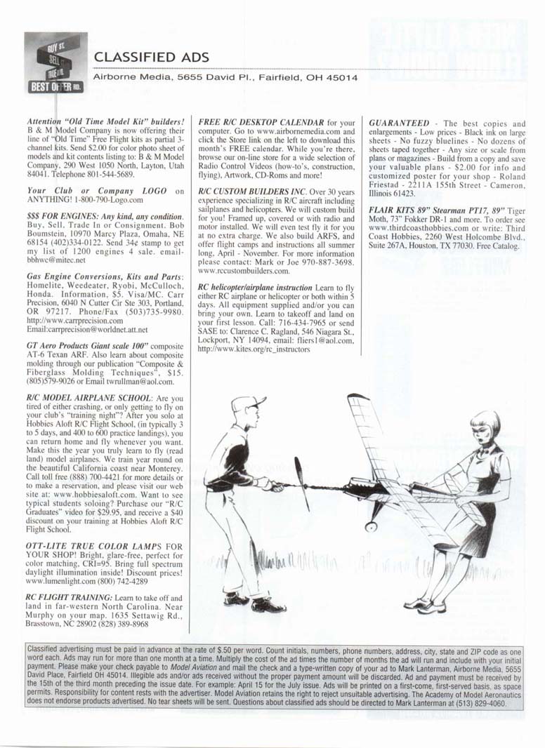 Attention "Old Time Model Kit" builders! B & M Model Company is now offering their line of "Old Time" Free Flight kits as partial 3-channel kits. Send $2.00 for color photo sheet of models and kit contents listing to: B & M Model Company. 290 West 1050 North, Layton, Utah 84041. Telephone 801-544-5689. Your Club or Company LOGO on ANYTHING! 1-800-790-Logo.com $$$ FOR ENGINES: Any kind, any condition. Buy. Sell. Trade In or Consignment. Bob Boumstein. 10970 Marcy Plaza. Omaha. NE 68154 (402)334-0122. Send 34c stamp to get my list of 1200 engines 4 sale, email-bbhwc@mitec.net Gas Engine Conversions, Kits and Parts: Homelite. Weedeater, Ryobi. McCulloch. Honda. Information. $5. Visa/MC. Carr Precision. 6040 N Cutter Cir Ste 303. Portland. OR 97217. Phone/Fax (503)735-9980. http://www.carrprecision.com Email:carrprecision@worldnet.att.net GT Aero Products Giant scale 100" composite AT-6 Texan ARF. Also learn about composite molding through our publication "Composite & Fiberglass Molding Techniques". $15. (805)579-9026 or Email twrullman@aol.com. R/C MODEL AIRPLANE SCHOOL. Are you tired of either crashing, or only getting to fly on your club's "training night"? After you solo at Hobbies Aloft R/C Flight School, (in typically 3 to 5 days, and 400 to 600 practice landings), you can return home and fly whenever you want. Make this the year you truly learn to fly (read land) model airplanes. We train year round on the beautiful California coast near Monterey. Call toll free (888) 700-4421 for more details or to make a reservation, and please visit our web site at: www.hobbiesaloft.com. Want to see typical students soloing? Purchase our "R/C Graduates" video for $29.95, and receive a $40 discount on your training at Hobbies Aloft R/C Flight School. OTT-LITE TRUE COLOR LAMPS FOR YOUR SHOP! Bright, glare-free, perfect for color matching. CRI=95. Bring full spectrum daylight illumination inside! Discount prices! www.lumenlight.com (800) 742-4289 RC FLIGHT TRAINING: Learn to take off and land in far-western North Carolina. Near Murphy on your map. 1635 Settawis Rd.. Brasstown. NC 28902 (828) 389-8968 FREE R/C DESKTOP CALENDAR for your computer. Go to www.airbornemedia.com and click the Store link on the left to download this month's FREE calendar. While you're there, browse our on-line store for a wide selection of Radio Control Videos (how-to's, construction, flying), Artwork, CD-Roms and more! R/C CUSTOM BUILDERS INC. Over 30 years experience specializing in R/C aircraft including sailplanes and helicopters. We will custom build for you! Framed up. covered or with radio and motor installed. We will even test fly it for you at no extra charge. We also build ARFS, and offer flight camps and instructions all summer lons. April - November. For more information please contact: Mark or Joe 970-887-3698. www.rccustombuilders.com. RC helicopter/airplane instruction Learn to fly either RC airplane or helicopter or both within 5 days. All equipment supplied and/or you can bring your own. Learn to takeoff and land on your first lesson. Call: 716-434-7965 or send SASE to: Clarence C. Ragland. 546 Niagara St.. Lockport. NY 14094. email: fliersl@aol.com, http://www.kites.org/rc_instructors GUARANTEED - The best copies and enlargements - Low prices - Black ink on large sheets - No fuzzy bluelines - No dozens of sheets taped together - Any size or scale from plans or magazines - Build from a copy and save your valuable plans - $2.00 for info and customized poster for your shop - Roland Friestad - 221 IA 155th Street - Cameron, Illinois 61423. FLAIR KITS 89" Stearman PTI7, 89" Tiger Moth, 73" Fokker DR-1 and more. To order see www.thirdcoasthobbies.com or write: Third Coast Hobbies. 2260 West Holcombe Blvd.. Suite 267A, Houston. TX 77030. Free Cataloe.
