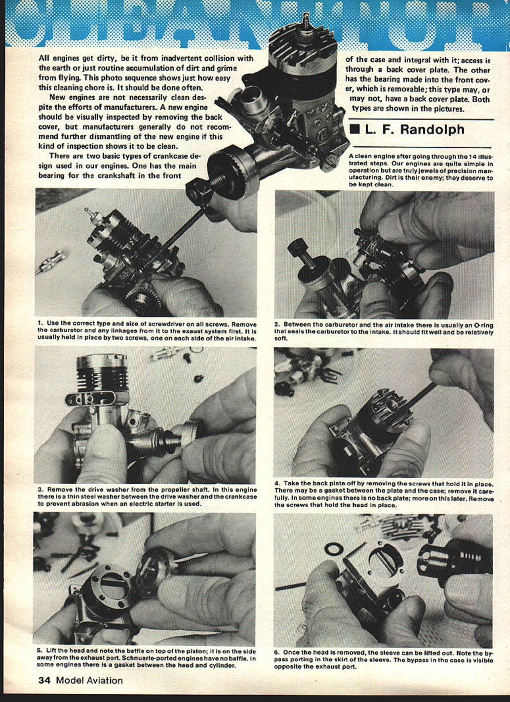 All engines get dirty inadvertent collision earth just routine accumulation dirt grime flying photo sequence shows just easy cleaning chore should done often New engines necessarily clean des pite efforts manufacturers new engine should visually inspected removing back cover manufacturers generally recom mend further dismantling new engine kind inspection shows clean two basic types crankcase de sign used engines has main bearing crankshaft front 1 Use correct type size screwdriver screws Remove carburetor linkages exaust system first usually held place two screws side air intake case integral access through back cover plate other has bearing made front cov er removable type may may have back cover plate Both types shown pictures EL F Randolph clean engine aftergoing through 14 illus trated steps engines quite simple operation truly jewels precision man ufacturing Dirt enemy deserve keot clean 34 Model Aviation 2 Between carburetor air intake usually 0-ring seals carburetor intake should fit well relatively soft 3 Remove drive washer propeller slirni inie unne isa thin steel washer between drive washer crankcase prevent abrasion electric starter used 4 Take bawl puma OTT O removing screws tna noia place may gasket between plate case remove care fully Some engines no back plate later Remove screws hold head place LitI head note baffle top piston side awayfrom exhaust port Schnuerle-ported engines have no baffle some engines gasket between head cylinder 6 k tIC .uaIJ O FCJVCU L,U bICVVU Udil UU IIULUU OUt inoie inc oy pass porting skirt sleeve bypass case visible opposite exhaust port August1981 35 7 Rotate crankshaft until piston its highest point uses short piece soft wire slide pin out pistonexposing top connecting rod 8 Remove connecting rod lifting crank pin crankshaft counterbalance engine shown old 05 Max 15 cransnarr am ot case Ins Troni engines equipped ball bearings may necessarytotap frontof shaft block wood dislodge bearings 10 ome engines nave removaoie tront cover inst carries crank shaft its bearings removed connecting rod piston free be. 11. ed out top cylinder need ci removing sleeve case ringed engines ring must compressed fingerswhen piston returned intothe cylinder Again note baffle 12 Put engine parts clean coffee can water good all-purpose detergent Years ago used gasoline clean engines now does good job dangerous Use detergent water best results 13 Shake slosh can few times pour out dirty water Use s toothbrush areas still dirty add water detergent Shake some Pour out soapy water rinse engine thoroughly hot water several timesthen drythe parts paper towel Complete drying process heat gun hair dryer until moisture gone 14 OIl mating parts lightly good oil reassemble same sequence taken apart use photos guide Usually necessary disassemble carburetor forthis type cleaning should necessary consult instruction manual