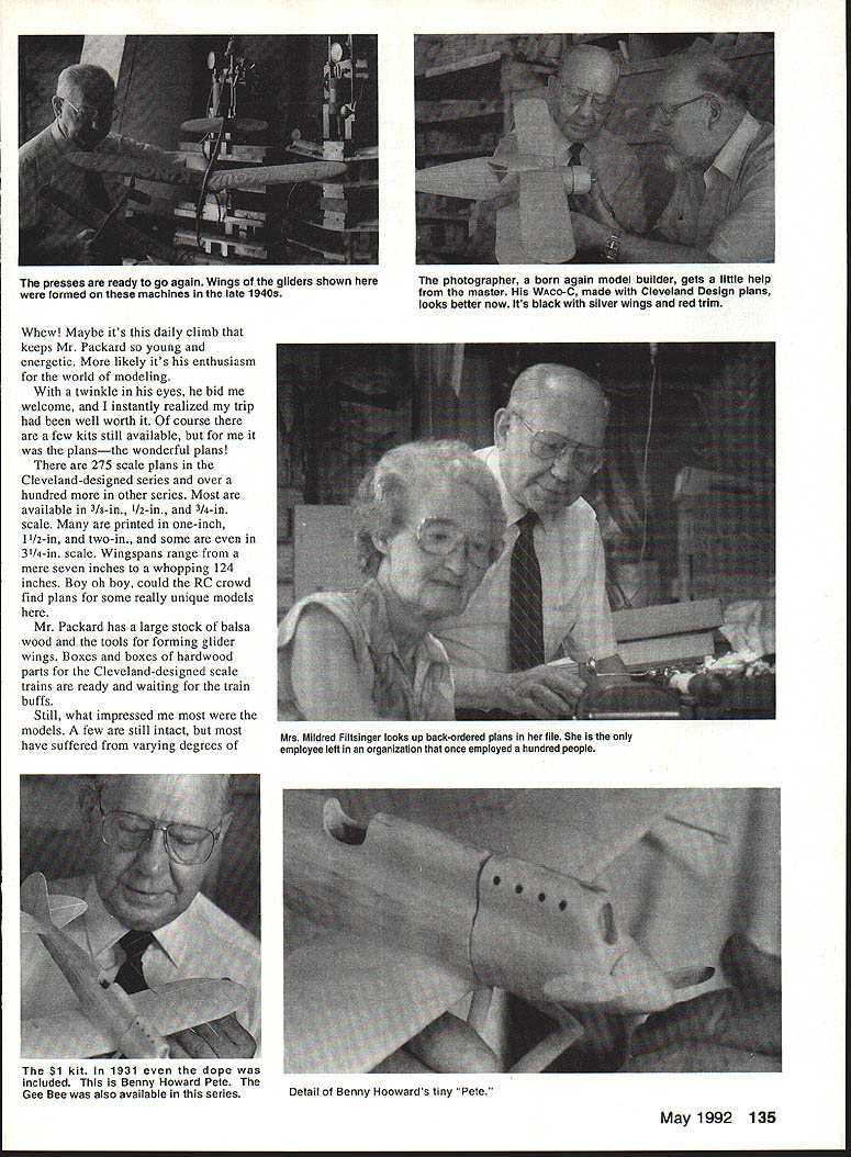 Cleveland Model Supply Seventy Years Business Walk old warehouse across loading dock Detroit Avenue open unmarked door youre modeling heaven EJames Busch ET PACKARD started Cleveland Model Supply Company 1919 fact wouldnt unusual except hes still Way back late thirties early forties would hitch ride Cleveland dad went business streetcar ride east Lorain Avenue brought heaven Long showcases full dope glue shelves shelves loaded model airplane kitsthis kid overwhelmed 1947 built last Clevelanddesigned modela 72inch Giant Condor J Glider plans still available Early year learned Cleveland Model still business offering plans scratch builders sent catalog ordered what probably life supply plans order filled promptly expected big fully-computerized order department no such thing Mr Packard capable assistant Mrs Mildred Filtsinger current location shop bit off beaten path Patrons park behind old building Detroit Avenue walk over loading dock unmarked door climb three flights stairs 134 Model Aviation ET Packard Packard Demoiselles named honor family volunteers model Ohioan Dan Scherry spoked wheel construction included Plan available six scales Like Great Wall China great wall balsa well seasoned size balsa still stock showroom little hard find third floor warehouse its well worth climb anyone whos nuts about modeling Whew Maybe its daily climb keeps Mr Packard young energetic likely its enthusiasm world modeling twinkle eyes bid welcome instantly realized trip well worth course few kits still available plansthe wonderful plans 275 scale plans Cleveland-designed series over hundred other series Most available 31s-in t12-in 314-in scale printed one-inch 1 12-in two-in some 3/4-in scale Wingspans range mere seven inches whopping 124 inches Boy oh boy could RC crowd find plans some really unique models Mr Packard has large stock balsa wood tools forming glider wings Boxes boxes hardwood parts Cleveland-designed scale trains ready waiting train buffs Still what impressed models few still intact have suffered varying degrees May1992 135 presses ready go again Wings gliders shown formed machines late 1940s photographer born again model builder gets little help master WACO-C made Cleveland Design plans looks better now Its black silver wings red trim Mrs Mildred Filtsinger looks up back-ordered plans file employee left organization once employed hundred people $1 kit 1931 tne dope included Benny Howard Pete Gee Bee also available series Detail Benny Hoowards tiny Pete hangar rash over years Sadly pieces Mr Packard credits volunteers help drafting inking plans reproduction 1945 nearly hundred employees producing kits young people today have fallen victim plastic plague stick-and-paper builders have good friend Cleveland Cleveland Model Supply Co 10307 Detroit Avenue Cleveland Ohio 44102 telephone 216/961-3600 CDX FAILSAFE R/C System Single Channel R/C Revisited~ 1 Looking some inexpensive R/C Fun 2 Interested Nostalgic Oldtimer WC 3 1/2A Texaco scale Schoolyard scale 4 consweng electiic indoor R/C System shown No 8400 Series BEC CoS *8EsJ new Cox FAILSAFE R/G system digital non-proportional single channel radio trimmable flight No escapements worry about no need tie up big rig small low cost model receiver/servo less batteries weighs ONLY 19 ounces Thousands have sold flown Electric Flyboy Turbo Centurion Are ready new single channel experience fun See new Cox FAILSAFE R/G System favorite hobby retailer unavailable call Cox Toll Free 800/451-0339 1991 RC World/Shade Continued page 21 Youngblood Dobashi announced flyoff third fourth places would held cnd round Sensui scheduled fly last Although first three rounds clinched Sensuis first place Individual standings round four score could determine outcome Team competition quick calculation showed would need 2345 put Japan Team lead unlikely considering weather scored 2385 round two breathed sigh relief Sensui earned 2175 giving USA its first F3C Team Championship nine-point margin few minutes after end round drawing held determine flying order third-place flyoff Curtis won draw chose fly last Dobashi obviously nervous danced around using caller sparring partner Curtis appeared cool routinely checked machines two pilots shook hands wished other good luck Dobashi started engine scores held tip after maneuver cotild see Dobashi performing well despite strong wind unofficial caletilation Cat No 8400 Series BEC Cat No 8500 Series BEC Availahle 27 Mhz Channels 1 thrss 6 COX HOBBIES INC 350 West Rincon St Couna CA 91720 1991 cox tIOBI3IES INC showed total score 2235 As t walked toward Curtis told didnt want know score went abotit starting engine otltset clear Curtis beating Dobashi abotlt 05 points per maneuver over Curtis score 2280 third place overall What round US team Pulling off best scores contest three highest scores round fliers placed second third sixth Individtial standings won Team Championship As leaving field after rotlnd fotlr Contest Director annotlnced F3C awards ceremony held immediately rather combined Sunday afternoon closing ceremony indicated contest literature stiddenness change together dwindling daylight kept attendance low us did attend disappointed because no awards given Out F3C trophies fact presented tintil following evenings banqtict Both banquet awards \ery nice F3A ceremony other hand took place advertised time Sunday afternoon front large crowd continued page 138 136 Model Aviation arsresI August 1991 issue Hying Models Bob Aberle says decided try indoor flying. what lot potential fun winter months just rainy day Cal Orr April 1991 issue H/C Modeler wrote transmitter 27 Mhz tested AMA Silver Sticker. will interfere 72 Mhz modelers. has excellent range seems operate well large metropolitan area. ET Packard holds few kits left good old days models suffering han gar rash Frank T Roberts Jamesberg North Carolina built 1g37 Note its Inter esting exhaust system detail