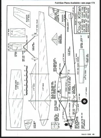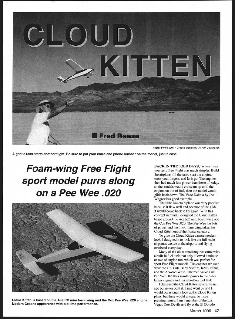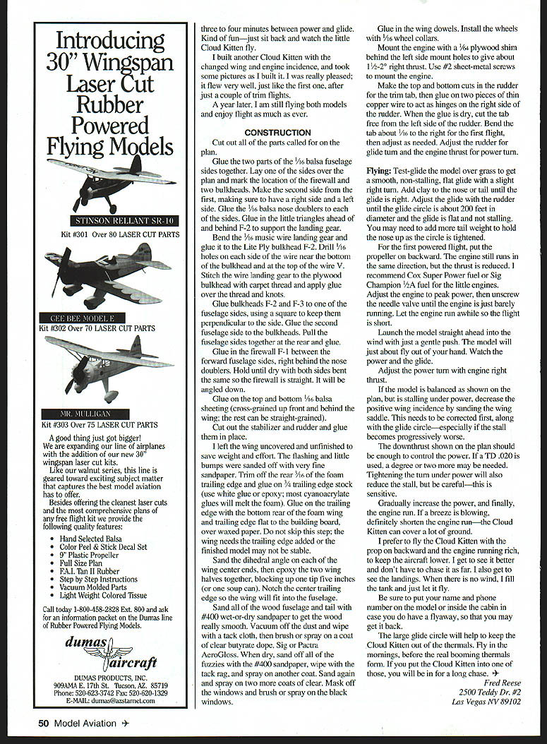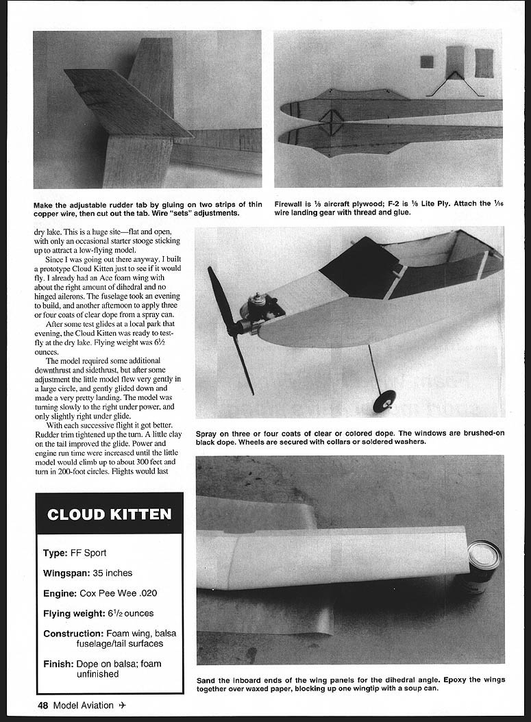Foam-wing Free Flight sport model purrs along BACK IN TILE OLD DAYS younger Free Flight much simpler Build airplane fill tank start engine cross fingers let go engines much less power today models would cruise up until engine ran out fuel model would glide back down Veco Dakota Joe Wagner good example little Dakota biplane very popular because flew well because glide would come back fly again concept mind designed Cloud Kitten based around Ace RC mini foam wing Cox Pee Wee 020 Pee Wee has lots power thick foam wing takes Cloud Kitten out floater category give Cloud Kitten modem look designed look like full-scale airplanes see airports flying overhead day older small engines came built-in fuel tank allowed minute two engine run perfect sport Free Flight models engines used OK Cub Baby Spitfire K&B Infant Atwood Wasp reed valve Cox Pee Wee 020 has similar power older larger engines has built-in fuel tank designed Cloud Kitten several years ago never built Time went would occasionally look Cloud Kitten plans would always pressing issues am member Las Vegas Dust Devils fly El Dorado March 1999 47 Photos author Graphic Design Jill Ann Cavanaugh gentle toss starts another flight sure put name phone number model just case Pee Wee O2O Cloud Kitten based Ace RC mini foam wing Cox Pee Wee 020 engine Modern Cessna appearance old-time performance dry lake huge siteflat open occasional starter stooge sticking up attract low-flying model Since going out anyway built prototype Cloud Kitten just see would fly already Ace foam wing about right amount dihedral no hinged ailerons fuselage took evening build another afternoon apply three four coats clear dope spray can After some test glides local park evening Cloud Kitten ready testfly dry lake Flying weight 6 ounces model required some additional downthrust sidethrust after some adjustment little model flew very gently large circle gently glided down made very pretty landing model turning slowly right under power slightly right under glide successive flight got better Rudder trim tightened up turn little clay tall improved glide Power engine run time increased until little model would climb up about 300 feet turn 200-foot circles Flights would last 48 Model Aviation adjustable rudder tab gluing two strips thin Firewall /8 aircraft plywood F-2 VB Lite Ply Attach 1A6 copper wire cut out tab Wire sets adjustments wire landing gear thread glue Spray three four coats clear colored dope windows brushed-on black dope Wheels secured collars soldered washers Type FE Sport Wingspan 35 inches Engine Cox Pee Wee 020 Flying weight 61/2 ounces Construction Foam wing balsa fuselage/tail surfaces Finish Dope balsa foam unfinished Sand inboard ends wing panels dihedral angle Epoxy wings together over waxed paper blocking up wingtip soup can 0123456 II 1/8 UTE PLY OPTI%NAL II i iii WRAP WiTH THREA AND GLUE- 1/16 BALSA DRILL 1/16 1/16 BALSA__ DOUBLERS _____ I -fl II / / II___ 1/16 BALSA___ II II II II II II b O~CE~ WINDOW OUTUNE FOR CLARrIY THE LEFT SIDE OF THE FUSELAGE IS NOT SHOWN 1/16 BAJSA LANDING GEAR REINFORCEMENTS -1/16 WiRE GEAN\/( LANDINO 1/16 WHEEL COLLAR 1/16 BALSA 5 5Ii 5 5 AE RC 35 MINI FM WING TAPERED OR CONSTANT CHORD -SOKi 01 TAPERED WING Fli/4 PLYSECURE WING WITHSOKi D2 CONSTANT CHORD WING uuINE SHIM24 #16 RUBBER TO GIVE BANDS 1/B PLY RIGHT THRUST 1/8 DOWEL 1/16 BALSA Fi \1/16BALSADOUBLERF-2 WRAP WITH THREAD MOUNT ENGINEAND GLUE WITH f2 SM SCREWS OR 258 BOLTS AND 1/16 BALSA BUND NUTSJjj/le WIRE 11/4WHEELS ENGINL COX PEE WEE 020 PROP 45 X 2 60 DOWNTHRUST K NOTCH TRAJUNG EDGE FOR RUBBER BANDS TO ~MOUNT THE WING 1/16 BALSA EPOXY WING HALVES TOGETHER 3/4 E STOCK 21 CUT OUT FOR RUBBER BANDS 1/16 BALSA LANDING GEAR REINFORCEMENTS DIHEDRAU BLOCK UP ONE WING TIP 4 #872 /K/711/ GLUE 1 /32 S / TO ADJUST DERTAB-b4 Cloud Kitten SPORT FREE FLIGHT FOR COX PEE WEE 020 ENGINE WINGSPAN 35 LENGTH 25 DESIGNED BY FRED REESE RUDDER 1/16 BALSA Introducing 30 Wingspan Laser Cut Rubber Powered Flying Models Kit #301 Over 80 LASER CUT PARTS w Kit #303 Over 75 LASER CUT PARTS good thing just got bigger expanding line airplanes addition new 30 wingspan laser cut kits Like walnut series line geared toward exciting subject matter captures best model aviation has offer Besides offering cleanest laser cuts comprehensive plans free flight kit provide following quality features Hand Selected Balsa Color Peel & Stick Decal Set 9 Plastic Propeller Full Size Plan FAI Tan II Rubber Step Step Instructions Vacuum Molded Parts Light Weight Colored Tissue Call today 1-800458-2828 Ext 800 ask information packet Dumas line Rubber Powered Flying Models dunaf aircraft DUMAS PRODUCTS INC 9O9AIvIA E 17th St Tucson AZ 85719 Phone 520-623-3742 Fax 520-620-1329 E-MAIL dumas@azstametcom three four minutes between power glide Kind funjust sit back watch little Cloud Kitten fly built another Cloud Kitten changed wing engine incidence took some pictures built really pleased flew very well just like first after just couple trim flights year later am still flying both models enjoy flight much ever CONSTRUCTION Cut out parts called plan Glue two parts A6 balsa fuselage sides together Lay sides over plan mark location firewall two bulkheads Make second side first making sure have right side left side Glue 1/16 balsa nose doublers sides Glue little triangles ahead behind F-2 support landing gear Bend 1/16 music wire landing gear glue Lite Ply bulkhead F-2 Drill /16 holes side wire near bottom bulkhead top wire V Stitch wire landing gear plywood bulkhead carpet thread apply glue over thread knots Glue bulkheads F-2 F-3 fuselage sides using square keep perpendicular side Glue second fuselage side bulkheads Pull fuselage sides together rear glue Glue firewall F- 1 between forward fuselage sides right behind nose doublers Hold until dry both sides bent same firewall straight will angled down Glue top bottom /16 balsa sheeting cross-grained up front behind wing rest can straight-grained Cut out stabilizer rudder glue pl