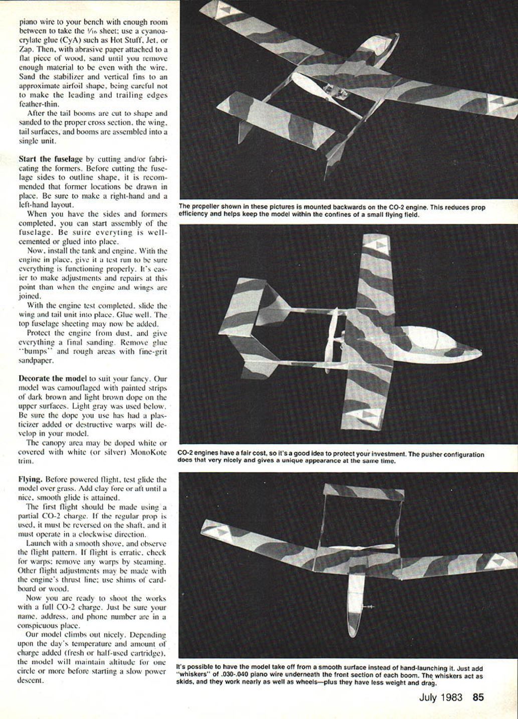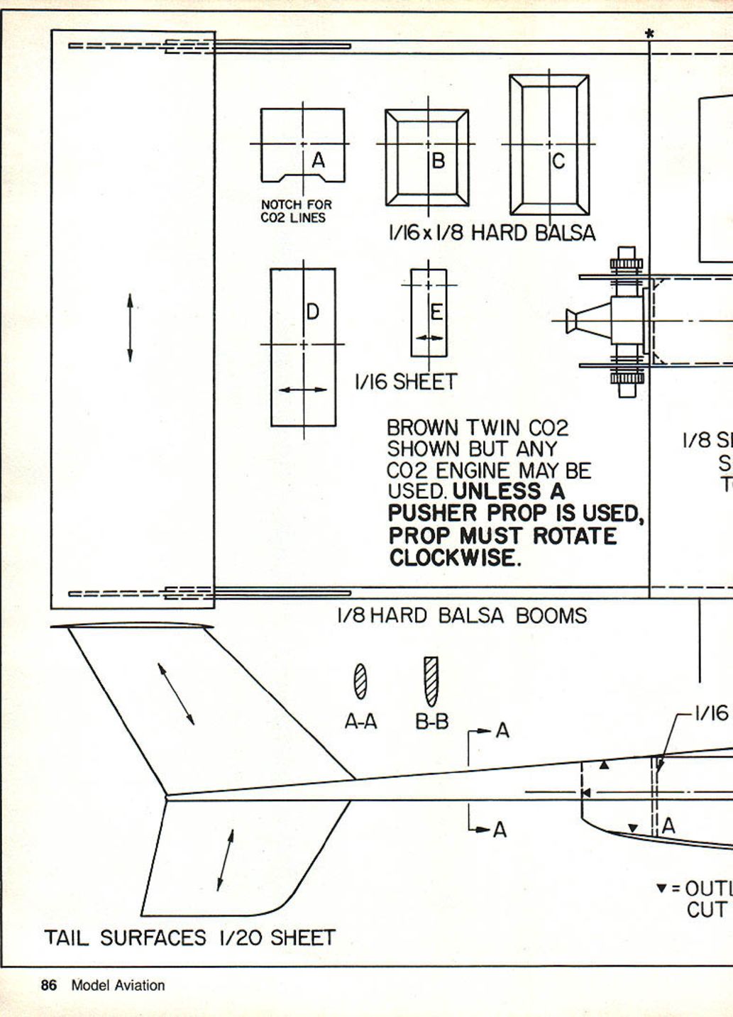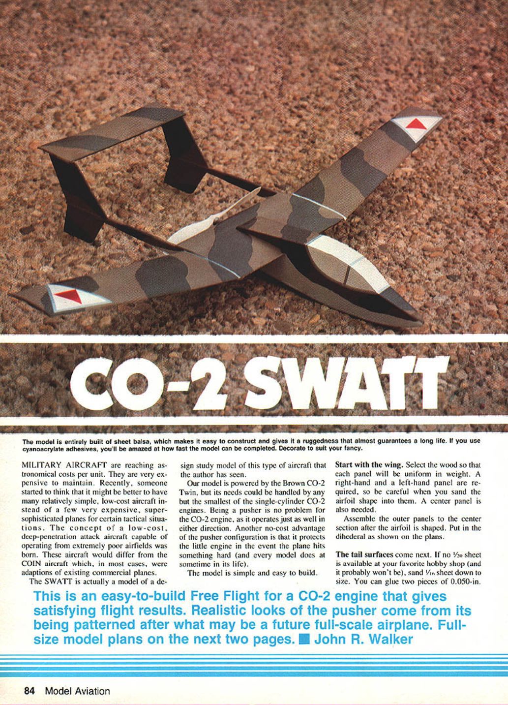 The model entirely built sheet balsa makes easy construct gives ruggedness almost guarantees long life use cyanoacrylate adhesives youll amazed fast model can completed Decorate suit fancy MILITARY AIRCRAFT reaching tronomical costs per unit very ex pensive maintain Recently someone started think might better have relatively simple low-cost aircraft stead few very expensive supersophisticated planes certain tactical situa tions concept low-cost deep-penetration attack aircraft capable operating extremely poor airfields born aircraft would differ COIN aircraft cases adaptions existing commercial planes SWATT actually model de sign study model type aircraft author has seen model powered Brown CO-2 Twin its needs could handled smallest single-cylinder CO-2 engines Being pusher no problem CO-2 engine operates just well either direction Another no-cost advantage pusher configuration protects little engine event plane hits something hard model does sometime its life model simple easy build Start wing Select wood panel will uniform weight right-hand left-hand panel re quired careful sand airfoil shape center panel also needed Assemble outer panels center section after airfoil shaped Put dihederal shown plans tail surfaces come next no u sheet available favorite hobby shop probably wont sand /16 sheet down size can glue two pieces 0050-in easy-to-build Free Flight CO-2 egn sArK flight results RealisVc oof pis - 2O~i being d -after what may Iz h4ure uY w- rpre moplans next two pages U J& 84 Model Aviation piano wire bench enough room between take /16 sheet use cyanoa crylate glue CyA such Hot Stuff Jet Zap abrasive paper attached flat piece wood sand until remove enough material wire Sand stabilizer vertical fins approximate airfoil shape being careful make leading trailing edges feather-thin After tail booms cut shape sanded proper cross section wing tail surfaces booms assembled single unit Start fuselage cutting and/or fabri cating formers Before cutting fuse lage sides outline shape recom mended former locations drawn place sure make right-hand left-hand layout have sides formers completed can start assembly fuselage suire everyting wellcemented glued place Now install tank engine engine place give test run sure everything functioning properly Its eas ier make adjustments repairs point engine wings joined engine test conipleted slide wing tail unit place Glue well top fuselage sheeting may now added Protect engine dust give everything final sanding Remove glue bumps' rough areas fine-erit sandpaper Decorate model suit fancy model camouflaged painted strips dark brown light brown dope upper surfaces Light gray used below sure dope use has plas ticizer added destructive warps will de velop model canopy area may doped white covered white silver MonoKote trim Flying Before powered flight test glide model over grass Add clay fore aft until nice smooth glide attained first tlight should made using partial CO-2 charge regular prop used must reversed shaft must operate clockwise direction Launch smooth shove observe flight pattern Ilight erratic check warps remove warps steaming Other flight adjustments may made engines thrust line use shims card board wood Now ready shoot works full CO-2 charge Just sure name address phone number conspicuous place model climbs out nicely Depending upon days temperature amount charge added lresh half-used cartridge model will maintain altitude circle before starting slow power descent July 1983 85 propeller shown pictures mounted backwards CO-2 engine reduces prop efficiency helps keep model within confines small flying field CO-2 engines have fair cost its good idea protect investment pusher configuration does very nicely gives unique appearance same time Its possible have model take off smooth surface instead hand-launching Just add whiskers 030-040 piano wire underneath front section boom whiskers act skids work nearly well wheelsplus have less weight drag * H FOR C02 LINES D C I/16x 1/8 HARD BALSA -rPm 1/16 SHEET BROWN TWIN 002 SHOWN BUT ANY C02 ENGINE MAY BE USED UNLESS PUSHER PROP IS USED PROP MUST ROTATE CLOCKWISE 1/8 HARD BALSA BOOMS o U A-A B-B 71/8 SISE 1/16 1 r OUTL CUT TAIL SURFACES 1/20 SHEET 86 Model Aviation / LE 1 1/8 SHEET MAKE RH & LH PANELS SAND TO AIRFOIL SHAPE ~I1 ii ET CENTER HON SAND JRFOIL SHAPE II I r r II II L $ / K // / IIIi K. BI86 /1/ 0 WATT 2 II Ii liD II V FUSELAGE SIDE 1/20 OR 1/16 SHEET SOFT BALSA BLOCK ARROWS INDICATE GRAIN DIRECTIOf$ July 1983 87 * II 3 EOF OM JRW