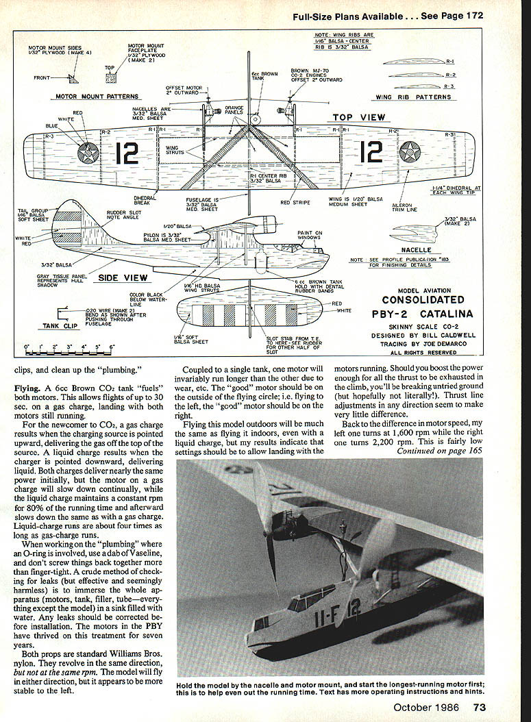 WITH BUT FEW EXCEPTIONS multiengine Free Flight Scale models turn disasters never leave drawing board engine always seems quit wrong time Profile Scale offers quick simple answers just such problems PBY good starting point twin-engine venture because parasol wing gives natural stability has no landing gear knock off engines very close centerline particular model built two evenings over half time spent decorating keep resembling flying lumberyard decorating scheme can found center spread Profile Publication #183 model intended fly indoors over basketball court 26-ft ceiling although flies just well outdoors Just take Hot Stuff along Brown MJ-70 motors used new Campus Bee Telco should work fine Telco provided Brown tank single fuel source Construction Cut various parts appropriate balsa indicated plans making sure grain direc tion Decorate model before assembling parts Japanese tissue held down Pritt glue stick used along Sharpie pen black outlines Avoid dop ing Just finish-sand parts 400grit finer sandpaper Think light Make wing three sections Turn section upside down something flat Starting trailing edge Hot Stuff rib place form airfoil Sand inner rib outer panel form 1 dihedral wing tip Butt-glue panels together Glue pylon main fuselage Hot Stuff glue wing pylon bracing assembly four wing struts Slot leading edge rudder trailing edge stabilizer Glue rudder fuselage stabil izer ruder slot Glue nacelles wing plywood motor mounts nacelles Make sure props clear fuselage other Mount tank wire 72 Model Aviation Bend plumbing flt before screwing motors place Take great care avoid kinks Mount tank outside flight circle consistent running Full-Size Plans Available. See Page 172 MOTOR MOUNT SIDES /32 PLYWOOD MAE 4 FRONT MOTOR MOUNT PACE P LATE 1/32 PLYWOOD /MAKE 2 TOP MOTOR MOUNT TTERNS RED WHITE BLUE R -U-42 TAIIc GROUPR 1/16 BALSANOTE ANGLE SOFT SHEETII WHITEIII RED OFFSET MOTOR 2 OUTWARD NACELLES ARE-ORANGE 3132 BALSAPANELS MED SHEET RI__ RI WING STRU NOTE WING RIBS ARE 1/16 BALSA CENTER RIB IS 3/32 BALSA BROWN MJ-7O 6cc BROWNCO-2 ENGINES TANKOFFSET 2 OUTWARD 0 R-I ____ -1 II-hR-I CENTER RIB IXL32BALSA R -2 R- 3 WING RIB PATTERNS TOP VIEW RR2 I2 4 D HEDRAL AT /EACH W NG T P ERON RM NE // DIHEDRALFUSELAGE ISRED STRIFE BREA13/32 BALSA MED SHEET 3/32 BALSA MAKE 2 NACELLE --NOTE PROFILE PUBLICAION dIB3 3/32 BALSA GRAY TISSUE PANEL REPRESENTS HULL ____________________ SHADOW 1/16 HD BALSA WING STRUT COLOR BLACK BELOW WATER-LINEIO2O WIRE MAKE 2 IBEND AS SHOWN AFTER PUSHING THROU TANK CLIP FUSELAGE I/I SOFT BALSA SHEET 0I23456 Ltfl II I B cc BROWN TANK -HOLD WITH DENTAL RUBBER BANDSMODEL AVIATION REDCONSOLIDATED ~~WHITEPBY-2 CATALINA SLOT STAB FROM T E TO HERE-SEE RUDDER FOR OTHER HALF OF SLOT SKINNY SCALE CO-2 DESIGNED BY BILL CALDWELL TRACING BY OE DEMARCO ALL RIGHTS D~DVfl FOR FINISHING DETAILS WING IS 1/20 BALSA MEDIUM SHEET clips clean up plumbing Flying 6cc Brown COz tank fuels both motors allows flights up 30 sec gas charge landing both motors still running newcomer COz gas charge results charging source pointed upward delivering gas off top source liquid charge results charger pointed downward delivering liquid Both charges deliver nearly same power initially motor gas charge will slow down continually liquid charge maintains constant rpm 80% running time afterward slows down same gas charge Liquid-charge runs about four times long gas-charge runs working plumbing 0-ring involved use dab ofVaseline dont screw things back together finger-tight crude method check ing leaks effective seemingly harmless immerse whole ap paratus motors tank filler tubeevery thing except model sink filled water Any leaks should corrected fore installation motors PBY have thrived treatment seven years Both props standard Williams Bros nylon revolve same direction same rpm model will fly either direction appears stable left Coupled single tank motor will invariably run longer other due wear etc good motor should outside flying circle ie flying left good motor should right Flying model outdoors will much same flying indoors liquid charge results indicate settin2s should allow landinn motors running Should boost power enough thrust exhausted climb youll breaking untried ground hopefully literally Thrust line adjustments direction seem make very little difference Back difference motor speed left turns 1600 rpm right turns 2200 rpm fairly low Continued vaze 165 October 1986 73 Hold model nacelle motor mount start longest-running motor first help out running time Text has operating instructions hints See ya downwind Harry Murphy 3824 Oakwood Blvd An derson IN 46011 PBY/CaldwelI Continued page 73 power Learning set differential ear hard might seem Starting low gradually increase power both motors until model climbs gently PBY simply turns tighter left right motor runs too fast vice-versa red face results motor starts backward model quite majestic flight glide nice Indoor Champs/Clemens Continued page 77 open title ice 1146 withstood repeated assaults determined came Chicago Aeronuts Chuck Markos 1112 third flight good second Don Steeb Rochester NY took third 1112 personal best well no Seniors flew NPP Junior Don Slusarczyk took first 713 followed Richard Smith 517 Slu sarczyk also won Pennyplane posting 605 Smith again runner-up 541 Bob Skrjanc took Senior 755 flight Veteran Pennyplaner Gordon Wisniew ski easily took Open 1301 besting second-place-finisher Walt VanGorder turned 1137 newcomer Dick Miller 1117 earned him third Less minute separated first place third Manhattan Cabin Chuck Markos clocked 845 win Walt VanGorder hard heels mere turn winder crank away 837 Third went Ron Ganser model did 756 FAI Stick resumed 2 pm along excruciating model airplane events Indoor Cabin Larry Loucka man inflict undue pain stress himself cranked up lone official flight 2011 didnt have again very good flight stood test Ron Gan sers Flying Disc stayed up second 1742 flight Dan Belieffs best 1501 good enough third fourplane field FAI hot