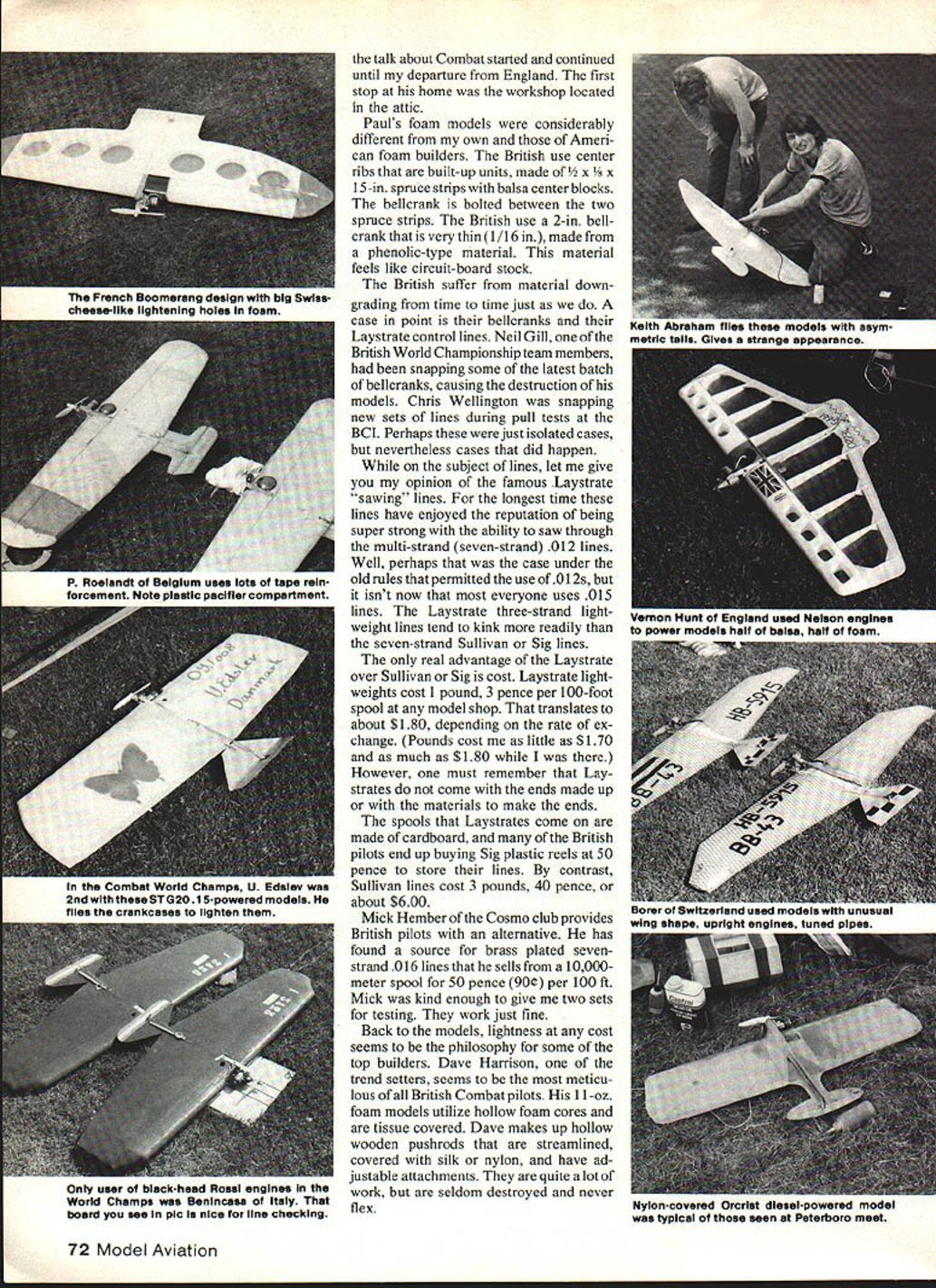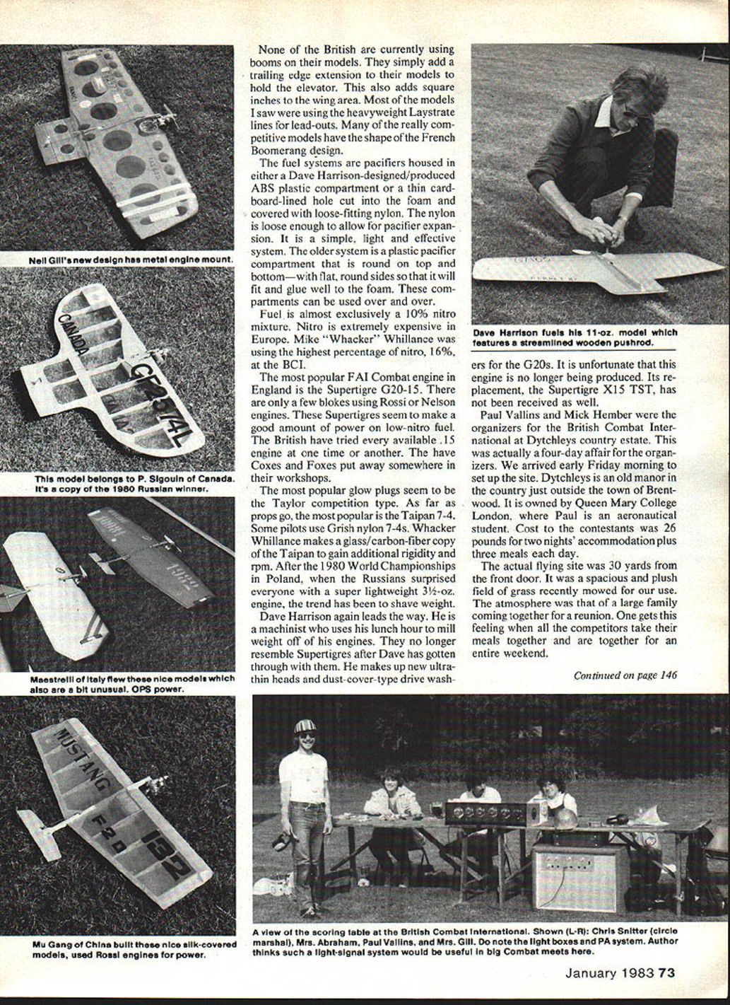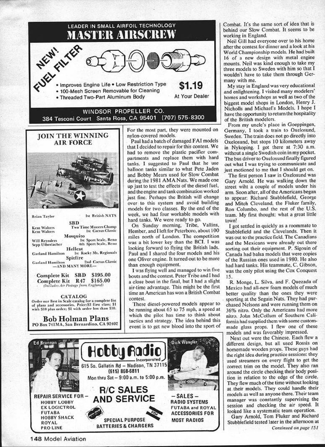 The author CL Combat modelers dream vacation trip started out visit Eng land met other fliers persua sion took couple Combat meetsand wound up Sweden World Champion ships report highlights models saw 1982 WAS THE YEAR European vacationnot whirlwind 10countries-in-lO-days deals leisurely stay modelers England visit uncle Germany trip Sweden Control Line World C ham pionships years have read Englands Aero Modeller magazine have always very interested Combat reports much blow-by-blow contest accounts design trends British years have dominated Combat competitions throughout Europe Brit ish pilots often travel Netherlands Belgium European championships ambition see participate such competitions made up mind priorto 1982 USA Combat Team Trials go Sweden conversations Steve Hills Jed Kusik John McCollum Larry Jolly Phil Granderson about past World Cham pionships convinced miss 1982 read Dirty Dan Rutherfords column Model Builder British holding British Combat International BCI weekend July 3 4 extending invitations foreign cornpetitors wrote organizers promptly received call Paul Vallins Cosmo Club offering place stay Now firm timetable could set modeling vacation June 29th departure date July 27 return date return date allowed plenty time get AMA Nats Lincoln NE What does take such extended vacation found essentials camera clothes three models lots trading material After 10 hours TWA 747 Londons Heathrow airport quick call Paul Vallins got direc tions home First ride tube British subway ride train got town Bexley Paul waiting After initial greetings January 198371 Mark Jarret Peterboro ctub typical European-design model Chinas Wu Zhaoqlan pitman Dick Stubbiefleid knocked him Out contest Bart van den Bosache Belgium relaxes prior match talk about Combat started continued until departure England first stop home workshop located attic Pauls foam models considerably different own Ameri can foam builders British use center ribs built-up units made 15-in spruce strips balsa center blocks bellcrank bolted between two spruce strips British use 2-in bellcrank very thin 1/16 made phenolic-type material material feels like circuit-board stock British suffer material down grading time time just case point bellcranks Laystrate control lines Neil Gill British World Championship team members snapping some latest batch bellcranks causing destruction models Chris Wellington snapping new sets lines during pull tests BCI Perhaps just isolated cases nevertheless cases did happen subject lines let give opinion famous Laystrate sawing lines longest time lines have enjoyed reputation being super strong ability saw through multi-strand seven-strand 012 lines Well perhaps case under old rules permitted use of0l 2s isnt now everyone uses 015 lines Laystrate three-strand light weight lines tend kink readily seven-strand Sullivan Sig lines real advantage Laystrate over Sullivan Sig cost Laystrate light weights cost 1 pound 3 pence per 100-foot spool model shop translates about $180 depending rate ex change Pounds cost little $170 much $180 However must remember Lay strates come ends made up materials make ends spools Laystrates come made cardboard British pilots end up buying Sig plastic reels 50 pence store lines contrast Sullivan lines cost 3 pounds 40 pence about $600 Mick Hember Cosmo club provides British pilots alternative has found source brass plated sevenstrand 016 lines sells 10000meter spool 50 pence 90 per 100 ft Mick kind enough give two sets testing work just fine Back models lightness cost seems philosophy some top builders Dave Harrison trend setters seems meticu lous British Combat pilots l-oz foam models utilize hollow foam cores tissue covered Dave makes up hollow wooden pushrods streamlined covered silk nylon have ad justable attachments quite lot work seldom destroyed never flex 72 Model Aviation Tile French Doomerang design bi Swiss heeee-iike iiahtenina hale fnem Roelandt Belgium uses lots tape reinNote plastic pacifier compartment Vernon Hunt England used Nelson engines ~ hqlf balsa half foam Combat World Champs U EdaleY 2ndwiththeseSTG2O15-powersdmodels files crankeases lighten Borero vltzer1andusedmodels unusual wino ehnne unrloh enainee trifled nine Only user black-head Rossi engines World Champs Benincasa Italy board see plc nice line checking Nylon-covered Orcrist diesel-powered model typical seen Peterboro meet None British currently using booms models simply add trailing edge extension models hold elevator also adds square inches wing area Most models saw using heavyweight Laystrate lines lead-outs really com petitive models have shape French Boomerang design fuel systems pacifiers housed either Dave Harrison-designed/produced ABS plastic compartment thin card board-lined hole cut foam covered loose-fitting nylon nylon loose enough allow pacifier expan sion simple light effective system older system plastic pacifier compartment round top bottomwith flat round sides will fit glue well foam com partments can used over over Fuel almost exclusively 10% nitro mixture Nitro extremely expensive Europe Mike Whacker Whillance using highest percentage nitro 16% BCI popular FAI Combat engine England Supertigre G20-15 few blokes using Rossi Nelson engines Supertigres seem make good amount power low-nitro fuel British have tried available 15 engine time another have Coxes Foxes put away somewhere workshops popular glow plugs seem Taylor competition type As far props go popular Taipan 7-4 Some pilots use Grish nylon 7-4s Whacker Whillance makes glass/carbon-fiber copy Taipan gain additional rigidity rpm After 1980 World Championships Poland Russians surprised everyone super lightweight 3-oz engine trend has shave weight Dave Harrison again leads way machinist uses lunch hour mill weight off engines no longer resemble Supertigres after Dave has gotten through makes up new ultrathin heads dust-cover-type drive washers G2Os unfortunate engine no longer being produced Its re placement Supertigre XiS TST has 