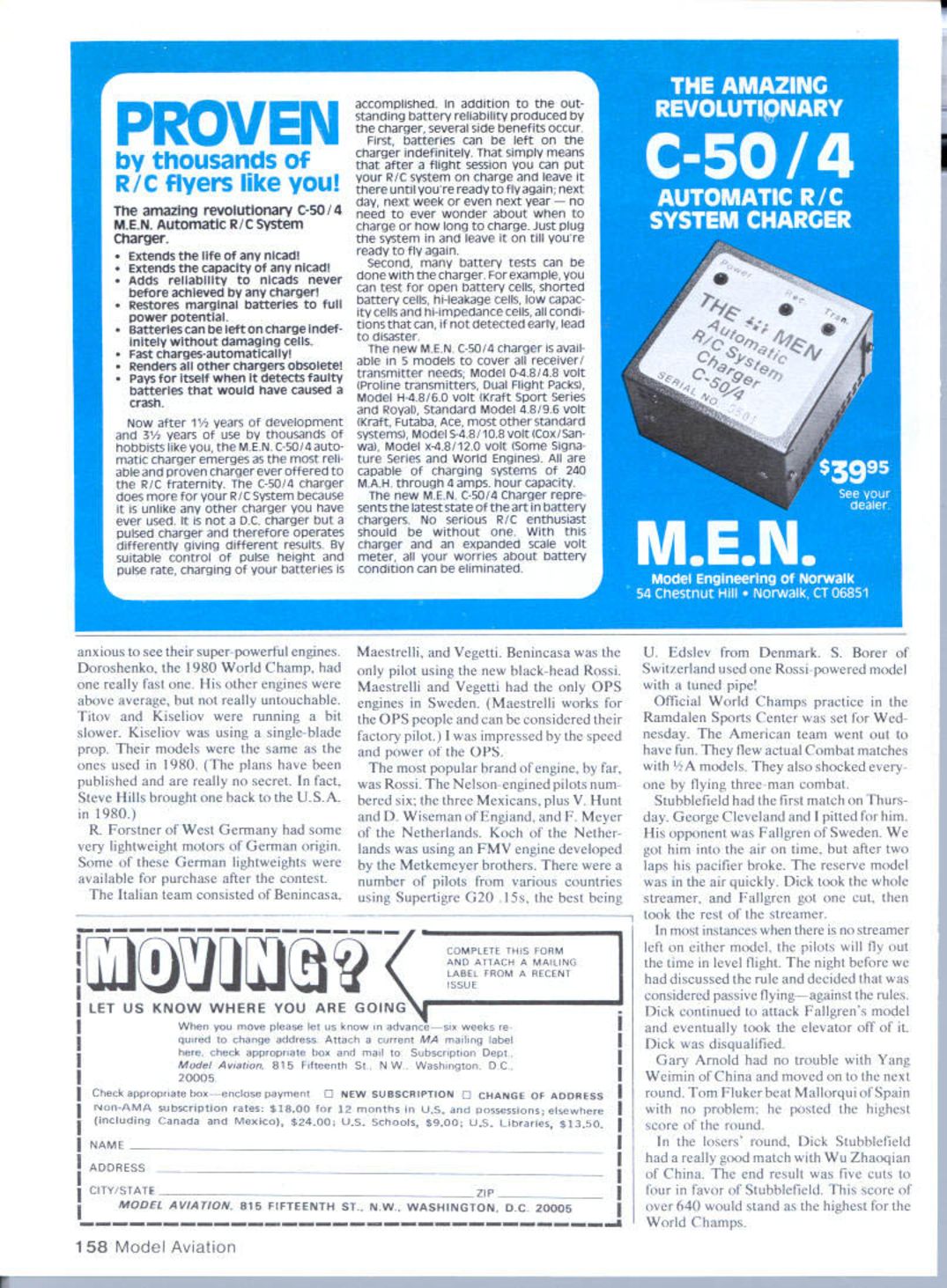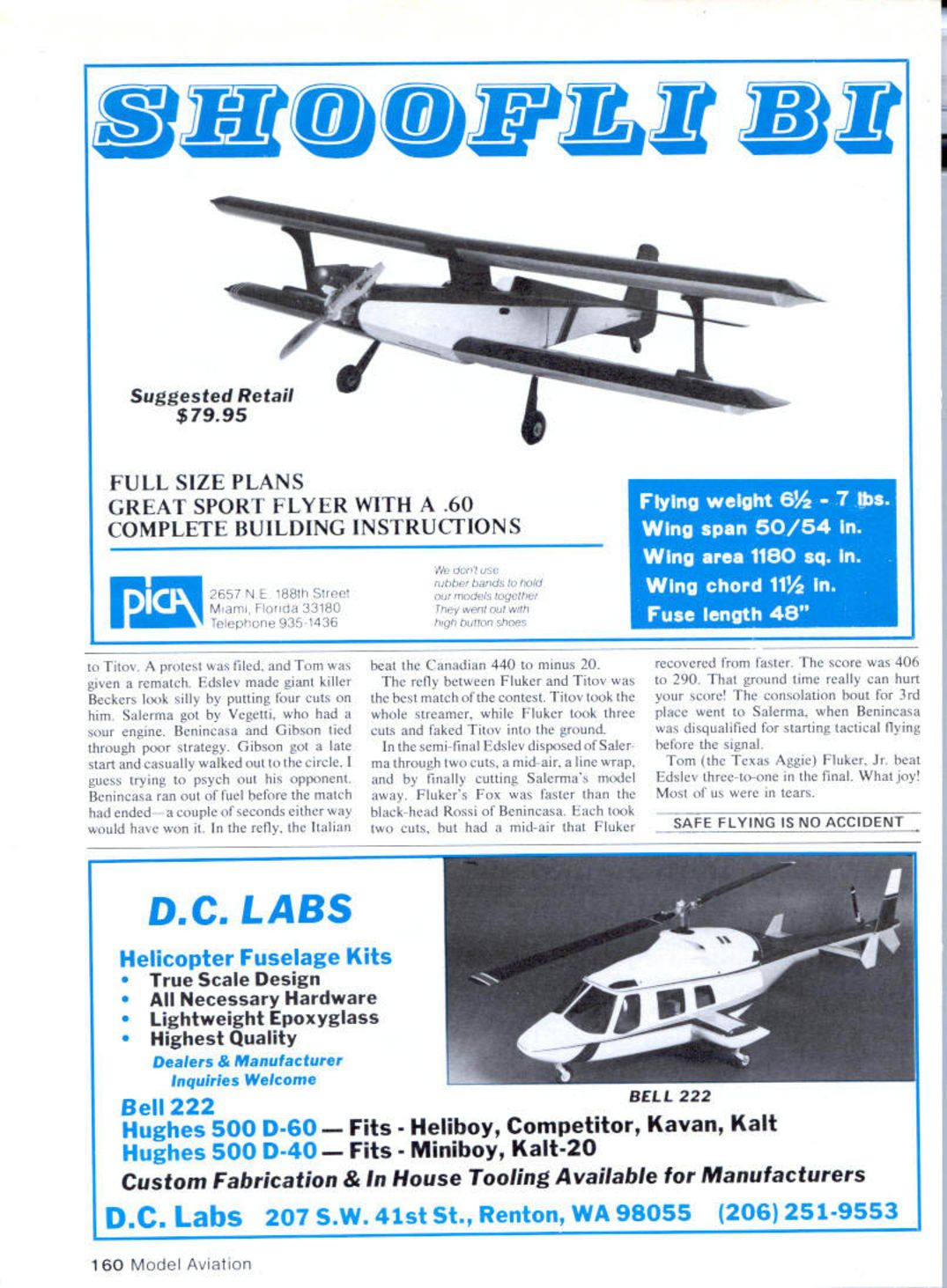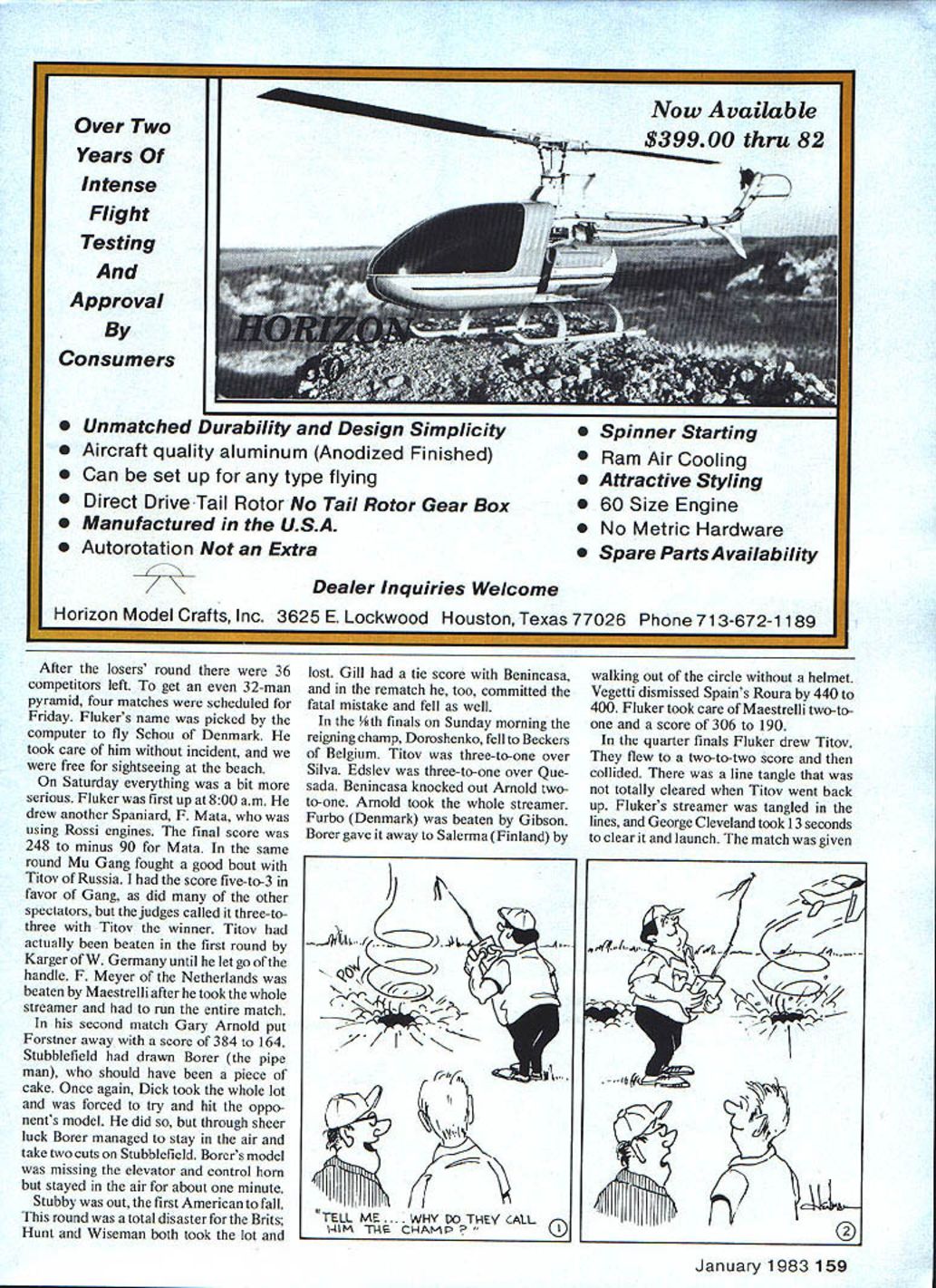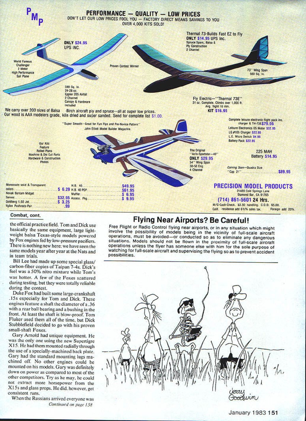 The author CL Combat modelers dream vacation trip started out visit Eng land met other fliers persua sion took couple Combat meetsand wound up Sweden World Champion ships report highlights models saw 1982 WAS THE YEAR European vacationnot whirlwind 10countries-in-lO-days deals leisurely stay modelers England visit uncle Germany trip Sweden Control Line World C ham pionships years have read Englands Aero Modeller magazine have always very interested Combat reports much blow-by-blow contest accounts design trends British years have dominated Combat competitions throughout Europe Brit ish pilots often travel Netherlands Belgium European championships ambition see participate such competitions made up mind priorto 1982 USA Combat Team Trials go Sweden conversations Steve Hills Jed Kusik John McCollum Larry Jolly Phil Granderson about past World Cham pionships convinced miss 1982 read Dirty Dan Rutherfords column Model Builder British holding British Combat International BCI weekend July 3 4 extending invitations foreign cornpetitors wrote organizers promptly received call Paul Vallins Cosmo Club offering place stay Now firm timetable could set modeling vacation June 29th departure date July 27 return date return date allowed plenty time get AMA Nats Lincoln NE What does take such extended vacation found essentials camera clothes three models lots trading material After 10 hours TWA 747 Londons Heathrow airport quick call Paul Vallins got direc tions home First ride tube British subway ride train got town Bexley Paul waiting After initial greetings January 198371 Mark Jarret Peterboro ctub typical European-design model Chinas Wu Zhaoqlan pitman Dick Stubbiefleid knocked him Out contest Bart van den Bosache Belgium relaxes prior match talk about Combat started continued until departure England first stop home workshop located attic Pauls foam models considerably different own Ameri can foam builders British use center ribs built-up units made 15-in spruce strips balsa center blocks bellcrank bolted between two spruce strips British use 2-in bellcrank very thin 1/16 made phenolic-type material material feels like circuit-board stock British suffer material down grading time time just case point bellcranks Laystrate control lines Neil Gill British World Championship team members snapping some latest batch bellcranks causing destruction models Chris Wellington snapping new sets lines during pull tests BCI Perhaps just isolated cases nevertheless cases did happen subject lines let give opinion famous Laystrate sawing lines longest time lines have enjoyed reputation being super strong ability saw through multi-strand seven-strand 012 lines Well perhaps case under old rules permitted use of0l 2s isnt now everyone uses 015 lines Laystrate three-strand light weight lines tend kink readily seven-strand Sullivan Sig lines real advantage Laystrate over Sullivan Sig cost Laystrate light weights cost 1 pound 3 pence per 100-foot spool model shop translates about $180 depending rate ex change Pounds cost little $170 much $180 However must remember Lay strates come ends made up materials make ends spools Laystrates come made cardboard British pilots end up buying Sig plastic reels 50 pence store lines contrast Sullivan lines cost 3 pounds 40 pence about $600 Mick Hember Cosmo club provides British pilots alternative has found source brass plated sevenstrand 016 lines sells 10000meter spool 50 pence 90 per 100 ft Mick kind enough give two sets testing work just fine Back models lightness cost seems philosophy some top builders Dave Harrison trend setters seems meticu lous British Combat pilots l-oz foam models utilize hollow foam cores tissue covered Dave makes up hollow wooden pushrods streamlined covered silk nylon have ad justable attachments quite lot work seldom destroyed never flex 72 Model Aviation Tile French Doomerang design bi Swiss heeee-iike iiahtenina hale fnem Roelandt Belgium uses lots tape reinNote plastic pacifier compartment Vernon Hunt England used Nelson engines ~ hqlf balsa half foam Combat World Champs U EdaleY 2ndwiththeseSTG2O15-powersdmodels files crankeases lighten Borero vltzer1andusedmodels unusual wino ehnne unrloh enainee trifled nine Only user black-head Rossi engines World Champs Benincasa Italy board see plc nice line checking Nylon-covered Orcrist diesel-powered model typical seen Peterboro meet None British currently using booms models simply add trailing edge extension models hold elevator also adds square inches wing area Most models saw using heavyweight Laystrate lines lead-outs really com petitive models have shape French Boomerang design fuel systems pacifiers housed either Dave Harrison-designed/produced ABS plastic compartment thin card board-lined hole cut foam covered loose-fitting nylon nylon loose enough allow pacifier expan sion simple light effective system older system plastic pacifier compartment round top bottomwith flat round sides will fit glue well foam com partments can used over over Fuel almost exclusively 10% nitro mixture Nitro extremely expensive Europe Mike Whacker Whillance using highest percentage nitro 16% BCI popular FAI Combat engine England Supertigre G20-15 few blokes using Rossi Nelson engines Supertigres seem make good amount power low-nitro fuel British have tried available 15 engine time another have Coxes Foxes put away somewhere workshops popular glow plugs seem Taylor competition type As far props go popular Taipan 7-4 Some pilots use Grish nylon 7-4s Whacker Whillance makes glass/carbon-fiber copy Taipan gain additional rigidity rpm After 1980 World Championships Poland Russians surprised everyone super lightweight 3-oz engine trend has shave weight Dave Harrison again leads way machinist uses lunch hour mill weight off engines no longer resemble Supertigres after Dave has gotten through makes up new ultrathin heads dust-cover-type drive washers G2Os unfortunate engine no longer being produced Its re placement Supertigre XiS TST has 