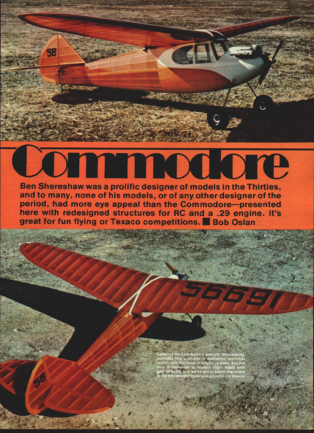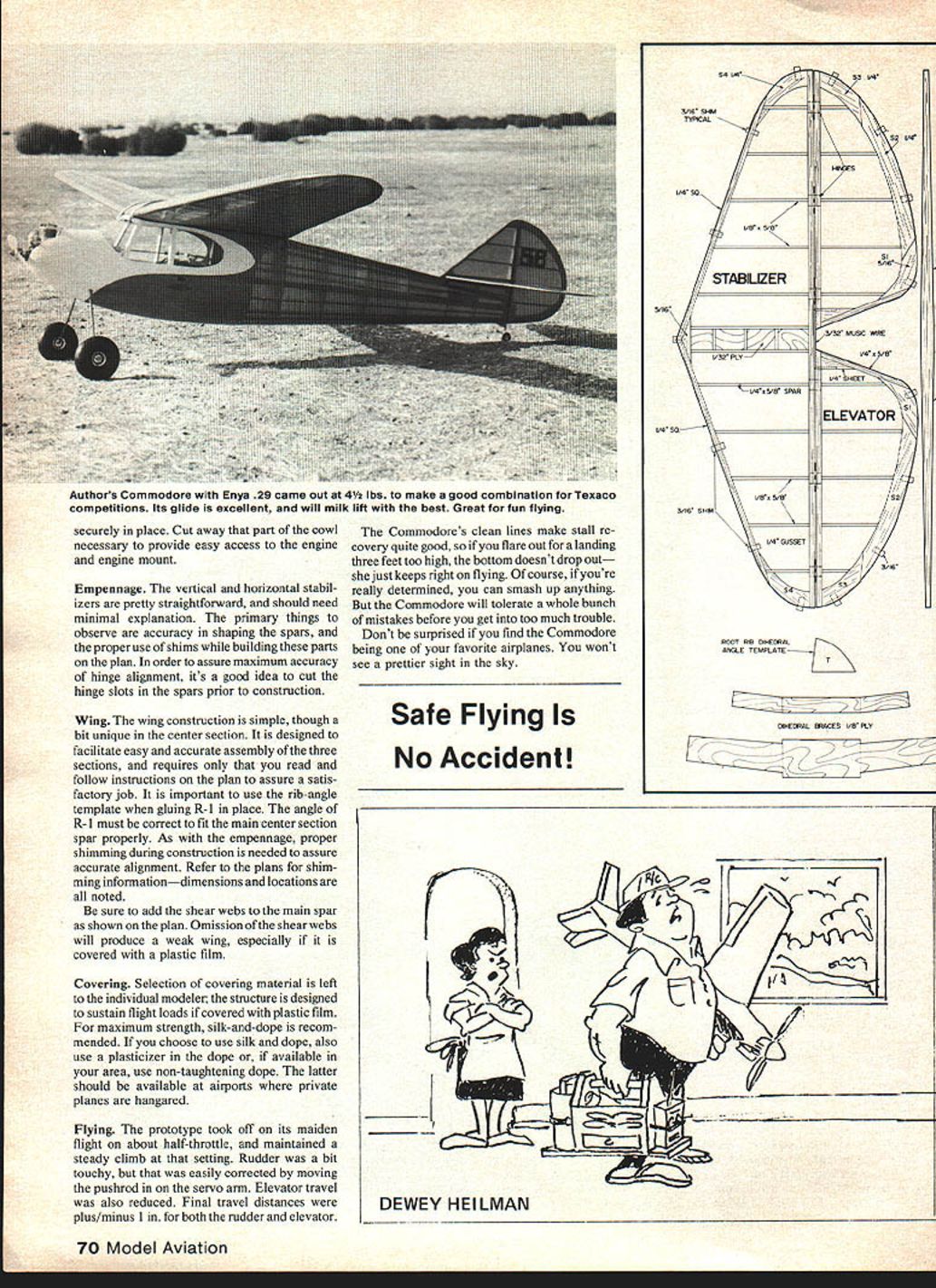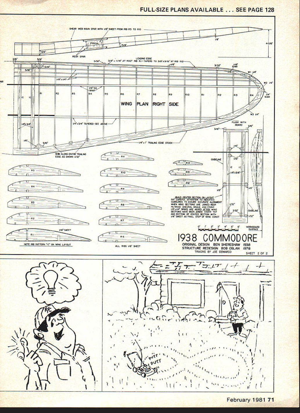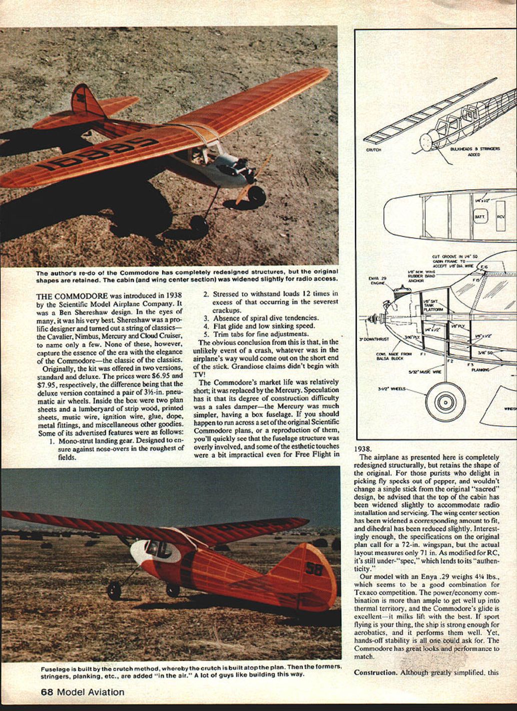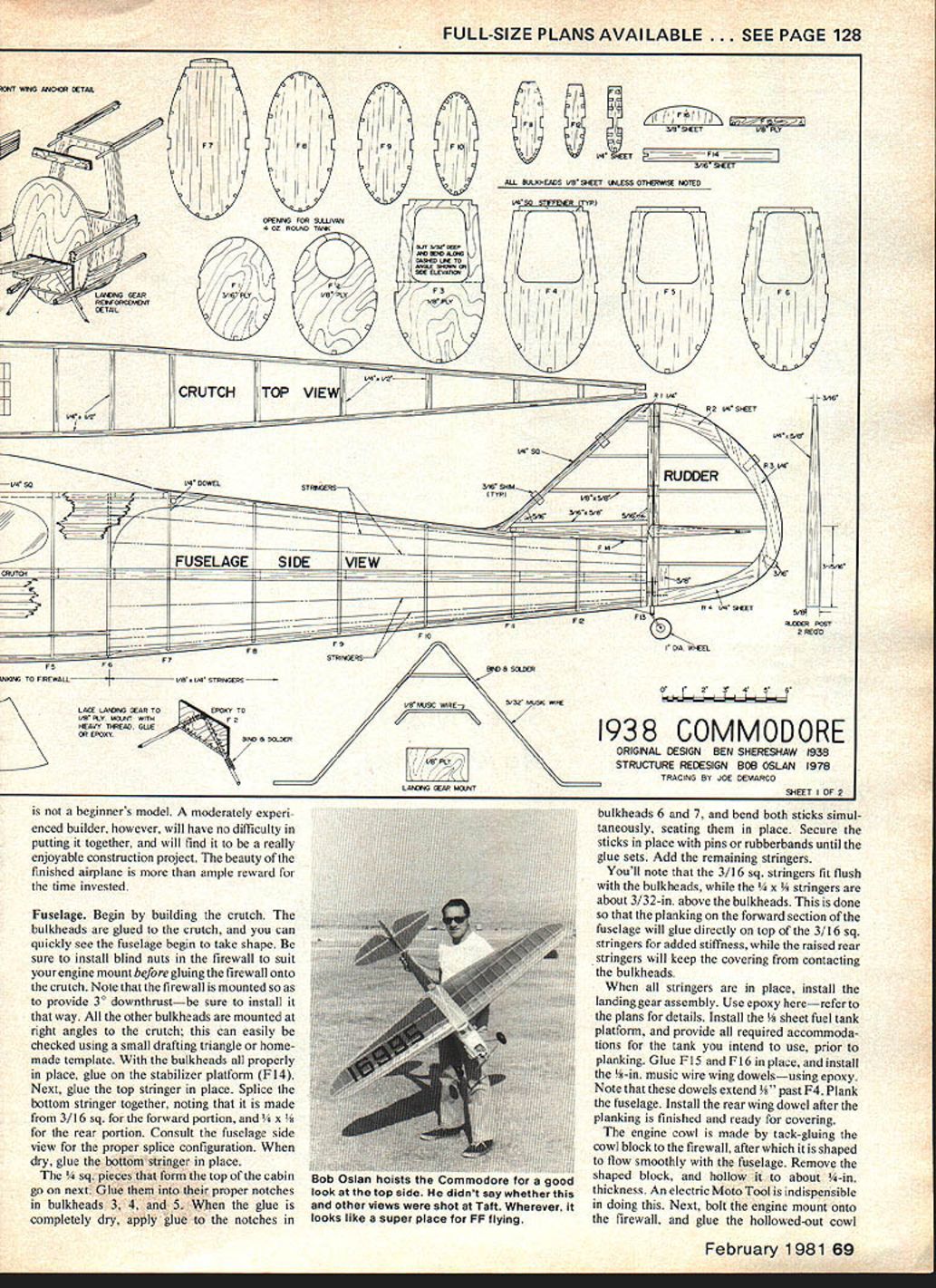 NO OCR TEXT THE COMMODORE introduced 1938 Scientific Model Airplane Company Ben Shereshaw design eyes very best Shereshaw pro lific designer turned out string classics Cavalier Nimbus Mercury Cloud Cruiser name few None however capture essence era elegance Commodorethe classic classics Originally kit offered two versions standard deluxe prices $695 $795 respectively difference being deluxe version contained pair 3-in pneu matic air wheels Inside box two plan sheets lumberyard strip wood printed sheets music wire ignition wire glue dope metal fittings miscellaneous other goodies Some its advertised features follows 1 Mono-strut landing gear Designed en sure against nose-overs roughest fields 2 Stressed withstand loads 12 times excess occurring severest crackups 3 Absence spiral dive tendencies 4 Flat glide low sinking speed 5 Trim tabs fine adjustments obvious conclusion unlikely event crash whatever airplanes way would come out short end stick Grandiose claims didnt begin TV Commodores market life relatively short replaced Mercury Speculation has its degree construction difficulty sales damperthe Mercury much simpler having box fuselage should happen run across set original Scientific Commodore plans reproduction youll quickly see fuselage structure overly involved some esthetic touches bit impractical Free Flight cRUTChSIIUWADS B OTRHBERG GD VRV2 BUTT CUT ANUCRE IN I/4 SO CA4 FRADf TO ACCEPT VBCRA I/B NIB WING RUBBER BANG ERYB 29ANCHORP15 ENGINE \1rTA 1PLATRBAR HO I/2 CORL MABE FRP I316 BALSA BLOCKP2 PU G/SO I4JSC WRIBPLAMBAG 3-V2 WAIBELS 0BROS 1938 airplane presented completely redesigned structurally retains shape original purists delight picking fly specks out pepper wouldnt change single stick original sacred design advised top cabin has widened slightly accommodate radio installation servicing wing center section has widened corresponding amount fit dihedral has reduced slightly Interest ingly enough specifications original plan call 72-in wingspan actual layout measures 71 As modified RC its still under-spec lends its authen ticity model Enya 29 weighs 4 lbs seems good combination Texaco competition power/economy com bination ample get well up thermal territory Commodores glide excellentit milks lift best sport flying thing ship strong enough aerobatics performs well Yet hands-off stability iotild ask Commodore has gret1ooksnnd performance match Construction Ahhuh greatly simplified 68 Model Aviation authors re-do Commodore has completely redesigned structureS original shapes retained cabin wing center section widened slightly radio access Fuselage built bythe crutch method wherebythe crutch built atopthe plan formers stringers planking etc added air lot guys like building way FULL-SIZE PLANS AVAILABLE . SEE PAGE 128 lENT WINO ANHEOR HETNL LAHEING GEAR REXFDROENWNT EETAIL Fl 0/IA CY FR CPEMNG FOR OWIVAoN H OZ ROUND TAMO F yR PLY oo F9FF0111 F3 [ F4 AR VD LCRUTCHTOP VIEW _ _ FM SE V4S0/4 DOWELSTRNHERS316 9454___________________ TYP DlE 1/5 516 FF4 _____ ____________ FUSELAGESIDE __ VIEW______________________ 3/S GlEEVS FL FF41 57fl FlF R2 V4SFEET RUDDER IJ__ _____ ___________ ______ II _______ ________ _____________________ ___ _______ 5/S RH I/S SEET FOFF0 FF1 -FRI OS WHEEL FT FlF6 tOOlS TO FIREWALL1/5% I/C SYRINDERS ~WIR5/03 MUSIC HOE HEIJTO111 LACE LAIWARIG HEAR TO Y TO VS PLY MOCFT WITHJ7F 2 HEAVY ThREAD OWE HE EPOXY SCEGER - ho/K I/O SHE 0-Il/K FLEW POST 0 REDO beginners model moderately experi enced builder however will have no difficulty putting together will find really enjoyable construction project beauty finished airplane ample reward time invested Fuselage Begin building crutch bulkheads glued crutch can quickly see fuselage begin take shape sure install blind nuts firewall suit engine mount before gluing firewall onto crutch Note firewall mounted provide 30 downthrustbe sure install way other bulkheads mounted right angles crutch can easily checked using small drafting triangle home made template bulkheads properly place glue stabilizer platform F 14 Next glue top stringer place Splice bottom stringer together noting made 3/16 sq forward portion 14 x S rear portion Consult fuselage side view proper splice configuration dry glue bottom stringer place ieces form top cabin go next Glue proper notches bulkheads 3 4 5 glue completely dry apply glue notches bulkheads 6 7 bend both sticks simul taneously seating place Secure sticks place pins rubberbands until glue sets Add remaining stringers Youll note 3/16 sq stringers fit flush bulkheads tringers about 3/32-in above bulkheads done planking forward section fuselage will glue directly top 3/16 sq stringers added stiffness raised rear stringers will keep covering contacting bulkheads stringers place install landing gear assembly Use epoxy hererefer plans details Install t fuel tank platform provide required accommoda tions tank intend use prior planking Glue F 15 F 16 place install -in music wire wing dowelsusing epoxy Note dowels extend F4 Plank fuselage Install rear wing dowel after planking finished ready covering engine cowl made tack-gluing cowl block firewall after shaped flow smoothly fuselage Remove shaped block hollow about -in thickness An electric Moto Tool indispensible doing Next bolt engine mount onto firewall glue hollowed-out cowl February 1981 69 ALL BULKHEADS /5 SHEET IWLEGS OThERWIGE NOTED 0F3345C LAIU HEAR MaMT 1938 COMMODORE ORIGINAL DESIGN BEN SHERESI-IAW 938 STRUCTURE REDESIGN BOB OSLAN 978 TRACING BY JOE DEMARCO SF-FEET IOFD nri 1u11rrooore goon look top aide didnt say whether other views shot Taft Wherever looks like super place FF flying securely place Cut away part cowl necessary provide easy access engine engine mount Empennage vertical horizontal stabil izers pretty straightforward should need minimal explanation primary things observe accuracy shaping spars proper use shims building parts plan order assure maximum accuracy hinge alignment its good idea cut hinge slots spars prior construction Wi