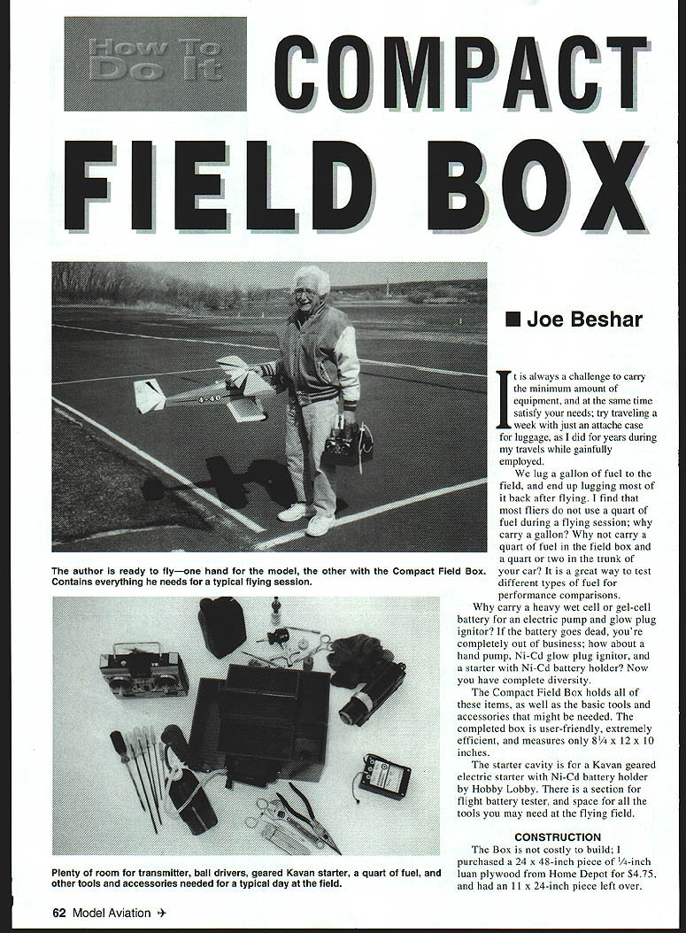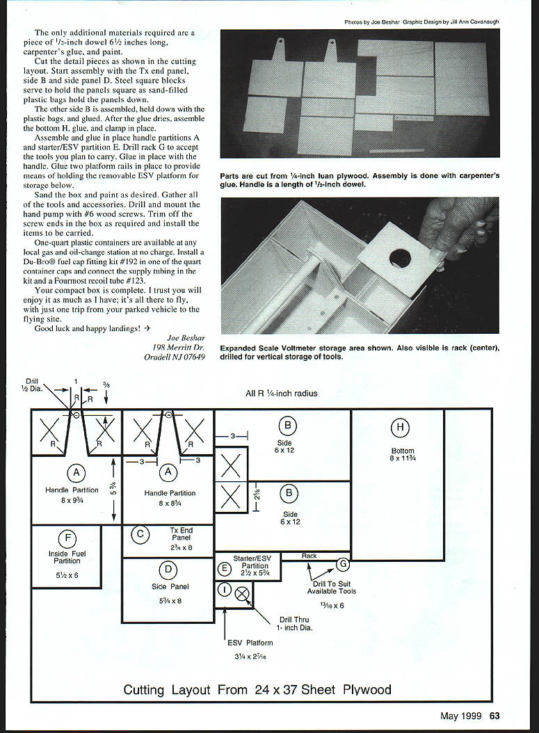 ACT Joe Beshar always challenge carry minimum amount equipment same time satisfy needs try traveling week just attache case luggage did years during travels gainfully employed lug gallon fuel field end up lugging back after flying find fliers use quart fuel during flying session carry gallon carry quart fuel field box quart two trunk car great way test different types fuel performance comparisons carry heavy wet cell gel-cell battery electric pump glow plug ignitor battery goes dead youre completely out business about hand pump Ni-Cd glow plug ignitor starter Ni-Cd battery holder Now have complete diversity Compact Field Box holds items well basic tools accessories might needed completed box user-friendly extremely efficient measures 81/4 x 12 x 10 inches starter cavity Kavan geared electric starter Ni-Cd battery holder Hobby Lobby section flight battery tester space tools may need flying field CONSTRUCTION Box costly build purchased 24 x 48-inch piece /4-inch luan plywood Home Depot $475 11 x 24-inch piece left over 62 Model Aviation or ready flyone hand model other Compact Field Box Contains everything needs typical flying session Plenty room transmitter ball drivers geared Kavan starter quart fuel other tools accessories needed typical day field additional materials required piece 1/2-inch dowel 6/2 inches long carpenters glue paint Cut detail pieces shown cutting layout Start assembly Tx end panel side B side panel D Steel square blocks serve hold panels square sand-filled plastic bags hold panels down other side B assembled held down plastic bags glued After glue dries assemble bottom H glue clamp place Assemble glue place handle partitions starter/ESV partition B Drill rack G accept tools plan carry Glue place handle Glue two platform rails place provide means holding removable ESV platform storage below Sand box paint desired Gather tools accessories Drill mount hand pump #6 wood screws Trim off screw ends box required install items carried One-quart plastic containers available local gas oil-change station no charge Install Du-Bro fuel cap fitting kit #192 quart container caps connect supply tubing kit Fourmost recoil tube #123 compact box complete trust will enjoy much have its fly just trip parked vehicle flying site Good luck happy landings Beshar 198 Merritt Dr Oradell NJ 07649 Drill 1/2Dla * Photos Joe Beshar Graphic Design Jill Ann Cavanaugh R 1Ainch radius Handle Partition 8 x 9 0 Inside Fuel Partition 51/2 x 6 t 3--Il3 0 Handle Partition 8 x 8 Panel 2/4 X 8 Side Panel 5 x 8 3I x x Side 6 x 12 C\J Starter/ESV Partition 5 ESV Platform Side 6 x 12 Drill Thru 1-inch Dia 3 x 27/ie Cutting Layout 24 x 37 Sheet Plywood May1999 63 Parts cut -inch luan plywood Assembly done carpenters glue Handle length 12-inch dowel Expanded Scale Voltmeter storage area shown Also visible rack center drilled vertical storage tools Bottom 8 x 11 Rack Drill Suit Available Tools 13A6 x 6