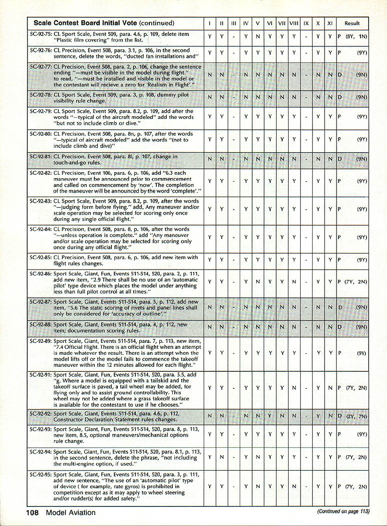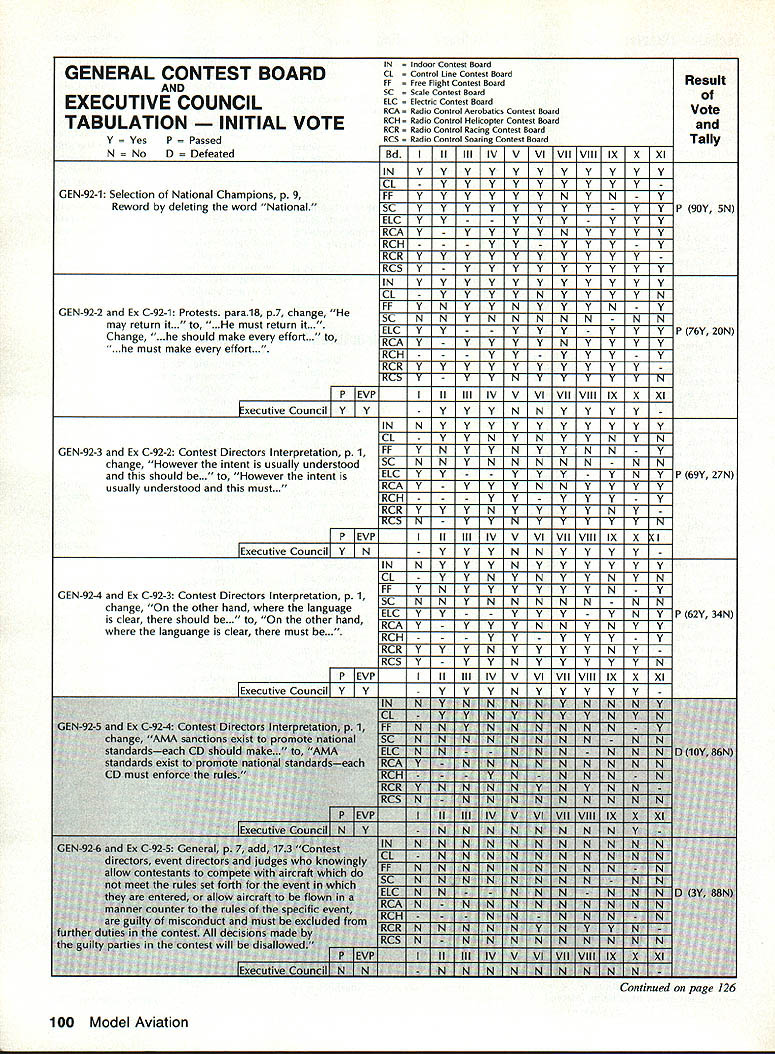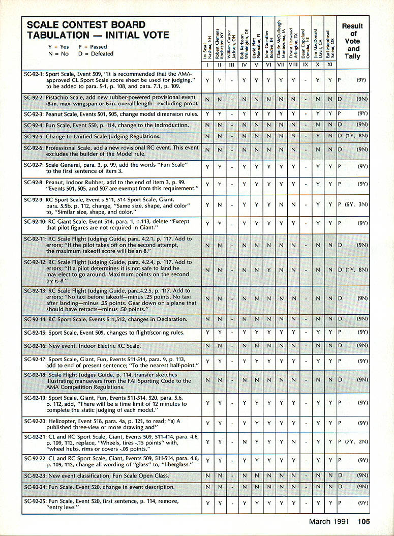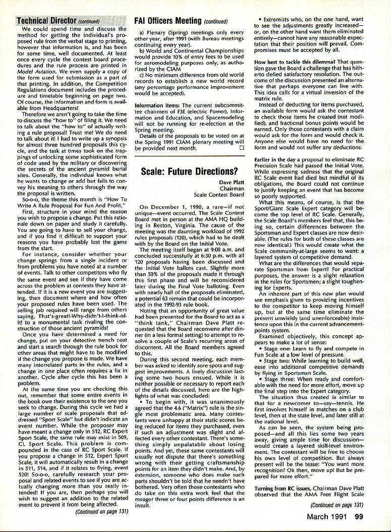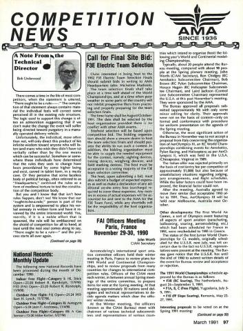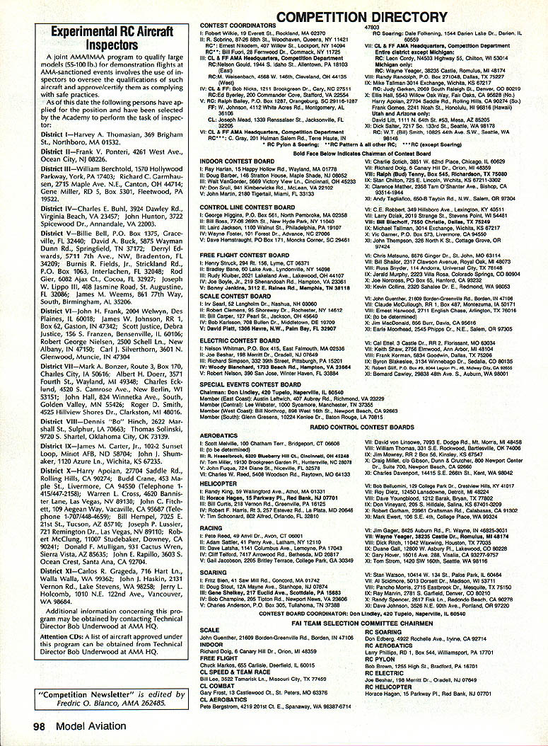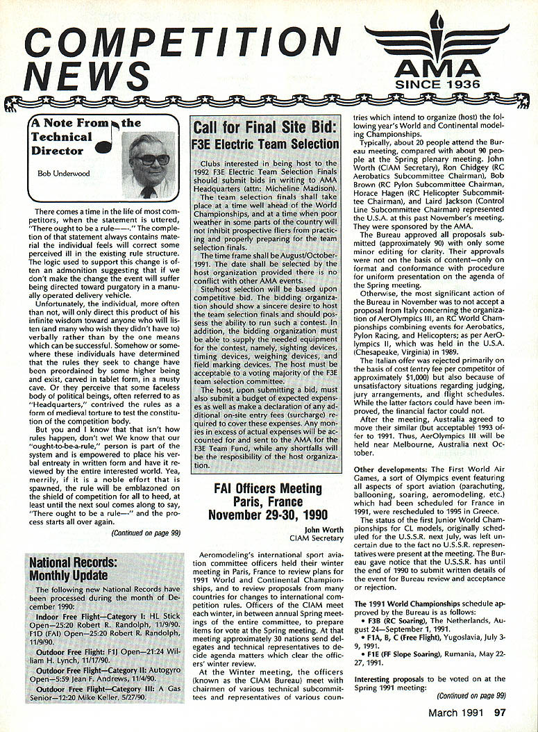 COMPETITION ___________ AMA SINCE 1936 - - -____-___ NoteFromthe Technical Director Bob Underwood comes time life com petitors statement uttered ought rule- comple tion statement always contains mate rial individual feels will correct some perceived ill existing rule structure logic used support change ten admonition suggesting dont make change event will suffer being directed toward purgatory manu ally operated delivery vehicle Unfortunately individual often will direct product infinite wisdom toward anyone will lis ten wish didnt have verbally rather means can successful Somehow some individuals have determined rules seek change have preordained some higher being exist carved tablet form musty cave perceive some faceless body political beings often referred Headquarters contrived rules form medieval torture test constitu tion competition body know that isnt rules happen dont know ought-to-be-a-rule person part system empowered place ver bal entreaty written form have re viewed entire interested world Yea merrily noble effort spawned rule will emblazoned shield competition heed least until next soul comes along say ought rule- pro cess starts over again FAI Officers Meeting Paris France November 29-30 1990 john Worth ClAM Secretary Aeromodelings international sport avia tion committee officers held winter meeting Paris France review plans 1991 World Continental Champion ships review proposals countries changes international com petition rules Officers ClAM meet winter between annual Spring meet ings entire committee prepare items vote Spring meeting meeting approximately 30 nations send del egates technical representatives de cide agenda matters clear offic ers winter review Winter meeting officers known ClAM Bureau meet chairmen various technical subcommit tees representatives various coun tries intend organize host fol lowing years World Continental model ing Championships Typically about 20 people attend Bur eau meeting compared about 90 peo ple Spring plenary meeting John Worth ClAM Secretary Ron Chidgey RC Aerobatics Subcommittee Chairman Bob Brown RC Pylon Subcommittee Chairman Horace Hagen RC Helicopter Subcommit tee Chairman Laird Jackson Control Line Subcommittee Chairman represented USA past Novembers meeting sponsored AMA Bureau approved proposals sub mitted approximately 90 some minor editing clarity approvals basis contentonly format conformance procedure uniform presentation agenda Spring meeting Otherwise significant action Bureau November accept proposal Italy concerning organiza tion AerOlympics Ill RC World Cham pionships combining events Aerobatics Pylon Racing Helicopters per AerO lympics II held USA Chesapeake Virginia 1989 Italian offer rejected primarily basis cost entry fee per competitor approximately $1000 also because unsatisfactory situations regarding judging jury arrangements flight schedules latter factors could have im proved financial factor could After meeting Australia agreed move similar acceptable 1993 fer 1991 Thus AerOlympics Ill will held near Melbourne Australia next Oc tober Other developments First World Air Games sort Olympics event featuring aspects sport aviation parachuting ballooning soaring aeromodeling etc scheduled France 1991 rescheduled 1995 Greece status first Junior World Cham pionships CL models originally sched uled USSR next July left un certain due fact no USSR represen tatives present meeting Bur eau gave notice USSR has until end 1990 submit written details event Bureau review acceptance rejection 1991 World Championships schedule ap proved Bureau follows F3B RC Soaring Netherlands Au gust 24September 1 1991 FlA B C Free Flight Yugoslavia July 39 1991 FlE FF Slope Soaring Rumania May 2227 1991 Interesting proposals voted Spring 1991 meeting Continued page 99 March 1991 97 Yi - -- --Continued page 99 Experimental RC Aircraft Inspectors joint AMAIIMAA program qualify large models 55-100 lb demonstration flights AMA-sanctioned events involves use spectors oversee qualifications such aircraft approve/certify complying safe practices As date following persons have ap plied position have selected Academy perform task inspec tor District IHarvey Thomasian 369 Brigham St Northboro MA 01532 District IlFrank V Ponteri 4261 West Ave Ocean City NJ 08226 District IllWilliam Berchtold 1570 Hollywood Parkway York PA 17403 Richard C Garmhau sen 2715 Maple Ave NE Canton OH 44714 Gene Miller RD 5 Box 5301 Fleetwood PA 19522 District IVCharles F BuhI 3924 Dawley Rd Virginia Beach VA 23457 John Hunton 3722 Spicewood Dr Annandale VA 22003 District VBillie Bell PO Box 1375 Grace ville FL 32440 David Buck 5875 Wayman Dunn Rd Springfield TN 37172 Derryl Ed wards 5711 7th Ave NW Bradenton FL 34209 Burnis R Fields Jr Strickland Rd PO Box 1063 Interlachen FL 32048 Rod Gier 6082 Ajax Ct Cocoa FL 32927 Joseph W Lippo III 408 Jasmine Road St Augustine FL 32086 James M Weems 861 77th Way South Birmingham AL 35206 District VIJohn H Frank 2004 Welwyn Des Plaines IL 60018 lames W Johnson RR 1 Box 62 Gaston IN 47342 Scott Justice Debra Justice 156 5 Franzen Bensenville IL 60106 Robert George Nielsen 2500 Schell Ln New Albany IN 47150 Carl J Silverthorn 3601 N Glenwood Muncie IN 47304 District ViIMark Bonzer Route 3 Box 170 Charles City IA 50616 Albert H Doerr 3571 Fourth St Wayland Ml 49348 Charles Eck lund 4520 5 Camrose Ave New Berlin WI 53151 John Hall 824 Winnetka Ave South Golden Valley MN 55426 Roger D Smith 4525 Hillview Shores Dr Clarkston Ml 48016 District ViIIDennis Bo Hinch 2622 Mar shall St Sulphur LA 70663 Thomas Solinski 9720 5 Shartel Oklahoma City OK 73139 District IXJames M Carter Jr 102-2 Sunset Loop Miriot AFB ND 58704 John J Shum aker 1120 Azure Ln Wichita KS 67235 District X.-Harry Apoian 27704 Saddle Rd Rolling Hills CA 90274 Budd Crane 453 Ma ple St Livermore CA 94550 Telephone 1415/447-2158 Warren L Cross 4620 Bannis ter Lane Las Vegas NV 89130 John C Fitch ett 109 Aegean Way Vacaville CA 95687 Tele phone 1-707/448-4659 Bill Hempel 7025 