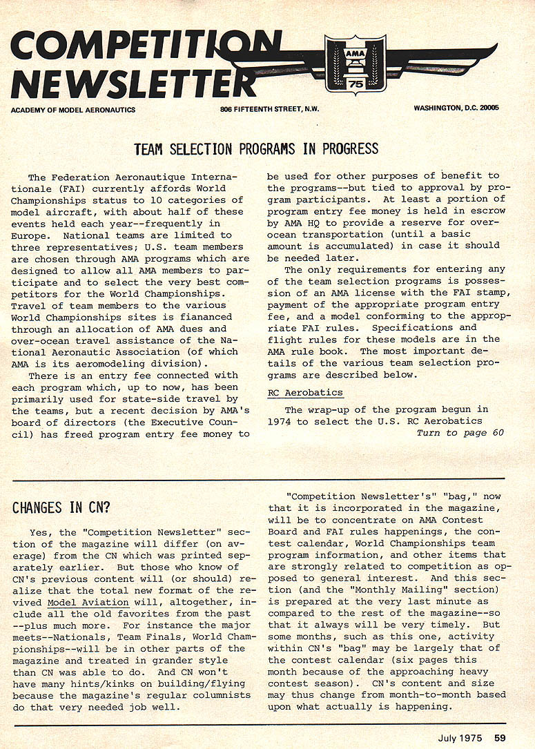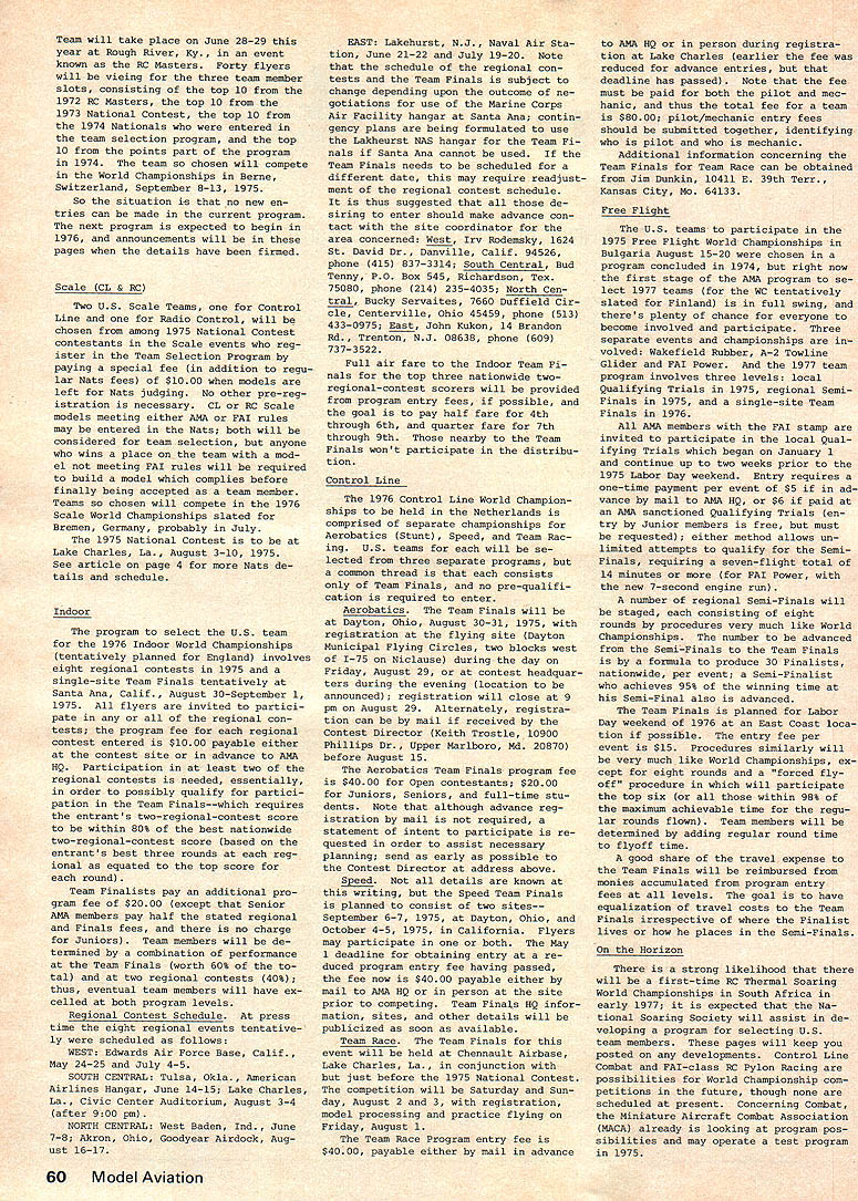 TEAM SELECTION PROGRAMS IN PROGRESS Federation Aeronautique Interna tionale FAT currently affords World Championships status 10 categories model aircraft about half events held yearfrequently Europe National teams limited three representatives US team members chosen through AMA programs designed allow AMA members par ticipate select very best com petitors World Championships Travel team members various World Championships sites fiananced through allocation AMA dues overocean travel assistance Na tional Aeronautic Association AMA its aeromodeling division entry fee connected program up now has primarily used state-side travel teams recent decision AMAs board directors Executive Coun cil has freed program entry fee money used other purposes benefit programs--but tied approval pro gram participants least portion program entry fee money held escrow AMA HQ provide reserve overocean transportation until basic amount accumulated case should needed later requirements entering team selection programs posses sion AMA license FAT stamp payment appropriate program entry fee model conforming approp riate FAT rules Specifications flight rules models AMA rule book important de tails various team selection pro grams described below RC Aerobatics wrap-up program begun 1974 select US RC Aerobatics Turn page 60 CHANGES IN CN Yes Competition Newsletter sec tion magazine will differ av erage CN printed sep arately earlier know CNs previous content will should re alize total new format re vived Model Aviation will altogether clude old favorites past -plus much instance major meets--Nationals Team Finals World Cham pionships--will other parts magazine treated grander style CN able CN wont have hints/kinks building/flying because magazines regular columnists very needed job well Competition Newsletters bag now incorporated magazine will concentrate AMA Contest Board FAT rules happenings con test calendar World Championships team program information other items strongly related competition op posed general interest sec tion Monthly Mailing section prepared very last minute compared rest magazineso always will very timely some months such activity within CNs bag may largely contest calendar six pages month because approaching heavy contest season CNs content size may thus change month-tomonth based upon what actually happening July1975 59 NEWSLET 906 FIFTEENTH STREET NW ACADEMY OF MODEL AERONAUTICSWASHINGTON DC 20006 Team will take place June 2829 year Rough River Ky event known RC Masters Forty flyers will vieing three team member slots consisting top 10 1972 Re Masters top 10 1973 National Contest top 10 1974 Nationals entered team selection program top 10 points part program 1974 team chosen will compete World Championships Barns Switzerland September 813 1975 So situation no new en tries can made current program next program expected begin 1976 announcements will pages details have firmed Scale CL & Re Two US Scale Teams Control Line Radio Control will chosen among 1975 National Contest contestants Scale events reg ister Team Selection Program paying special fee addition regu lar Nats fees $1000 models left Nats judging No other pre-reg istration necessary CL Re Scale models meeting either AMA FAT rules may entered Nats both will considered team selection anyone wins place teem mod el meeting FAX rules will required build model complies before finally being accepted team member Teams chosen will compete 1976 Scale World Championships slated Bremen Germany probably July 1975 National Contest Lake Charles La August 310 1975 See article page 4 Nats de tails schedule Indoor program select US team 1976 Indoor World Championships tentatively planned England involves eight regional contests 1975 singlesite Team Finals tentatively Santa Ana Calif August 30-September 1 1975 flyers invited partici pate regional con tests program fee regional contest entered $1000 payable either contest site advance AMA NQ Participation least two regional contests needed essentially order possibly qualify partici pation Team Finals--which requires entrants tworegionalcontest score within 80% best nationwide tworegionalcontest score based entrants best three rounds reg ional equated top score round Team Finalists pay additional pro gram fee $2000 except Senior AMA members pay half stated regional Finals fees no charge Juniors Team members will de termined combination performance Team Finals worth 60% tal two regional contests 40% thus eventual team members will have ex celled both program levels Regional Contest Schedule press time eight regional events tentative ly scheduled follows WEST Edwards Air Force Base Calif Nay 24-25 July 45 SOUTN CENTRAL Tulsa Okla American Airlines Nangar June 1415 Lake Charles La Civic Center Auditorium August 3-4 after 900 pm NORTH CENTRAL West Baden md June 7-8 Akron Ohio Goodyear Airdock Aug ust 1617 EAST Lakehurst NJ Naval Air Sta tion June 2122 July 19-20 Note schedule regional con tests Team Finals subject change depending upon outcome ne gotiations use Marine Corps Air Facility hangar Santa Ana contin gency plans being formulated use Lakheurst NAS hangar Team Fi nals Santa Ana cannot used Team Finals needs scheduled different date may require readjust ment regional contest schedule thus suggested de siring enter should make advance con tact site coordinator area concerned West Try Rodemsky 1624 St David Dr Danville Calif 94526 phone 415 8373314 South Central Bud Tenny PO Box 545 Richardson Tax 75080 phone 214 2354035 North Cen tral Rocky Servaites 7660 Duf field Cir cle Centerville Ohio 45459 phone 513 4330975 East John Eukon 14 Brandon Rd Trenton NJ 08638 phone 609 7373522 Full air fare Indoor Team Fi nals top three nationwide tworegionalcontest scorers will provided program entry fees possible goal pay half fare 4th through 6th quarter fare 7th through 9th nearby Team Finals wont participate distribu tion Control Line 1976 Control Line World Champion ships held Netherlands comprised separate champio