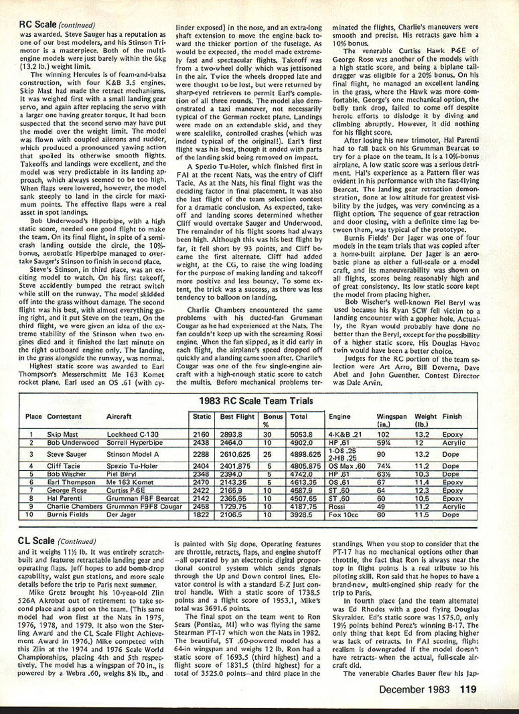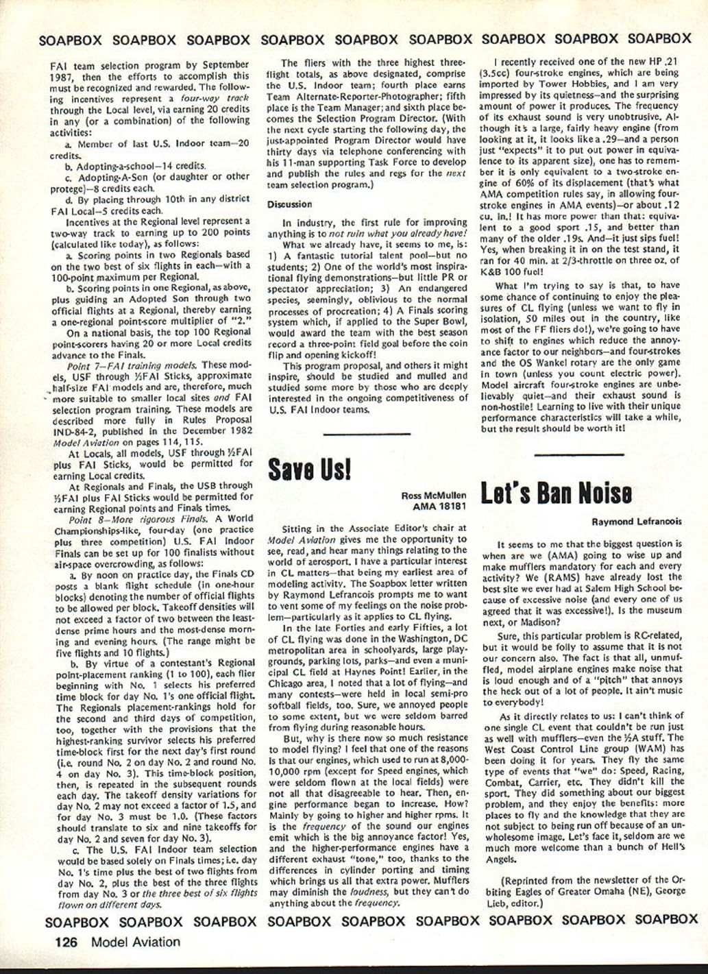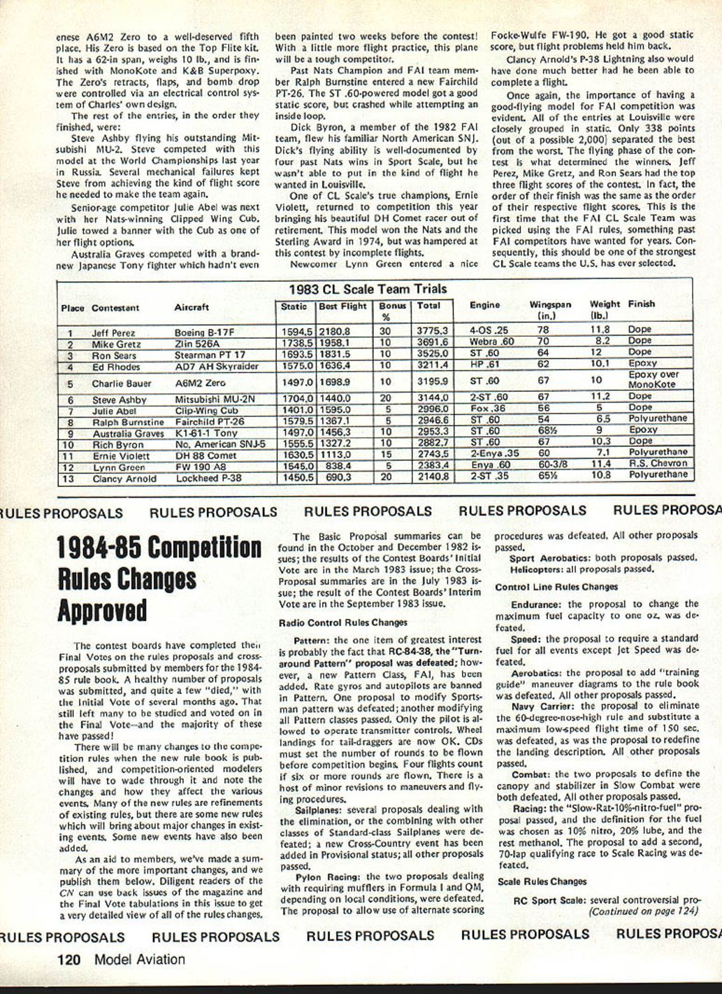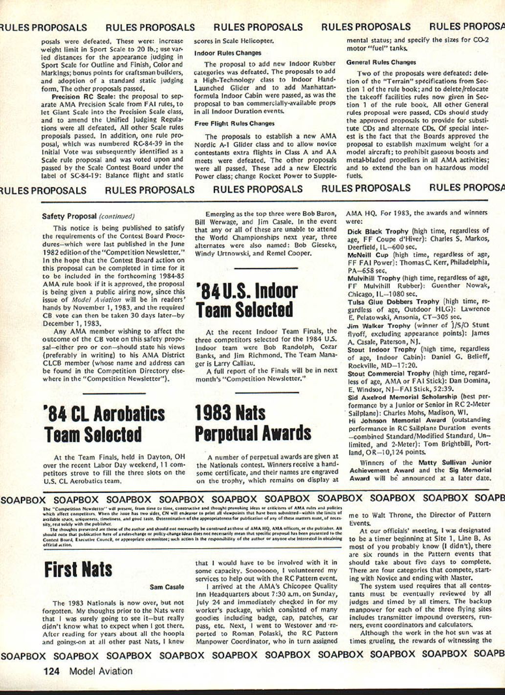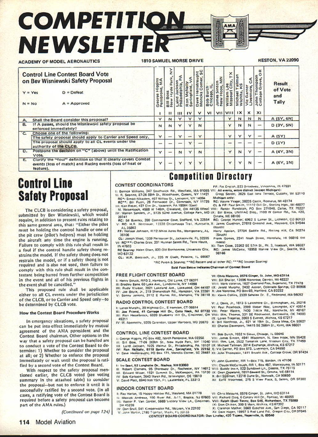 COMPE NE WSLETTE ACADEMY OF MODEL AERONAUTICS tflX z Control Line Contest Board VoteZ Bev Wisniewski Safety Proposal, ~ Result 0 DefeatzEu uC JofVote uSn OEOCS 1o E I- -~ ~ a50 CEo ~0and OeO5OS5O Ost SnUflTally NONOAApproved~u ,j -512 IIIIIIIVVVI VIIVIIIIXXXI AShall Board consider proposalVNVVV A5V4N BIf passes should Wisnlewski safety proposal beNNVN VNN0 3Y 5N enforced Immediately CChoose followIng safety proposal should apply Carrier Speed onlyVVV VVVA 5Y proposal should apply CLeventsunderthe uthority t4 B 0postpone IEcIIn C above until RatificationNN VNVA 4Y 3N Vote EClarify foul definition clearly covers Combat events loss match Racing events loss heat orVVVV VVNA 6Y iN feature Control Line Safety Proposal CLCB considering safety proposal submitted Bev Wisniewski would require addition present rules relating same general area Either pilot must holding control handle pit crew pilots helpers must holding aircraft time engine running Failure comply rule shall result foul control handle safety thong re strains model safety thong does restrain model safety thong required also used failure comply rule shall result con testant being barred further competition event previous flights event shall cancelled proposed rule shall applicable either CL events under jurisdiction CLCB Carrier Speed onlyto determined CLCB vote Contest Board Procedure Works emergency situations safety proposal can put effect immediately mutual agreement AMA ppresident Contest Board chairman Other options way safety proposal can handled conduct vote Contest Board de termine 1 Whether consider proposal 2 Whether enforce proposal immediately wait until proposal rati fied second vote Contest Board respect safety proposal men tioned earlier CLCB voted see voting summary attached table consider proposalbut enforce until successfully ratified second vote cases ratifying vote Contest Board required before safety proposal can become part AMA rules Continued page 124 Competition Directory CONTEST COORDINATORS PF Pat English 823 Broadway Viocennns IN 47591 I Enrsce Williams 347 Soathmick Rd Westfield MA 01085 VII enents entire distrct except Michigan II H Sobriflb 87-26 88th St. Woodhaves Oaeens NY 11421 Gregg Seydel 3626 East lona Terrace Cudahy WI 53110 RCn Ernest Nikoders 407 Willow St Lockport NY 14094 Michigan RC Bill Puori 28 Pnrnwood Commack NY 11725 BC Wayne Yeager 28225 Castln Romulas Ml 48174 Ill Kan Reber 427 Elm Or. Nazaretn PA 18064 Eastl CL & FP Paul Smith 11112 Oill Sterling Hgtv. Ml 48077 M Weisenbach 4568 lo 146th Clevelard OH 44135 IWestI VIII Randy Randolph P0 Sos 271048 CelIa TX 75227 IV Warren Sanders Jr 9735 52nd Avenue College Park MO IX Sill Bieda UNIVAC Bldg. 7100 W Center Rd. No 420 20741Omaha NE 68106 Rc Ed Byerley 200 Commander Cove Stafford VA 22554Rc George Hunter 6962 5 Lamer St Littletor CO 80122 V BC HR Norckauer 12330 Chicamauga Trail Hunttulle X James Caughran 27818 Ormood Ave Hayward CA 94544 AL 35803INorthI PP Wallace JohnsOn 4112 Whne Acres Rd Montgomery ALHarry Apojan 27704 Saddle Rd. Rolling Hill CA 90274 36106 South CL Joseph Mead 1339 Rertssaaer St Jacksonville FL 32205Frank Gomes 2241 Noah Street Honolulu HI 96816 HI VI Rc55 Charles Gray 201 Halman Salem Rd Terre Haute meensl IN 47803Xl Tom Cope 23262 SE 57th St Rt 3 Issacluan WA 98027 BC Soaring Helen Olsen 820 Old Bongomme Universty CityRC James McCarty 18958 Marne View Or, Seattle WA MO 63132 98166 CL WR Sodzoch Jr 235 W Glade Palatine IL 80067 RC Pylon & Soarng attern other RC RC except Soaringl Bold Pace Below Indicates chairman af Contest Board FREE FLIGHT CONTEST BOARDVI Chris Matnuno 8576 Ginger St John MO 63114 Henry Struck RPO3 Hamburg Old Lyms CT 06271VII Sill Shailor 13596 Moetrose Oetroit Ml 48227 II Bradley Sane 60 La*e Ave. Lyndoneile NY 14098VIII Mark Valerias 1627 Overland Pass Sugarlancl TX 77478 Ill Rudy Klaiber 2021 Lakeland Ave Lakewood OH 44107IX Jeralcl Murphy 2432 Astron Colorado Springs CO 80906 IV Joe Boyle Jr 219 Shenandoah Rd Hampton VA 23361X Joe Norcross P0 Boa 66 Hanford CA 93232 V Sunny Jenkins 3112 6 Raines Rd Memphis TN 38118Xl Kevin Collins 2320 Sahalee Dr E, Redmond WA 98052 RADIO CONTROL CONTEST BOARD V J Ouvis Jr 1813 5 Lakeshore Birmingham AL 35216 Lance Murphy 29 Hightop Ce E Hamoan CT 06514 VI Paul Proefrock 3989 Weber Way Lenington KY 40614 II Joe Priend 41 Caresege Hill Or. Colts Neck NJ 07722 VII Peter Waters 7420 7MiIe Rd Northeille Ml 48157 Ill Ron Hesselbrock 6320 Blucoerry Hill Ct Cincinnati OHVIII Win Thomas 331 SE Rocksood Bartlesvile OK 74003 45211IX Lame Tregellas 3003 S Everett Nichita KS 87217 IV W Aberoenhe 9205 Carendon Upper Marlboro MO 20870X Sill Northrop Jr. 821 W 19tn St Costa Mesa CA 92627 Xl Charles OavenpOrt 14415 SE 266th St. Kent WA 98031 CONTROL LINE CONTEST BOARDVI Bob Barth 7O32NSiOussChicago 1L60646 George Higgins P0 60s 482 North Pemoroke MA 02358VII lamw Sinton 4941 Wisconsin N Nero Hope MN 55428 IISill Boss 7706 269th St. Nero Hyde ParkNY 11040VIII Win Lee 3522 Tamarisk Lane Missouri City TX 77458 IIILaird Jaykade 1025 Walnut St. Phladelphia PA 19107IX Michael Tallman 3014 Exchange Wichita KS 67217 IVRon McNally 6118 Bardu As. SpningfieldVA 22152X Vic Garner P0 Box 573 Lvermore CA 94550 V Gave Hensetruaght P0 Bas 171 Moocks Corner SC 28461 XI John Thompson 1411 Sryaflt Ave Cottage Grove OR 97424 SCALE CONTEST BOARD I John Guenther RR 1Soc 715 Borden IN 47106 Irs Seed 82 Lanaholm Dr. Nashssa NH 03060 II Claude McCullough RH 1 Boa 487 Montezuma IA 50171 II Robert Clemens 95 Shoreway Or. Rochester NY14612 VIII Buddy IrwIn 922 Sundown Lv OesotoTX 75115 Ill Edward Wissar 1521 Summit St. McKeesoort PA15130 IX OeanopeIand 7B17Semard St Omaha NE68114 IV Boo KarlssOn 3643 Marse Rd WiImngton 06 19810 X Bill Slyoman 12218 Gave St. Norwalk CA 90650 V Gavid Plaft 8940 NW 15th Pt Lauderdale FL 33313 Xl EurIC Moorhead 275 5 View Place 5 Salem OR 97302 INDOOR CONTEST BOARD I Ray Harlan 15 Happy Hollow Rd. Wayland MA 01778 VI Chrs Matsuno 8576 Ginger St John MO 63114 II Merrick And