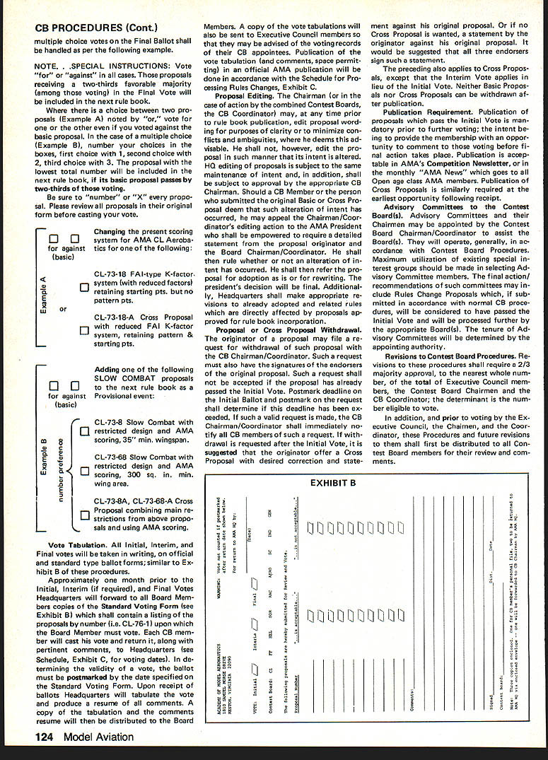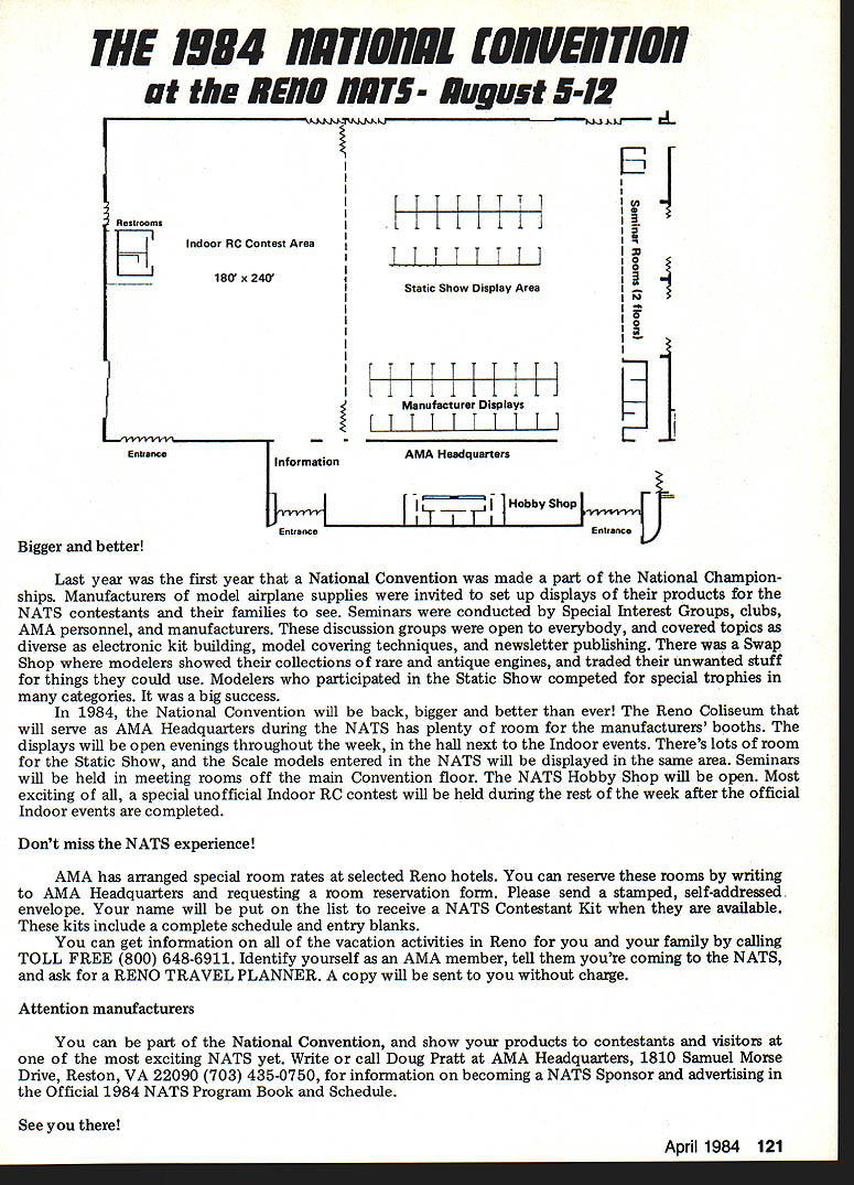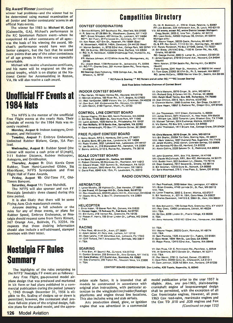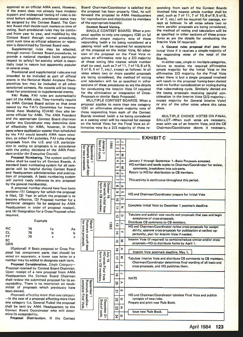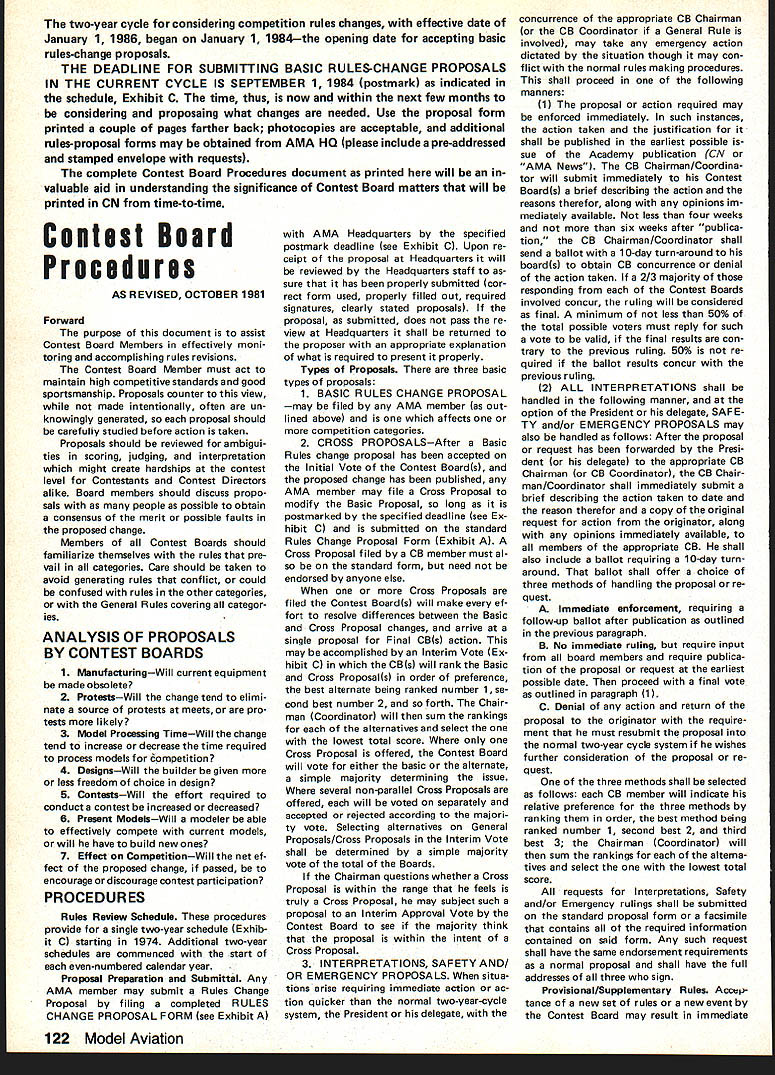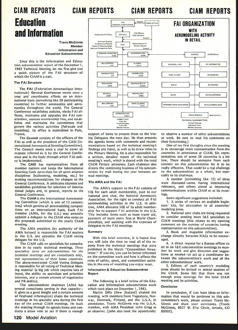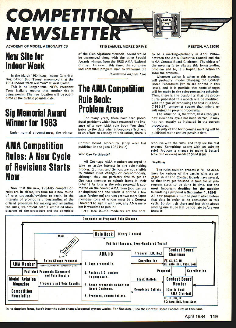 NE WSLETTE ACADEMY OF MODEL AERONAUTICS New Site Indoor Week March 1984 issue Indoor Contribu ting Editor Bud Tenny announced 1984 Indoor Week West Baden no longer true NFFS President Tony Italiano reports another site being sought new location will publi cized earliest possible date Sig Memorial Award Winner 1983 Under normal circumstances winner AMA Competition Rules A New Cycle Revisions Starts Now Now new 1984-85 competition rules effect its time new round rules proposals/revisions begin interests promoting understanding official procedure making amending rules present both simplified block diagram procedure complete 1810 SAMUEL MORSE DRIVE Glen Sigafoose Memorial Award would announced along other Special Awards winners 1983 AMA National Contest However time computer computer program used determine Continued page 126 AMA Competition Rule Book Problem Areas years have proce dural problems have prevented issu ance new AMA rule book time prior date becomes effective effort remedy situation Contest Board Procedures last published June 1982 issue Can Participate Open-age AMA members urged take active interest rule-making process Juniors Seniors eligible submit rules changes cross-proposals although perfectly free get Open-age member submit items behalf As long rules proposal sub mitted correct AMA form can use duplicate printed few pages further get two Open members must Contest Director sign AMA mem ber welcome join Lets face itthe modelers ones RESTON VA 22090 meetingprobably April 1984 between AMA Executive Council AMA Contest Board Chairmen object meeting discuss long-standing problem hoped take action solve problem Whatever action taken meeting will probably involve changing Contest Board Procedures printed issue possible some changes will made rules-processing schedule Thus possibility proce dures published month will modified goal producing next rule book 1986-87 somewhat sooner might re sult using present procedures situation therefore although new rule-book cycle has started may run exactly indicated current proced ures Results forthcoming meeting will published earliest possible date live rules real experts Something wrong existing rule Propose change make better New rule event needed Send Deadlinee rules revision process full dead lines various parties en gaged Contest Boards have several get finished time sub sequent steps done time important deadline modeler submitting proposal September 1 19841 new proposals must postmarked before date order considered cycle So dont sit just think about sending itll too late before know Commools en Proposed Rule Chemise Mail Riles Clinic Proposal AMA lumber SUBMITTALDEADLINE SEPTEMBER 11984 Pebllshod Proposals lSummaryj Vole Resells Model Aviation Magazine Proposals Vole Results C input lii n Nuwaluttur Rule ReekEvery 2 VeersI Pullish January Even-Nembered Toarsl Proposal 110 No1 Coordinalioa Contest Beard Chair. FF CL SC IN Hell Race Seer ProposalCoordination Blank BallolsContest Board Mauler Comploled Ballotsha EachI FF CL SC IN RC Acre Holl Rico Soar April 1984 119 AMA H 1 Logs proposal 2 Assigns 10 number proposals 3 Sends proposals Conlost Beard Chairman Prepares counts ballots its simplest form heres rules change/proposal system works fine detail see Contest Board Procedures issue ClAM REPORTS ClAM REPORTS ClAM REPORTS ClAM REPORTS Education Information Travis McGinnis Member Information Education Subcommittee Since Information Educa tion subcommittee report December 1 1983 Technical Meeting let first give quick picture FAI structureof ClAM part FAI Structure FAI Federation Aeronautique Inter nationale General Conference meets once year coordinates efforts inter national basis something like 28 participating countries further aeronautics astro nautics throughout world General Conference establishes policies elects FAI ficers maintains upgrades FAI con stitution assesses membership fees estab lishes maintains committees govern various activities full-scale modeling Its office maintained Paris France Council consists officers FAI well president CASI ternational Aeronautical Sporting Committee Council meets once year cover matters referred General Confer ence body through FAI poli cy implemented CASt has representatives member nations keeps International Sporting Code up-to-date sport aviation disciplines ballooning modeling etc making recommendations changes General Conference arbitrates disputes establishes guidelines selection interna tional judges general reports General Conference ClAM International Aeromodel ing Committee 13 commit tees governs aeromodeling competi tions international basis FAI member AMA US may annually appoint delegate ClAM votes proposals submitted yearly ClAM meeting AMA president authority AMA bylaws responsible FAI matters US appoints ClAM voting delegate US ClAM calls specialists consulta tion its yearly technical meetings specialists serve subcommittees technical meetings consultants representatives home countries above-mentioned ClAM Voting Delegate responsible voting Technical Meet ing material big job requires lots input ability assimilate prioritize interests certain amount negotiation PR ability subcommittee chairman AMA has several consultants serving capacity gives us good insight certain amount firsthand information chairs technical meetings specialty area during first day annual ClAM meetings leads meeting through its agenda items con ducts straw vote see enough G,pI,rn PAl FARR AER C EIIC~ FAI ORGANIZATION WITH AEROMODELING ACTIVITY IN DETAIL PAlSRRRIEARlS OFFICE FAI GIll,, CRONCILCASI P,Id,t SEER SopR AEROMORELINGERREARClAM Olf,,I OETERSNG RGOINGATICS TIRNGRROILT ALLIRHT NS support items present Vot ing Delegates next day presents agenda items comments recom mendations based technical meetings findings input well its straw votes Plenary Meeting also responsible written detailed report technical meetings work shared total ClAM Plenary attendees chairman also directs continuing business subcom mitte
