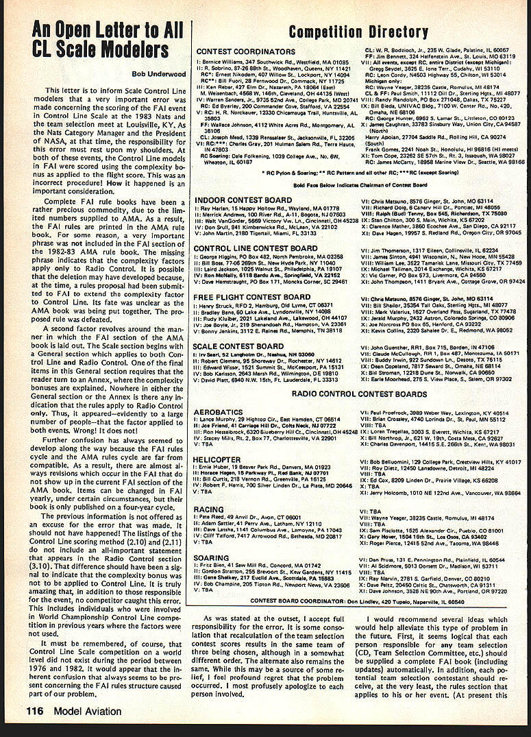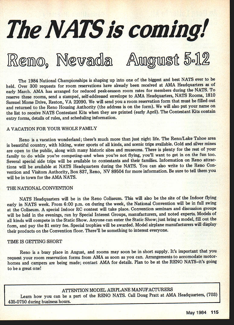 COMPETITW NE WSLETTEKY ACADEMY OF MODEL AERONAUTICS Booster Packet tsr CL World Champs AMA members can obtain 1984 Control Line World Championships Booster Packet half pricel dont plan tend World Champs scheduled Sep tember 17-22 1984 Westover AFB Chicopee MA youll want have great souve nir treat Included Booster Packet following items official cloth patch $5 value official enamel pin $5 value official decals $2 value official program book $2 value Supporter Site Pass $6 value Thats $20 worth goodies $10 $10 price applicable direct sales World Champs site 1984 AMA Nationals Mail orders will require additional $2 postage handling No orders will shipped prior September 1 19844 planning attend World Champs red-blooded CL flier US wouldnt love attend please aware fact Boosters Competitors Supporters may purchase Victory Banquet tickets Supporter Site Pass included Booster Packet entitles boosters purchase u pto two banq uet tickets CL WC site addition Supporter Site Pass pro vides parking access competition sites beyond spectators may go spec tators must park outside site fence Boost ers may park inside near site have access Supporters zone official flight circles located between Spectator Competitor areas Also Site Pass provides unlimited access week rather separate daily charges access Site Pass includes personal identificaton badge others will know Please note will no charge spectators see World Championship events parking access compe tition circles will less favorable Boosters/Supporters Booster Packet ordered mail send $10 plus $2 postage handling Supply Service Dept AMA HQ 1810 Samuel Morse Dr Reston VA 22090 Scale World Champs Supporters News Modelers wishing attend 1984 Scale World Championships scheduled held Le Bourget airport Paris France July 2-8 1984 can take advantage special rates offered through contest organizers Fed eration Francaise DAeromodelisme 1810 SAMUEL MORSE DRIVE Three basic packages offered includes transportation US Paris $172 Site Pass $269 Site Pass plus six lunches six dinners closing banquet $400 Site Pass six lunches six dinners closing banquet seven nights accommodation Hotel Novotel 2 km airport plus seven breakfasts AMA members wishing take advantage packages should send checks AMA l-IQ Attention Micheline Madison April 11984 transportation information contact Scale Team Manager Cliff Tacle 49404 Michelle Ann Dr Mt Clemens Ml 48045or telephone 313 9494623 84 US CL Speed Team Race Teams Selected team Finals Speed Team Race conducted two sites Speed site Team Race Speed trials held over 1983 Labor Day weekend Merced CA Speed following October 8-9 Speed Team Race Houston TX Speed Team Bob Spahr Santa Ana CA Carl Dodge Richmond Heights OH Chuck Schuette Vancouver WA selected three team members unusual turn events Charles Vassalo Vancouver WA models performance qualified him third team member replaced since has handicap prevents him piloting model FAI rules permit proxy flying Speed event re placed Chuck Schuette has previous US CL teams Team Race Team three teams selected J E Al britton Vienna VA/Walt Perkins Ocala FL Stew Willoughby Addison IL/Bob Oge St Charles IL John McCollum El Toro CA/Tom Knoppi Seattle WA First Alternates first alternate team member Speed Luke Roy Fairfield CA first alter nate Team Race team Jeff Hollfelder Castro Valley CA/Tim Gillott Salinas CA complete report Finals will appear next month RiSTON VA 22090 Hats NC News February 11 1984 Nats Planning Meet ing held Reno NV agreed add three events official event schedule com pared last years Nets schedule RC Pattern new 1984-85 AMA rule book FAI RC Turnaround Pattern will flown ad dition four established Pattern classes Sportsman Advanced Expert Masters Pattern contestants will have choose five Pattern classes want flythey will able enter Pattern class Nats RC Helicopter FAI RC Helicopter flown unofficial event 83 Nats will ficial event year Helicopter fliers will able enter fly up three classes Novice/Intermediate/Expert Scale FAI Helicopter will also have extra day yearthree days instead two will Monday through Wednesday Heli copter events will separate site Reno rest Nats RC events can operate previous concerns compatibility RC Soar ing schedule RC Soaring RC Soaring will have two extra flying days si instead four Monday through Wed nesday AMA Duration Thursday Scale Friday Saturday FAI IF3BI RC Pylon RC Pylon Racing expected see greater emphasis FAI class year since very probable will World Championships Pylon 1985 US team will chosen based results 1984 Nats FAI Pylon event Last year FAI Pylon borrowed some time Formula schedule year will Quarter Midget As consequence year Quarter Midget will go two days Monday & Tuesday 3 days Formula followed day Saturday FAI RC significant change RC events 1984 Nats 27 MHz operation has eliminated Participation fre quencies has low recent years Nats Executive Committee decided time phase out old CB-plagued frequencies Thus 72 MHz 6-meter Amateur-band frequencies will prevail out confusion complication accom modating few might use 27 MHz May1984 113 J1i ff RESULTS 1983 National Model Airplane Static Show CategoryWinnerModelCategoryWinnerModel SailplaneJeff TrayDerry-AireSport RCJames BrochuKaos CL ScaleAugie BuffalanoF4U CorsairHelicopterFrancis PurcellBell Huey Cobra CL AerobaticsDave RitchieWarriorFree FlightBob BenderRE8 Best CLLester Deily0 SpeedFF ScaleBob BenderRE8 Sport CLAra DedekianThunderboltFF CompetitionHank SperzelTexan 1200 Competition CLLester DeilySpeed Class DFF SportRay SteckSo-Long RC Pylon RacerGeorge H ClappMr Spook IllCLBest JuniorNo entries RCScaleGeorge H ClappFC2 FairchildFFBest JuniorNo entries RC PatternJeff TroyUFORCBest JuniorNo entries insome categories Best Junior awards 0750 weekday between 730 am S4 Nuts FeaturesFF Land est have 430 pm Eastern time Static Model Show to bring favorite model dollar entry fee fill out simple entry blank youre models will dis- Nuts uuuu 1983 Nats saw introduction aplayed Reno Conventio