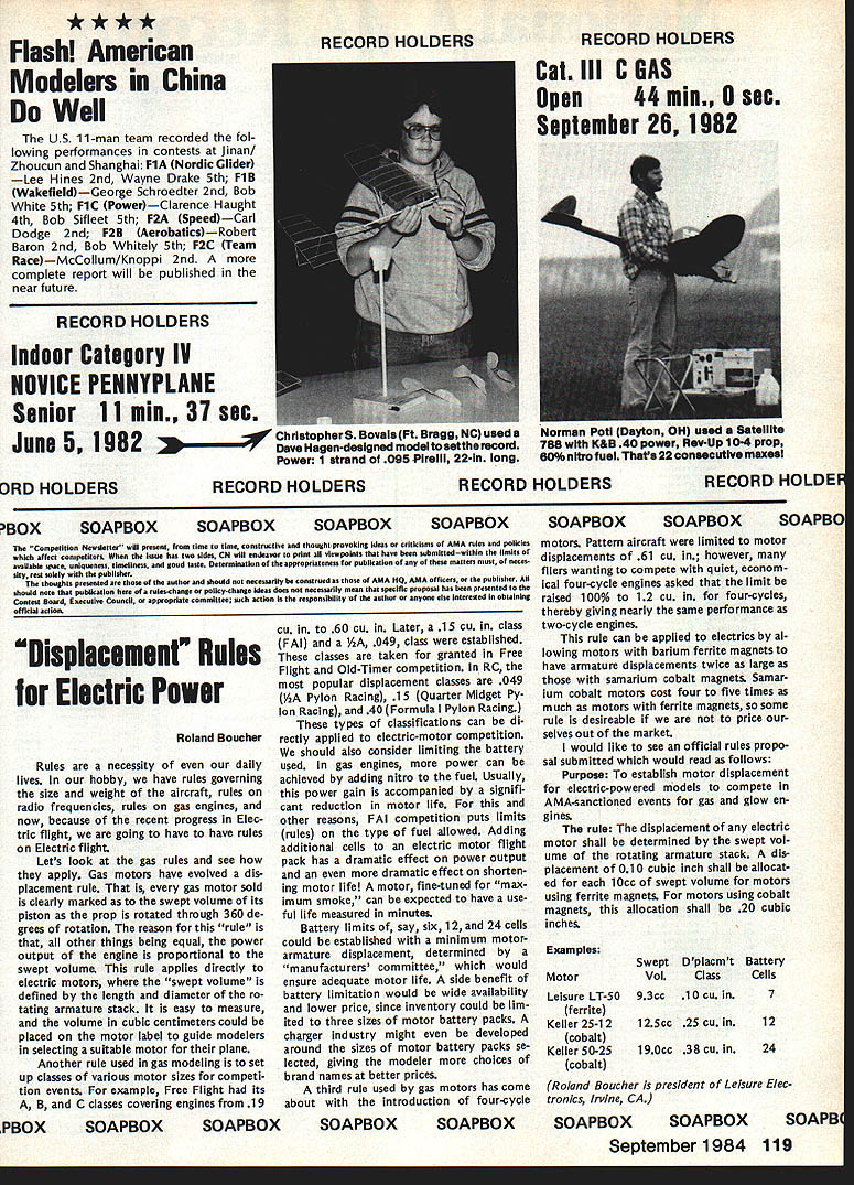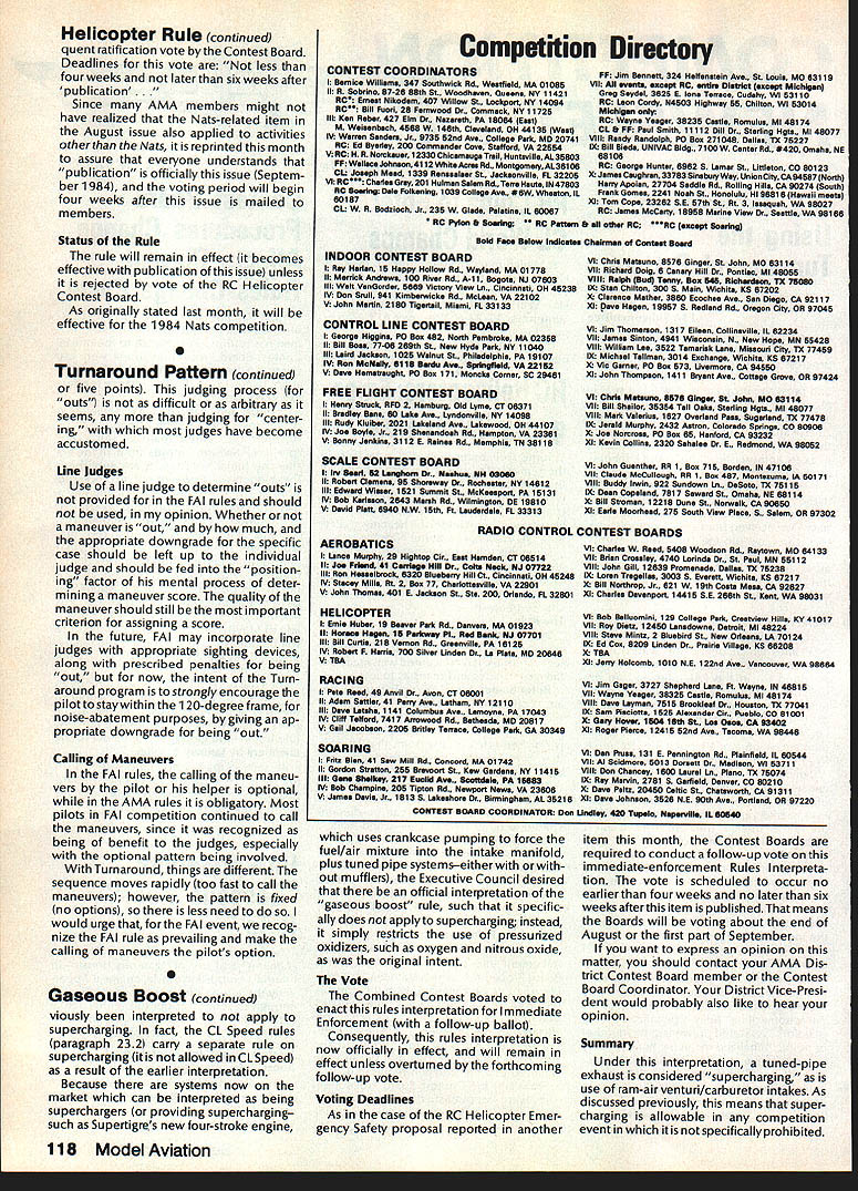 COMPET NE WSLE ACADEMY OF MODEL AERONAUTICS US Progress inPR China Enter Using theCL World Champs Turnaround Pattern A Ma gram received June18 AMA HQ conf rmed Peoples Republic Ron Chidgey China will send team 1984 Control ChairmanLine World Championships scheduled F3A Subcommitee September 17-22 Westover AFB Chicopee MA Chinese team entry brings 21 number nations expected compete 00 RC Helicopters Emer As chairman FAI F3A Subcommittee am very pleased reception progress new F3A Turnaround pro gram far year especially light bad press program received last year special interest group newsletters some Pattern columns maga zines Pattern competitOrs responding challenge presented FAI schedule very enthusiastic manner ahd think its great would like comment several items FAI rules about seems some confusionat least feed back Ive received few Contest Direc tors have run Turnaround events FAI rules must clarified areasand will due course now think can speak some authority intent subcommittee Markers Box Markers flags lines etc 60-de gree lines define width maneuver area window orbox provided FAI rules opinion should used since use tends over-emphasize exact location airplane theTurnaround maneuver ie airplane position pilot gets score 10 airplane five feet further left gets s Downgrading outs should pro gressive similar downgrading being off-centerwith middle maneuvers ever markers specifically banned rules either used Contest Directors should cautioned locate very far outat -least line 100 meters front pilot judges markers will located approximately under maneuvering airplane will minimize problem parallax tween view pilot view individual judge Downgrade Outs amount downgrade forTurnaround maneuvers being outside 60-degree line defined FAI rules except say action will heavily penalized loss points As stated previously number points penalized being out should progressive proportional de gree out should left judges discretion ie small outs should penalized say point gross outs would penalized perhaps four Continued p 118 gency Safety Rule Some Helicopter fliers may have missed itemin last months CN announced recent action RC Helicopter Con test Board chairman AMA president appeared page 112 three other Nats-related items under headingSafety Rule RC Helicopters Nats Since ruling has generated some de gree controversy reprinted again month some additional explaration interested modelers may have chance see Rule safety rule applies AMA Novice Intermediate Expert Scale RC Helicop tercategories Itis concerned main tail rotor blades reads follows Rotor Blades Metal tail/main rotor blades prohibited Use knife-edge leading edges tail/main rotor blades also pro hibited Metal oron main/tail rotor blades permitted point two 2 inches beyond blade root attachment point rule covers metal tip weights should noted intent arrive rotor blades can demon strated safe blades Thus tip weights form concreted/solid mass will allowed Manufacturers RC Helicopters re quire use tip weights encouraged come up alternative/safer methods such powdered metal metal shot heavy epoxys Immediate Enforcement rule enacted immediate en forcement under provision Contest Board Procedures state .. President delegate concur rence appropriate Contest Board Chairman . maytake emergency action dictated situation C Heli copter CB Chairman introduced proposed Emergency Proposal because believed situation required However Contest Board Procedures last published April 1984 Competition Newsletter require subse Continued p 118 Contest Board Procedures Change Affects Current Rules-Change Cycle recent joint meeting AMA Exec utive Council Contest Board Chair men has resulted change official Contest Board Procedures last printed April 1984 issue Mode/Avi ation pages 122-125 change effec tive immediately significant change deletion cross proposal submission/vote cycle However Contest Board will still accept proposal revision inputs modelers after Initial Vote results published inputs will however processed through AMA HQ will require special form will handled entirely various Contest Board Chairmen contents various proposal revision inputs will meshed original proposals consultation original proposer final versions pro posals will published April 1985 issue magazine Contest Boards will conduct Final Vote dead line May 11985 results vote will published August 1985 issue Interested modelers will knowwhat 1986-87 rule book will contain Since rule-cycle change will have completed mid-i 985 remainder year will used actual process revising publishing new rule bookand getting mailed out members january 1 1986 sure read Don Lindleys report joint Executive Council/Contest Board Chairmens meeting Itwas published last months edition Competition News letter 0 Interpretation ia Gaseous Boost Rule difference between super charging use gaseous boosts internal combustion model engines Appar ently difference because enough dissention about either actual potential warrant Contest Board action form Rules Interpretation Contest Board Interpretation Gaseous Boost Rule rule General section oftheAMA rule book pertaining use gaseous boosts model engines paragraph 41 has pre Continued p 118 September1984 117 1810 SAMUEL MORSE DRIVERESTON VA 22090 Helicopter Rule continued quent ratification vote Contest Board Deadlines vote less four weeks later six weeks after publication Since AMA members might have realized Nats-related item August issue also applied activities other Nats reprinted month assure everyone understands publication officially issue Septem ber1984 voting period will begin four weeks after issue mailed members Status Rule rule will remain effect becomes effective publication issue unless rejected vote RC Helicopter Contest Board As originally stated last month will effective 1984 Nats competition 0 Turnaround Pattern continued five points judging process outs difficult arbitrary seems judging center ing judges have become accustomed Line Judges Use line judge determ