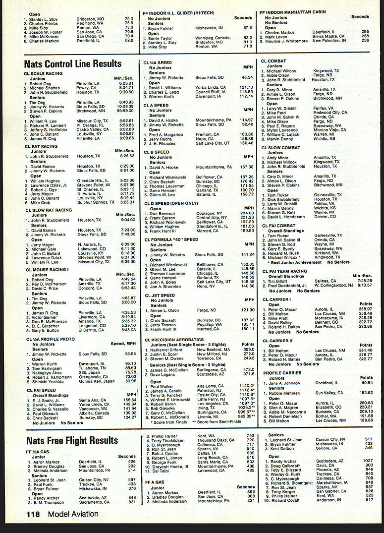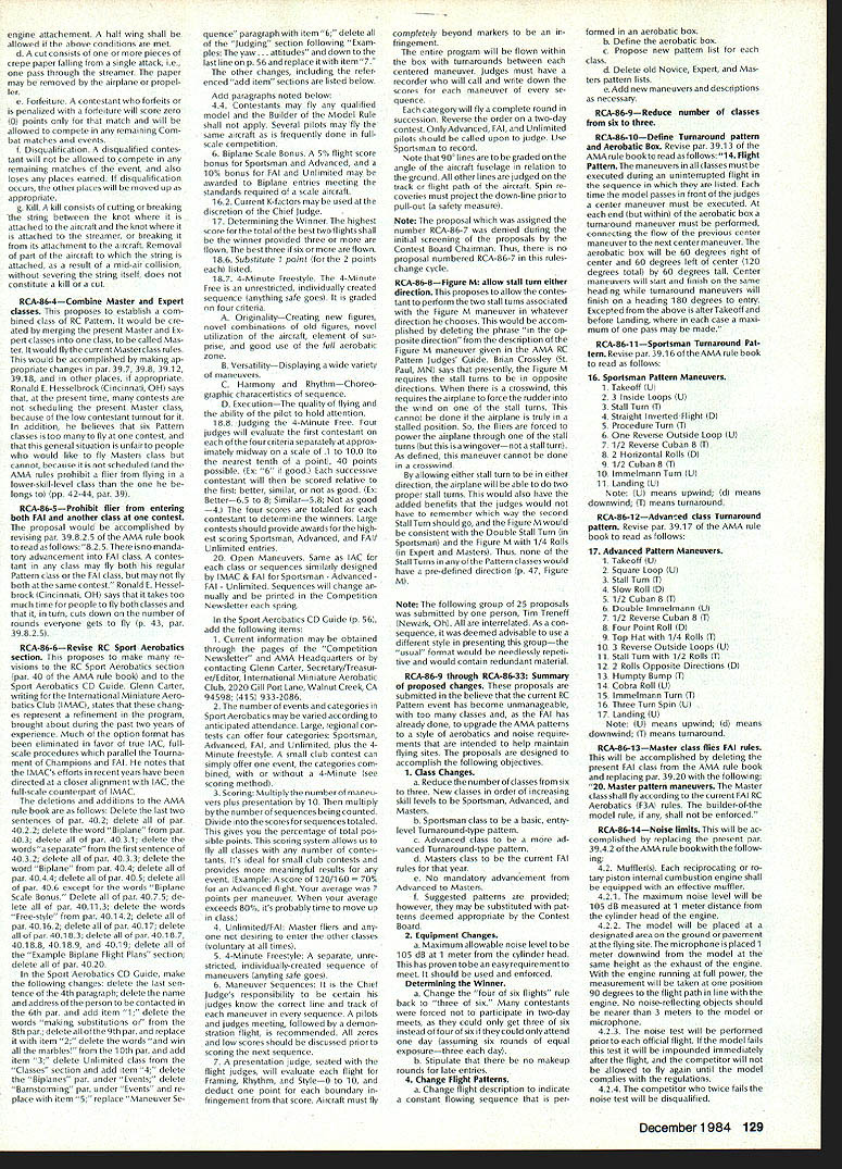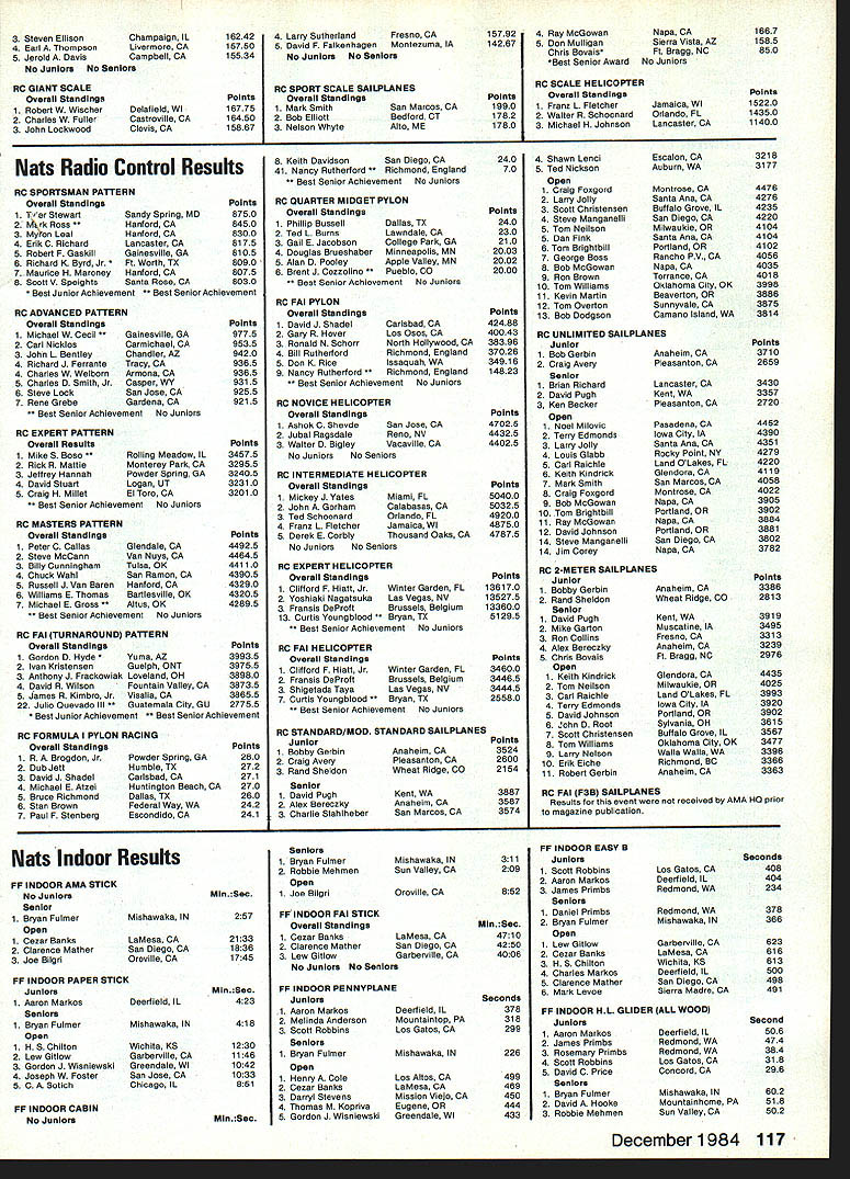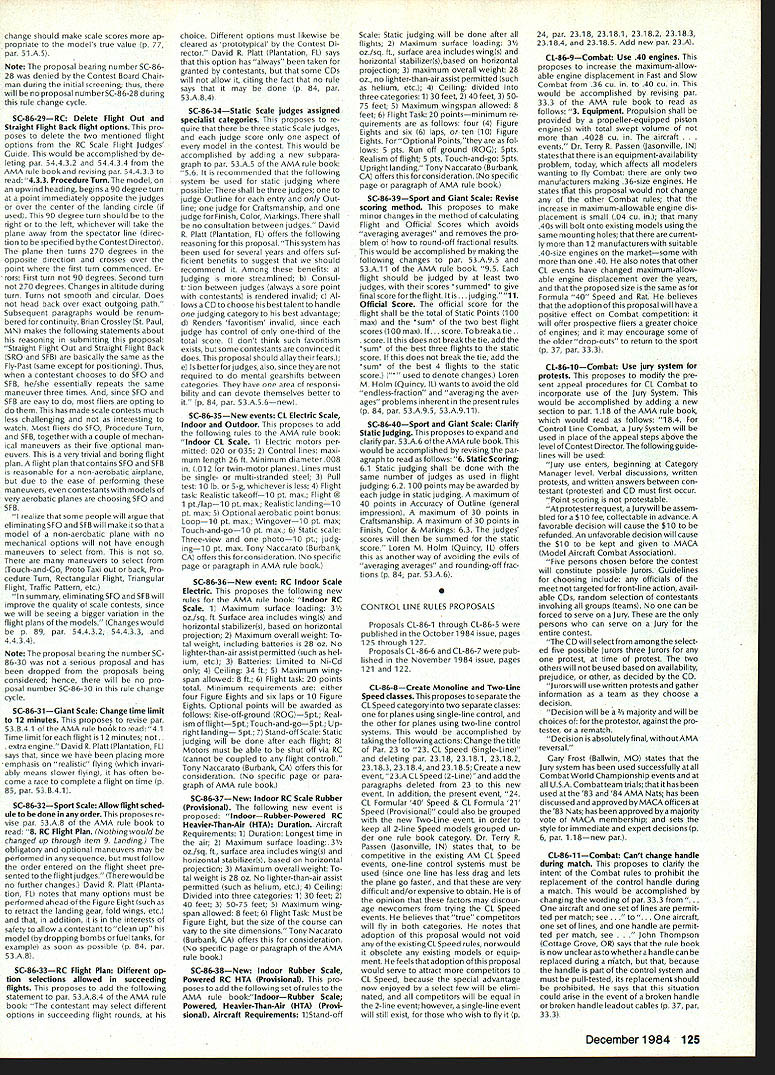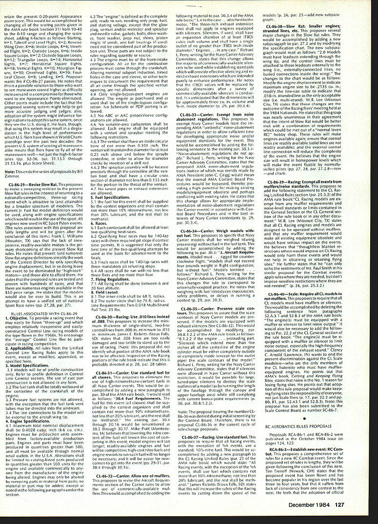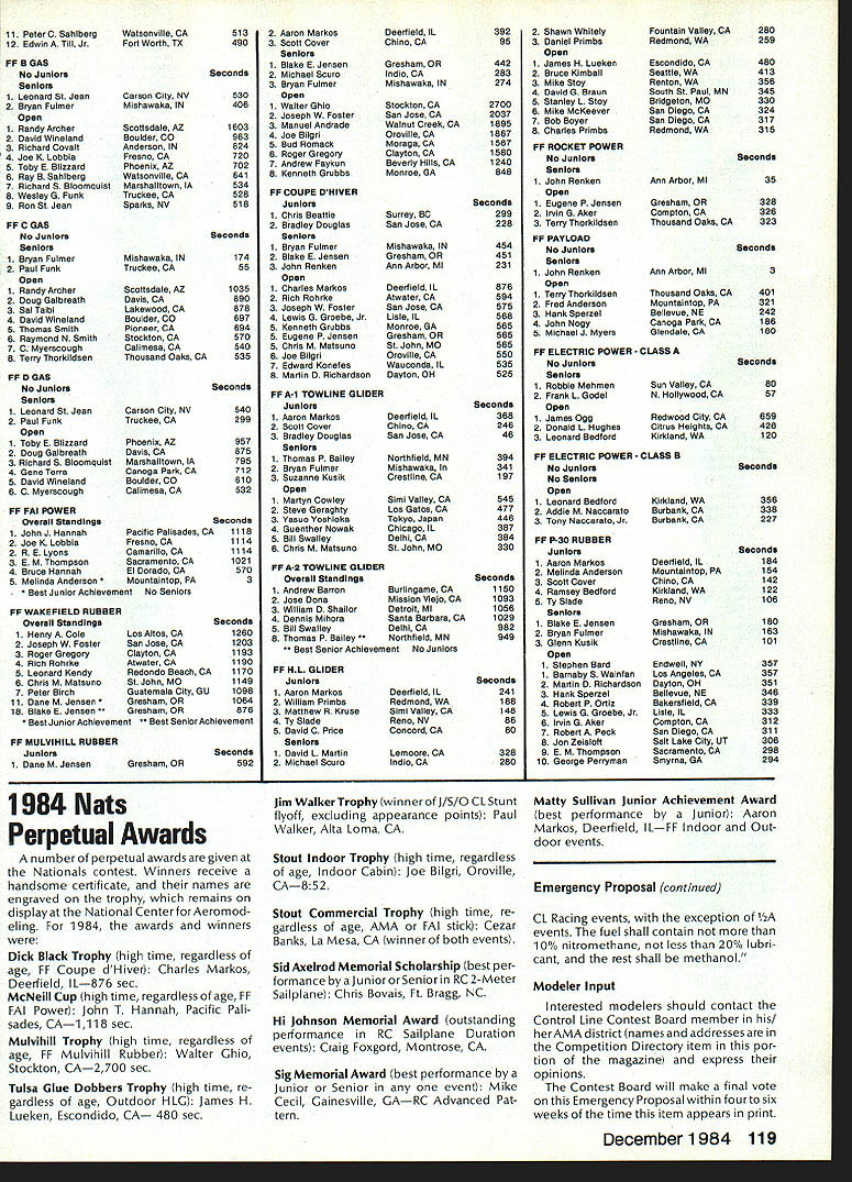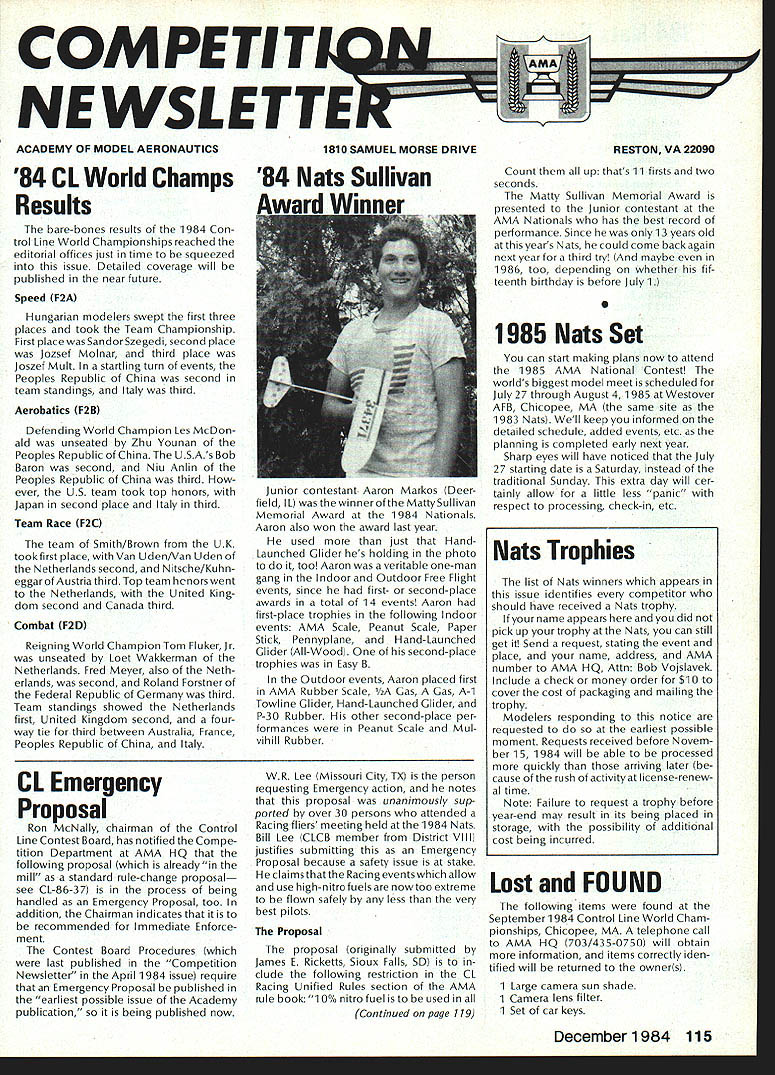 COM PETI TWIN NE WSLETTERW24V ACADEMY OF MODEL AERONAUTICS 84 CL World Champs 84 Nats Sullivan Results bare-bones results 1984 Con trol Line World Championships reached editorial offices just time squeezed issue Detailed coverage will published near future Speed F2A Hungarian modelers swept first three places took Team Championship First place Sandor Szegedi second place Jozsef Molnar third place Joszef Mult startling turn events Peoples Republic China second team standings Italy third Aerobatics F2B Defending World Champion Les McDon aId unseated Zhu Younan Peoples Republic China USAs Bob Baron second Niu Anlin Peoples Republic China third ever US team took top honors Japan second place Italy third Team Race F2C team Smith/Brown UK tookfirst place Van Uden/Van Uden Netherlands second Nitsche/Kuhn eggar Austria third Top team honors went Netherlands United King dom second Canada third Combat F2D Reigning World Champion Tom Fluker Jr unseated toet Wakkerman Netherlands Fred Meyer also Neth erlands second Roland Forstner Federal Republic Germany third Team standings showed Netherlands first United Kingdom second fourway tie third between Australia France Peoples Republic China Italy CL Emergency Proposal Ron McNally chairman Control L ne Contest Board has notified Compe tition Department AMA HQ following proposal alreadyin mill standard rule-change proposal see CL-86-37 process being handled Emergency Proposal too addition Chairman indicates recommended Immediate Enforcemen t Contest Board Procedures last published Competition Newsletter April1984 issue require Emergency Proposal published earliest possible issue Academy publication being published now 1810 SAMUEL MORSE DRIVE Junior contestant Aaron Markos Deer field IL winner MattySullivan Memorial Award 1984 Nationals Aaron also won award last year used just HandLaunched Glider hes holding photo too Aaron veritable one-man gang Indoor Outdoor Free Flight events since first- second-place awards total 14 events Aaron first-place trophies following Indoor events AMA Scale Peanut Scale Paper Stick Pennyplane Hand-Launched Glider All-Wood second-place trophies Easy B Outdoor events Aaron placed first AMA Rubber Scale 1/2A Gas Gas A-i Towline Glider Hand-Launched Glider P-30 Rubber other second-place per formances Peanut Scale Mul vihill Rubber WR Lee Missouri City TX person requesting Emergency action notes proposal unanimously sup ported over 30 persons attended Racing fliers meeting held 1984 Nats Bill Lee CLCB member District VIII justifies submitting Emergency Proposal because safety issue stake claims Racing events allow use high-nitrofuelsare now too extreme flown safely less very best pilots Proposal proposal originally submitted James E Ricketts Sioux Falls SD clude following restriction CL Racing Unified Rules section AMA rule book 10% nitro fuel used Continued page 119 RESTON VA 22090 Count up thats 11 firsts two seconds Matty Sullivan Memorial Award presented Junior contestant AMA Nationals has best record performance Since 13 years old years Nats could come back again next year third try maybe 1986 too depending whether fif teenth birthday before July 11 0 1985 Nats Set can start making plans now attend 1985 AMA National Contest worlds biggest model meet scheduled July27 through August 41985 Westover AFB Chicopee MA same site 1983 Nats Well keep informed detailed schedule added events etc planning completed early next year Sharp eyes will have noticed July 27 starting date Saturday instead traditional Sunday extra day will cer tainly allow little less panic respect processing check-in etc list Nats winners appears issue identifies competitor should have received Nats trophy name appears did pick up trophy Nats can still get Send request stating event place name address AMA number AMA HQ Attn Bob Vojslavek Include check money order $10 cover cost packaging mailing trophy Modelers responding notice requested earliest possible moment Requests received before Novem ber 15 1984 will able processed quickly arriving later cause rush activity license-renew al time Note Failure request trophy before year-end may result its being placed storage possibility additidnal cost being incurred Lost FOUND following items found September1984 Control Line World Cham pionships Chicopee MA telephone call AMA HQ 703/435-0750 will obtain information items correctly iden tified will returned ownerisi 1 Large camera sun shade 1 Camera lens filter 1 Set car keys December1984 115 Nats Trophies costs covered sponsorships contest entry fees 1984 Nats Sponsors Without sponsorships entry costs would high discourage participation Nationals has years expenses involved National Model Airplaneworlds biggest model meet because joint AMA-Industry Championships addition over 700 competition awards theresharing costs Academy Model Aeronautics therefore otherfinancial considerations rental telephones tablesproudly gratefully acknowledges thanks following trash pick-up special equipment etcsponsors Ace RC Inc Addis Elmore Aircraft Carriers Airtronics Phase Art American Junior Heritage Models American RC Helicopters Art Gross Enterprises Astro Flight Baltek Corporation Bob Dively Model Aircraft Inc Bridi Aircraft Designs Inc CB Associates Carl Goldberg Models Carolina-Taffinder CaRa Products Circus Hobbies Cox Hobbies Du-Bro Products Electronic Model Systems F&F Hobies Inc Firecat Technology Fox Manufacturing Full Command Systems Gorham Model Products Great Planes Model Mfg Grish Brothers Hobby Products Co House Balsa Inc K&B Manufacuring Kraft Systems Leisure Electronics McDaniel RC Service Midwest Products Model Airplane News Model Magic Products Northeast Engineering Pacer Technology Paul K Guillow Inc Peck-Polymers Peppermill Inn Casino Progress Mfg Co RAM Inc RC Video Mgazine Semco Sig Mfg Co Toledo Weak Signals Top Flite Models Viking Models USA Williams Brothers World Engines 1984 Nats Entries JrSrOpenTotal No Contestants4963628940 No Mechanics200 GRANOTOTAL1140 Ent