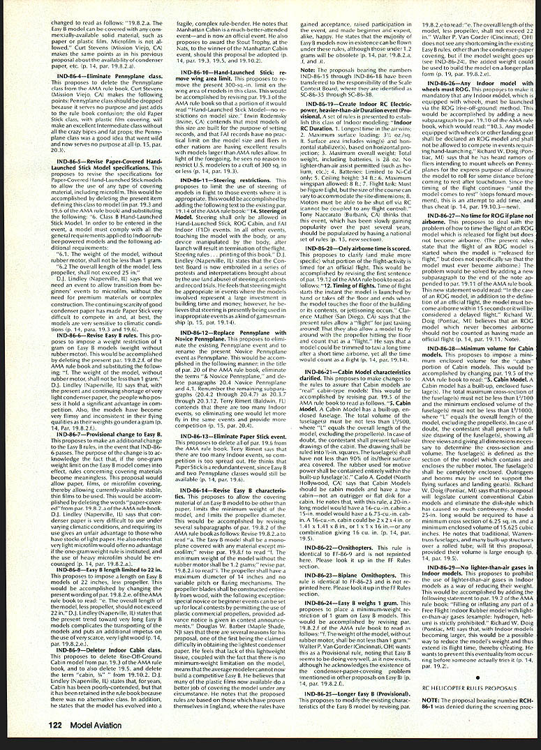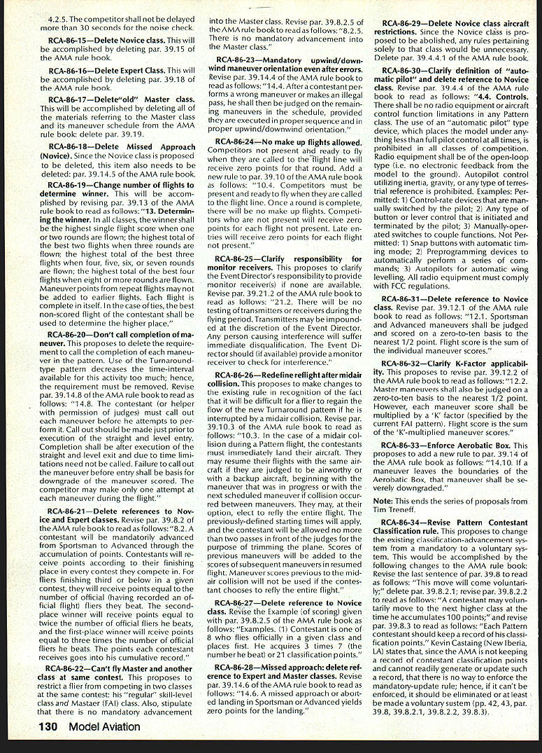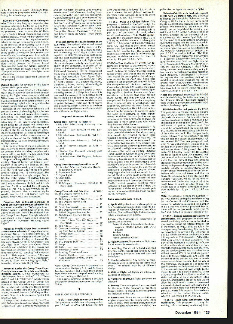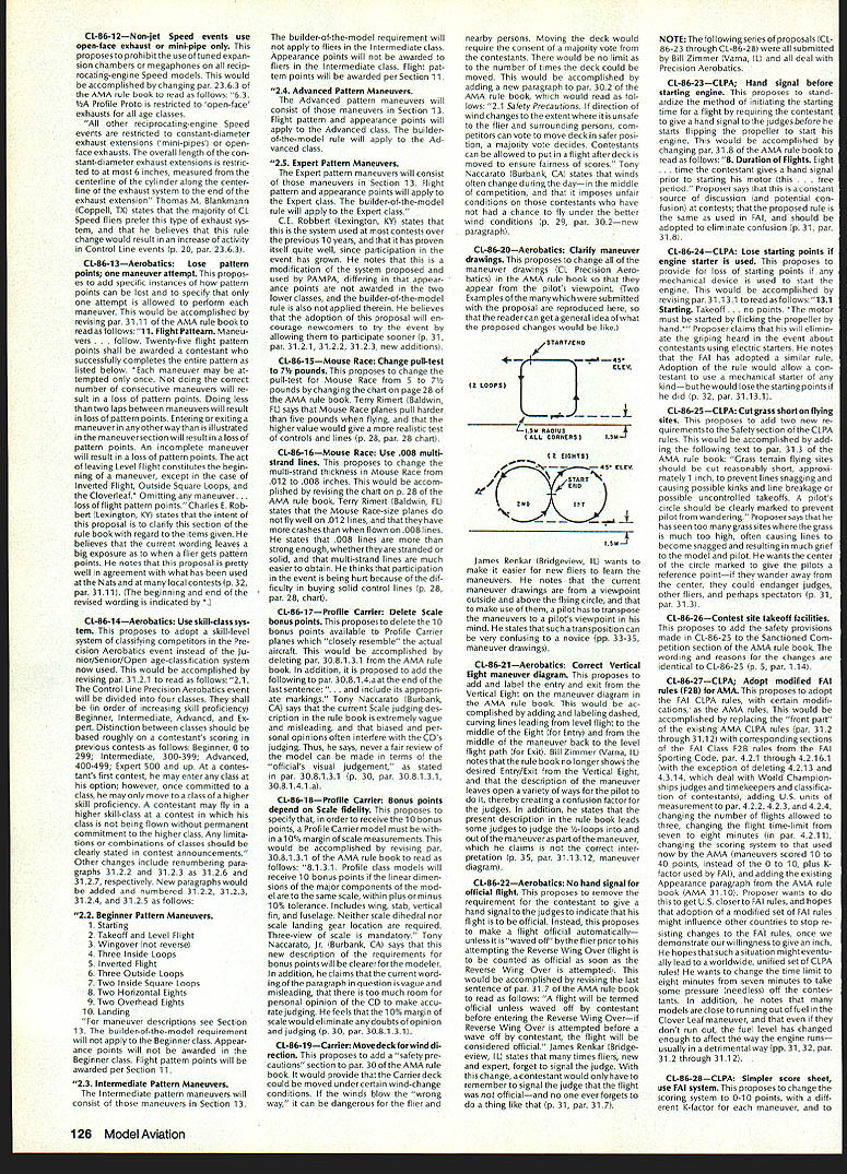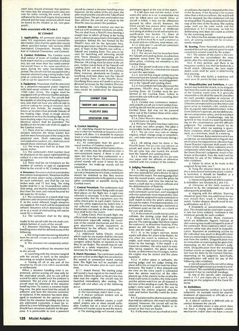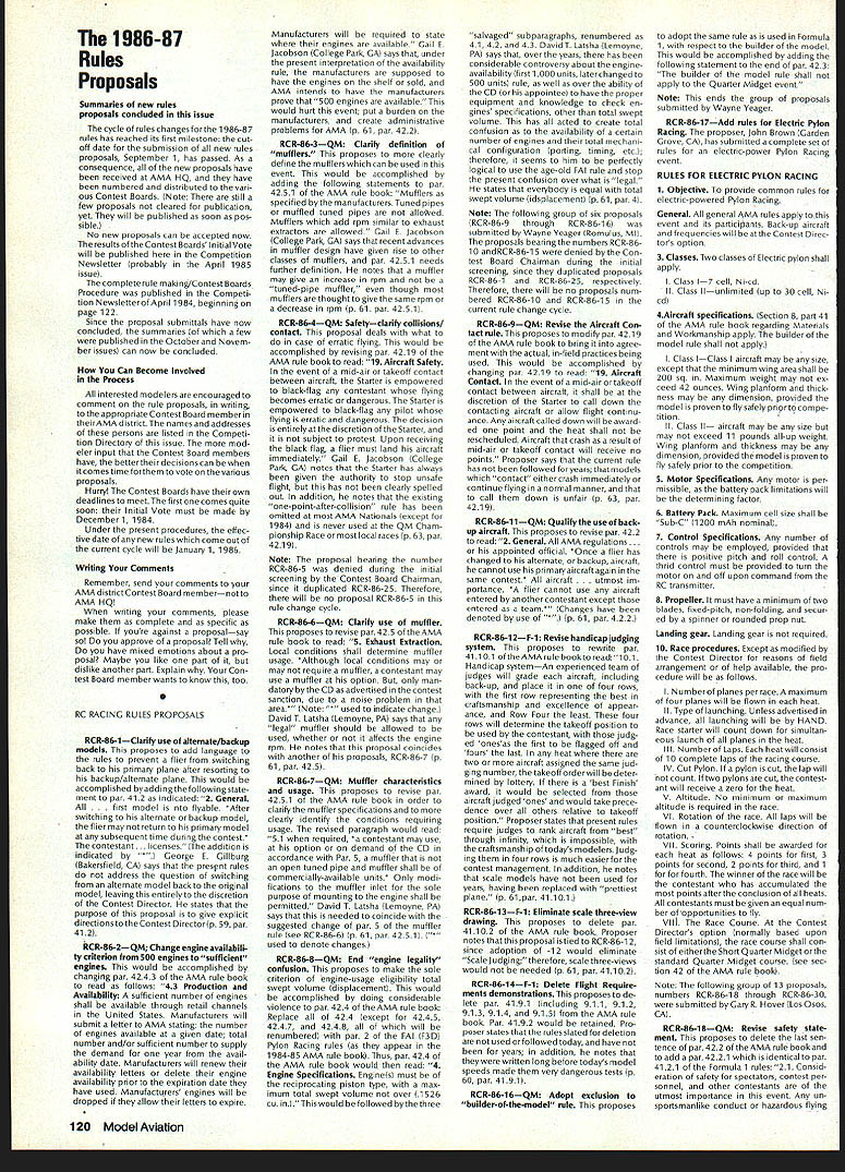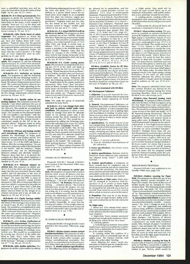 COM PETI TWIN NE WSLETTERW24V ACADEMY OF MODEL AERONAUTICS 84 CL World Champs 84 Nats Sullivan Results bare-bones results 1984 Con trol Line World Championships reached editorial offices just time squeezed issue Detailed coverage will published near future Speed F2A Hungarian modelers swept first three places took Team Championship First place Sandor Szegedi second place Jozsef Molnar third place Joszef Mult startling turn events Peoples Republic China second team standings Italy third Aerobatics F2B Defending World Champion Les McDon aId unseated Zhu Younan Peoples Republic China USAs Bob Baron second Niu Anlin Peoples Republic China third ever US team took top honors Japan second place Italy third Team Race F2C team Smith/Brown UK tookfirst place Van Uden/Van Uden Netherlands second Nitsche/Kuhn eggar Austria third Top team honors went Netherlands United King dom second Canada third Combat F2D Reigning World Champion Tom Fluker Jr unseated toet Wakkerman Netherlands Fred Meyer also Neth erlands second Roland Forstner Federal Republic Germany third Team standings showed Netherlands first United Kingdom second fourway tie third between Australia France Peoples Republic China Italy CL Emergency Proposal Ron McNally chairman Control L ne Contest Board has notified Compe tition Department AMA HQ following proposal alreadyin mill standard rule-change proposal see CL-86-37 process being handled Emergency Proposal too addition Chairman indicates recommended Immediate Enforcemen t Contest Board Procedures last published Competition Newsletter April1984 issue require Emergency Proposal published earliest possible issue Academy publication being published now 1810 SAMUEL MORSE DRIVE Junior contestant Aaron Markos Deer field IL winner MattySullivan Memorial Award 1984 Nationals Aaron also won award last year used just HandLaunched Glider hes holding photo too Aaron veritable one-man gang Indoor Outdoor Free Flight events since first- second-place awards total 14 events Aaron first-place trophies following Indoor events AMA Scale Peanut Scale Paper Stick Pennyplane Hand-Launched Glider All-Wood second-place trophies Easy B Outdoor events Aaron placed first AMA Rubber Scale 1/2A Gas Gas A-i Towline Glider Hand-Launched Glider P-30 Rubber other second-place per formances Peanut Scale Mul vihill Rubber WR Lee Missouri City TX person requesting Emergency action notes proposal unanimously sup ported over 30 persons attended Racing fliers meeting held 1984 Nats Bill Lee CLCB member District VIII justifies submitting Emergency Proposal because safety issue stake claims Racing events allow use high-nitrofuelsare now too extreme flown safely less very best pilots Proposal proposal originally submitted James E Ricketts Sioux Falls SD clude following restriction CL Racing Unified Rules section AMA rule book 10% nitro fuel used Continued page 119 RESTON VA 22090 Count up thats 11 firsts two seconds Matty Sullivan Memorial Award presented Junior contestant AMA Nationals has best record performance Since 13 years old years Nats could come back again next year third try maybe 1986 too depending whether fif teenth birthday before July 11 0 1985 Nats Set can start making plans now attend 1985 AMA National Contest worlds biggest model meet scheduled July27 through August 41985 Westover AFB Chicopee MA same site 1983 Nats Well keep informed detailed schedule added events etc planning completed early next year Sharp eyes will have noticed July 27 starting date Saturday instead traditional Sunday extra day will cer tainly allow little less panic respect processing check-in etc list Nats winners appears issue identifies competitor should have received Nats trophy name appears did pick up trophy Nats can still get Send request stating event place name address AMA number AMA HQ Attn Bob Vojslavek Include check money order $10 cover cost packaging mailing trophy Modelers responding notice requested earliest possible moment Requests received before Novem ber 15 1984 will able processed quickly arriving later cause rush activity license-renew al time Note Failure request trophy before year-end may result its being placed storage possibility additidnal cost being incurred Lost FOUND following items found September1984 Control Line World Cham pionships Chicopee MA telephone call AMA HQ 703/435-0750 will obtain information items correctly iden tified will returned ownerisi 1 Large camera sun shade 1 Camera lens filter 1 Set car keys December1984 115 Nats Trophies costs covered sponsorships contest entry fees 1984 Nats Sponsors Without sponsorships entry costs would high discourage participation Nationals has years expenses involved National Model Airplaneworlds biggest model meet because joint AMA-Industry Championships addition over 700 competition awards theresharing costs Academy Model Aeronautics therefore otherfinancial considerations rental telephones tablesproudly gratefully acknowledges thanks following trash pick-up special equipment etcsponsors Ace RC Inc Addis Elmore Aircraft Carriers Airtronics Phase Art American Junior Heritage Models American RC Helicopters Art Gross Enterprises Astro Flight Baltek Corporation Bob Dively Model Aircraft Inc Bridi Aircraft Designs Inc CB Associates Carl Goldberg Models Carolina-Taffinder CaRa Products Circus Hobbies Cox Hobbies Du-Bro Products Electronic Model Systems F&F Hobies Inc Firecat Technology Fox Manufacturing Full Command Systems Gorham Model Products Great Planes Model Mfg Grish Brothers Hobby Products Co House Balsa Inc K&B Manufacuring Kraft Systems Leisure Electronics McDaniel RC Service Midwest Products Model Airplane News Model Magic Products Northeast Engineering Pacer Technology Paul K Guillow Inc Peck-Polymers Peppermill Inn Casino Progress Mfg Co RAM Inc RC Video Mgazine Semco Sig Mfg Co Toledo Weak Signals Top Flite Models Viking Models USA Williams Brothers World Engines 1984 Nats Entries JrSrOpenTotal No Contestants4963628940 No Mechanics200 GRANOTOTAL1140 Ent