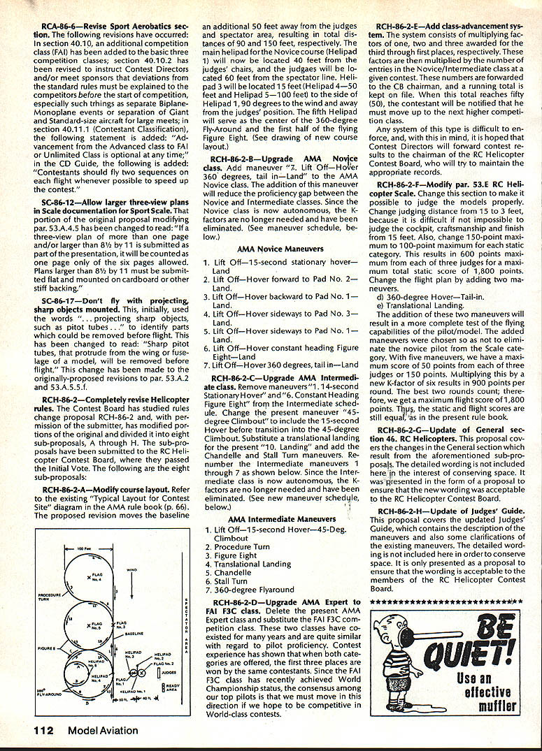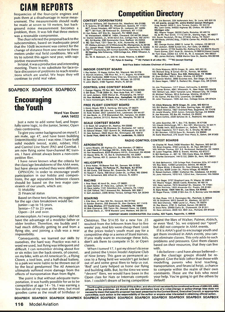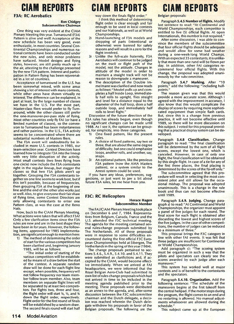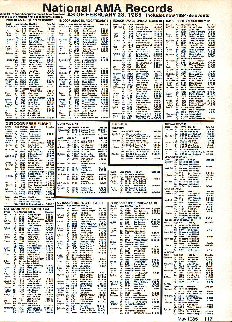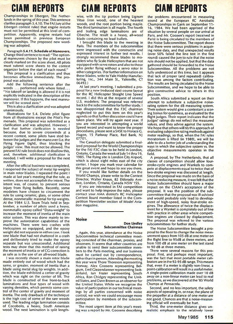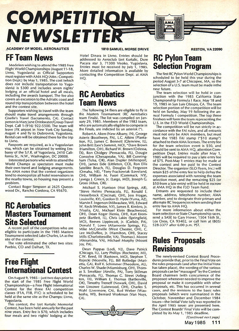 COMPEl NE WSLET ACADEMY OF MODEL AERONAUTICS FF Team News Modelers wishingto attend the1985 Free Flight World Championships August 11-18 Livno Yugoslavia Official Supporters must registerwith AMA HQ Attn Competi tion Dept May 1 1 985 cost does include transportation Yugo slavia $300 includes seven nights lodging official hotel meals including awards banquet fee also covers excursion Adriatic coast round trip transportation between hotel contest site Supporters wishing travel team should make travel arrangements through Giselles Travel Sacramento CA Contact person MaryJane Drinkwater/Group Travel Dept Call 1-916 922-5500 team will leave JFK airport New York City Sunday August 4 fly Dubrovnik Yugoslavia Rental cars will obtained trip Livno Passports required Yugoslavian visa can obtained writing Em bassy SFR Yugoslavia 2410 Cali fornia St NW Washington DC 20008 Interested persons wish attend World Champs spectators must make own travel lodging arrangements AMA notes contest organizers tend monopolize hotel reservations nearby towns housing may present problem Contact Roger Simpson 2625 Queenwood Dr Rancho Cordova CA 95670 RC Aerobatics Masters Tournament Site Selected recent poll competitors eligible participate 1985 Masters Tournament selected Lake Charles LA site contest vote eliminated other two sites Pueblo CO Dalhart TX Free Flight International Contest OnAugust9 1985justtwo days priorto start 1985 Free Flight World Championshipsa Free Flight International Contest three FAI competition classes FlA FiB FiC scheduled held same site Champs Livno Yugoslavia contest Izet Kurtalic Memorial Contest has held annually past nine years Entry fee $7Q includes four meals two nights lodging Hotel Dinara Livno Entries should addressed Aeroclub Izet Kurtalic Dure Pucara star 3 71300 Visoko Yugoslavia Entries must received July 1 1985 detailed information available contacting Competition Dept AMA HQ RC Aerobatics Team News following 54 fliers eligible fly Masters Tournament RC Aerobatics team Finals list compiled Jan uary29 1985 Members 1983 team automatically eligible compete Finals indicted asterisk * RobertA Akers NewAlbany IN George Asteris Boothwyn PA LC Atkins Planta tion FL James C Bennett Glenview IL John Britt Lees Summit MO Dave Brown Hamilton OH Richard W Brown Odessa TX Ron Chidgey Pensacola FL Dougie Consolvo Chesapeake VA Bill Cunning ham Tulsa OK Alan Dupler Millersport OH James Elde Littleton CO Ron Ellis Satellite Beach FL Douglas D Ferguson Omaha NE *Tony Frackowiak Loveland OH William M Fuori Commack NY Lavega Green Jr Largo MD Joseph G Gross Altus OK Michael S Harrison Hot Springs AR Steve Helms Pensacola FL Ronald E Hesselbrock Cincinati OH less Hogan Louisville KY Gordon D Hyde Yuma AZ Marvin F Ingerson Milwaukee WI Edward W Keck Webster NY James R Kimbro Jr Visalia CA Michael Klein Beachwood OH Dean Koger Xenia OH Kurt Krem petz Bartlett IL Chris Lakin Springfield MO Reeves Lippincott Jr Carlisle PA Donald T Lowe Altamonte Springs FL Mike McConville West Chester OH C Lee McDuffee Jr Hamilton OH Stacey Mills Charlottesville VA Thomas Moore Alexandria VA Michael Murphy Mount Joy PA Dean Pappas Lodi NJ Dave Patrick Chicago IL Larry Phillips Rochester MI CW Reed Ill Raytown MO Stephen T Rojecki Niceville FL Bill Rutledge Mari etta GA RoIf K Schimmer Theodore AL Charles W Shade Miamisburg OH Thom S Smeltzer Airville PA Tony Stillman Pensacola FL Thomas G Street Arling ton TX William E Thomas Bartlesville OK Timothy Treneff Newark OH David von Linsowe Lakewood OH Charles S WahI Livermore CA Bud Weber Wau kesha WI Bernard Workman Van Nuys CA AMA_ Program first RC Pylon World Championships scheduled held year during period August 3-7 Chicopee MA selection US team must made inthe near future team selection will held con unction 1985 California State Championship Formula Race May18 19 1985 San Luis Obispo CA team selection portion competition will held Sunday May19 following nual Formula competition top three finishers will form team representing US F3D World Championships competition will run strictly ac cordance FAI rules entrants must AMA members must have 1985 FAI stamp $10 stamp attached theirAMA licenses entryfee team selection event $50 should sent AMA H Q attention Com petition DepL Entries made after May 1 1985 will required pay late entry fee $75 Post-May 1 entries may made contest fee paid Contest Director organizer SLO Flyers Inc will retain $25 entry fee help defray expenses associated running team selection meet remaining $25 $50 late entry will held escrow AMA HQ F3D Team Fund Entrants requested include name address telephone number AMA number designate primary alternate RCfrequencieswhensendingtheir entry fee AMA HQ information about either team selection orState Championship races send SASE Gary Hover 1504 16th St Los Osos CA 93402 call him 805 528 3377 after 600 p m PST Rules Proposals Revisions newly-revised Contest Board Proce dures provide prior Final Vote rules proposals afterthe Initial Vote has taken place wording various proposals can bemassaged Contest Board chairmen concurrence proposer whenever needed improve proposal make compatible other proposals etc has occurred several cases revisions basic rules proposals summarized October November December 1984 issuesthe Initial Vote tally reported April 1985 issue presented Contest Boards Final Vote will com pleted its May 1 1985 deadline Continued flex t page May1985 111 1810 SAMUEL MORSE DRIVERESTON VA 22090 RC Pylon Team Selection RCA-66-6Revise Sport Aerobatics sec tion following revisions have occurred section 4010 additional competition class FAI has added basic three competition classes section 40102 has revised instruct Contest Directors and/or meet sponsors deviations standard rules must explained competitors before start competition especially such trhings separate BiplaneMonoplane events separation Giant Standard-size aircraft large meets section 40111 Contestant Classification following statement added Ad v
