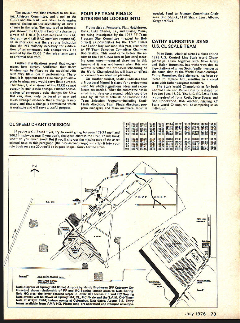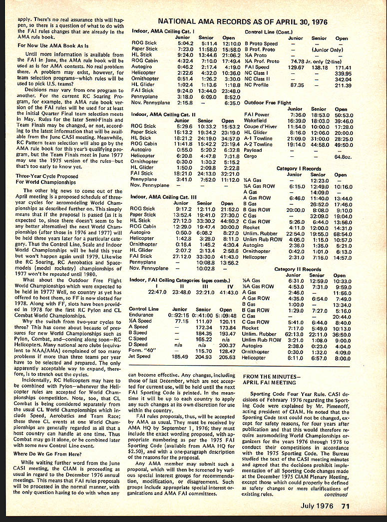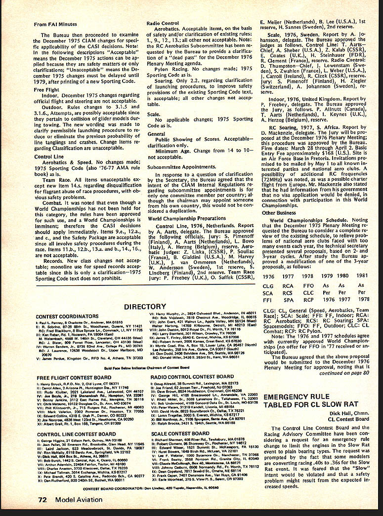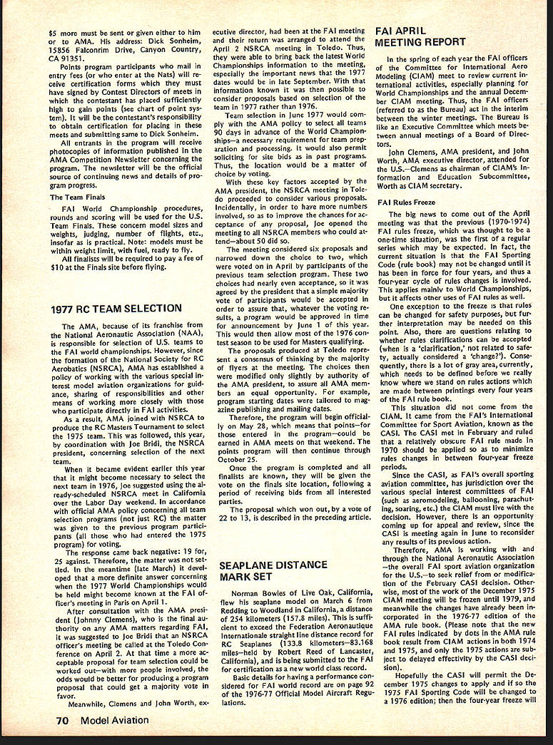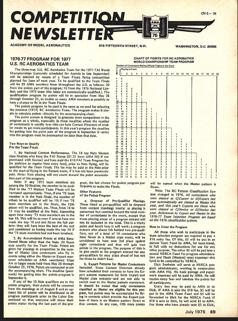 COM PETI TWIN NE WSLETTEIrY ACADEMY OF MODEL AERONAUTICS 815 FIFTEENTH STREET NW WASHINGTON DC 20005 1976-77 PROGRAM FOR 1977 US RC AEROBATICS TEAM three-man US RC Aerobatics Team 1977 FAI World Championships currently scheduled Austria late September will selected means Team Finals flying competition planned June next year qualified Team Finals will 33 AMA members throughout US follows 20 points part program 10 1976 National Con test 1975 team latter automatically qualified qualification program points will operation May 28 through October 25 enable AMA members possible have chance fly Team Finals points program used same used selecting previous 1975 RC Aerobatics Team program makes sim ple calculate pointsdirectly accompanying chart point system designed generate competition program whole especially localities number contestants usually lowthis can help Contest Directors smal ler meets get participants years program deadline getting point part program September 6entry program must postmarked no later date Two Ways Qualify Team Finals 1 National Contest Performance 10 top Nats Masters class finalists have FAI Stamp $125 AMA HQ purchased license have paid $10 FAI Team Program fee addition regular Nats entry fees prior Nats flying will qualified Team Finals fee may paid Nats prior start flying Pattern event has previously paid Note Nats placing will count toward point accumula tion part program Note 1975 team members among 10 finaiists number qual ified 77 Masters Team Finals will increased appropriately Thus 75 team member Nats finals number others qualified will 10 two 75 team members finals 12th placer will qualified etc Thusfrom 10 13 may qualified Nats depending upon 75 team members top 10 will several have made top 10 flown full pat ternthey will have best rest considered having made top 10 75 team members involved 2 Accumulated Points AMA Sanc tioned Meets other Nats 20 flyers may qualify Team Finals Points given placings proportion num ber Master class contestants fly events using either Master Expert man euver schedulesat AMA sanctioned Class AA larger meets held May 28 through October 25 1976 Points computed per accompanying chart deadline post mark getting points program September 6 10 Nats qualifiers points program points will removed standings August 8 up dated list points will distributed program participants prior Labor Day weekend everyone will know points status during last part proCHART OF POINTS FOR RC AEROBATICS WORLD CHAMPIONSHIP TEAM PROGRAM Number Contestants Making OlOcial Flights Enent [PlaCiflRinEOeflt 56789 10 24 342 452 3532 6632 76322 87322 974221 i2LA322 11843221 1294322I 13933222 141053222 151053322 1611S4322 171164322 181264322 191264322 201364333 10 11 12 13 14 13 111 111 111 1 16 17 18 19 20 11 11 111 II1 III 11 2 2 2 2 3 21137433222111 221475332222I1 2314754322221 24IS754322221I 23138543322221 26168543322221 27168543322221 28178643322222 29179643322222 30IC0644353939 311896S433222221I11 32199654332222211II 33191065433222221111 3420107943322222211I 3520107543332222211I 36211075433322222I11 37211175443322222111 3822117S443322222211 3922Il764433222222I1 40231186943332222221 gram last chance points program par ticipants make Finals Other Features Points Program Dropout Pre-Qualifier Placings listed pre-qualified will dropped contest standings insofar placing concerned counted toward total num ber contestants event except placing ahead program entrant will included total tricky point heres will work program entrant places 5th behind two pre-quali fiers out total 10 contestants have flown Master class event will considered have won 3rd place against eight contestants thus will gain two points program purpose give credit program entrant pre-qualifiers may place ahead didnt beat b Expert Patterns Master Contestants Included Some Contest Directors already have scheduled contests have Ex pert pattern maneuvers both Expert Master class entrantsand able switch over Master pattern maneuvers should noted contestants classified Master eligible pro gram points may accumulated fly ing contests provide Expert pat ternif no Masters pattern flown contest case 10% points will earned Master pattern flown Note RC Pattern Classification Sys tem changed 1976 contestants classed C/Expert DI Expert last year automatically classed Master year years Experts classed C/Novice DiNovice last year References Expert Master 1976-77 Team Selection Program based 1976 classification system Enter Program wish participate team selection program required pay $10 entry fee $5 will put escrow Team Fund AMA team travel full no deductions use other purpose other $5 will put special NSRCA Fund program administra tion finals Masters meet expensesthis fund controlled NSRCA Dick Sonheim will serve NSRCA pro gram administrator working conjunction AMA HO basic postage paper work expenses will paid AMA will receive entry fees tabulate points participants Entry fees may paid AMA Dick AMA sent $10 fee $5 will put AMA Team Fund $5 will forwarded Dick NSRCA Fund $10 sent Dick will send $5 AMA have already sent $5 Dick July1976 69 CN 576 $5 must sent given either him AMA address Dick Sonheim 15856 Falconrim Drive Canyon Country CA 91351 Points program participants mail entry fees enter Nats will re ceive certification forms must have signed Contest Directors meets contestant has placed sufficiently high gain points see chart point sys tem will contestants responsibility obtain certification placing meets submitting same Dick Sonheim entrants program will receive photocopies information published AMA Competition Newsletter concerning program newsletter will official source continuing news details pro gram progress Team Finals FAI World Championship procedures rounds scoring will used US Team Finals concern model sizes weights judging number flights etc insofar practical Note models must within weight limit fuel ready fly finalists will required pay fee $10 Finals site before flying 1977 RC TEAM SELECTION AMA bec