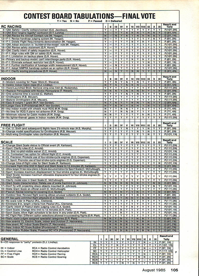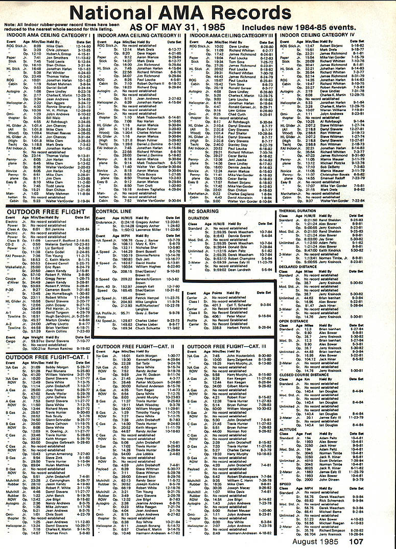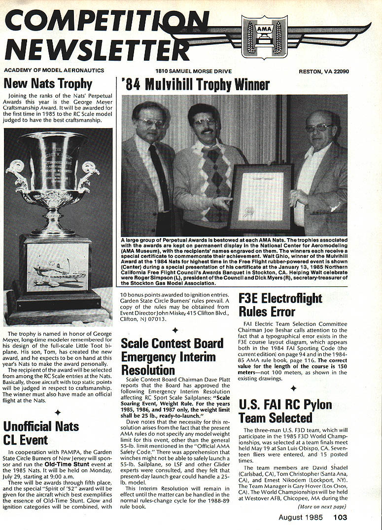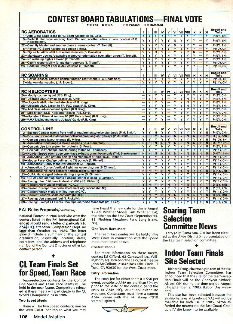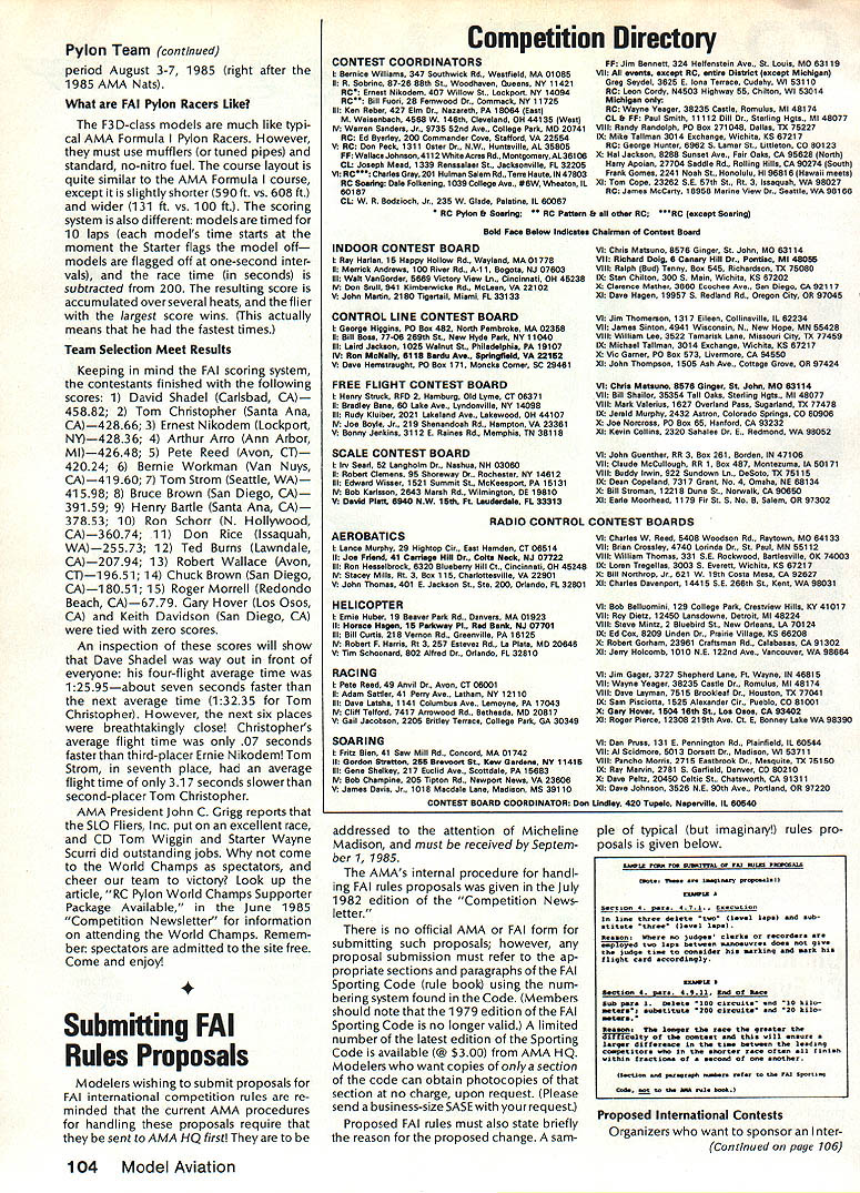 COM PETI TWIN NE WSLETTEIrZ ACADEMY OF MODEL AERONAUTICS 1810 SAMUEL MORSE DRIVE RESTON VA 22090 New Nets Trophy Joining ranks Nats Perpetual Awards year George Meyer Craftsmanship Award will awarded first time 1985 RC Scale model judged have best craftsmanship trophy named honor George Meyer long-time modeler remembered design full-scale Little Toot bi plane son Tom has created new award expects hand years Nats make award personally recipient award will selected among RC Scale entries Nats Basically aircraft top static points will judged respect craftsmanship winner must also have made official flight Nats ficial Nats CL Event cooperation PAMPA Garden State Circle Burners New Jersey will spon sor run Old-Time Stunt event 1985 Nats will held Monday July 29 starting 900 am will awards through fifth place special Spirit 52 award will given aircraft best exemplifies essence Old-Time Stunt Glow ignition categories will combined 84 MuIvihill Trophy Winner 10 bonus points awarded ignition entries Garden State Circle Burners rules prevail copy rules may obtained Event DirectorJohn Miske41 5 Clifton Blvd Clifton NJ 07013 e Contest Board Emergency Interim Resolution Scale Contest Board Chairman Dave Platt reports Board has approved following Emergency Interim Resolution affecting RC Sport Scale Sailplanes Scale Soaring Event Weight Rule years 1985 1986 1987 weight limit shall 25 lb ready-to-launch Dave notes necessity re solution arises fact present AMA rules specify model weight limit event other general 55-lb limit mentioned Official AMA Safety Code apprehension winches might able safely launch 55-lb Sailplane LSF other Glider experts consulted felt present-day launch gear could handle 25lb model Interim Resolution will remain effect until matter can handled normal rules-change cycle 1988-89 rule book F3E Electroflight Rules Error FAI Electric Team Selection Committee Chairman Joe Beshar calls attention fact typographical error exists F3E course layout diagram appears both 1984 FAI Sporting Code current edition page 94 198485 AMA rule book page 116 correct value length course 150 metersnot 100 meters shown existing drawings AI RC Pylon Team Selected three man U S F3D team will participate 1985 F3D World Champ ionships selected team finals meet held May19 San Luis Obispo CA Seven teen fliers entered 15 posted times team members David Shadel Carlsbad CA Tom Christopher Santa Ana CA Ernest Nikodem Lockport NY Team Manager Gary Hover Los Osos CA World Championships will held Westover AFB Chicopee MA during next page August 1985 103 ophies associated awards KS1. , .ar.. display .for Aeromodeling iseum recipients names engravbu , ,. ra receives flcate commemorate achievement Walt Ghiu wuuuur Mulvihili Award 1984 Nets highest time Free Flight rubber-powered event shown Center during special presentation certificate January13 1985 Northern California Free Flight Councils Awards Banquet Stockton CA Helping Walt celebrate Roger Simpson L president Council Dick Myers R secretary-treasurer Stockton Gas Model Association Pylon Team continued period August 3-7 1985 right after 1985 AMA Nats What FAI Pylon Racers Like F3D-class models much like typi cal AMA Formula Pylon Racers However must use mufflers tuned pipes standard no-nitro fuel course layout quite similar AMA Formula course except slightly shorter 590 ft vs 608 ft wider 131 ft vs 100 ft scoring system also different models timed 10 laps models time starts moment Starter flags model off models flagged off one-second inter vals race time seconds subtracted 200 resulting score accumulated overseveral heats flier largest score wins actually means fastest times Team Selection Meet Results Keeping mind FAI scoring system contestants finished following scores 1 David Shadel Carlsbad CA 45882 2 Tom Christopher Santa Ana CA42866 3 Ernest Nikodem Lockport N42836 4 Arthur Arro Ann Arbor MI42648 5 Pete Reed Avon CT 42024 6 Bernie Workman Van Nuys CA41 960 7 Tom Strom Seattle WA 41 598 8 Bruce Brown San Diego CA 391 59 9 Henry Bartle Santa Ana CA 37853 10 Ron Schorr N Hollywood CA36074 11 Don Rice lssaquah WA25573 12 Ted Burns Lawndale CA20794 13 Robert Wallace Avon CT1 9651 14 Chuck Brown San Diego CA1 8051 15 Roger Morrell Redondo Beach CA6779 Gary Hover Los Osos CA Keith Davidson San Diego CA tied zero scores An inspection scores will show Dave Shadel way out front everyone four-flight average time 12595about seven seconds faster next average time 13235 Tom Christopher However next six places breathtakingly close Christophers average flight time 07 seconds faster third-placer Ernie Nikodem Tom Strom seventh place average flight time 317 seconds slower second-placer Tom Christopher AMA President John C Grigg reports SLO Fliers Inc put excellent race CD Tom Wiggin Starter Wayne Scurri did outstanding jobs come World Champs spectators cheer team victory Look up article RC Pylon World Champs Supporter Package Available June 1985 Competition Newsletter information attending World Champs Remem ber spectators admitted site free Come enjoyl itting FAI Rules Proposals Modelers wishing submit proposals FAI international competition rules re minded current AMA procedures handling proposals require sent AMA HQ first Competition Directory CONTEST COORDINATORS I Bernice Williems 347 Southwick Rd Westfield MA 01085 II R Sobrino 87-26 88th St Woodheven Queens NY 11421 AC Ernest Nikodem 407 Willow St Lockport NY 14094 RC Bill Fuori 28 Femwood Or. commack NY 11725 Ill Ken Reber 427 Elm Dr. Nazareth PA 18064 Beet M Weisenbach 4588W 146th cleveland OH 4413S West V Warren Sanders Jr. 9735 52nd Ave. College Park MD 20741 AC Ed Byarley 200 Commander cove Stafford VA 22554 V RC Don Peck 1311 Oster Dr. NW. Huntsville AL 35805 FF Wallace Johnson 4112 WhiteAcres Rd. MontgonteryAL361 06 CL Joseph Meed 1339 Rensselaer St. Jacksonville P1 32205 vi AC Charles Grey 201 Halman Salem Rd.Tene Haute IN 47803 AC Soaring Dale Folkenmg 1039 College Ave. #6WWheaton IL 60187 CL W R Bodzioch Jr. 235 