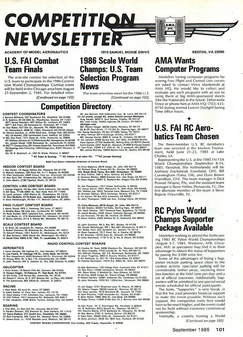 COMPE NEWSL ACADEMY OF MODEL AERONAUTICS US FAI Combat Team Finals one-site contest selection US team participate 1986 Control Line World Championships Combat event will held Chicago area August 31-September 2 1985 detailed infor Continued page 103 1986 Scale World Champs US Team Selection Program News team selection meetforthe 1986 US Continued page 103 CONTEST COORDINATORS I Bernice Williams 347 Southwick Rd. Westfield MA 01085 II R Sobrino 8726 88th St. Woodhaven Queens NY 11421 RC Ernest Nikodem 407 Willow St. Lockpsrt NY 14094 RC Bill Fuori 2B Ferowood Dr. Cammack NY 11 72B Ill Ken Reber 427 Elm Dr. Nazareth PA 18084 East M Weisenbach 4B6B W 14Bth Cleveland OH 44135 Went IV Warren Sandem Jr 9735 82nd Ave college Park MD 20741 RC Ed Byarley 200 Commander Cove Stafford VA 22884 V RC Don Peck 1311 Oster Dr. NW. Huntsville AL 35805 FP Wallace Johpson41 12 VVhiteAcres Rd Montgomery AL361 06 CL Joseph Mead 1339 Rensselaer St Jacksonville PL 32205 VI RC Charles Gray 201 Halman Salem Rd. Terre Haute IN 47803 RC8oaning Dale Folkening 1039 College Ave. #6WWheaton IL 80187 CL W R Bodzioch Jr. 235W Glade Palatine IL 60067 RC Pylon & SoaringRC Pattern En other RCRC except Soaring FF Jim Bennett 324 Helfenstein Ave. St Louis MO 83119 VII eventa except RC entire District except Michigan Greg Seydel 3625 8 Inns Terrace Cudahy WI 53110 RC Leon Cordy N4503 Highway 55 Chilton WI 53014 Michigan RC Wayne Yasger 38235 Castle Romulus MI 48174 CL En FF Paul Smith 11112 Dill Dr Sterling Hgts. MI 48077 VIII Randy Randolph P0 Boo 271048 Dallas TX 75227 IX Mike Tallman 3014 Exchange Wichita KS 67217 RC George Hunter 6962S Lamar St. Littleton CO 80123 X Hal Jackson 8288 Sonnet Ave. Fair Oaks CA 95628 North Harry Apoiso 27704 Saddle Rd. Rolling Hills CA 90274 South Frank Gomes 2241 Noah St. Honolulu HI 86816 Hawaii meets Xl Tom Cope 23262 88 57th St. Rt 3 Issaqsah WA 98027 RC James McCarty 18958 Marine View Dr. Seattle WA 98166 Bold Face Below Indicatee Chairmen Contest Board INDOOR CONTEST BOARD I Ray Harlan 15 Happy Hollow Rd Wayland MA 01778 II Merrick Andrews 100 River Rd A1 1 Bogota NJ 07603 III Walt VanGorder 5669 Victory View La. Cincinnati OH 45238 IV Don Srsll 941 Kimberwicke Rd. McLean VA 22102 V John Martin 2180 Tigertail Miami FL 33133 CONTROL LINE CONTEST BOARD I George Higgins P0 Boo 482 North Pembroke MA 02358 II Bill Boss 77-06 269th St. New Hyde Park NY 11040 III Laird Jackoon 1025 Walnut St. Philadelphia PA 19107 IV Ron McNally 8118 Bardu Ave. Springfield VA 22182 V Dave Hemotraught P0 Boo 171 Moncks Corner SC 29461 FREE FLIGHT CONTEST BOARD I Henry Struck RPD 2 Hamhsrg Old Lyme CT 06371 II Bradley Bane 60 Lake Ave. Lyndonville NY 14098 Ill Rody Klsiber 2021 Lakeland Ave. Lakewood OH 44107 IV Joe Boyle Jr. 219 Shenandoah Rd. Hampton VA 23361 V Bonny Jenkins 3112 E Raises Rd. Memphis TN 38118 SCALE CONTEST BOARD 11w Searl 52 Langholm Dr. Nashua NH 03060 II Robert Clemens 95 Shoreway Dr. Rochester NY 14612 Ill Edward Wisser 1521 Summit St McKeesport PA 15131 IV 80k Karlsson 2643 Marsh Rd. Wilmington DE 19810 V David PlatS 8940 NW 18th Ft Lauderdale P133313 AEROBATICS I Lance Murphy 29 Hightop Cir. East Huwden CT 06514 II Joe Friend 41 Carriage Hill Dr. Colta Neck NJ 07722 Ill Ron Hesselbrock 6320 Blueberry Hill Ct. Cincinnati OH 45248 IV Stacey Mills Rt 3 Boo 115 Charlottesville VA 22901 V John Thomas 401 8 Jackson St. Ste 200 Orlando FL 32801 HELICOPTER I Ernie Huber 19 Beaver Pork Rd. Danvem MA 01923 II Horace Hagen 15 Parkway P1. Red Bank NJ 07701 Ill Bill Curtis 218 Vernon Rd Greenville PA 18125 IV Robert F Harris Rt 3 257 Estevex Rd La Flats MO 20646 V Tim Schoonard 802 Alfred Dr. Orlando FL 32810 RACING I Pete Reed 49 Anvil Dr Avoo CT 06001 II Adam Satller 41 Perry Ave. Latham NY 12110 Ill Dave Lateha 1141 Columbus Ave. Lemoyne PA 17043 IV Cliff Telford 7417 Armwood Rd. Bethesda MD 20817 V Gail Jacohoon 2205 Britley Terrace College Park GA 30349 SOARING I Fritz Bien 41 Saw Mill Rd. Concord MA 01742 II Gordon Stratton 255 Brevoort St. Kew Gardens NY 11415 Ill Gene Shelkey 217 Euclel Ave. Scottdale PA 18683 IV 80k Champine 205 Tiptov Rd Newport News VA 23606 V James Davis Jr. 1018 Macdale Lane Madison MS 39110 VI Chris Matssno 8576 Ginger St John MO 63114 VII Richard Doig 6 Canary Hill Dr. Pontiac Ml 48055 VIII Ralph Bud Teeny Boa 848 Richardson TX 78080 IX Stan Chilton 300 5 Main Wichita KS 67202 X Clarence Mother 3860 Ecochee Ave. San Diego CA 92117 Xl Dave Hogan 19957 5 Redland Rd Oregon City OR 97045 VI Jim Thomemon 1317 Eileen Collienville IL 62234 VII James Sixton 4941 Wisconsin N. New Hope MN 55428 VIII William Lee 3522 Tamariok Lane Missouri City TX 77459 IX Michael Tallman 3014 Exchange Wichita KS 67217 X Vic Garner P0 Box 573 Livermore CA 94550 XI Jxhn Thompson 1505 Ank Ave. Cottage Grxve OR 97424 VI Chris Matauno 8576 Ginger St John MO 63114 VII Bill Shailor 35354 Tall Oaks Sterling Hgts. Ml 48077 VIII Mark Valerius 1627 Overland Pass Sogarland TX 77478 IX Jomid Murphy 2432 Astron Colorado Springs CO 80906 X Joe Norcroso P0 Box 65 Hanford CA 93232 XI Kevin Collins 2320 Sahalee Dr E. Redmond WA 98082 VI John Goenther ER 3 Box 261 Borden IN 47106 VII Claude McCxllosgh RR 1 Box 487 Montezums IA 50171 VIII Buddy Irwin 922 Sundown La. DeSoto TX 75115 IX Dean Copeland 7317 Grant No4 Omaha NE 68134 X Bill Stroman 12218 Dove St. Norwalk CA 90650 Xl Earle Moorhead 1179 Fir St S No B Salem OR 97302 RADIO CONTROL CONTEST BOARDS VI Charles W Reed 9408 Woodnon Rd. Raytxwn MO 84133 VII Brian Crosoley 4740 Lorinda Dr St Puol MN 55112 VIII William Thxmas 331 SE Rockwood Bartleoville OK 74003 IX Lxren Tregellas 3003 5 Everett Wichita KS 6721 7 X Bill Northrop Jr. 621 W 19th Costa Mesa CA 92627 XI Charles Davenport 14415 SE 266th St. Kent WA 98031 VI Bxb Belloomini 129 Cxllege Park Creolviem Hills KY 41017 VII Rxy Dieta 12450 Lanodowne Detroit MI 48224 VIII Steve Minta 2 Blsebird St. New Orleans Lh 70124 IX Ed Cos 8209 Linden Dr Prairie Village KS 56208 X Robert Gorham 23961 Craftsman Rd. Calahasas 