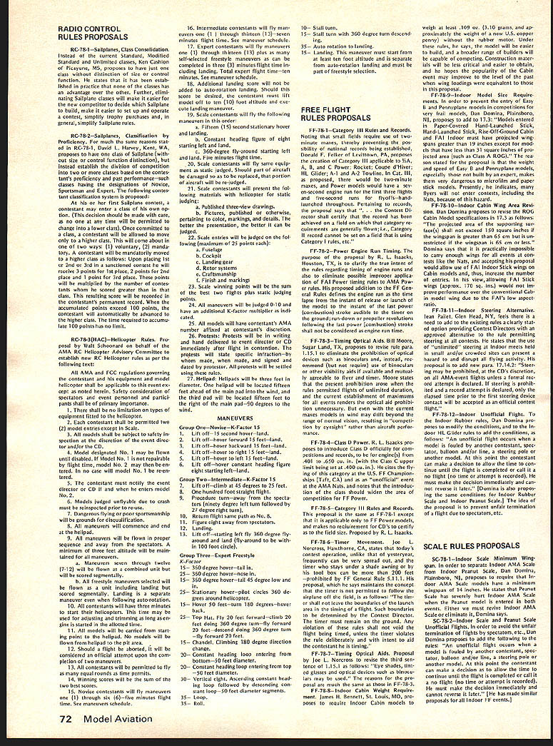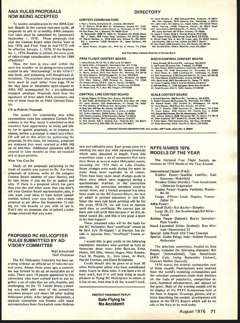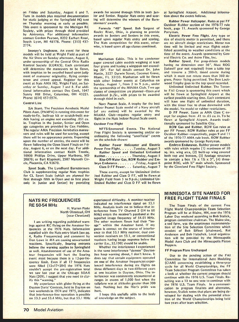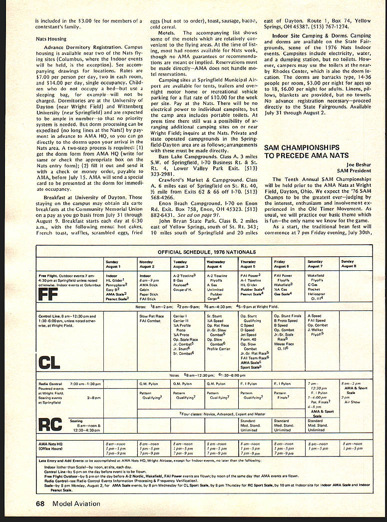 MORE NATIONAL CONTEST IN FORMATION issue should reach subscribers very near advance entry postmark deadline July 1 hoped flyers will have entered because eases processing paperworkand allows entry considerable savings over late fees 1976 Nats scheduled August 1 through August 8 Ohiowith indoor events flown 65-ft ceiling State Fair grounds Coliseum Columbus Radio Con trol power events Control Line events limited-duration Free Flight events Wright Field Dayton Free Flight RC Soar ing events Springfield Municipal Airport Entry Form Errors Control Line Slow Rat Race Although event shown properly daily schedule Monday August 2 inadvertently left off listing events actual entry form Because notice being sent Nats entry form acknowledge ments advising Slow Rat Race may en tered late penalty returning 7Rd Rd MtncpoS M,c7cneotS MlC, On5 W!b,725 40 INGFIELP -COn SItSt4L2L\ 7 special form event fee required no later July 15 Control Line 0 Speed separate line error shown eventbut since concerns designation Open en trants mark C Speed automatically will go D Speed [By new rule book desig nations previous Open C Class now Class D] Master Pattern Qualifying correct Kfactor Takeoff 5 10 shown RC events information entry form Testors Trophy Best Finish new info CL & RC Sport Scale models entered Best Finish competition models com peting Best Finish must turned Scale Cage Nats hangar Wright Airbase between 9 am 830 pm Monday August 2 Contestants Sport Scale models either CL RC wish enter Best Finish contest must also turn models 830 pm Monday time turn must sure noti fy registrar model Sport Scale entry Testors Best Finish judging will con cluded 10 pm Monday August 2at Sketches show relationships between Nats flying sites Wright Field Springfield Municipal Airport nearby dorms respectively University Dayton Wittenberg University pay dorms advance AMA may proceed di rectly dorms upon arrival area See text nil d MC KEMLEY75EN HTh ON 6 time up 1030 pm Sport Scale models entered also non-Scale entries must picked up Sport Scale models will view prior Sport Scale judging Models entered AMA Scale events will remain Scale Cage until judging completed Sport Scale entrants reminded must report Scale Cage models receive judging appointment cardson Wednesday 6 9 pm Control Line Thursday 6 9 pm Radio Control special procedure accordance instructions Nats entry form necessary avoid pre mature display Sport Scale models could prejudice judging Late Entry Information July 1 deadline missed entry still possible contest site during Nats accordance Late Entry Add Events section Official Schedule printed issuefor Indoor Free Flight Control Line Scale events Radio Control events other RC Scale has different late entry deadlines AMA Sport Scale per schedule late entry Nats must accomplished no later hour prior close transmitter processing shown below Ex ample QM Pylon processing shown 3-S pm late entry AMA Nats HQ must completed 4 pm RC Soaring late entry must accomplished AMA Nats l-IQ Wright Airbase 5 pm Wednesday Au gust 4 Transmitter Processing Schedule Quarter Midget Pylon Sunday August 1 3-5 pm Pattern Monday August 28-11 am Formula Pylon Wednesday August 4 3-6 pm Scale Friday August 610-12 am RC Soaring Wednesday August 4 4-6 pm Springfield Airport Anyone thinks might enter 1976 Nats should obtain complete 6-page Nats entry form information extracted contains much other useful information Simply send request AMA HQ 815 Fifteenth St NW Washing ton DC 20005 please include stamped pre-addressed envelope Late Basic Entry Fee Juniors Seniors $500 same advance fee cludes entry three events $3500 Open members no events included Event fees late entries events added Nats advance entrants $500 per event age categories-except RC $1000 per event Mechanics Fee advance late $300 provides identification field access priv ileges equivalent contestants Available AMA members Nats-only membership August1976 67 NE WSLETTE ACADEMY OF MODEL AERONAUTICS815 FIFTEENTH STREET NWWASHINGTON DC 20005 Y included $300 fee members contestants family Nats Housing Advance Dormitory Registration Campus housing available near two Nats fly ing sites Columbus Indoor events will held exception See accom panying drawings locations Rates $700 per person per day two room $1400 per day single occupancy Child ren occupy bedbut use sleeping bag examplewill charged Dormitories University Dayton near Wright Field Wittenberg University near Springfield expected ample numberso no priority system needed dorm processing can expedited no long lines Nats pay ment advance AMA HQ can go directly dorms upon arrival Nats area two-step process required 1 get dorm form AMA HQ write same check appropriate box Nats entry form 2 fill out send check money order payable AMA before July 15 AMA will send special card presented dorm immedi ate occupancy Breakfast University Dayton staying campus may obtain ala carte breakfasts Community Memorial Union pay go basis July 31 through August 9 Breakfast starts day 630 am following menu hot cakes French toast waffles scrambled eggs fried eggs order toast sausage bacol cold cereal Motels accompanying list shows some motels relatively con venient flying areas time list ing rooms available Nats week though no AMA guarantees recommenda tions meant implied Reservations must made directlyAMA does handle mo tel reservations Camping sites Springfield Municipal Air port available tents trailers over night motor home recreational vehicle parking flat rate $1000 week per site Pay Nats will no electrical power individual campsites camp area includes portable toilets press time still possibility ar ranging additional camping sites near Wright Field inquire Nats Private state operated campgrounds Spring field-Dayton area follows arrangements must made directly Bass Lake Campgrounds Class 3 miles SW Springfield 1-70 Business Rt & St Rt 4 Lower Valley Park Exit 513 323-2981 Crawfords Market & Campground Class A 6 miles east Springfield St Rt 40 1A mile Ex
