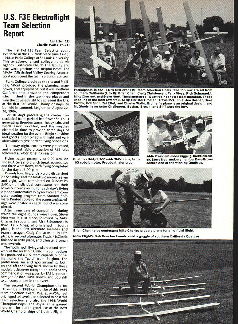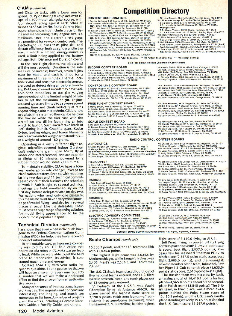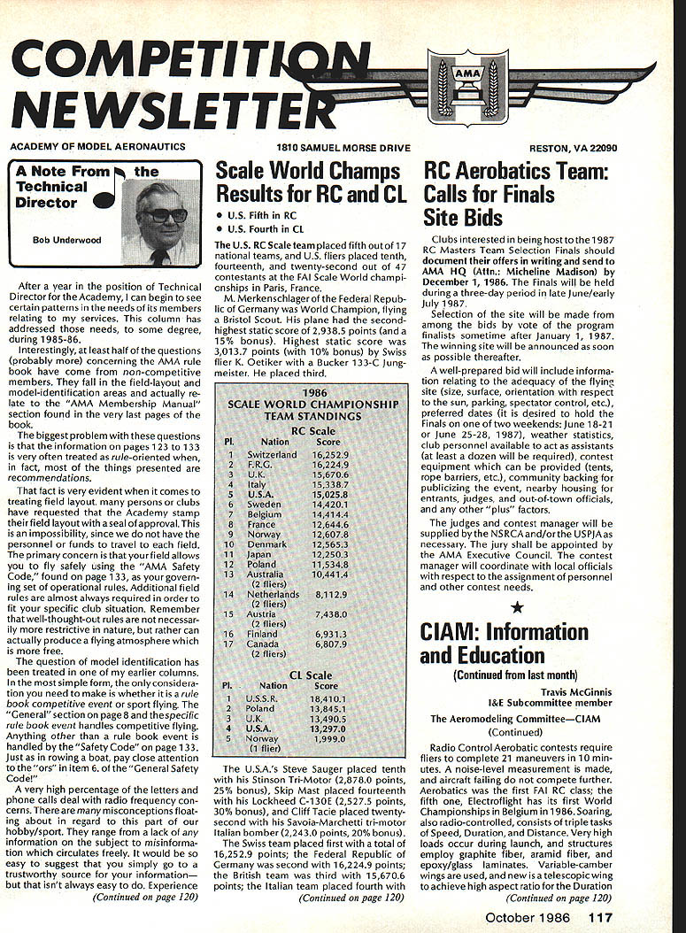COM PETI TWIN NE WSLETTENX ACADEMY OF MODEL AERONAUTICS 1810 SAMUEL MORSE DRIVE RESTON VA 22090 Note Technical Director W Bob Underwood After year position Technical DirectorfortheAcademy can begin see certain patterns needs its members relating services column has addressed needs some degree during 1985-86 Interestingly least half questions probably concerning AMA rule book have come non-competitive members fall field-layout model-identification areas actually re late AMA Membership Manual section found very last pages book biggest problem questions information pages 123 133 very often treated rule-oriented fact things presented recommendations fact very evident comes treating field layout persons clubs have requested Academy stamp field layout seal approval impossibility since have personnel funds travel field primaryconcern isthatyourfield allows fly safely using AMA Safety Code found page 133 govern ing set operational rules Additional field rules almost always required order fit specific club situation Remember well-thought-out rules necessar ily restrictive nature rather can actually produce flying atmosphere free question model identification has treated earlier columns simple form considera tion need make whether rule book competitive event sport flying General section page 8 specific rule book event handles competitive flying Anything other rule book event handled Safety Code page 133 Just rowing boat pay close attention ors item 6 General Safety Code very high percentage letters phone calls deal radio frequency con cerns misconceptions float ing about regard part hobby/sport range lack information subject misinforma tion circulates freely would easy suggest simply go trustworthy source information isnt always easy Experience Continued page 120 Scale World Champs RC Aerobatics Team Results BC CL Calls Finals Site Bids US Fifth RC US Fourth CL US RC Scale team placed fifth out 17 national teams US fliers placed tenth fourteenth twenty-second out 47 contestants FAI Scale World champi onships Paris France M Merkenschlager Federal Repub lic Germany World Champion flying Bristol Scout plane secondhighest static score 29385 points 15% bonus Highest static score 301 37 points 10% bonus Swiss flier K Oetiker Bucker 133-C Jung meister placed third USAs Steve Sauger placed tenth Stinson Tn-Motor 28780 points 25% bonus Skip Mast placed fourteenth Lockheed C-i 30E 25275 points 30% bonus Cliff Tacie placed twentysecond Savoia-Marchetti tn-motor Italian bomber 22430 points 20% bonus Swiss team placed first total 162529 points Federal Republk Germany second 162249 points British team third 156706 points Italian team placed fourth Continued page 120 Clubs interested being host 1987 RC Masters Team Selection Finals should document offers writing send AMA IIQ Attn Micheline Madison December 1 1986 Finals will held during three-day period late June/early July 1987 Selection site will made among bids vote program finalists sometime after January 1 1987 winning site will announced soon possible thereafter well-prepared bid will include informa tion relating adequacy flying site size surface orientation respect sun parking spectator control etc preferred dates desired hold Finals two weekends June 18-21 June 25-28 1987 weather statistics club personnel available act assistants least dozen will required contest equipment can provided tents rope barriers etc community backing publicizing event nearby housing entrants judges out-of-town officials other plus factors judges contest manager will supplied bythe NSRCAand/orthe USPJAas necessary jury shall appointed AMA Executive Council contest manager will coordinate local officials respect assignment personnel other contest needs * ClAM Information Education Continued last month Travis McGinnis l&E Subcommittee member Aeromodeling CommitteeClAM Continued Radio Control Aerobatic contests require fliers complete 21 maneuvers 10 min utes noise-level measurement made aircraft failing compete further Aerobatics first FAI RC class fifth Electroflight has its first World Championships Belgium 1986 Soaring also radio-controlled consists triple tasks Speed Duration Distance Very high loads occur during launch structures employ graphite fiber aramid fiber epoxy/glass laminates Variable-camber wings used new telescopic wing achieve high aspect ratio Duration Continued page 120 October1986 117 .I~Cp0C00 o~moCm00 0000 jCC 0C *. Cmmm 25So-OM 0-j0M005 00--o~aj-- -0- -04 S 00C-000000C-O0C-00C-00O 0C-00C-00C-0000-00t--00C-00C- 0 00C0 OOC-OOC-OOC-OOC-O OOC-OOC-OOC-00-00C- 0 0-0-00000- 0C0r0C0Cr0Cr0C0CC-oCC0O 0C0 Z0MM ZZ CMZZOMMM4MM00M---00M 5MM0M0MM00ZZZ5 S881* aamoaM 00M0400 00-JM 400 tRtMM 000400000000 MM0O0040M- m aMM-0MMMaM0MM0 0-- oaa0- ~g0 •-o cooCco &62a oooaonaao--d- .o-o5 oa 0-0a0MM 0000004000Mm 400000 0000 OMa-JM (00000440 0J0550 co 00000Urn o0C000U 000 n aaHOraacaHmcOCaocoC-C-ooOIma01 amcOC-C,C-CmCOC-C-C-aaOaC-I s~aso-s88ss 82202C0OlOO0U00 t Ogaorco.oo0aomhfl21 0 acm m ----.jAg00— 1120-8.1&ooOSUO000 0-5aS rU.o-amoooo~ rn S -000 <ba 0oC~'a0 o-00 a8S8 r8o m8Eo moSo 5CC55o8m2 8 08'05 JO 0 C; 8C' 81811 ro8- a~1P~ m-Zoa8ao2g 55ao C 0z0a20 0oo030mrara 7I -005a ho 00822 8-oo 00050 o0a0aoaco0000a a0a8550ooaoaargaa282- 2-0 2ao0hoo 000'm0aaa o2o500812-ha0I ,oSoooo-a-ar -00-- 0g0020 0a'' Us Mo00-o000-jooa-4-j-aaa C 0 -S 4 0 aa 30M--4&M04a0oaa 0-J C 03 M MMMMM MM-MMMM--- 0303MM 00 ''4'''4'''-M- MM03MMMMM 03 MMMM2 MMJo00-4- 00 00-4ma JMao-40-JM4a oaowJaao 0 0 00000-000 0000-MOa 0O J-4--Jm-J--J-om-Jm-J 0mm0-Jm-4-J-4--404-4-J0-J-4--J4 4o(04 0.A 0&m-o-oooaaoo-o a-4-J-J4 odododoA Co a30 OaaOMm-400-Jo 0M04OM-400JmMMO4 0-J40-4 m0-J SMSMO0M0-J0MM---00-000000 maa oft 00000 20 0mm 9300000000oolUE 0o o0 I o 9asa a00 QOO 000O0OW 00 00 09 0th cocoa C- 0CC- 00 C- 00 C- 00 C-00C-0 o 0-- 0MM 1 r 0a4t~ mOJ0MOmF 8 I00 O OOmo4&&2 9IS bWbb2 Ss~jao 9b090w 80o2Vgo smSsggi[21gi8asg8iSa888b U 0 a2502 0 0rUUg-o-o -0-a00 •U 22 ~00Uoo~o8oo8iba 2020503fl00 200 03 010 -00000mOOOZ C MMMMWM 4. moom0