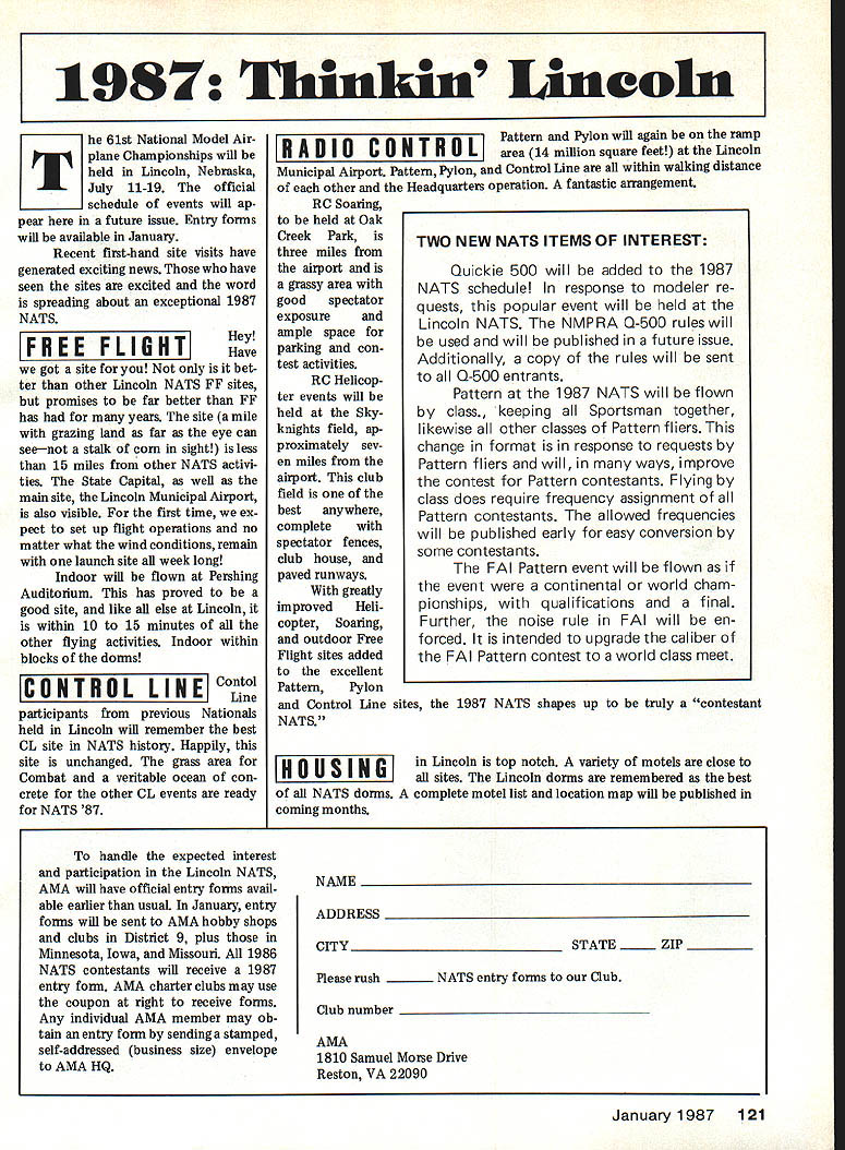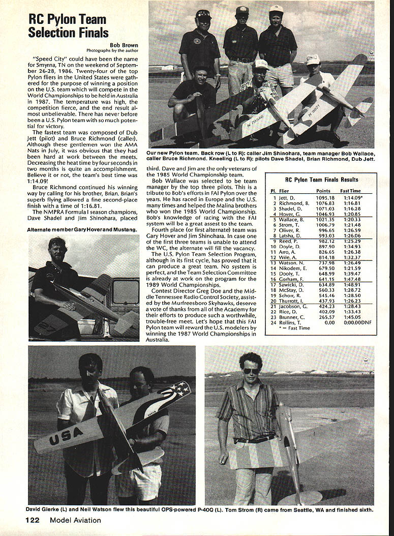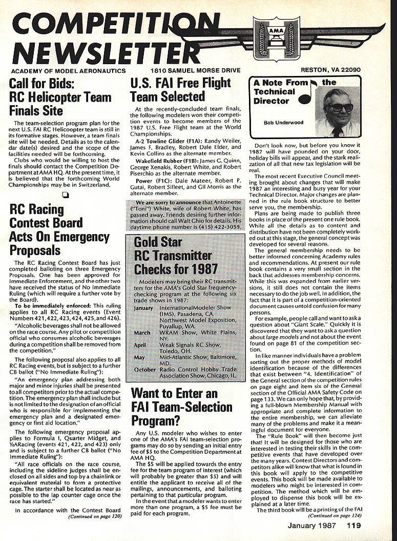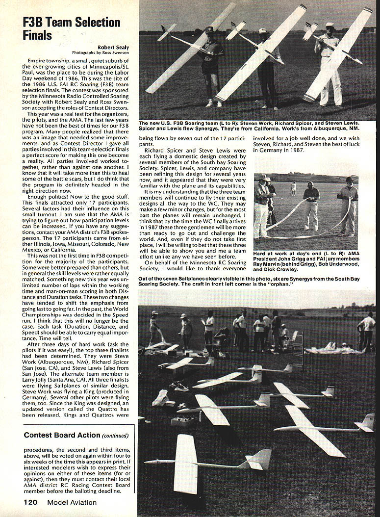 COMPE NE WSLE ACADEMY OF MODEL AERONAUTICS Call Bids RC Helicopter Team Finals Site team-selection program plan next US FAI RC Helicoopter team still its formative stages However team finals site will needed Details calen dar dates desired scope facilities needed will forthcoming Clubs would willing host finals should contact Competition De partmentatAMAHQAtthe presenttime believed forthcoming World Championships may Switzerland RC Racing Contest Board Acts Emergency Proposals RC Racing Contest Board has just completed balloting three Emergency Proposals has approved Immediate Enforcement other two have received status No Immediate Ruling will require further vote Board immediately enforced ruling applies RC Racing events Event Numbers42l 422423424 425 426 Alcoholic beverages shall allowed race course Any pilot competition official consumes alcoholic beverages during com petition shall removed competition following proposal also applies RC Racing events subject further CB ballot No Immediate Ruling An emergency plan addressing both major minor injuries shall presented competitors prior actual com pe tition emergency plan shall include limited designation official responsible implementing emergency plan designated emer gency first aid location following emergency proposal ap plies Formula Quarter Midget 1/2ARacing events 421 422 423 subject further CB ballot No Immediate Ruling race officials race course including sideline judges shall en closed sides top chainlink equivalent material form protective cage starter shall located near possible lap counter cage once race has started accordance Contest Board Continued page 120 recently-concluded team finals following modelers won competi tion events become members 1987 US Free Flight team World Championships A-2 Towline Glider FlA Randy Weller James F Bradley Robert Dale Elder Kevin Collins alternate member Wakefield Rubber Fl BJames G Quinn George Xenakis Robert White Robert Piserchio alternate member Power FiC Dale Mateer Robert P Gutai Robert Sifleet Gil Morris alternate member Want Enter FAI Team-Selection Program Any US modeler wishes enter AMAs FAI team-selection pro grams may sending initial entry fee $5 Competition Department AMA HQ $5 will applied towards entry fee team program interest will probably greater $5 will entitle applicant receive mailings announcements balloting pertaining particular program event modeler wants enter program $5 fee must paid program L Bob Underwood Dont look now before know 1987 will have pounded door holiday bills will appear stark reali zation new tax legislation will real recent Executive Council meet ing brought about changes will make 1987 interesting busy year Technical Director Major changes plan ned rule book structure better serve membership Plans being made publish three books place present rule book details content distribution have completely work ed out stage general concept developed several reasons general membership needs better informed concerning Academy rules recommendations present rule book contains very small section back addresses membership concerns expanded earlier ver sions still does contain items necessarytodothejobwell lnadditionthe fact part competition-oriented document causes untold confusion persons Forexample peoplecallandwanttoaska question about Giant Scale Quickly discovered want ask question about large models about event found page 81 competition sec tion like manner individuals have problem sorting out proper methods model identification because differences exist between 4 Identification General section competition rules page eight item six General section Official AMA Safety Code page 133 can hope provid ing full-blown Membership Manual appropriate complete information entire membership can alleviate problems make mean ingful document everyone Rule Book will become just will designed interested testing skills com petitive events have developed over years Contest Directors com petitors alike will know what found book will apply competitive events book will made available modelers might interested com petition method will em ployed dispense book will ex plained later time third book will be printing FAI Continued page 124 January1987 119 1810 SAMUEL MORSE DRIVERESTON VA 22090 US FAI Free Flight Team Selected Note Fmm Technical Director W F3B Team Selection Finals Robert Sealy Photographs Ross Swenson Empire township small quiet suburb ever-growing cities Minneapolis/St Paul place during Labor Day weekend 1986 site 1986 US FAI RC Soaring F3B team selection finals contest sponsored Minnesota Radio Controlled Soaring Society Robert Sealy Ross Swen son accepting roles Contest Directors year real test organizers pilots AMA last few years have best times F3 B program people realized image needed some improve ments Contest Director gave parties involved team-selection finals perfect score making become reality parties involved worked gether rather against another know will take heal some battle scars think program us definitely headed right direction now Enough politics Now good stuff finals attracted 17 participants Several factors influence small turnout am sure AMA trying figure out participation levels can increased have sugges tions contact yourAMA districts F3 B spokes person 17 participants came ei ther Illinois Iowa Missouri Colorado New Mexico California first time F3 B competi tion majority participants Some better prepared others general skill levels rather equally matched Something new year un limited number laps within working time man-on-man scoring both Dis tance Duration tasks two changes have tended shift emphasis going fast going far past World Championships decided Speed run think will no longer case task Duration Distance Speed should able carry equal impor tance Time will tell After three days hard work ask pilots easy top three finalists determined Steve Work Albuquerque NM Richard Spicer San Jose CA Steve Lewis also San Jose alternate team member Larry