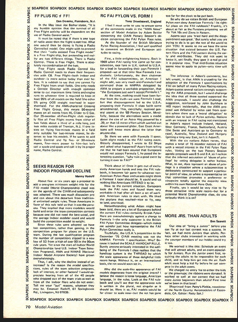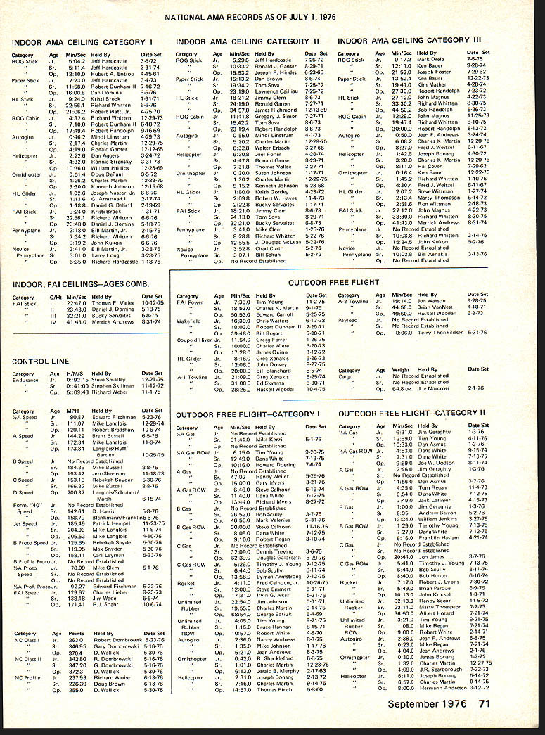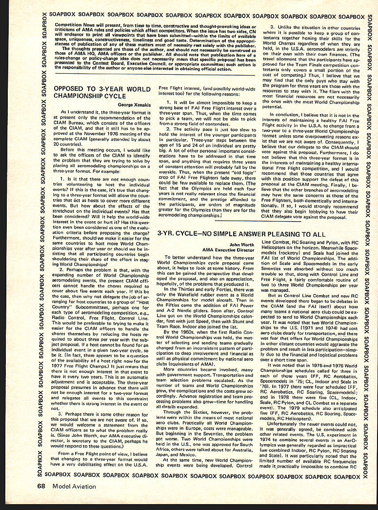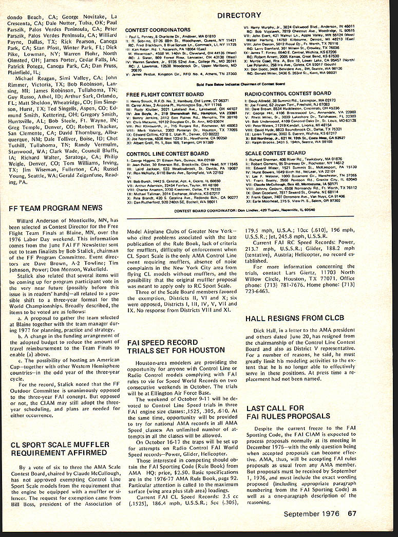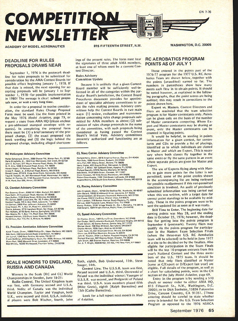 CN 7-76 COM PETI TWIN NE WSLETTEPWIUFin ACADEMY OF MODEL AERONAUTICS DEADLINE FOR RULES PROPOSALS DRAWS NEAR September 1976 postmark dead line rules proposals submitted consideration AMA Contest Boards possible effect beginning January 1 1978 date missed next opening ac cepting proposals will January 1 Sep tember 1 1978for possible implementation 1 980 message clear submit propo sals now wait very long time order proposal receive consider ation standard Rules Change Proposal Form must used Use form printed May 1976 Model Aviation page 79 request copy AMA HQ please enclose pre-addressed stamped envelope re quests completing proposal form must 1 brief summary pro posed change 2 exact proposed rule book wording 3 logic behind proposed change including alleged shortcom RC Helicopter Advisory Committee Waine Schoonad Chnn. 2080 Sharon Rd Winter Park FL 32789 Oario Brisighella St 1032 Fast Manitowoc Oak crook wi 53154 John E Borkan, 571 Moont Aloerno Road Media PA 19083 W R Ella 1208 cliftecood Road EoIcs TX 76039 Horace Hagen 15 Parkway Place Red Book NJ 07701 Ernest T Hobo, Jr 8 Michael Rood Benely MA 01910 Donald Lowe 2710 N Kinos Anr Cicle Cenervjlle OH 45440 Faye W People, III 281 NorristOw, Road WorninstOt PA 18934 Nathan H Ranobo III 1158 Baywood Aoenoe Canarillo cA 93010 Al M Ward Boo 595 Akoe co 80720 CL Combat Advisory Committee Ron Scoone, Choro 8300 NE 1465 BotheIl WA 98011 Dace Balch 43 GaybowOr Rood Moeoe CT 08488 Oory Baffon 7134 Blake Stret El Certito CA 94530 Phil cartior 6680 Locia Lane No 18 Pridley MN 55432 Slephoc Pooble RR 2 Boo 142A Lewisodle TX 75067 Kit Gerhart 3930 West Jeltesoo Kokoero IN 46801 Greg Hissern RI 180031 Rose Hill KS 87133 charlie Johnson 3718 lograhanr Street Soo Diego CA 92109 Ron McNally 6118 Bardo Aceoce Optinotield VA 22152 Mao Meare Rt 1 Boo 111 Rock coon WV 26505 Howard Shonton 310 Drory Lane Mooldin oc 29662 Pal Willcoo Boo 113 Rd 3 Miltord Nj 08848 CL Precision Aerobatics Advisory Committee Keith Trostle chern. 10900 PhillipI Or. Upper Marlboro MD 20870 Bob Hots 240 Orneobrook Road Groenbrook NJ 08812 Jin Lynch 1249 West Perkins MentphisTN 38117 Prank MeMillan 810 Hackbery Coort No 2009 60110cc, NE 88005 Wynn Pool 1640 Maywick Otron LeoirgtOn KY 40804 Bob Whitely 16320 Myrtlewood Poontain Valley CA 92708 815 FIFTEENTH STREET NW ings present rules form must bear signatures three adult AMA members least must current Con test Director Rules Advisory Committee Update Because unlikely given Contest Board member will sufficiently well-in formed categories within par ticular Boards jurisdiction Contest Board Procedures document provides appoint ment specialist advisory committees sist rules making process Advisory com mittees help Contest Boards two main ways 1 review evaluation recommen dation concerning rules change proposals sub mitted AMA members above 2 sub mission rules change proposals name committee such proposals being considered having passed Contest Boards Initial Vote Advisory committees presently authorized functioning follows CL Navy Carrier Advisory Committee Richard Perry Chen. 5016 Angelita Acenoa Dayton OH 45424 Ron Daly 1806 Karen Street Borbank cA 91S04 Jerry Parr 941 Albany Street Abilene TX 79605 Harry Higley 433 Atyailo Orion Glenwood IL 60425 chris F J Miller 181 CaIdwell Street Apopka FL 32703 Richard Sawicki 37216 NoreonWentland Ml 48185 Bob Sentie 70-24 66th Sseet Gleodale NY 11227 Glenn Sinpson 19 Hilda Streot Wotchoster MA 01806 Robert Snrorthwaite 1102 1155 Street Laorande OR 97880 Ecqene Wielns 515 Sooth Gore Aoenoe Webster Groans MO 63119 CL Racing Advisory Committee John Kilsdonk chne 16159 Old Badtord Rd Northoille MI 48167 John Ballard 10102 Kiotblewick Drive Loaisnillo KY 40223 George CaIdwell 22 Discooery BoolevardWaIkercille MD 21793 Joe Kloose 23512 Via Breve Mission Vielo CA 92678 Dick Lanthert 718 Bostoo Avonoe Sooth Daytona FL 32019 Bill Lee 3522 Tonrorish Lane Minsoori City TX 77459 Kenny Perkins 2130 Village Woods Ct No Meerphic TN 38116 Bob Sargeot 1694 Wright Avenos Rocky River OH 44116 CL Speed Advisory Committee Bill Pardon Chren. 1201 Sorry Orion Oreenshoto NC 27408 Carl Dodge 364 Doerbarton Boolevard Richnoond Heights OH 44143 Frank Gareon 42 Storey Anence Central slip NY 11722 Michael Hood 738 Welt M Street Springfield OR 97477 Charles Herron 1026 Capri Wichita KS 67207 Frank Hont III 551 Broobdale Drive Meroed CA 99340 Glenn Lee 819 West Mandroke Batavio IL 60510 John W Newton 2154 Los Padres Rowland Heights CA 9174S Richard Shannoo 507 Mooney Street Dresden TN 38258 John Onrith 9808eone Avence Massillne OH 44846 Pot T Wright 460648162 VA 105 FPO New York NY 09801 SCALE HONORS TO ENGLAND Roth eighth Bob Underwood 11th Steve RUSSIA AND CANADASauger 14th Control Line USSR team first Poland second USA third Ostrowski Winners Scale RC CL WorldPoland individual winner Youngov Championships Sweden June 18-25 Radio Control United Kingdom teamUSSR second Podgorski Poland first Germany second USAwas third USA team members placed fifth third Nelitz Canada individualMike Gretz eighth Ralph Burnstine World Champion Taylor Vaughan both13th Cathy Burnotine UK second third USA individu- k full report next month Mod al placers Bob Wischer fourth Johnc/Aviation WASHINGTON DC 20005 RC AEROBATICS PROGRAM POINTS AS OF JULY 1 entered points part 1976-77 program 1977 US RC Aero batics Team shown below together points unaudited earned far numbers parentheses show meets flew obtain points should noted however explained follow ing paragraphs point scores being audited may result corrections points shown Expert vs Masters Contest Directors fliers reminded team selection program Master contestants Points can given basis number Master contestants competing Ex pert Master contestants may sharing event Master contestants can counted figuring points would helpful sending points information given contest contes tants CDs provide list placings identified individuals classed Master Expert neces sary both classes fly together same even
