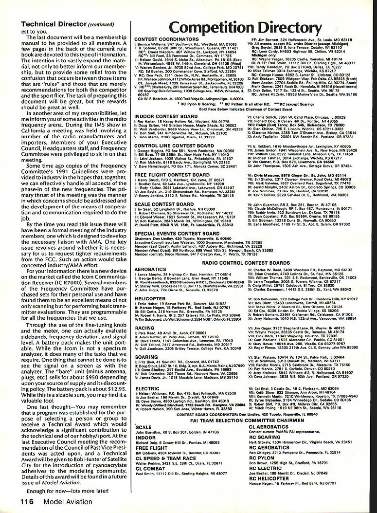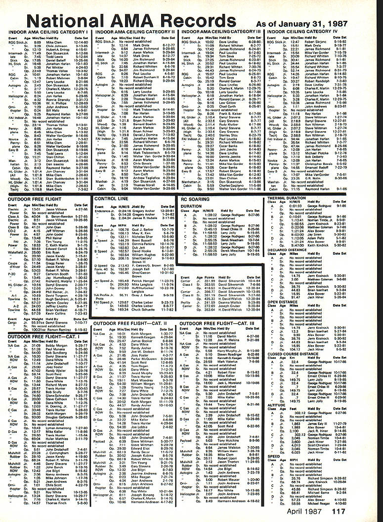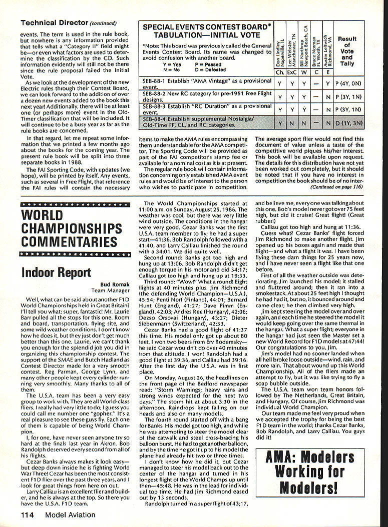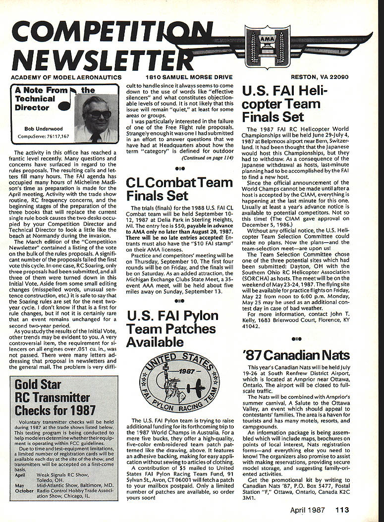 COMPE NE WSLETTE ACADEMY OF MODEL AERONAUTICS Note Technical Director W Bob Underwood CompuServe 761171 67 activity office has reached frantic level recently questions concerns have surfaced regard rules proposals resulting calls let ters fill hours FAI agenda has occupied hours Micheline Madi sons time preparation made April meeting Activity trade show routine RC frequency concerns beginning stages preparation three books will replace current single rule book causes two desks occu pied Competition Director Technical Director look little like beach Normandy during invasion March edition Competition Newsletter contained listing vote bulk rules proposals signifi cant number proposals failed first vote cycle case RC Soaring three proposals submitted three turned down Initial Vote Aside some small editing changes misspelled words unusual sen tence construction etc safe say Soaring rules set next twoyear cycle dont know first rule changes certainly rare event remains unchanged second two-year period As study results Initial Vote other trends may evident very controversial item requirement si lencers engines over 051 cu passed letters ad dressing proposal newsletters general mail problem very diffi 6o14 Star RC Transiitter checks fir AAl cultto handle since italways seemsto come down use words like effective silencers what constitutes objection able levels sound likely issue will remain quiet least some areas groups particularly interested failure Free Flight rule proposals Strangely enough submitted effort answer questions have Headquarters about term category defined outdoor Continued page 114 eli CL CombatTeam Finals Set trials finals 1988 US FAI CL Combat team will held September 1012 1987 Delia Park Sterling Heights Ml entry fee $50 payable advance AMA no later August 20 1987 will no late entries accepted En trants must also have $10 FAI stamp AMA licenses Practice competitors meeting will Thursday September 10 first four rounds will Friday finals will Saturday As added attraction Michigan Exchange Clubs State Meet 35event AAA meet will held about five miles away Sunday September 13 oil US FAI Pylon Team Patches Available US FAI Pylon team trying raise additional funding its forthcoming trip 1987 World Champs Australia Fora mere five bucks offer high-quality five-color embroidered team patch pat terned like drawing above features adhesive backing making easy appli cation sewing articles clothing contribution $5 mailed United States FAI Pylon Racing Team Fund 91 Sylvan St Avon CT 06001 will fetch patch mailbox postpaid Only limited number patches available order yours soon 1987 FAI RC Helicopter World Championships will held June 29-July 4 1987 Belpmoos airport near Bern Switzer land thought Japanese would host Championships withdraw As consequence Japanese withdrawal hosts last-minute planning accomplished FAI find new host Since official announcement World Champs cannot made until after host accepted ClAM everything happening last minute Usually least years advance notice available potential competitors time ClAM gave approval December 5 1986 Without official notice US Heli copter Team Selection Committee could make no plans Now plansand team-selection meetare upon us Team Selection Committee chose three potential sites submitted Dayton OH Southern Ohio RC Helicopter Association SORCHA hosts meetwill weekend May23-24 1987The flying site will beavailableforpracticeflightson Friday May 22 noon 600 pm Monday May 25 may used additional con test day case bad weather information contact John T Kelly 1683 Brierwood Court Florence KY 41042 oil 87 Canadian Nats years Canadian Nats will held July 19-26 South Renfrew District Airport located Arnprior near Ottawa Ontario airport will closed fullscale traffic Nats will combined Arnpriors summer carnival Salute Ottawa Valley event should appeal contestants families area haven tourists has motels resorts campgrounds An information package being assem bled will include maps brochures points local interest Nats registration formsand everything else need know organizers also promise assist making reservations providing secure model storage suggesting family-ori ented activities Get promotional kit writing Canadian Nats 87 PO Box 5477 Postal Station F Ottawa Ontario Canada K2C 3M1 April1987 113 1810 SAMUEL MORSE DRIVERESTON VA 22090 US FAI Heli copter Team Finals Set 71171 Iffi12 Technical Director continued events term used rule book nowhere information provided tells what Category II field might beor what factors used deter classification CD Such information evidently will still since rule proposal failed Initial Vote Aswe look development new Electric rules through Contest Board can look forward addition over dozen new events added book next year Additionally will least perhaps event OldTimer classification will included will continue busy year far rule books concerned regard let repeat some infor mation printed few months ago about books coming year present rule book will split three separate books 1988 FAI Sporting Code updates hope will printed itself Any events such several Free Flight reference FAI rules will contain necessary SPECIAL EVENTS CONTEST BOARD* TABULATIONINITIAL VOTEZCResult e board previously called General e Events Contest Board Its name changed E avoid confusion another board~and YYesPPassed w y czz~ NNoDDefeated 7 T Ch Ex SEB-88-1 Establish AMA Vintage provisional ~ ~ 4y ON event SEB-88-2 New RC category pre-1 951 Free Flight ~N 3Y 1 N designs SEB-88-3 Establish RC Duration provisional items make theAMA rules encompassing understandable forthe AMA competi tor Sporting Code will provided part FAI competitors stamp fee available nominal cost present regular rule book will contain informa tion concerning established AMA event rules would interest person wishes participate competition Y y N N P3Y1N average sport flier would find document value unless taste competitive world piques his/her interest book will available upon request detail