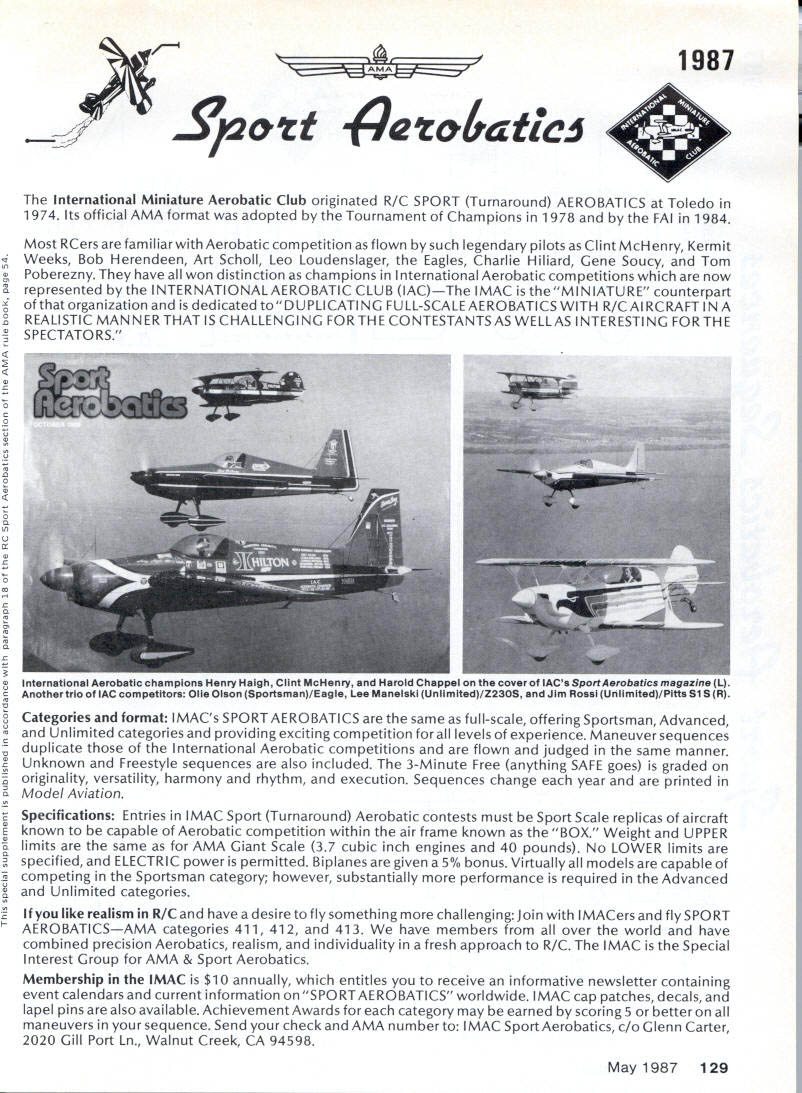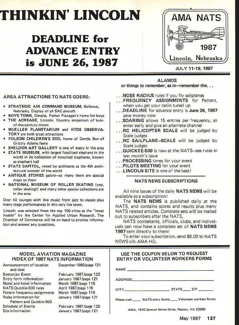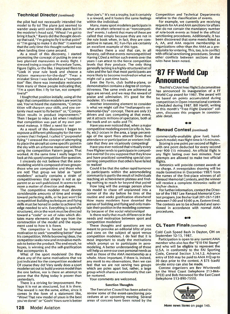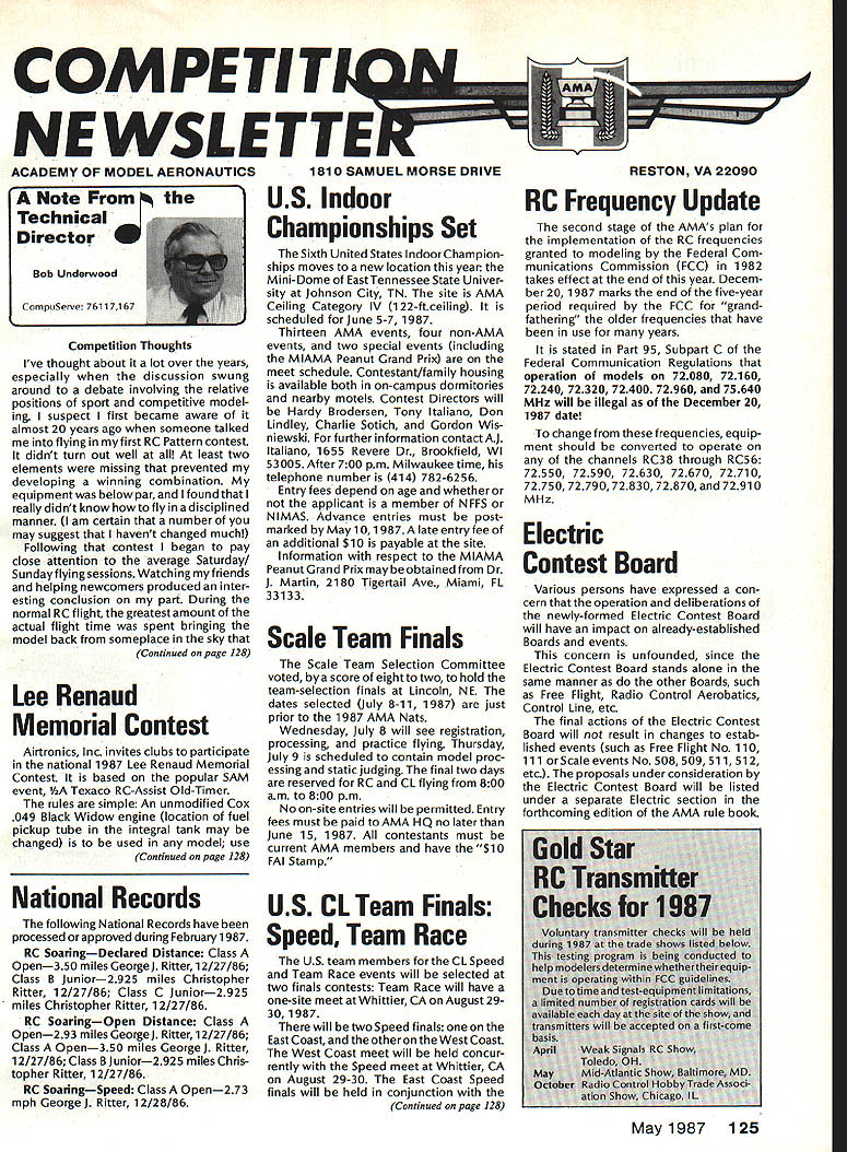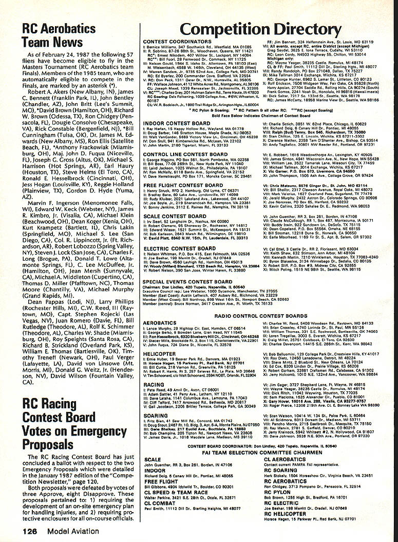 COM PET NE WSLE ACADEMY OF MODEL AERONAUTICS Note nical Director W Bob Underwood CompuServe 761171 67 Competition Thoughts Ive thought about lot over years especially discussion swung around debate involving relative positions sport competitive model ing suspect first became aware almost 20 years ago someone talked flying first RC Pattern contest didnt turn out well least two elements missing prevented developing winning combination equipment below par found really didnt know fly disciplined manner am certain number may suggest havent changed much Following contest began pay close attention average Saturday/ Sunday flying sessions Watching friends helping newcomers produced inter esting conclusion part During normal RC flight greatest amount actual flight time spent bringing model back someplace sky Continued page 128 Lee Renaud Memorial Contest Airtronics Inc invites clubs participate national 1987 Lee Renaud Memorial Contest based popular SAM event /2A Texaco RC-Assist Old-Timer rules simple An unmodified Cox 049 Black Widow engine location fuel pickup tube integral tank may changed used model use Continued page 128 National Records following National Records have processed approved during February 1987 RC SoaringDeclared Distance Class Open350 miles George Ritter 12/27/86 Class B Junior2925 miles Christopher Ritter 12/27/86 Class C Junior2925 miles Christopher Ritter 12/27/86 RC SoaringOpen Distance Class Open293 miles George J Ritter 12/27/86 Class Open350 miles George J Ritter 12/27/86 Class BJunior2925 miles Chris topher Ritter 12/27/86 RC SoaringSpeed Class Open273 mph GeorgeJ Ritter 12/28/86 1 US Indoor Championships Set Sixth United States Indoor Champion ships moves new location year Mini-Dome EastTennessee State Univer sity Johnson City TN site AMA Ceiling Category IV 122-ftceiling scheduled June 5-7 1987 Thirteen AMA events four non-AMA events two special events including MIAMA Peanut Grand Prix meet schedule Contestant/family housing available both on-campus dormitories nearby motels Contest Directors will Hardy Brodersen Tony Italiano Don Lindley Charlie Sotich Gordon Wis niewski further information contact AJ Italiano 1655 Revere Dr Brookfield WI 53005 After 700 pm Milwaukee time telephone number 414 782-6256 Entry fees depend age whether applicant member NFFS NIMAS Advance entries must post marked May 101987 late entry fee additional $10 payable site Information respect MIAMA Peanut Grand Prix may obtained Dr J Martin 2180 Tigertail Ave Miami FL 33133 Scale Team Finals Scale Team Selection Committee voted score eight two hold team-selection finals Lincoln NE dates selected July 8-11 1987 just prior 1987 AMA Nats Wednesday July 8 will see registration processing practice flying Thursday July 9 scheduled contain model proc essing static judging final two days reserved RC CL flying 800 am 800 pm No on-site entries will permitted Entry fees must paid AMA HQ no later June 15 1987 contestants must current AMA members have $10 FAI Stamp US CL Team Finals Speed Team Race US team members CL Speed Team Race events will selected two finals contests Team Race will have one-site meet Whittier CA August2930 1987 will two Speed finals East Coast other West Coast West Coast meet will held concur rently Speed meet Whittier CA August 29-30 East Coast Speed finals will held conjunction Continued page 128 RC Frequency Update second stage AMAs plan implementation RC frequencies granted modeling Federal Com munications Commission FCC 1982 takes effect end year Decem ber 20 1987 marks end five-year period required FCC grandfathering older frequencies have use years stated Part 95 Subpart C Federal Communication Regulations operation models 72080 72160 72240 72320 72400 72960 75640 MHz will illegal December 20 1987 date change frequencies equip ment should converted operate channels RC38 through RC56 72550 72590 72630 72670 72710 72750 72790 72830 72870 72910 Mz Electric Contest Board Various persons have expressed con cern operation deliberations newly-formed Electric Contest Board will have impact already-established Boards events concern unfounded since Electric Contest Board stands alone same manner other Boards such Free Flight Radio Control Aerobatics Control Line etc final actions Electric Contest Board will result changes estab lished events such Free Flight No 110 111 orScaleeventsNo508509511512 etc proposals under consideration Electric Contest Board will listed under separate Electric section forthcoming edition AMA rule book May1987 125 1810 SAMUEL MORSE DRIVERESTON VA 22090 RC Aerobatics Team News As February 24 1987 following 57 fliers have become eligible fly Masters Tournament RC Aerobatics team Finals Members 1985 team automatically eligible compete Finals marked asterisk C RobertA Akers NewAlbany IN James C Bennett Franklin Park IL John Bentley Chandler AZ John Britt Lees Summit MO *David Brown Hamilton OH Richard W Brown Odessa TX Ron Chidgey Pen sacola FL Dougie Consolvo Chesapeake VA Rick Constable Bergenfield NJ eBill Cunningham Tulsa OK Dr James M Ed wards NewAlbany MS Ron Ellis Satellite Beach FL *Anthony Frackowiak Miamis burg OH Maj John D Fuqua Niceville FL Joseph G Gross Altus OK Michael S Harrison Hot Springs AR Earl Haury Houston TX Steve Helms El Toro CA Ronald E Hesselbrock Cincinnati OH Jess Hogan Louisville KY Reggie Holland Plainview TX Gordon D Hyde Yuma AZ Marvin F Ingerson Menomonee Falls WI Edward W Keck Webster NY James R Kimbro Jr Visalia CA Michael Klein Beachwood OH Dean Koger Xenia OH Kurt Krampetz Bartlett IL Chris Lakin Springfield MO Michael S Lee San Diego CA Col R Lippincott Jr Ft Rich ardson AR Robert Lobozzo Spring Valley NY Steven J Lock San Jose CA Charles F Long Brogue PA Donald T Lowe Alta monte Springs FL C Lee McDuffee Jr Hamilton OH Jean Mersh Sunnyvale CA Michael Middleton Cupertino CA Thomas D Miller Pfafftown NC Thomas Moore Chantilly VA Michael Murphy Grand Rapids Ml Dean Pappas Lodi NJ Larry Phillips Rochester Hills Ml CW Reed Ill Ra