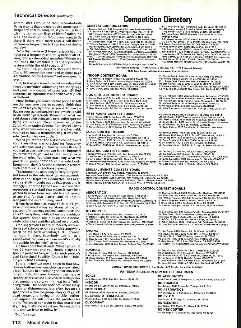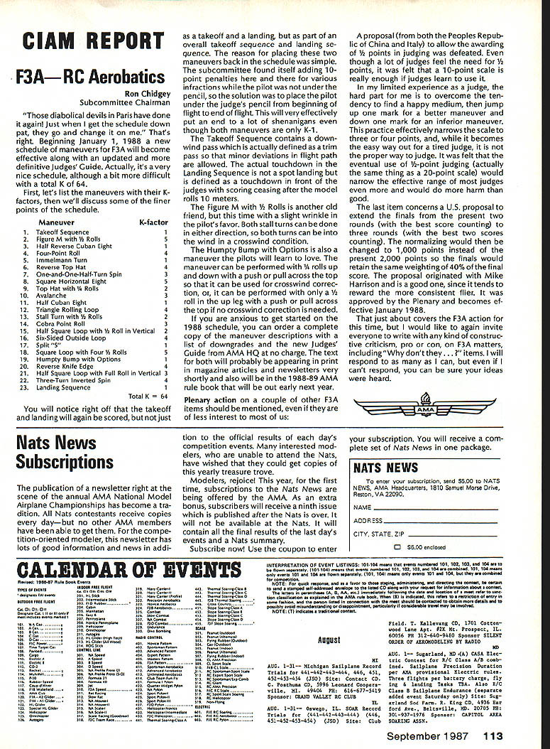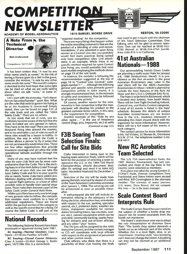 COMPE NE WSLETTE ACADEMY OF MODEL AERONAUTICS Note Technical Director W Bob Underwood CompuServe 76117167 has written rose other name smells sweet risk having literary giant 360 grave consider missive rule other name smells same months column devoted fond hope some light can shed what really talking about talk rules some stances Lets start everyday Lets-havefun-on-Saturday/Sunday sport flier What rules exist govern flying far Academy concerned Simply stated can found page 133 rule book called AMA Safety Code no others As study set rules im mediately become aware fact items included very general nature have way several thousand flying sites around country try tailor set rules sites would lesson futility addition way Code written allows person fly areas permanently established sites few other organizations provide insurance coverage yet allow wide operational latitude available through Code may have noticed rules club field far com prehensive Code excit ingfeature oftheAMASafetyCodeThrough actions club can take basic Safety Code fit specific site needs Some clubs have added pro hibitions dealing alcoholic beverages special flight patterns host other possible rules handle special situa tions rules become part Safety Code under General Rule three sportfliers have brief page very general rules follow competi tion modeler must conform host additional regulations found within general section category well specific eventthat flying course Safety Code still part National Records following National Records have processed approved during June 1987 RC SoaringThermal Duration Class Open2718 Joe Feather 5/31/87 RC SoaringClosed Course Distance Class Junior324km George L Rodri guez 10/17/86 correction required reading competitor things happen within entire modeling community product blending rules recom mendations attended sport flying session Control Line site probably would find practices being carried over competition rules Line attach ment example no specific method required sport Control Line flying would probably find sport models employing methods shown page 19 rule book essence modeler following recommendation suggested top page 18 Control Line General para graph number 1 . ough following general specific rules primarily govern competitive activity AMA events strongly recommended interests safety consistency followed control line activity course another reason com monality line connection man ufacturer will develop product greatest common factor case requirement competition Another example Rule other name e frequency control flags pins impounds etc radio Continued page 112 F3 B Soaring Team Selection Finals Call Site Bids Clubs interested being host Soaring team-selection finals will held purpose selecting team represent US 1989 F3B World Championships should document offer writing send AMA HQ attn Micheline Madison December 1 1987 Selection site will made among bids received means vote Team Selection Committee sometime after January 1 1988 winning site will announced soon possible after well-prepared site bid will include formation relating adequacy flying site size obstruction-free orientation respect sun parking spectator control etc preferred dates weather sta tistics manpower available contest duties including timers lap-counters scor ers etc contest equipment can provided community backing nearby hous ing entrants out-of-town officials other plus factors FAI jury will assigned AMA Executive Council contest manager CD will coordinate local officials respect assignment personnel other contest needs Club officers think possibility club hosting finals may want get touch chairman Team Selection Committee Don Edberg will glad answer ques tions Don can reached 81 8-3525782 home 818-354-4763 work Area code 818 California 41st Australian Nationalsi 988 aeromodeling friends Down Under planning really super Nats January 2-8 1988 midsummer pro claimed first air-event great Australian Bicentenary year Later year will ABASAustralian Bicentennial Air Showwhich planned include best features Paris Air Show USAs Oshkosh EM fly-in Nats held Richmond located near Sydney New South Wales will Free Flight including Indoor Control Line Radio Control categories total 62 events listed Nats schedule Because details unique Australian events/classes known US modelers interested attending meet should check organizers information However will full roster FAI events category contact person information Ms Val Vickers 32 Sluman St Denistone NSW 2114 telephone number 02858 4917 New RC Aerobatics Team Selected US F3A team-selection finals 1987 Masters Tournament has just con cluded three top fliers country selected members First place taken young Gordon D Chip Hyde Veteran competitors Tony Frackowiak Steve Helms second third Bill Cunningham alternate member mainstay previous US teams Dave Brown did compete time manager Scale Contest Board Interprets Rule Scale Contest Board hasjust voted subject whether bomb drop ma neuver can scored separately bomb run maneuver Boards unanimous vote adopt rule interpretation chairman Dave Platt bomb drop option demands bomb run inherent part whole Whether level flight dive lmmelmann nuclear-style toss-bombing run does change intent bombing run may claimed additional option September 1 987 111 1810 SAMUEL MORSE DRIVERESTON VA 22090 Technical Director continued control sites would uncomfortable flying site did require some type frequency control Imagine will field no transmitter flags identification no pins no impound Would want fly there half-dozen persons frequencies keep track during day Now have hope established need frequency-control system RC sites lets ask critical question rules establish frequency-control system within AMA structure RC sport flier need check Safety Code RC competitor need check page 42RadioControlGeneral andyourspecific event save sometime let relate no rules addressing frequency flags pins couple cases will find reference impounds specific event such Pattern Now be