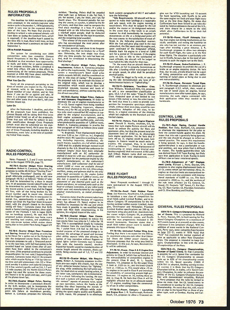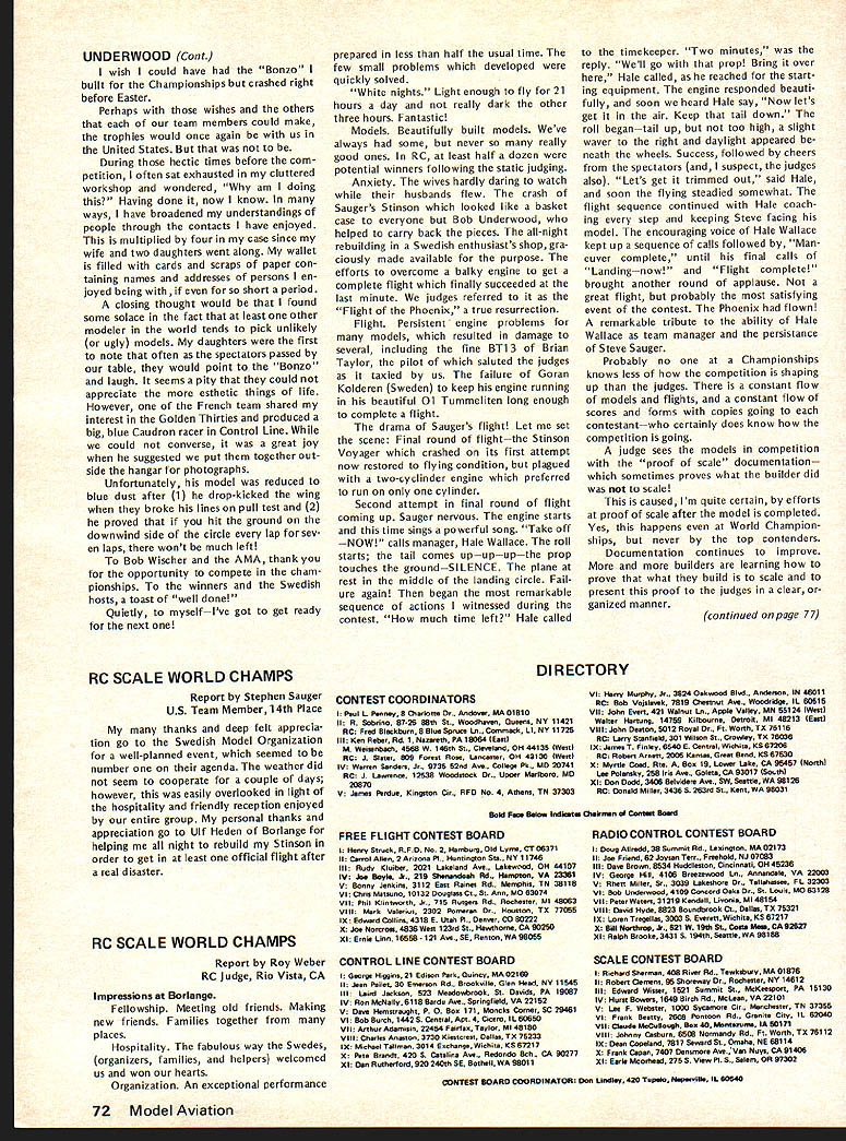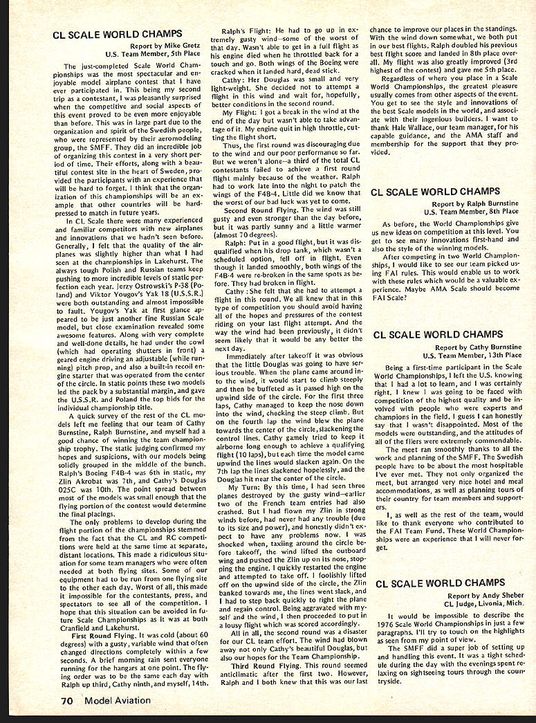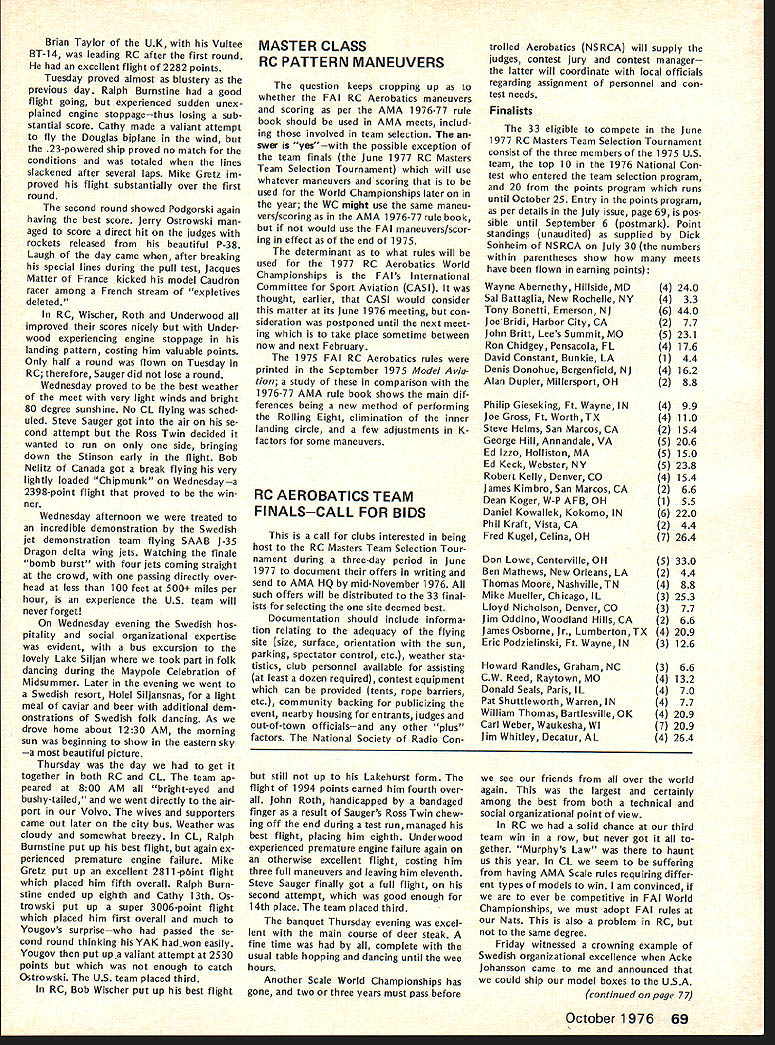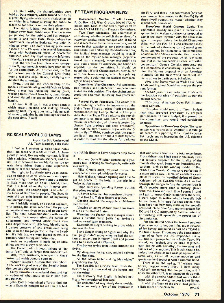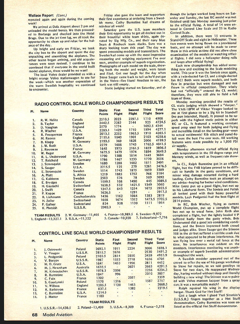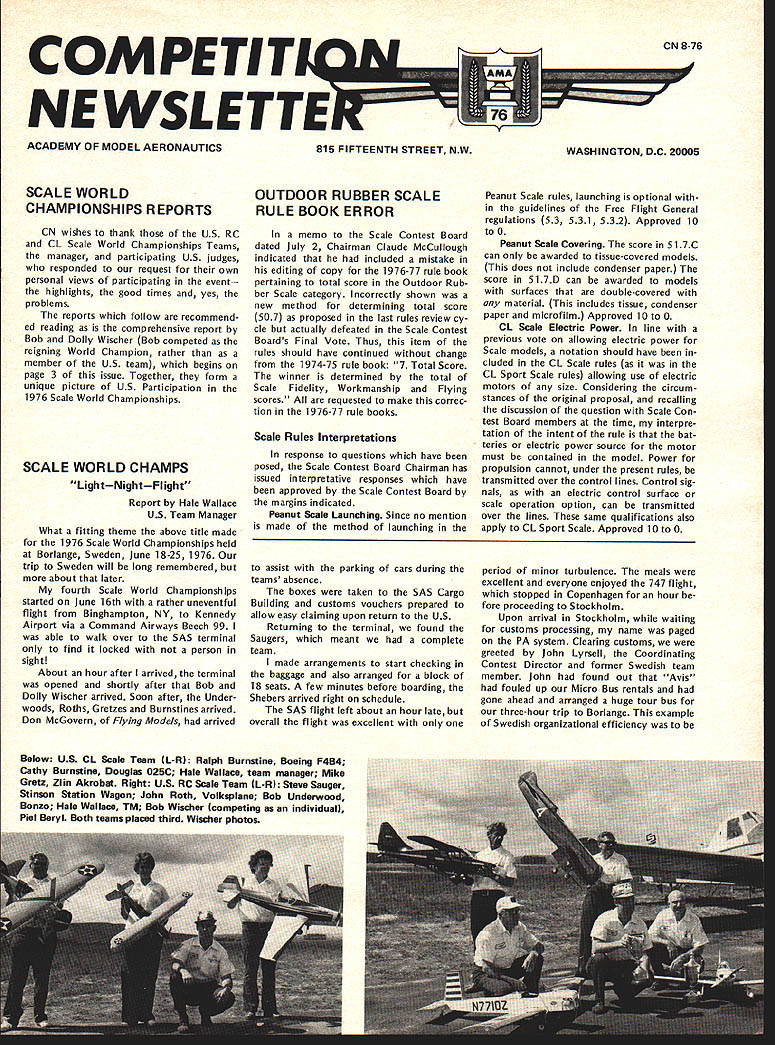 COM PETI TWIftI NE WSLETTE iF UU77W ACADEMY OF MODEL AERONAUTICS SCALE WORLD CHAMPIONSHIPS REPORTS CN wishes thank US RC CL Scale World Championships Teams manager participating US judges responded request own personal views participating event---the highlights good times yes problems reports follow recommend ed reading comprehensive report Bob Dolly Wischer Bob competed reigning World Champion rather member US team begins page 3 issue Together form unique picture US Participation 1976 Scale World Championships SCALE WORLD CHAMPS LightNightFlight Report Hale Wallace US Team Manager What fitting theme above title made 1976 Scale World Championships held Borlange Sweden June 18-25 1976 trip Sweden will long remembered about later fourth Scale World Championships started June 16th rather uneventful flight Binghampton NY Kennedy Airport via Command Airways Beech 99 able walk over SAS terminal find locked person sight About hour after arrived terminal opened shortly after Bob Dolly Wischer arrived Soon after Under woods Roths Gretzes Burnstines arrived Don McGovern Flying Models arrived 815 FIFTEENTH STREET NW OUTDOOR RUBBER SCALE RULE BOOK ERROR memo Scale Contest Board dated July 2 Chairman Claude McCullough indicated included mistake editing copy 1976-77 rule book pertaining total score Outdoor Rub ber Scale category Incorrectly shown new method determining total score 507 proposed last rules review cy cle actually defeated Scale Contest Boards Final Vote Thus item rules should have continued change 1974-75 rule book 7 Total Score winner determined total Scale Fidelity Workmanship Flying scores requested make correc tion 1976-77 rule books Scale Rules Interpretations response questions have posed Scale Contest Board Chairman has issued interpretative responses have approved Scale Contest Board margins indicated Peanut Scale Launching Since no mention made method launching assist parking cars during teams absence boxes taken SAS Cargo Building customs vouchers prepared allow easy claiming upon return US Returning terminal found Saugers meant complete team made arrangements start checking baggage also arranged block 18 seats few minutes before boarding Shebers arrived right schedule SAS flight left about hour late overall flight excellent WASHINGTON DC 20005 Peanut Scale rules launching optional guidelines Free Flight General regulations 53 531 532 Approved 10 toO Peanut Scale Covering score 517C can awarded tissue-covered models does include condenser paper score 517D can awarded models surfaces double-covered material includes tissue condenser paper microfilm Approved 10 toO CL Scale Electric Power line previous vote allowing electric power Scale models notation should have cluded CL Scale rules CL Sport Scale rules allowing use electric motors size Considering circum stances original proposal recalling discussion question Scale Con test Board members time interpre tation intent rule bat teries electric power source motor must contained model Power propulsion cannot under present rules transmitted over control lines Control sig nals electric control surface scale operation option can transmitted over lines same qualifications also apply CL Sport Scale Approved 10 0 period minor turbulence meals excellent everyone enjoyed 747 flight stopped Copenhagen hour fore proceeding Stockholm Upon arrival Stockholm waiting customs processing name paged PA system Clearing customs greeted John Lyrsell Coordinating Contest Director former Swedish team member John found out Avis fouled up Micro Bus rentals gone ahead arranged huge tour bus three-hour trip Borlange example Swedish organizational efficiency Below US CL Scale Team L-R Ralph Burnstine Boeing F4B4 Cathy Burnstine Douglas 025C Hale Wallace team manager Mike Gretz Zlin Akrobat Right US RC Scale Team 1-RI Steve Sauger Stinson Station Wagon John Roth Volkaplane Bob Underwood Bonzo Hale Wallace TM Bob Wischer competing individual Piel Beryl Both teams placed third Wischer photos CN 8-76 -w Wallace Report Con t repeated again again during coming week arrived Dala Airport about 2 pm unloaded model boxes proceed ed Borlange checked Hotel Brage Due jet time lag took opportunity clean up relax bal ance day Up bright early Friday took city bus airport spent day unpacking assembling airplanes other teams began arriving old acquain tances soon revived continue convinced everyone world built model airplanes would no wars local Volvo dealer provided us bright orange Volvo stationwagon use weekwhich another expression warm Swedish hospitality continued encounter Poland USSR Poland USSR USA Australia USSR USA France Poland England France USA France Friday also gave team supporters first experience ordering Swed ish menu Cathy Burnstine dreams reindeer week Saturday gave US team members first opportunity get decked out beautiful white team shirts again nated Sig Mfg Co navy blue Sears & Roebuck team slacks Sure sharp looking team year day spent processing models transmitters Swedes come up impressive measuring weighing equipment Ive ever seen another example superb organization Photographs model scaleshow ing both model weight taken filed Got laugh day Steve Sauger came back tell us hed put gas Volvofive liters Needless say tank still empty Static judging started Saturday al RADIO CONTROL SCALE WORLD CHAMPIONSHIPS RESULTS P1Name 1 R W Nelitz 2 B Taylor 3 D Vaughan 4 R Wischer 5 R Fouquereau 6 M Reeves 7 B Klupp 8 J W Roth 9 1 Rousseau 10 W Reger 11 RLUnderwood 12 T Reich old 13 J Stromquist 14 5 Sauger 15 E Stromquist 16 A Platt 17 G Kalderen 18 E Brydges 19 H Gautschi 20 j Swift 21 P Koppe 22 R Liehmann 23 H Zeller 24 P Gafner 25 K Plotaish TEAM RESULTS 1 Englandi 33271 Country Canada England England USA France England W Germany USA France W Germany USA W Germany Sweden USA Sweden S Africa Sweden Canada Switzerland Canada France Czechoslovakia Switzerland Switzerland USSR 2 W Germanyi 1405 3 USA1 1 1 22 StaticFirstSecond Third PointsFlightFlightFlight 25105202
