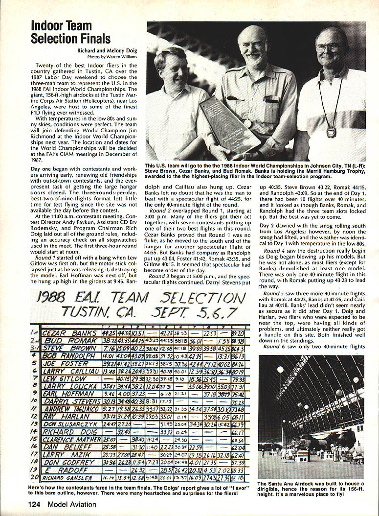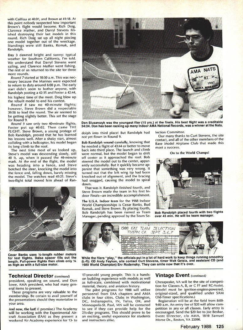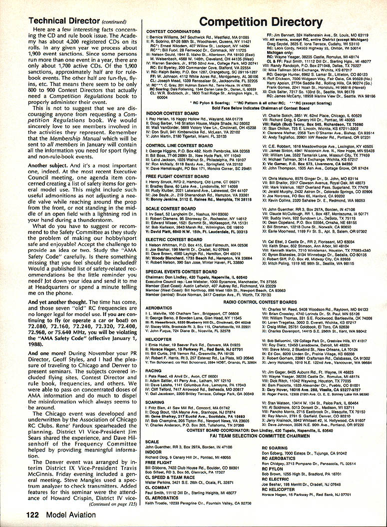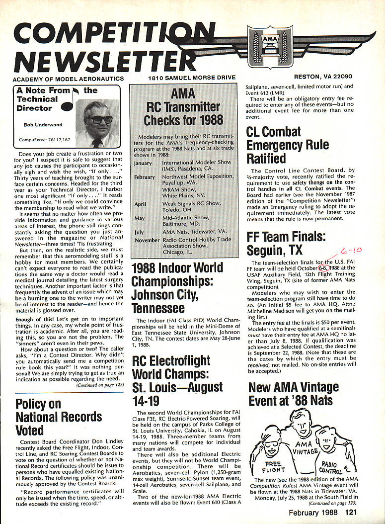 COMPE NEWSL ACADEMY OF MODEL AERONAUTICS Note Technical Director W Bob Underwood CompuServe 76117167 Does job create frustration two suspect safe suggest job causes participant occasion ally sigh wish wish Thirty years teaching brought sur face certain concerns Headed third year Technical Director harbor significant eads something like could convince membership read what write seems no matter often pro vide information guidance various areas interest phone still rings con stantly asking question just swered magazine National Newsletterthree times Tis frustrating realistic side must remember aeromodeling stuff hobby members certainly cant expect everyone read publica tions same way doctor would read medical journal detailing latest surgery techniques Another important factor frequently advent issue may burning writer may yet interest readerand hence material glossed over Enough Lets get important things case whole point frus tration academic After read ing problem 'sinners' arent pews about question two caller asks Im Contest Director didnt automatically send competition rule book year nothing per sonal simply trying get true indication possible regarding need Continued page 122 Policy National Records Voted Contest Board Coordinator Don Lindley recently asked Free Flight Indoor Con trol Line RC Soaring Contest Boards vote question whether Na tional Record certificates should issue persons have equalled existing Nation al Records following policy unani mously approved Contest Boards Record performance certificates will issued time speed alti tude exceeds existing record Indoor FAI Class FiD World Cham pionships will held Mini-Dome East Tennessee State University Johnson City TN contest dates May 28-June 1 1988 BC Electrof light World Champs St LouisAugust 14-19 second World Championships FAI Class F3E RC Electric-Powered Soaring will held campus Parks College St Louis University Cahokia IL August 14-19 1988 Three-member teams nations will compete individual team awards will also additional Electric events will World Champi onship competition will Aerobatics seven-cell Pylon 1250-gram max weight Sunrise-to-Sunset team event 14-cell Aerobatics seven-cell Sailplane Scale Two new-for-1988 AMA Electric events will also flown Event 610 Class Sailplane seven-cell limited motor run Event 612 LMR will obligatory entry fee re quired enter eventsbut no additional event fee event CL Combat Emergency Rule Ratified Control Line Contest Board 2A-majority vote recently ratified re quirement use safety thongs con trol handles CL Combat events Board earlier see November 1987 edition Competition Newsletter made Emergency ruling adopt re quirement immediately latest vote means rule now permanent FF Team Finals SeguinTX team-selection finals for_the US FAI FF team will held October-l988 USAF Auxiliary Field 12th Flight Training Wing Seguin TX site former AMA Nats competition Modelers may wish enter team-selection program still have time An initial $5 fee AMA HQ Attn Micheline Madison will get mail ing list entry fee finals $50 per event Modelers have qualified semifinals must have entry fee AMA HQ no lat er July 8 1988 qualification achieved Selected Contest deadline September 22 1988 Note dates entry must received mailed No on-site entries will accepted New AMA Vintage Event 88 Nats NVINTA&J1]\ FLIaNT IfFE__ new see 1988 edition AMA Competition Rules AMA Vintage event will flown 1988 Nats Tidewater VA Monday July 25 1988 South Field Continued page 125 February 1988 121 1810 SAMUEL MORSE DRIVE RESTON VA 22090 1 1988 Indoor World Championships Johnson City Tennessee Technical Director continued few Interesting facts concern ing CD rule book issue Acade has about 4200 registered CDs its rolls given year process about 1900 event sanctions Since some persons run event year about 1700 active CDs 1900 sanctions approximately half rulebook events other half fun-flys flyins etc means seem 800 900 Contest Directors actually need Competition Regulations book properly administer event suggest dis couraging anyone requesting Com petition Regulations book would sincerely love see members involved activities represent Remember Membership Manual will sent members January will contain information need sport flying non-rule-book events Another subject its important indeed recent Executive Council meeting agenda item con cerned creating list safety items gen eral model use might include such useful admonitions adjusting nee dle valve reaching around prop front standing mid dle open field lightning rod hand during thunderstorm What have suggest recom mend Safety Committee study problem making hobby/sport safe enjoyable Accept challenge provide idea two Study AMA Safety Code carefully something missing feel should included Would published list safety-related rec ommendations little reminder need Jot down idea send Headquarters spend minute telling phone yet another thought time has come seven old RC frequencies no longer legal model use con tinuing fly operate car boat 72080 72160 72240 72320 72400 72960 or 75640 MHz will violating AMA Safety Code effective january 1 1988 During November PR Director Geoff Styles plea sure traveling Chicago Denver present seminars subjects covered cluded flying sites Contest Director rule book frequencies others able pass concentrated doses AMA information much dispel misinformation always seems around Chicago event developed underwritten Association Chicago RC Clubs Rene Fardoux spearheaded planning District VI Vice-President Jim Sears shared experience Dave Hil senhoff Frequency Committee helped providing meaningful informa tion Denver event arranged terim District IX Vice-President Travis McGinnis Friday evening included gen eral meeting Steve Mangles used spec trum analyzer check transmitters Added features seminar attend ance Howard Crispin District IV vice Continued page 125 CONTEST COORDINATORS I Bernice Williams 347 Southwick Rd Westfield MA 01085 II A Sobrino 87-26 88th SI Woodhaven Quee