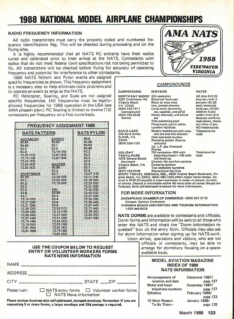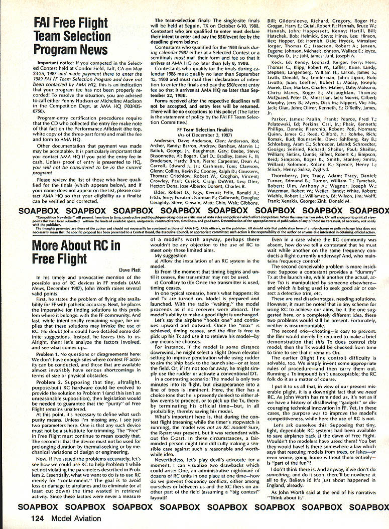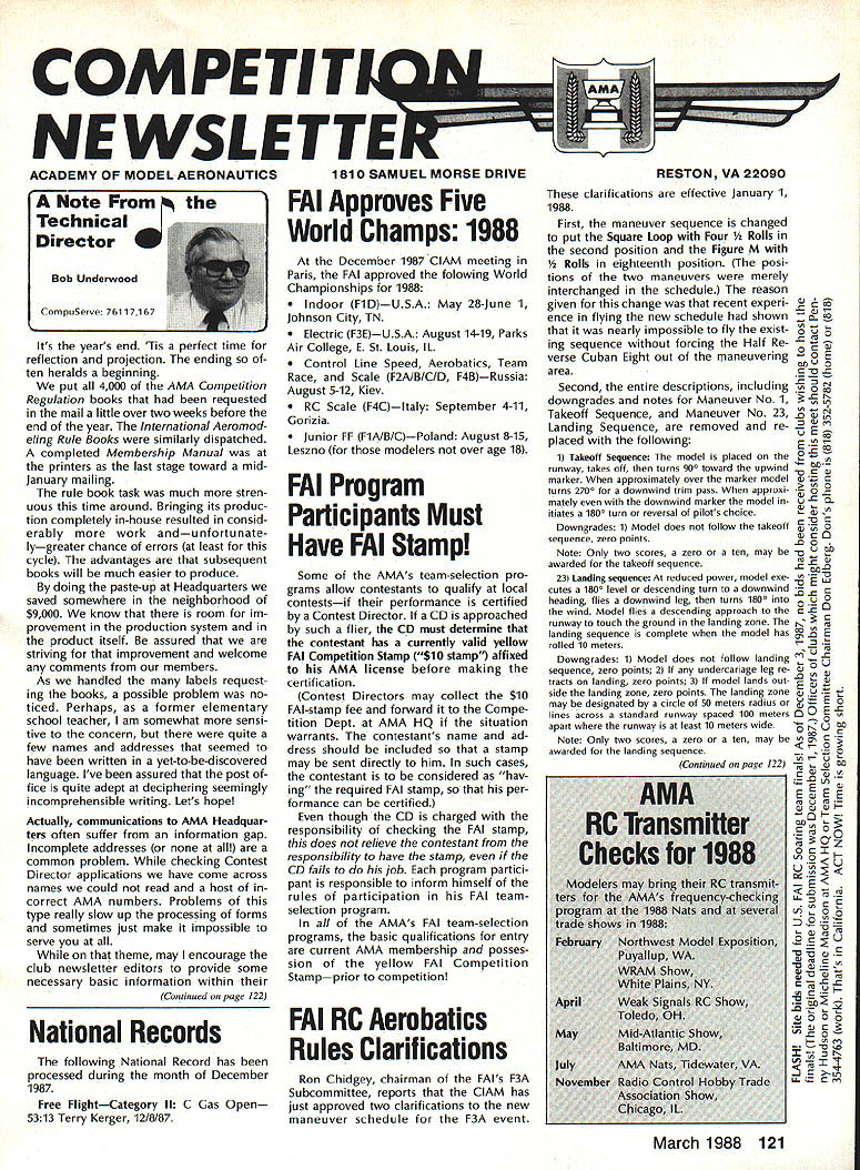 ACADEMY OF MODEL AERONAUTICS Note nical Director W Bob Underwood CompuServe 76117167 Its years end Tis perfect time reflection projection ending ten heralds beginning put 4000 AMA Competition Regulation books requested mail little over two weeks before end year International Aeromod eling Rule Books similarly dispatched completed Membership Manual printers last stage toward mid January mailing rule book task much stren uous time around Bringing its produc tion completely in-house resulted consid erably work andunfortunate lygreater chance errors least cycle advantages subsequent books will much easier produce doing paste-up Headquarters saved somewhere neighborhood $9000 know room im provement production system product itself assured striving improvement welcome comments members As handled labels req uest ing books possible problem no ticed Perhaps former elementary school teacher am somewhat sensi tive concern quite few names addresses seemed have written yet-to-be-discovered language Ive assured post fice quite adept deciphering seemingly incomprehensible writing Lets hope Actually communications AMA Headquar ters often suffer information gap Incomplete addresses common problem checking Contest Director applications have come across names could read host correct AMA numbers Problems type really slow up processing forms sometimes just make impossible serve theme may encourage club newsletter editors provide some necessary basic information within Continued page 122 National Records following National Record has processed during month December 1987 Free FlightCategory II C Gas Open 5313 Terry Kerger 12/8/87 1810 SAMUEL MORSE DRIVE i FAlApproves Five World Champs 1988 December 1987 ClAM meeting Paris FAI approved folowing World Championships 1988 Indoor F1DUSA May 28-June 1 Johnson City TN Electric F3EUSA August 14-19 Parks Air College E St Louis IL Control Line Speed Aerobatics Team Race Scale F2AIB/C/D F4BRussia August 5-12 Kiev RC Scale F4CItaly September 4-11 Gorizia Junior FF F1AIB/CPoland August 8-15 Leszno modelers over age 18 FAI Program Participants Must Have FAI Stamp Some AMAs team-selection pro grams allow contestants qualify local contestsif performance certified Contest Director CD approached such flier CD must determine contestant has currently valid yellow FAI Competition Stamp $10 stamp affixed AMA license before making certification Contest Directors may collect $10 FAI-stamp fee forward Compe tition Dept AMA HQ situation warrants contestants name ad dress should included stamp may sent directly him such cases contestant considered hav ing required FAI stamp per formance can certified though CD charged responsibility checking FAI stamp does relieve contestant responsibility have stamp CD fails job program partici pant responsible inform himself rules participation FAI teamselection program AMAs FAI team-selection programs basic qualifications entry current AMA membership posses sion yellow FAI Competition Stampprior competition FAI RC Aerobatics Rules Clarifications Ron Chidgey chairman FAIs F3A Subcommittee reports ClAM has just approved two clarifications new maneuver schedule F3A event RESTON VA 22090 clarifications effective January 1 1988 First maneuver sequence changed put Square Loop Four s second position Figure M Rolls eighteenth position posi tions two maneuvers merely interchanged schedule reason given change recent experi- flying new schedule shown o ly impossible fly exist- o u o ing sequence forcing Half Reverse Cuban Eight out maneuvering U area - econd entire descriptions including owngrades notes Maneuver No 1 akeoff Sequence Maneuver No 23 ing Sequence removed re placed following 1 Takeoff Sequence model placed runway takes off turns 900 toward upwind er approximately over marker model turns 2700 downwind trim pass approxi mately downwind marker model itiates 1800 turn reversal pilots choice C grades 11 Model does follow takeoff sequence zero points 0 U fl Note Only two scores zero ten may be- aa awarded takeoff sequence 23 Landing sequence reduced power model exe cutes 180 level descending turn downwind heading flies downwind leg turns 1800 ind Model flies descending approach - runway touch ground landing zone TherZ landing sequence complete model has olled 10 metersa Downgrades 1 Model does follow landing ence zero points 2 undercariage leg re- tracts landing zero points 31 model lands out-2 side landing zone zero points landing zone U designated circle 50 meters radius lines across standard runway spaced 100 meters 0 apart runway least 10 meters wide Note Only two scores zero ten may warded landing sequence.o 0 U inued page 122 - u a a 0 2 00 0z 2 2 2 a 2 - EM 5j000 C - 0 I cs -. C C C cs March 1988 121 Technical Director continued documents Please include least name address contact also helps include club name month publication newsletters mailed Headquarters read contain items interest Headquarters staff members marked put circulation appropriate staff-level mem bers read two occasions have wanted respond questions problems mentioned newsletter discover didnt know send letter editors provide val uable service Take pride work let modeling world know done reflecting kick consider year far radio-frequency issues concerned battle aircraft/surface fre quency use fought no illu sions war won safe say much progress made RC-frequency-related telephone calls began escalate neared end year also became clear information correct information being spread about addition panic Woe whats done titude became much less problem Modelers began see new equipment become available realized proper operational pro cedures tended negate problems everybody began relax enjoy hobby/ sport Two groups really put lot time energy respect problem area 1987 Both AMA Frequency Committee Radio Con trol industry really hustle keep up developments Now 1988 New frequencies have op ened up some manufacturers/importers have available New lines equipment al sight Clubs working hard revise fr