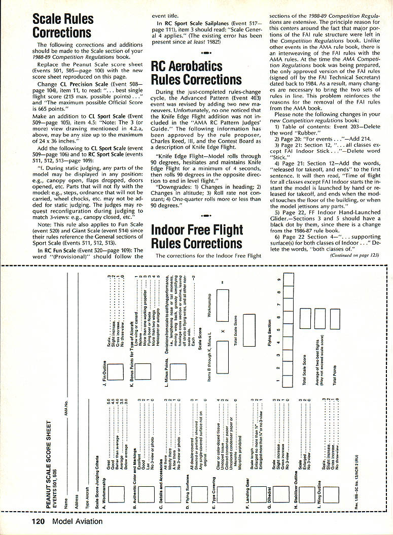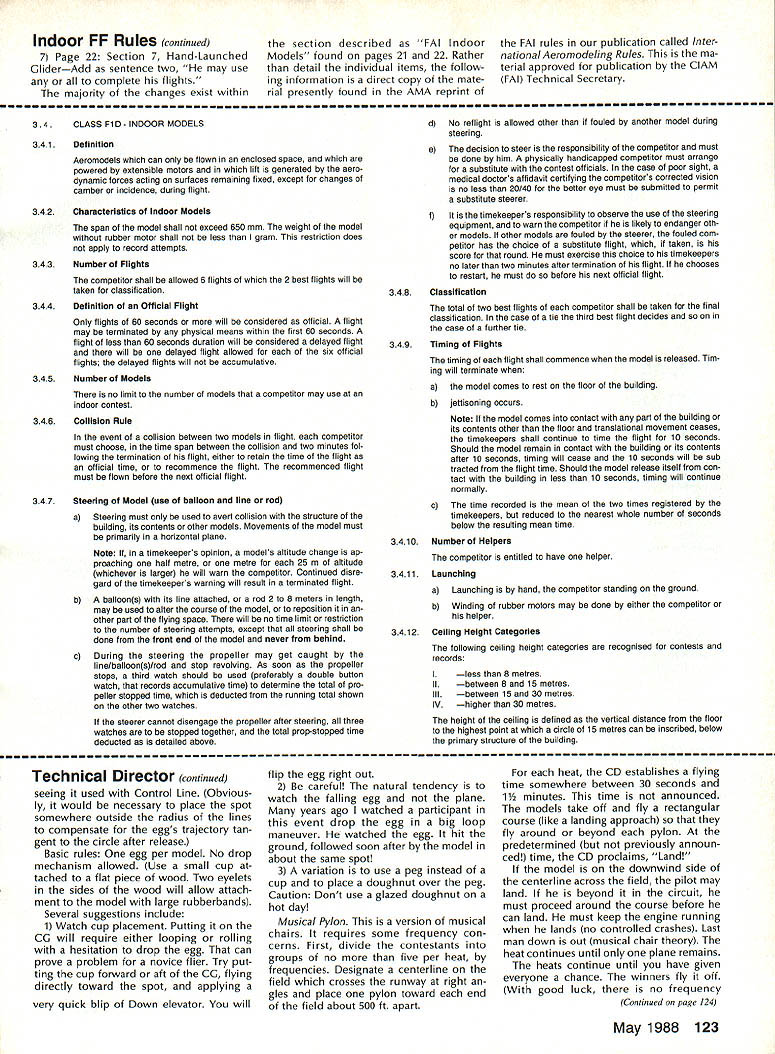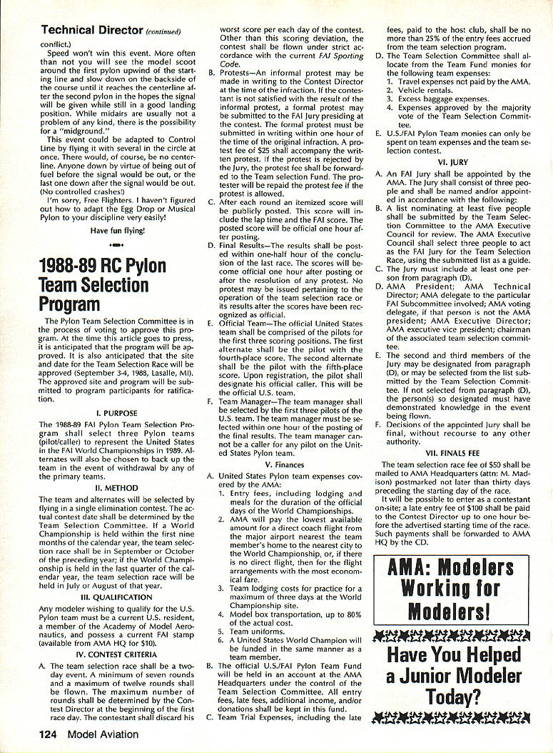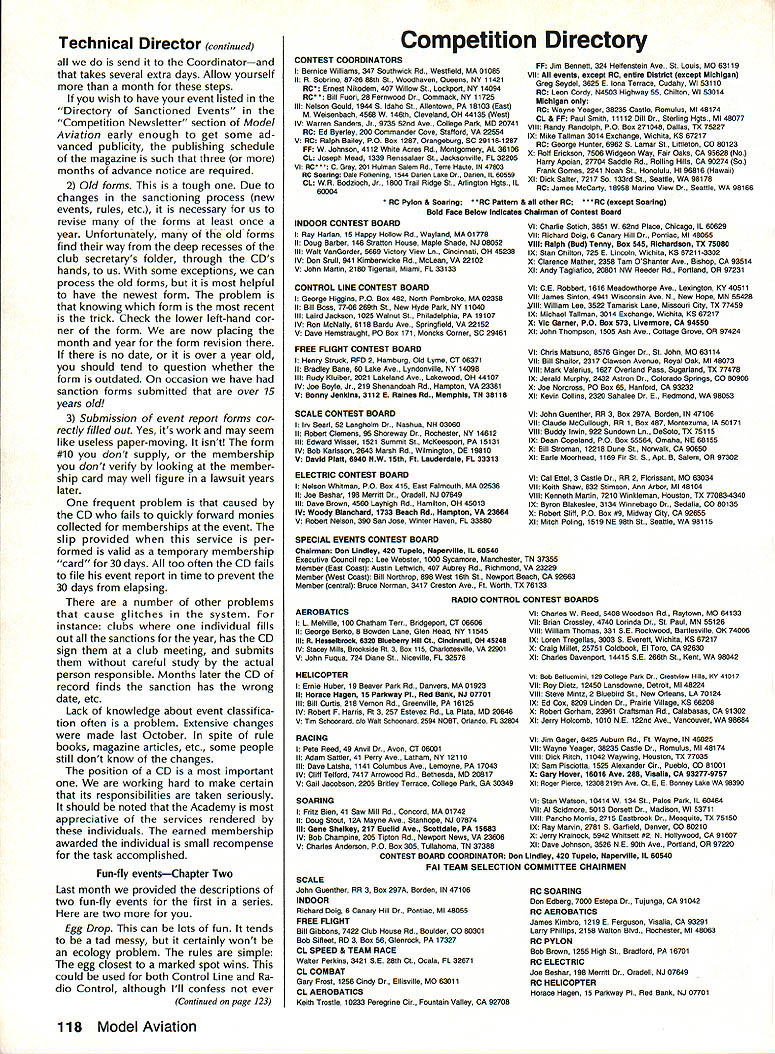 COM PETI TWIN NE WSLETTEIC ACADEMY OF MODEL AERONAUTICS 1810 SAMUEL MORSE DRIVE RESTON VA 22090 Note Technical Director Bob Underwood CompuServe 76117167 comments month center around important AMA member known CD very difficult member Academy avoid coming contact Contest Director some time though member may have no interest con tests because have become dependent services persons organize run types sanctioned events Strangely enough term Contest Director cannot found member ship portions Academys bylaws considers CD has very broad areas authority unusual instance CD can act agent Academy sign up new renewing members sanctioned event thereby granting member instant insur ance coverage Lets take closer look unlisted essential membership group Any Open member eligible become CD doing member automatically omes Leader member Academy ititled vote bylaws revisions Appli cation become CD made first ob taining form AMA Headquarters addition submitting application candidate required pass rule/Safety Code quiz minimum grade 85% obtain three references candi dates AMA district vice-president has right refusal approval application After having assumed responsibility handling applications some ways monitoring CD activity last October have become quite bit aware prob lems system Lets detail some problems 1 Lead time very common pro spective CD wait until very last mo ment apply As result find re ceive CD application sanction request membership renewal same envelope Accompanying documents will note pleading rush through cause event week af ter next Tis problem means trying track single payment through three separate ar eas responsibility lo cated AMA Headquarters form district Contest Coordinator can hasbeen done due opera tional requirements part system leaves too much room prob lems Make easier yourself HQ staff too Make certain youve renewed membership After thats done apply CD status send sanc tion request Coordinator process ing send sanction request us Continued page 118 m Electrof light World Championships second F3E World Championships will held Parks College St Louis University Cahokia IL August 15-20 1988 will also American Conti nents Championships contest August 12-16 will 7-Cell Duration Pylon Racing 7-Cell Motor Glider F3E Aerobatic F3E Standoff Scale events plus addi tional nonsanctioned events flown dur ing first Festival Electric Flight USA Entries American Continents Championships limited further information contact Cal Ettel #3 Castle Dr Florissant MO 63034 USA telephone number 314 831-5031 Lodging contestants supporters available college dormitories Off-site housing available hotels motels Lodging/meals packages available various prices contestants supporters Write Academy Model Aeronautics Attn Micheline Madison 1810 Samuel Morse Dr Reston VA 22090 USA telephone number 703 4350750 m 1988 FAI FF World Cup Program News FAIs Free Flight World Cup program enters its second year 1988 program designed recognize outstanding com petitors FAI classes FlA FiB FiC winner class determined accumulating greatest number points Open International FF competitions Al though number contests may entered three highest scores will taken added certain oth er restrictions competition open competi tors no fee required competitors contest organizers Ian Kaynes publishing periodic listing results may obtained subscrip tion $15/year address lW Kaynes 7 Ashley Rd Farnborough Hants GU14 7EZ England Ten International Open contests have selected Cup competition 1988 Max Men FA International February 13-14 Taft CA USA Holiday Ice 1988 March 26-27 Frozen Lake Mjosa Norway Pacific FF Championships April 1-4 Canowindra NSW Australia Memorial Fu lop Sandor May 20-21 Domsod Hungary Midsummernight Trophy FlA FiB June 25-26 Terlet Arnhem Netherlands Scandanavian Open July 26-27 Revinge Sweden 12th Memorial Izet Kurtalic July 30 Livno Yugoslavia International Days Poitou August 19-21 Thouars France 19th Fifel Pokal August 27-29 Zulpich FR Germany 12th Sierra Cup October 15-16 Sacramento CA USA m Foxberg CL Racing Unofficial 88 Nats Event Sky Lancers Washington SLOW club will sponsor unofficial CL Racing event 1988 Nats Foxberg will flown Wednesday July 27 will awards merchandise trophies prizes AMA CL Racing Unified Rules apply modifications Basically model must stock Carl Goldberg Models Shoestring Cosmic Wind Buster kit scratch-built match kit plans powered stock Fox 35 Stunt engine two-oz Sullivan plas tic tank Standard 10%-nitro fuel will sup plied organizers complete set rules send SASE Sky Lancers Washington 11004 Harding Rd Laurel MD 20707 May1988 117 National Records No new National Records have pro cessed during month February 1988 AMA AC Transmitter Checks 1988 Modelers may bring RC transmit ters AMAs frequency-checking program 1988 Nats several trade shows 1988 AprilWeak Signals RC Show Toledo OH IMS Show Atlanta GA MayMid-Atlantic Show Baltimore MD JulyAMA Nats Tidewater VA NovemberRadio Control Hobby Trade Association Show Chicago IL Technical Director continued send Coordinatorand takes several extra days Allow yourself month steps wish have event listed Directory Sanctioned Events Competition Newsletter section Model Aviation early enough get some ad vanced publicity publishing schedule magazine such three months advance notice required 2 Old forms tough Due changes sanctioning process new events rules etc necessary us revise forms least once year Unfortunately old forms find way deep recesses club secretarys folder through CDs hands us some exceptions can process old forms helpful have newest form problem knowing form recent trick Check lower left-hand cor ner form now placing month year form revision there no date over year old should tend question whether form outdated occasion have sanction forms submitted over 15 years old 3 Submission event report forms cor rectly filled out Yes its work may seem like useless paper-moving isnt form #10 dont supply membership dont verify looking member ship card may wel