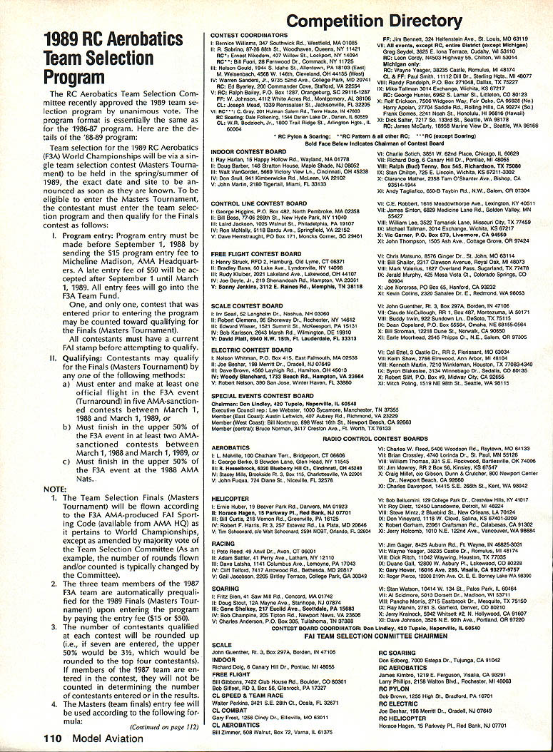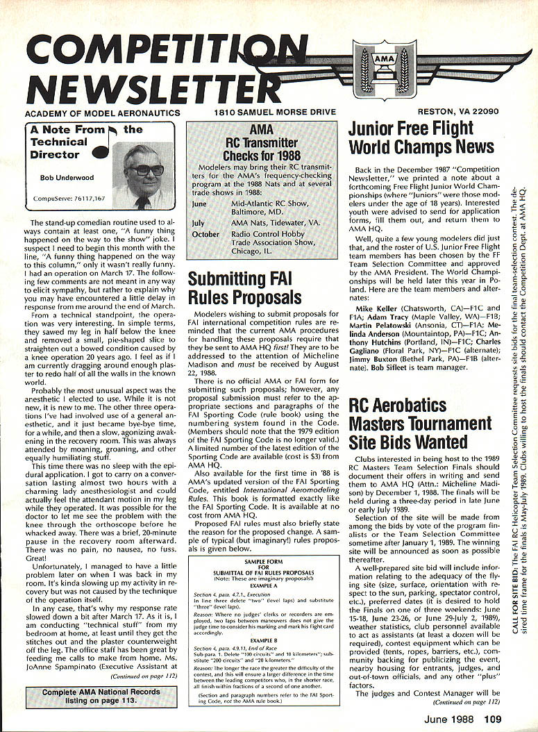 COMPE NEWSL ACADEMY OF MODEL AERONAUTICS Note Technical Director W Bob Underwood CompuServe 76117167 stand-up comedian routine used al ways contain least funny thing happened way show joke suspect need begin month line funny thing happened way column wasnt really funny operation March 17 follow ing few comments meant way elicit sympathy rather explain may have encountered little delay response around end March technical standpoint opera tion very interesting simple terms sawed leg half below knee removed small pie-shaped slice straighten out bowed condition caused knee operation 20 years ago feel am currently dragging around enough plas ter redo half walls known world Probably unusual aspect anesthetic elected use new new other three opera tions Ive involved use general esthetic just became bye-bye time slow agonizing awak ening recovery room always attended moaning groaning other equally humiliating stuff time no sleep epi dural application got carry conver sation lasting almost two hours charming lady anesthesiologist could actually feel attendant motion leg operated possible doctor let see problem knee through orthoscope before whacked away brief 20-minute pause recovery room afterward no pain no nausea no fuss Great Unfortunately managed have little problem later back room Its kinda slowing up activity re covery caused technique operation itself case thats response rate slowed down bit after March 17 As am conducting technical stuff bedroom home least until get stitches out plaster counterweight off leg office staff has great feeding calls make home Ms JoAnne Spampinato Executive Assistant Continued page 112 Modelers wishing submit proposals FAI international competition rules re minded current AMA procedures handling proposals require sent AMA HQ first addressed attention Micheline Madison must received August 22 1988 no official AMA FAI form submitting such proposals however proposal submission must refer ap propriate sections paragraphs FAI Sporting Code rule book using numbering system found Code Members should note 1979 edition FAI Sporting Code no longer valid limited number latest edition Sporting Code available cost $3 AMA HQ Also available first time 88 AMAs updated version FAI Sporting Code entitled International Aeromodeling Rules book formatted exactly like FAI Sporting Code available no cost AMA HQ Proposed FAI rules must also briefly state reason proposed change sam ple typical imaginary rules propos als given below Back December 1987 Competition Newsletter printed note about forthcoming Free Flight Junior World Cham pionships Juniors mod elers under age 18 years Interested youth advised send application forms fill out return AMA HQ Well quite few young modelers did just roster US Junior Free Flight team members has chosen FF Team Selection Committee approved AMA President World Champi onships will held later year Po land team members alter nates Mike Keller Chatsworth CAF1C FlA Adam Tracy Maple Valley WAF1B Martin Pelatowski Ansonia CTF1A linda Anderson Mountaintop PAF1C An thony Hutchins Portland INF1C Charles Gagliano Floral Park NYF1C alternate jimmy Buxton Bethel Park PAF1B alter nate Bob Sifleet team manager RC Aerobatics Masters Tournament Site Bids Wanted Clubs interested being host 1989 RC Masters Team Selection Finals should document offers writing send AMA HQ Attn Micheline Madi son December 11988 finals will held during three-day period late June early July 1989 Selection site will made among bids vote program fin alists Team Selection Committee sometime after January 1 1989 winning site will announced soon possible thereafter well-prepared site bid will include infor mation relating adequacy fly ing site size surface orientation re spect sun parkin spectator control etc preferred dates desired hold Finals three weekends June 15-18 June 23-26 June 29-July 2 1989 weather statistics club personnel available act assistants least dozen will required contest equipment can provided tents ropes barriers etc com munity backing publicizing event nearby housing entrants judges out-of-town officials other plus factors judges Contest Manager will Continued page 112 June 1988 109 1810 SAMUEL MORSE DRIVERESTON VA 22090 Junior Free Flight World Champs News Submitting FAI Rules Proposals V 51 a- rn C 0- U U0 ac 90 - 5 U -C U 0 _ 0 a0 at a0 50 0 a 0 E0 2 o on US C CU U 0 uE Ut u OE -J - SAMPLE FORM FOR SUBMITTAL OF FAI RULES PROPOSALS Note imaginary proposals EXAMPLE Section 4 para 471 Execution line three delete two level laps substitate three level laps Reason Where no judges clerks recorders em ployed two laps between maneuvers does give judge time consider marking mark flight card accordingly EXAMPLE B Section 4 para 49 tt End Race Sub para 1 Delete 100 circuits 10 kilometers sub stitute 200 circuits 20 kilometers Reason The longer race greater difficulty contest will ensure larger difference time between leading competitors shorter race finish within fractions second another Section paragraph numbers refer FAI Sport log Code nor AMA rule book 1989 RC Aerobatics Team Selection Program RC Aerobatics Team Selection Com mittee recently approved 1989 team se lection program unanimous vote program format essentially same 1986-87 program de tails 88-89 program Team selection 1989 RC Aerobatics F3A World Championships will via sin gle team selection contest Masters Tourna ment held spring/summer 1989 exact date site nounced soon known eligible enter Masters Tournament contestant must enter team selec tion program qualify Finals contest follows I Program entry Program entry must made before September 1 1988 sending $15 program entry fee Micheline Madison AMA Headquart ers late entry fee $50 will ac cepted after September 1 until March 1 1989 entry fees will go F3A Team Fund contest entered prior entering program may counted toward qualifying Finals Masters Tournament contestants must have current FAI stamp before attempting qualify II Qualifying Contestants may qualify Finals Ma