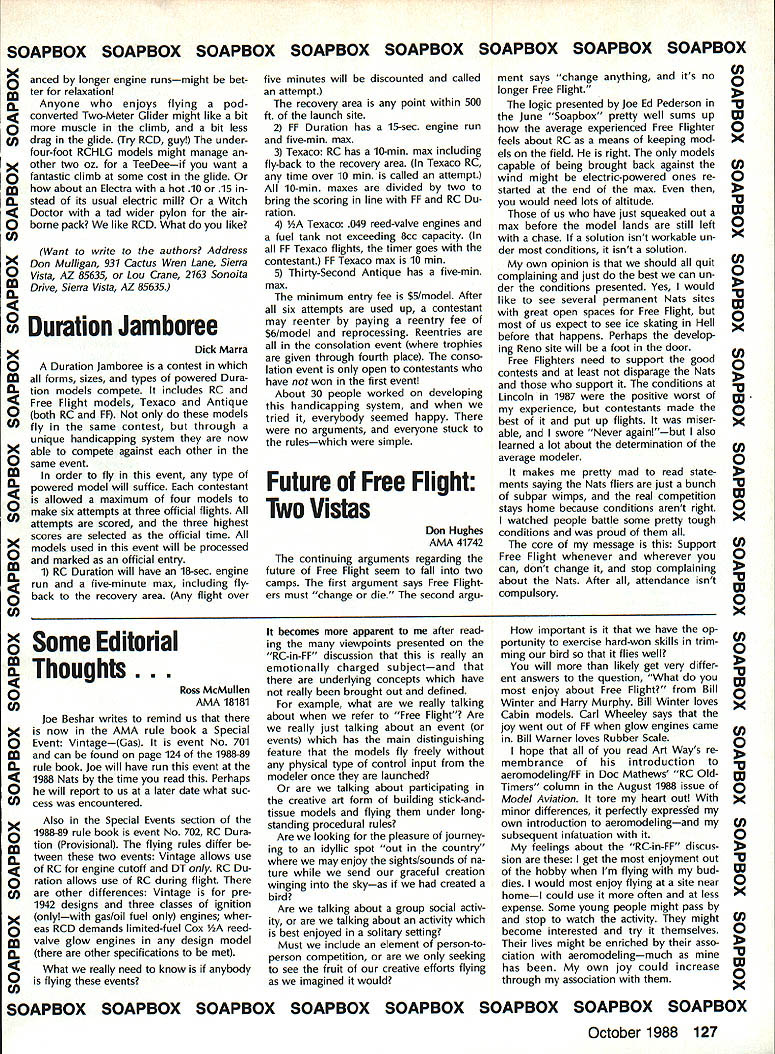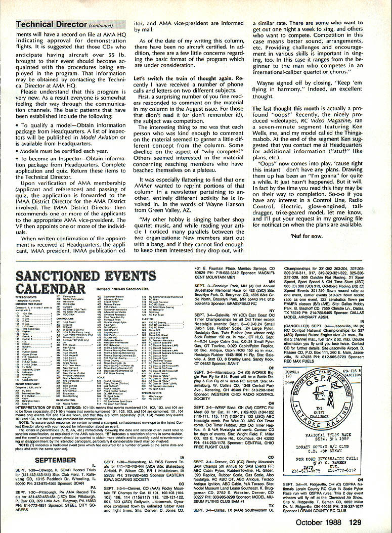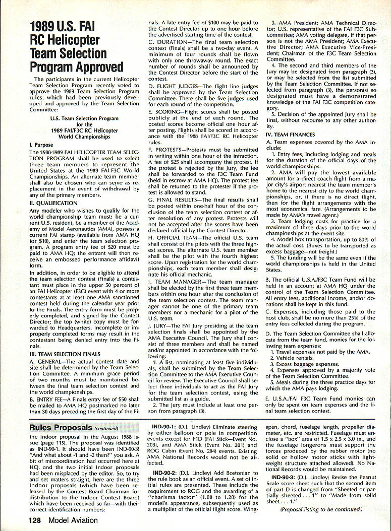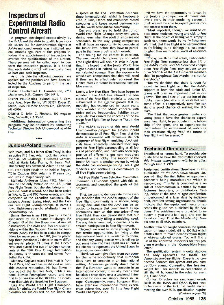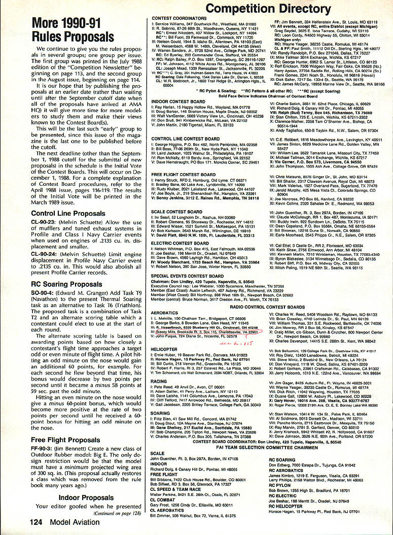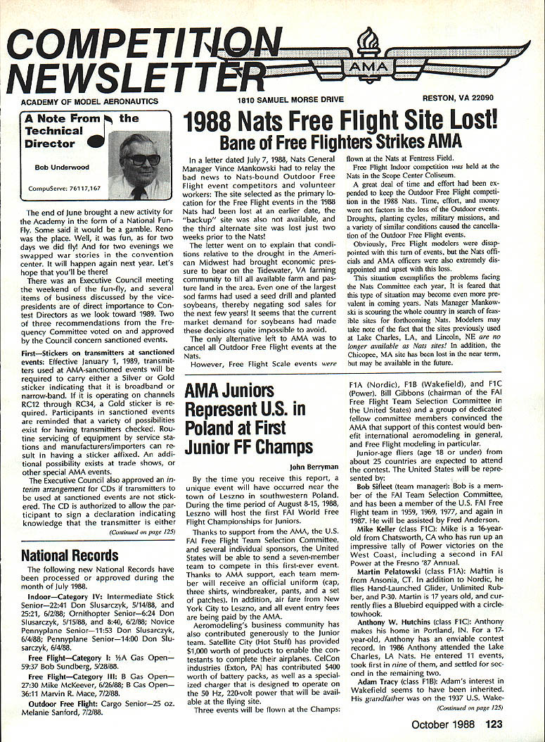 Z hP5U COMPETI TOtII NEWSLETTEFU- ACADEMY OF MODEL AERONAUTICS Note Technical Director W Bob Underwood CompuServe 761171 67 end June brought new activity Academy form National FunFly Some said would gamble Reno place Well fun two days did fly two evenings swapped war stories convention center will happen again next year Lets hope youll Executive Council meeting weekend fun-fly several items business discussed vicepresidents direct importance Con test Directors look toward 1989 Two three recommendations Fre quency Committee voted approved Council concern sanctioned events FirstStickers transmitters sanctioned events Effective January 1 1989 transmit ters used AMA-sanctioned events will required carry either Silver Gold sticker indicating broadband narrow-band operating channels RC12 through RC34 Gold sticker re quired Participants sanctioned events reminded variety possibilities exist having transmitters checked Rou tine servicing equipment service sta tions manufacturers/importers can re sult having sticker affixed An addi tional possibility exists trade shows other special AMA events Executive Council also approved terim arrangement CDs transmitters used sanctioned events stick ered CD authorized allow par ticipant sign declaration indicating knowledge transmitter either Conlinued page 12S National Records following new National Records have processed approved during month July 1988 IndoorCategory IV Intermediate Stick Senior2241 Don Slusarczyk 5/14/88 2521 6/2/88 Ornithopter Senior624 Don Slusarczyk 5/15/88 840 6/2/88 Novice Pennyplane Senior1153 Don Slusarczyk 6/4/88 Pennyplane Senior1400 Don Slu sarczyk 6/4/88 Free FlightCategory 1/2A Gas Open 5937 Bob Sundberg 5/28/88 Free FlightCategory III B Gas Open 2730 Mike McKeever 6/26/88 B Gas Open 3611 Marvin R Mace 7/2/88 Outdoor Free Flight Cargo Senior25 oz Melanie Sanford 7/2/88 1810 SAMUEL MORSE DRIVE RESTON VA 22090 11988 Nats Free Flight Site Lost Bane Free Flighters Strikes AMA letter dated July 7 1988 Nats General Manager Vince Mankowski relay bad news Nats-bound Outdoor Free Flight event competitors volunteer workers site selected primary lo cation Free Flight events 1988 Nats lost earlier date backup site also available third alternate site lost just two weeks prior Nats letter went explain condi tions relative drought Ameri can Midwest brought economic pres sure bear Tidewater VA farming community till available farm pas ture land area largest sod farms used seed drill planted soybeans thereby negating sod sales next few years seems current market demand soybeans made decisions quite impossible avoid alternative left AMA cancel Outdoor Free Flight events Nats However Free Flight Scale events AMA Juniors Represent US Poland First Junior FF Champs John Berryman time receive report unique event will have occurred near town Leszno southwestern Poland During time period August 8-15 1988 Leszno will host first FAI World Free Flight Championships Juniors Thanks support AMA US FAI Free Flight Team Selection Committee several individual sponsors United States will able send seven-member team compete first-ever event Thanks AMA support team mem ber will receive official uniform cap three shirts windbreaker pants set patches addition air fare New York City Leszno event entry fees being paid AMA Aeromodelings business community has also contributed generously Junior team Satellite City Hot Stuff has provided $1000 worth products enable con testants complete airplanes CelCon ihdustries Exton PA has contributed $400 worth battery packs well special ized charger designed operate 50 Hz 220-volt power will avail able flying site Three events will flown Champs flown Nats Fentress Field Free Right Indoor competition held Nats Scope Center Coliseum great deal time effort ex pended keep Outdoor Free Right competi tion 1988 Nats Time effort money factors loss Outdoor events Droughts planting cycles militaty missions variety similar conditions caused cancella tion Outdoor Free Right events Obviously Free Flight modelers disap pointed turn events Nats offi cials AMA officers also extremely dis appointed upset loss situation exemplifies problems facing Nats Committee year feared type situation may become pre valent coming years Nats Manager Mankow ski scouring whole country search feas ible sites forthcoming Nats Modelers may take note fact sites previously used Lake Charles LA Lincoln NE no longer available Nats Sites lii addition Chicopee MA site has lost near term may available future FlA Nordic FiB Wakefield FiC Power Bill Gibbons chairman FAI Free Flight Team Selection Committee United States group dedicated fellow committee members convinced AMA support contest would ben efit international aeromodeling general Free Flight modeling particular Junior-age fliers age 18 under about 25 countries expected attend contest United States will repre sented Bob Sifleet team manager Bob mem ber FAI Team Selection Committee has member US FAI Free Flight team 1959 1969 1977 again 1987 will assisted Fred Anderson Mike Keller class FiC Mike 16-yearold Chatsworth CA has run up impressive tally Power victories West Coast including second FAI Power Fresno 87 Annual Martin Pelatowski class FlA Maltin Ansonia CT addition Nordic flies Hand-Launched Glider Unlimited Rub ber P-30 Martin 17 years old cur rently flies Bluebird equipped circle towhook Anthony W Hutchins class FiC Anthony makes home Portland IN 17year-old Anthony has enviable contest record 1986 Anthony attended Lake Charles LA Nats entered 11 events took first nine settled sec ond remaining two Adam Tracy class FiB Adams interest Wakefield seems have inherited grandfather 1937 US Wake Continued page 125 October 1988 123 Competition Directory 1990-91 Rules Proposals continue give rules propos als several groups group per issue first group printed July 1988 edition Competition Newsletter ginning page 113 second group August issue beginning page 114 hope publishing pro posals earlier date rather waiting until a