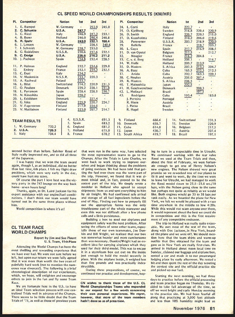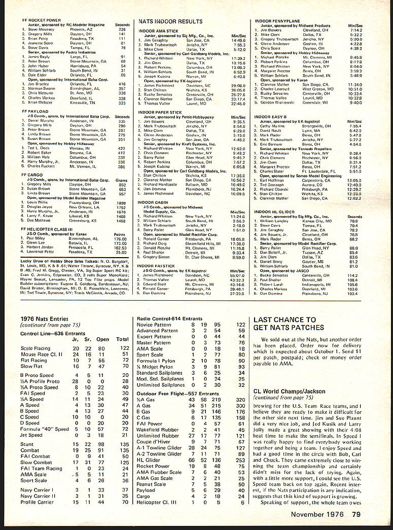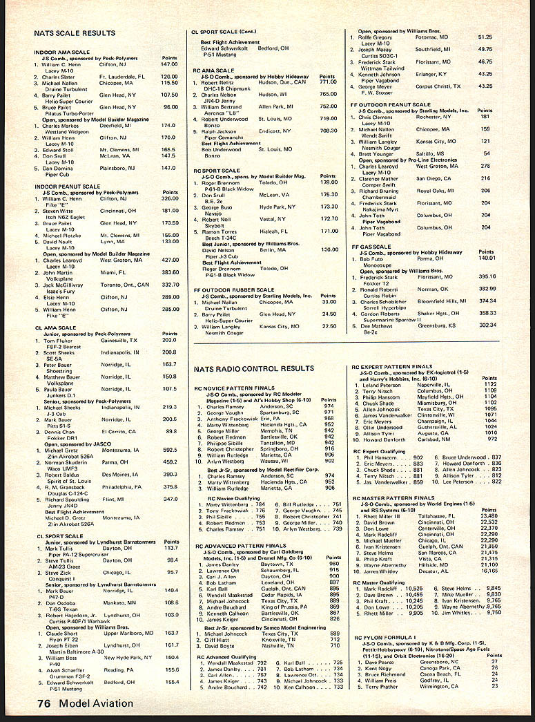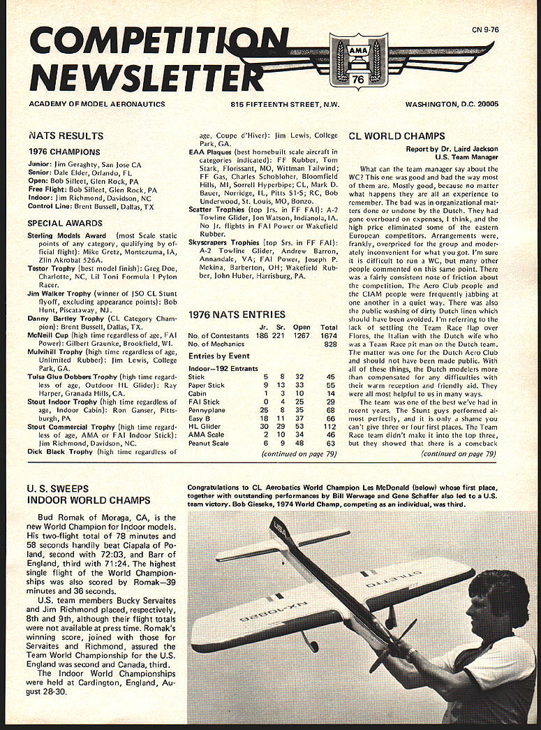 NATS RESULTS 1976 CHAMPIONS Junior Jim Geraghty San Jose CA Senior Dale Elder Orlando FL Open Bob Sifleet Glen Rock PA Free Flight Bob Sifieet Glen Rock PA Indoor Jim Richmond Davidson NC Control Line Brent Busseli Dallas TX SPECIAL AWARDS Sterling Models Award Scaie static points category qualifying ficial flight Mike Gretz Montezuma IA Zlin Akrobat 526A Testor Trophy best model finish Greg Doe Charlotte NC Lii Toni Formula Pylon Racer Jim Walker Trophy winner iSO CL Stunt flyoff excluding appearance points Bob Hunt Piscataway NJ Danny Bartley Trophy CL Category Cham pion Brent Bussell Dallas TX McNeilI Cup high time regardless age FAI Power Gilbert Graunke Brookfield WI Mulvihill Trophy high time regardless age Unlimited Rubber Jim Lewis College Park GA Tulsa Glue Dobbers Trophy high time regard less age Outdoor HL Glider Ray Harper Granada Hills CA Stout Indoor Trophy high time regardless age Indoor Cabin Ron Ganser Pitts burgh PA Stout Commercial Trophy high time regard less age AMA FAI Indoor Stick Jim Richmond Davidson NC Dick Black Trophy high time regardless age Coupe dHiver Jim Lewis College Park GA EAA Plaques best homebuilt scale aircraft categories indicated FF Rubber Tom Stark Florissant MO Wittman Taliwind FF Gas Charles Schobloher Bloomfield Hills Ml Sorreil Hyperbipe CL Mark D Bauer Norridge IL Pitts S1-S RC Bob Underwood St Louis MO Bonzo Scatter Trophies top irs FE FAI A-2 Towline Glider Jon Watson Indianola IA No Jr flights FAI Power Wakefield Rubber Skyscrapers Trophies top Srs FE FAI A-2 Towline Glider Andrew Barron Annandale VA FAI Power Joseph P Mekina Barberton OH Wakefield Rub ber John Huber Harrisburg PA 1976 NATS ENTRIES Jr Sr Open No Contestants 1862211267 No Mechanics Entries Event Indoori 92 Entrants Stick Paper Stick Cabin FAI Stick Pen nyplane Easy B HL Glider AMA Scale Peanut Scale 5832 91333 1310 0425 25835 181137 302953 21034 6948 continued page 79 CL WORLD CHAMPS Report Dr Laird Jackson US Team Manager What can team manager say about WC good bad way Mostly good because no matter what happens experience remember bad organizational mat ters done undone Dutch gone overboard expenses think high price eliminated some eastern European competitors Arrangements frankly overpriced group moder ately inconvenient what got Im sure difficult run WC other people commented same point fairly consistent note friction about competition Acm Club people ClAM people frequently jabbing another quiet way also public washing dirty Dutch linen should have avoided Im referring Total lack settling Team Race flap over 1674 Flores Italian Dutch wife 828 Team Race pit man Dutch team matter Dutch Acro Club should have made public things Dutch modelers 45than compensated difficulties 55their warm reception friendly aid 14were helpful us ways 29 best weve 68recent years Stunt guys performed al 66most perfectly shame 112cant give three four first places Team 46Race team didnt make top three 63but showed comeback continued page 79 U S SWEEPS INDOOR WORLD CHAMPS Bud Romak Moraga CA new World Champion Indoor models two-flight total 78 minutes 58 seconds handily beat Ciapala Po land second 7203 Barr England third 7124 highest single flight World Champion ships also scored Romak39 minutes 36 seconds US team members Bucky Servaites Jim Richmond placed respectively 8th 9th although flight totals available press time Romaks winning score joined Servaites Richmond assured Team World Championship US England second Canada third Indoor World Championships held Cardington England Au gust 28-30 NEWSLET ACADEMY OF MODEL AERONAUTICS815 FIFTEENTH STREET NWWASHINGTON DC 20005 Congratulations CL Aerobatics World Champion Les McDonald below first place together outstanding performances Bill Werwage Gene Schaffer also led US team victory Bob Gieseke 1974 World Champ competing individual third NATS SCALE RESULTS INDOOR AMA SCALE J-S Comb sponsored Peck-Polymers 1William C HennClifton NJ Lacey M-10 2Charles SlaterFt Lauderdale FL 3Michael NallenChicopee MA Druine Turbulent 4Barry PalletGlen Head NY Hello-Super Courier 5Bruce PailetGlen Head NY Pilatus Turbo-Porter Open sponsored Model Builder Magazine 1Charles MarkosDeerfield Ml Westland Widgeon 2William HennClifton NJ Lacey M-1C 3Edward StollMt Clemens Ml 4Don SrullMcLean VA Lacey M-10 5Dan DominaPlainshoro NJ Piper Cub INDOOR PEANUT SCALE 1-S Comb sponsored Peck-Polymers 1William C HennClifton NJ Pike E 2Steven WitteCincinnati OH Itoh NBZ Eaglet 3Bruce PalletGlen Head NY Lacey M-10 4Michael PlotzkeMt Clemens Ml 5David NaultLynn MA Lacey M-10 Open sponsored Model Builder Magazine 1Charles LearoydWest Oroton MA Lacey M-10 2John MartinMiami FL Volksplane 3Jack McOillinrayToronto Ott CAN lsaacs Fury 4Elsie HeonClifton NJ Lucey M-10 5William HennClifton NJ Fike 8 CL AMA SCALE Junior sponsored 1Tom Pluker F8P-2 Bearcat 2Scoff Sheeks SE-SA 3Peter Bauer Shoestring 4Matthew Bauer Volksplane 5Paula Bauer Junkers D1 Peck-Polymers Gainesville TX Indianapolis IN Norridge IL Norridge IL Norridge IL Senior sponsored Peck-Polymers 1Michael SheeksIndianapolis IN J-3 Cub 2Murk BauerNorridge IL Piffs 51-S 3Detnis ChatEl Cerrito CA Fokker DRi Open sponsored JASCO 1Michael OreteMontnzuma IA ZIlo Akrobat 526A 2Norman SkuderiePurina OH Waco UMF3 3Robert BaldusDes Moines IA Spirit St Louis 4R M GransbackPhiladelphia PA Douglas C-124-C 5Richard SpauldiegFlint Ml Jenny JN4D Best Plight Achievement Michael D GrttzMontezuma IA ZIle Akrobat 526A CL SPORT SCALE Junior sponsored Lyndhurst Baromormers 1Mark TullisDayton OH Piper PA-12 Supercruiser 2Steve TalusDayton OH AM-23 Grace 3Steve ZickChicago IL Conquest Senior sponsored Lyodhuret Earestormers 1Mark BuuerNorridge IL P47-0 2Dat DsdobaMuekato MN T-60 Tenan 3Robert Hagedore JrLyndhurst OH Curtiss P-40F11 Warhawk Open sponsored Williams Bros 1Claude ShortUpper Marlboro MD Ryat PT 22 2Joseph ElbenLyodhurns OH Martin Baltimore A-3D 3William BossNew Hyde Park NY P-40 4Alvah SchuefferReading PA Grumman F3F-2 5Edward SchwerkoltBedford OH P
