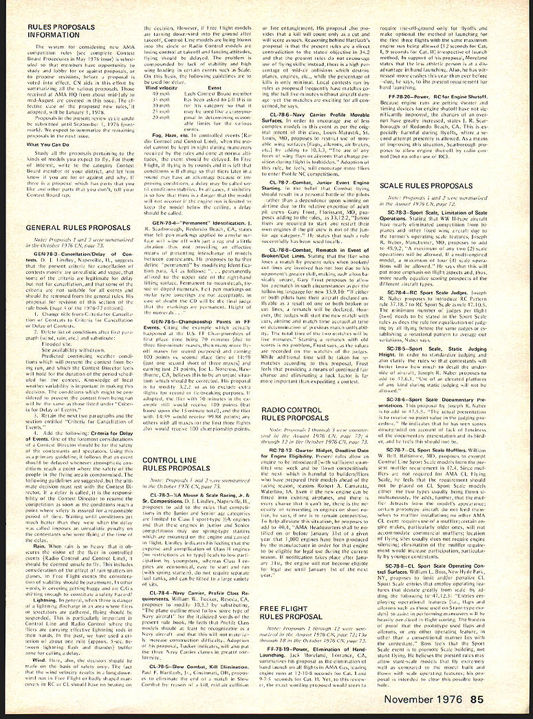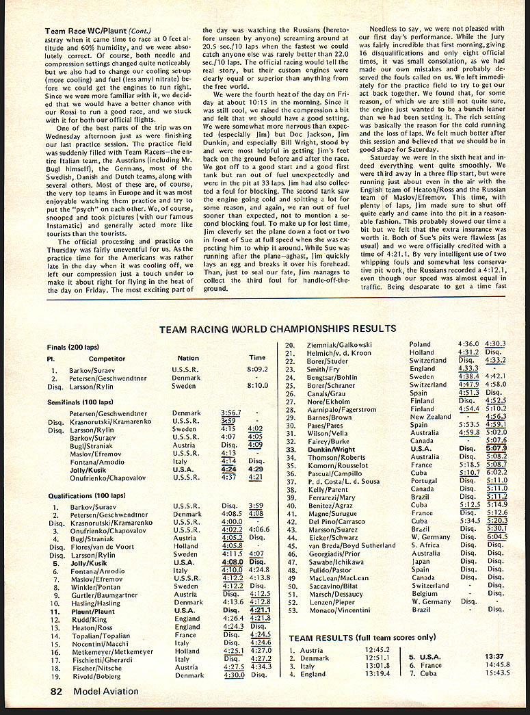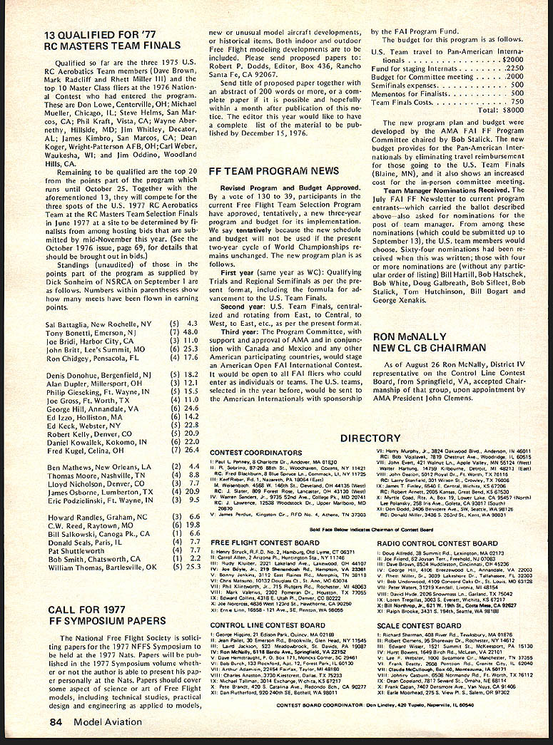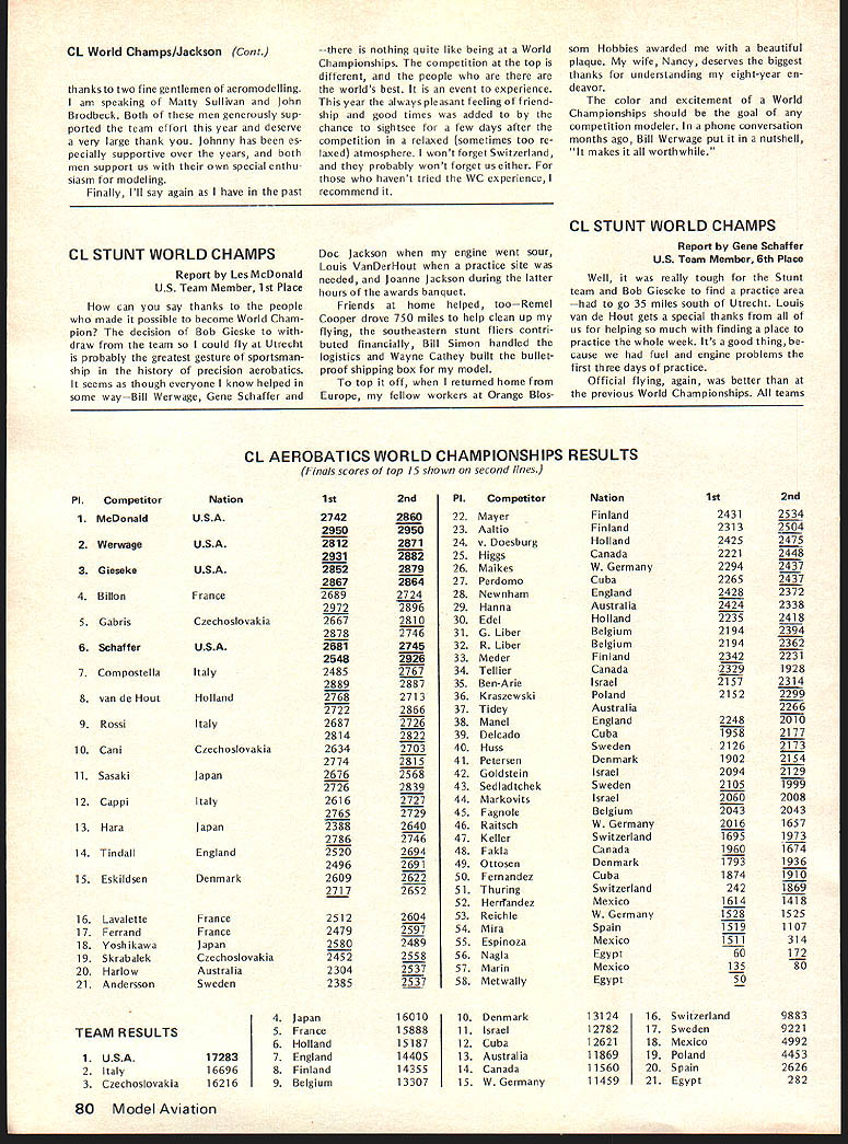NATS RESULTS 1976 CHAMPIONS Junior Jim Geraghty San Jose CA Senior Dale Elder Orlando FL Open Bob Sifleet Glen Rock PA Free Flight Bob Sifieet Glen Rock PA Indoor Jim Richmond Davidson NC Control Line Brent Busseli Dallas TX SPECIAL AWARDS Sterling Models Award Scaie static points category qualifying ficial flight Mike Gretz Montezuma IA Zlin Akrobat 526A Testor Trophy best model finish Greg Doe Charlotte NC Lii Toni Formula Pylon Racer Jim Walker Trophy winner iSO CL Stunt flyoff excluding appearance points Bob Hunt Piscataway NJ Danny Bartley Trophy CL Category Cham pion Brent Bussell Dallas TX McNeilI Cup high time regardless age FAI Power Gilbert Graunke Brookfield WI Mulvihill Trophy high time regardless age Unlimited Rubber Jim Lewis College Park GA Tulsa Glue Dobbers Trophy high time regard less age Outdoor HL Glider Ray Harper Granada Hills CA Stout Indoor Trophy high time regardless age Indoor Cabin Ron Ganser Pitts burgh PA Stout Commercial Trophy high time regard less age AMA FAI Indoor Stick Jim Richmond Davidson NC Dick Black Trophy high time regardless age Coupe dHiver Jim Lewis College Park GA EAA Plaques best homebuilt scale aircraft categories indicated FF Rubber Tom Stark Florissant MO Wittman Taliwind FF Gas Charles Schobloher Bloomfield Hills Ml Sorreil Hyperbipe CL Mark D Bauer Norridge IL Pitts S1-S RC Bob Underwood St Louis MO Bonzo Scatter Trophies top irs FE FAI A-2 Towline Glider Jon Watson Indianola IA No Jr flights FAI Power Wakefield Rubber Skyscrapers Trophies top Srs FE FAI A-2 Towline Glider Andrew Barron Annandale VA FAI Power Joseph P Mekina Barberton OH Wakefield Rub ber John Huber Harrisburg PA 1976 NATS ENTRIES Jr Sr Open No Contestants 1862211267 No Mechanics Entries Event Indoori 92 Entrants Stick Paper Stick Cabin FAI Stick Pen nyplane Easy B HL Glider AMA Scale Peanut Scale 5832 91333 1310 0425 25835 181137 302953 21034 6948 continued page 79 CL WORLD CHAMPS Report Dr Laird Jackson US Team Manager What can team manager say about WC good bad way Mostly good because no matter what happens experience remember bad organizational mat ters done undone Dutch gone overboard expenses think high price eliminated some eastern European competitors Arrangements frankly overpriced group moder ately inconvenient what got Im sure difficult run WC other people commented same point fairly consistent note friction about competition Acm Club people ClAM people frequently jabbing another quiet way also public washing dirty Dutch linen should have avoided Im referring Total lack settling Team Race flap over 1674 Flores Italian Dutch wife 828 Team Race pit man Dutch team matter Dutch Acro Club should have made public things Dutch modelers 45than compensated difficulties 55their warm reception friendly aid 14were helpful us ways 29 best weve 68recent years Stunt guys performed al 66most perfectly shame 112cant give three four first places Team 46Race team didnt make top three 63but showed comeback continued page 79 U S SWEEPS INDOOR WORLD CHAMPS Bud Romak Moraga CA new World Champion Indoor models two-flight total 78 minutes 58 seconds handily beat Ciapala Po land second 7203 Barr England third 7124 highest single flight World Champion ships also scored Romak39 minutes 36 seconds US team members Bucky Servaites Jim Richmond placed respectively 8th 9th although flight totals available press time Romaks winning score joined Servaites Richmond assured Team World Championship US England second Canada third Indoor World Championships held Cardington England Au gust 28-30 NEWSLET ACADEMY OF MODEL AERONAUTICS815 FIFTEENTH STREET NWWASHINGTON DC 20005 Congratulations CL Aerobatics World Champion Les McDonald below first place together outstanding performances Bill Werwage Gene Schaffer also led US team victory Bob Gieseke 1974 World Champ competing individual third NATS SCALE RESULTS INDOOR AMA SCALE J-S Comb sponsored Peck-Polymers 1William C HennClifton NJ Lacey M-10 2Charles SlaterFt Lauderdale FL 3Michael NallenChicopee MA Druine Turbulent 4Barry PalletGlen Head NY Hello-Super Courier 5Bruce PailetGlen Head NY Pilatus Turbo-Porter Open sponsored Model Builder Magazine 1Charles MarkosDeerfield Ml Westland Widgeon 2William HennClifton NJ Lacey M-1C 3Edward StollMt Clemens Ml 4Don SrullMcLean VA Lacey M-10 5Dan DominaPlainshoro NJ Piper Cub INDOOR PEANUT SCALE 1-S Comb sponsored Peck-Polymers 1William C HennClifton NJ Pike E 2Steven WitteCincinnati OH Itoh NBZ Eaglet 3Bruce PalletGlen Head NY Lacey M-10 4Michael PlotzkeMt Clemens Ml 5David NaultLynn MA Lacey M-10 Open sponsored Model Builder Magazine 1Charles LearoydWest Oroton MA Lacey M-10 2John MartinMiami FL Volksplane 3Jack McOillinrayToronto Ott CAN lsaacs Fury 4Elsie HeonClifton NJ Lucey M-10 5William HennClifton NJ Fike 8 CL AMA SCALE Junior sponsored 1Tom Pluker F8P-2 Bearcat 2Scoff Sheeks SE-SA 3Peter Bauer Shoestring 4Matthew Bauer Volksplane 5Paula Bauer Junkers D1 Peck-Polymers Gainesville TX Indianapolis IN Norridge IL Norridge IL Norridge IL Senior sponsored Peck-Polymers 1Michael SheeksIndianapolis IN J-3 Cub 2Murk BauerNorridge IL Piffs 51-S 3Detnis ChatEl Cerrito CA Fokker DRi Open sponsored JASCO 1Michael OreteMontnzuma IA ZIlo Akrobat 526A 2Norman SkuderiePurina OH Waco UMF3 3Robert BaldusDes Moines IA Spirit St Louis 4R M GransbackPhiladelphia PA Douglas C-124-C 5Richard SpauldiegFlint Ml Jenny JN4D Best Plight Achievement Michael D GrttzMontezuma IA ZIle Akrobat 526A CL SPORT SCALE Junior sponsored Lyndhurst Baromormers 1Mark TullisDayton OH Piper PA-12 Supercruiser 2Steve TalusDayton OH AM-23 Grace 3Steve ZickChicago IL Conquest Senior sponsored Lyodhuret Earestormers 1Mark BuuerNorridge IL P47-0 2Dat DsdobaMuekato MN T-60 Tenan 3Robert Hagedore JrLyndhurst OH Curtiss P-40F11 Warhawk Open sponsored Williams Bros 1Claude ShortUpper Marlboro MD Ryat PT 22 2Joseph ElbenLyodhurns OH Martin Baltimore A-3D 3William BossNew Hyde Park NY P-40 4Alvah SchuefferReading PA Grumman F3F-2 5Edward SchwerkoltBedford OH P