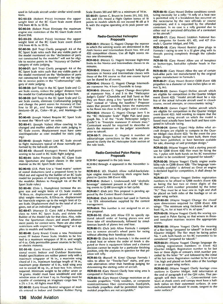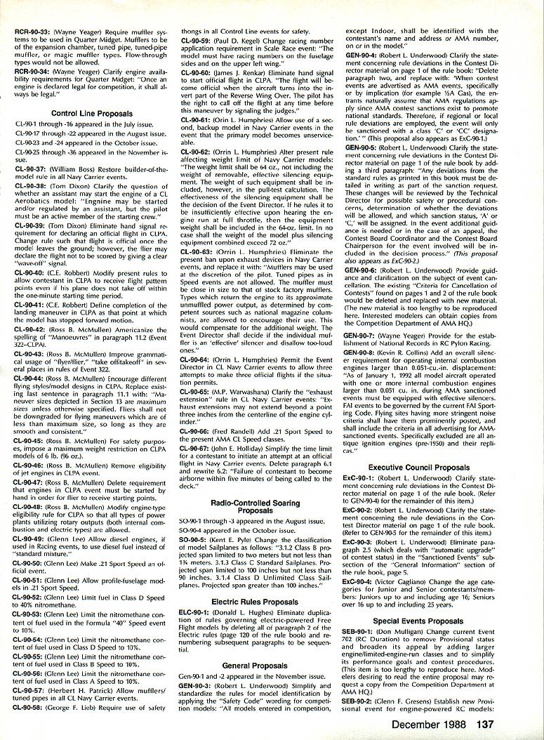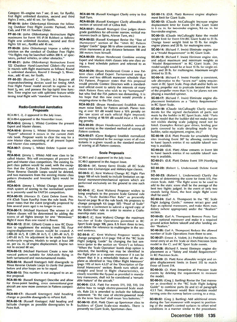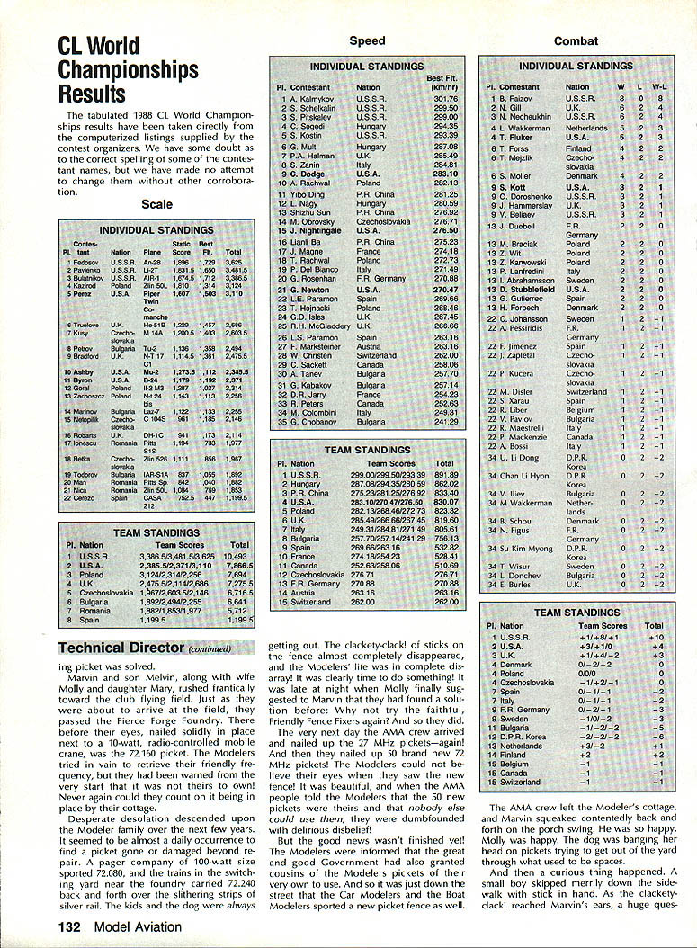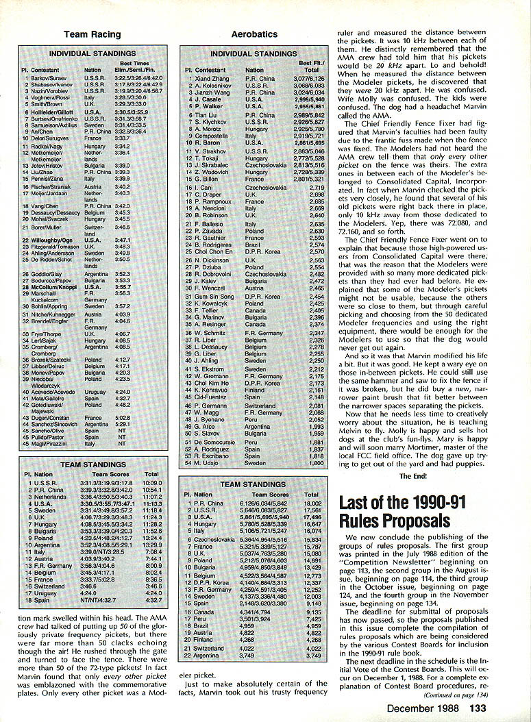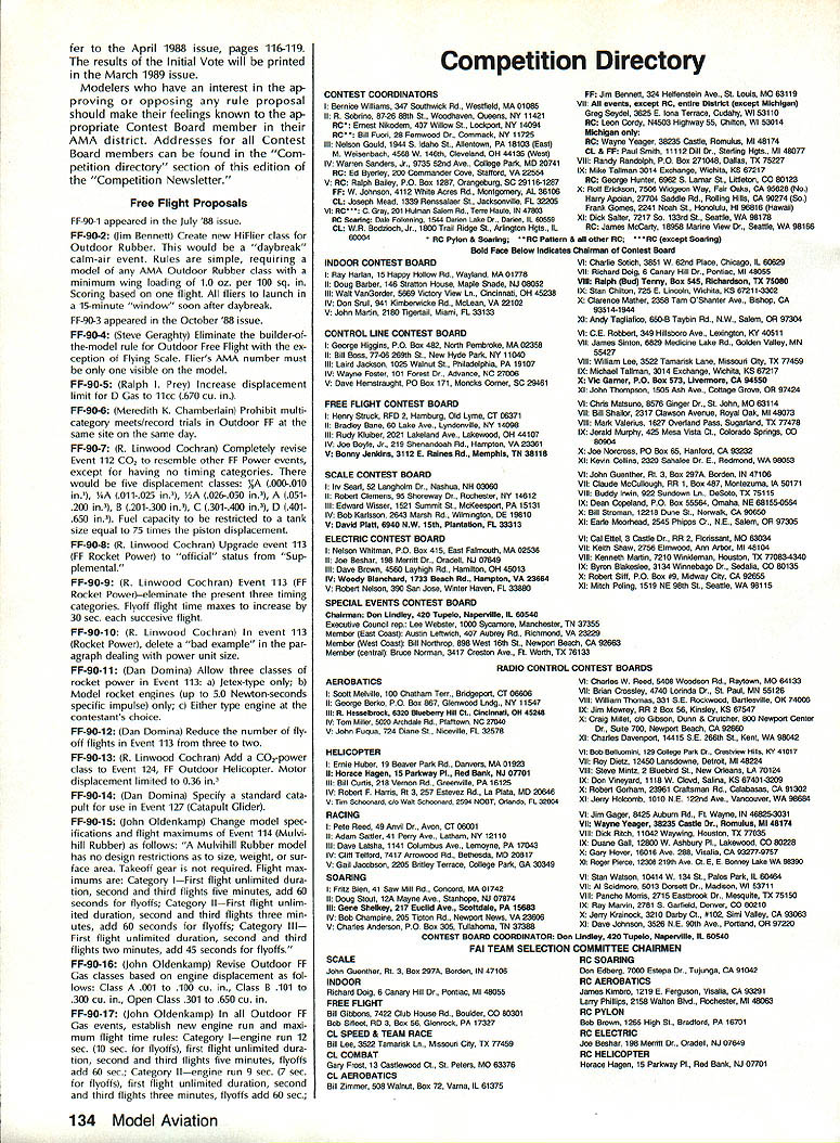 COMPETITYJ NEWSLETThT ACADEMY OF MODEL AERONAUTICS hAl IFjD 1810 SAMUEL MORSE DRIVE Note Technical Director W Bob Underwood FABLE Application Real Life Let us speak picket fences trust recall once-so-popular barrier sur rounded cottage nestled among arching trees beds brightly colored flowers Remember small boy picked up stick skipped merrily down side walk allowing noisemaker clack its measured tune against boards know almost-always-white-painted picket fence story about family lives acottage behind picket fences name Modeler Yep Mr Marvin Modeler wife Molly son Melvin daughter Mary Marvin motley modeler kept planes life cottage order must said never did figure out keep wife kids dog order decided build fence around cottage order keep kids dog other things out think am going include wife statement think again Marvin planning fence wife Molly asked what going look like majestic manner mild-mannered Marvin remarked would picket fence order dignify deed decided dedicate delightful picket radio frequencies could use fly wonderful wooden wonders marvelous Saturday morning Marvin dug holes set posts nailed up horizontal pieces National Records following new National Records have processed approved during month September 1988 IndoorCategory Ill Easy B Senior1805 Don Slusarczyk 8/20/88 Ornithopter Senior911 Don Slusarczyk 8/21/88 Intermediate Stick Senior 2324 Don Slusarczyk 8/21/88 Manhattan Cabin Senior832 Don Slusarczyk 8/21/88 IndoorCategory IV Easy B Junior1807 An drew R Tagliafico 8/5/88 Intermediate Stick Open3119 Earl Hoffman 9/5/88 Free FlightCategory III Electric Power Class Senior532 Melanie Sanford 9/3/88 Electric Power Class Open408 Curt Sanford 9/3/88 Control Line B Speed Open21823 mph Sher/Garzon/Brown 8/27/88 1/zA Speed Open 13819 mph Charles E Legg 9/10/88 ] which would hold pickets same day one pickets placed position along sidewalk first bore plate dedicating 26995 MHz second emblazoned 27045 went through four pickets Marvin proud Molly con fused couldnt figure out such few pickets ever going keep dog kids yard Marvin Molly began realize something amiss first kid came along evening stick hand made no melodious clackety-clack sounded gathering darkness heart-stopping occasional clack punc tuated long periods ponderous si lence Molly unhappy Marvin mor tified dog gone following day Marvin sat front steps dolefully deliberating dilemma whole problem solved trucker running 500 watts linear CB came along wiped out whole darn fence Poor Marvin didnt know turn Molly infinite wisdom suggested contact Friendly Fence Fixers thats exactly what Marvin did fol lowing day AMA crew arrived zippidy-zap six 27 MHz pickets back place through govern mental goings-on glorious FCC AMA repair crew able add seven new pickets labeled 72080 MHz 72160 MHz etc Now AMA guys did caut/on Marvin terrible talking trucker could easily return blow twenty-sevens away should exercise carefully considered caution using Marvin also told new 72-type pickets shared another yard present time nobody really using yard delightful decade Marvins picket fence graced area problems time time discovered dog still got out because small kids $995 walkie-talkies cracked picket two Marvin cringed time heard clashing gears 18 whining tires made work day glanced out window sipping morning mug mocha shocked gasp escaped lips dashed down porch steps picket gone looked high low 72160 no found until eve ning son Melvin rushed home breath lessly school case miss Coneinued page 132 held August 11-20 Paris France Larry Jolly Seth Dawson Richard Spicer alternate member Gene Englegau 88 Nats Found set car keys found turned AMA Nats HQ Chesapeake VA Per sons believe may set keys should call John Worth Joyce Hager AMA HQ 703/435-0750 between hours 730 am 400 pm EDSI weekdays claim caller can cor rectly identify keys will re turned immediately RC Tournament Champions Returns Steve Rojecki Las Vegas NV will defend title against 19 worlds topranking RC Aerobatics pilots $118000 Ninth International Tournament Champi ons hosted Circus Circus Hotel/Casino date will November 10-13 1988 Las Vegas Competitors invited contest ganizers Ten US re maining 10 abroad Nations represented 1988 event include Aus tria Australia Canada England Ireland Ja pan Liechtenstein West Germany Contest officials include long list inter nationally recognized model aviation ex perts including Contest Director Phil Kraft Chief Judge Jim Doc Edwards Spectators invited free charge free bus transportation will provided Circus Circus flying site R/C Model Airfield North Las Vegas Regional Park Contest information may obtained writing Public Relations Dept Cir cus Circus PO Box 14967 Las Vegas NV 89114-4967 Reservations Circus Circus may ob tained via toll-free telephone call continental US outside Ne vada 800-634-3450 dial direct 702 7340410 contact AMA HQ informa tion reservations New US F3B Team Selected recently concluded team selection finals following modelers suc- ieve IlojecKi Las vegas ravj uena RIr cessful competitors thereby becoming lines pilot will defend title forthteam will represent US coming Ninth International RC Tournament 1989 RC Soaring World Championships Champions Las Vegas NV December 1988 131 RESTON VA 22090 CL World Championships Results tabulated 1988 CL World Champion ships results have taken directly computerized listings supplied contest organizers have some doubt correct spelling some contes tant names have made no attempt change other corrobora tion ing picket solved Marvin son Melvin along wife Molly daughter Mary rushed frantically toward club flying field Just about arrive field passed Fierce Forge Foundry before eyes nailed solidly place next 10-watt radio-controlled mobile crane 72160 picket Modelers tried vain retrieve friendly fre quency warned very start own Never again could count being place cottage Desperate desolation descended upon Modeler family over next few years seemed almost daily occurrence find picket gone damaged beyond re pa
