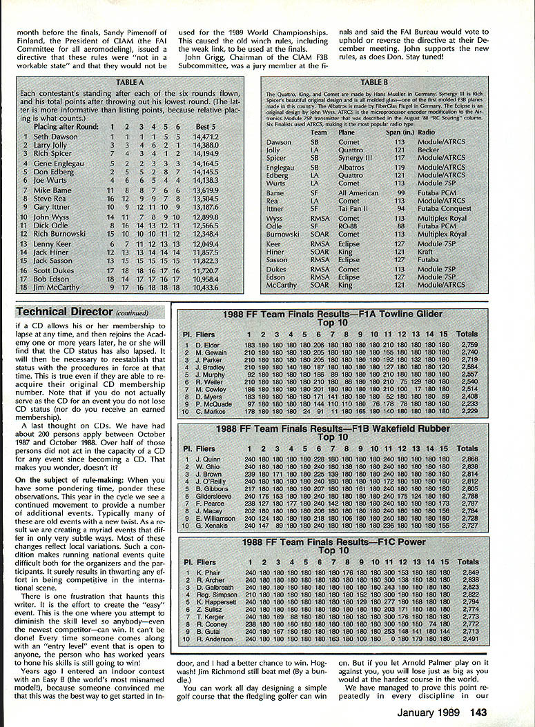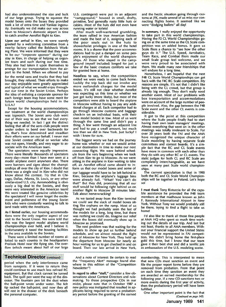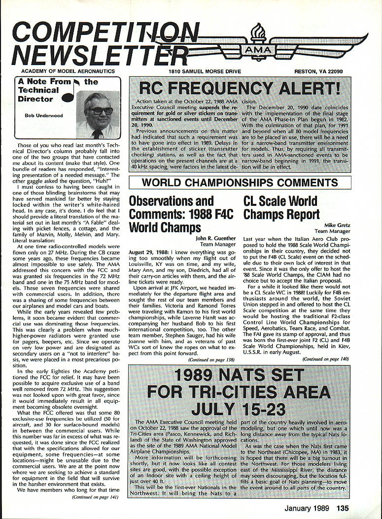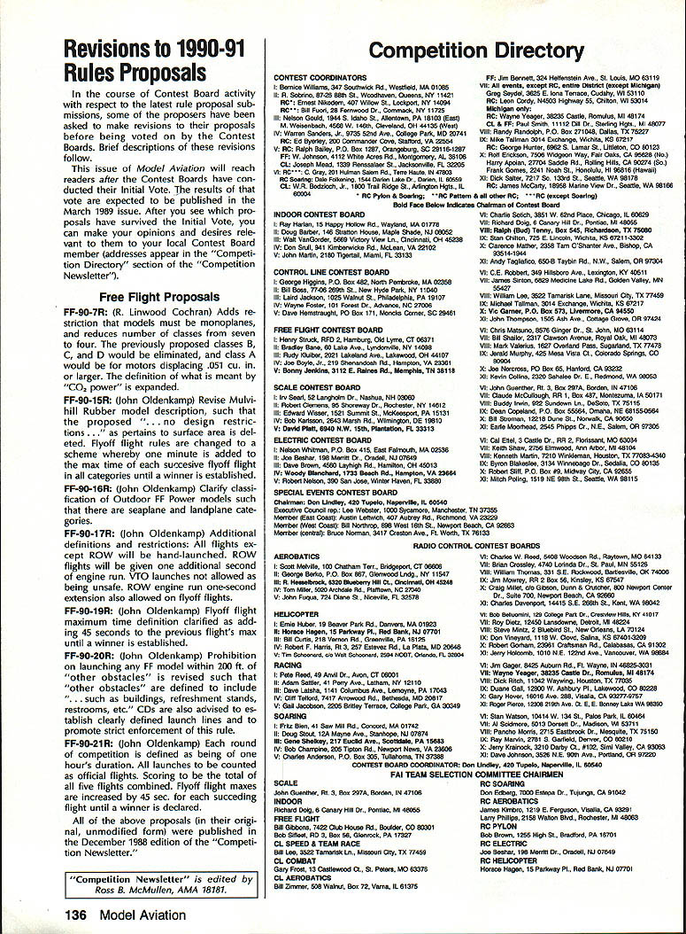 COMPETI T&* NEWSLETTi1 ACADEMY OF MODEL AERONAUTICS Note Pro Technical m Director Bob Underwood 1 [hose read last months Tech nical Directors column probably fall two groups have contacted about its content make style bundle readers has responded Interest ing presentation needed message other gaggle asked question Huh must confess having caught blinding brainstorms may have served mankind far better staying locked within writers white-haired head case its done feel should provide literal translation ma terial set out last months Fable deal ing picket fences cottage family Marvin Molly Melvin Mary Literal translation time radio-controlled models flown 27 MHz During CB craze some years ago frequencies became almost impossible use safely AMA addressed concern FCC granted six frequencies 72 MHz band 75 MHz band mod els seven frequencies shared commercial users addition sharing some frequencies between airplanes model cars boats early years revealed few prob lems soon became evident commer cial use dominating frequencies clearly problem muchhigher-power radiators granted use pagers beepers etc Since operate very low power designated secondary users interfere ba sis placed precarious po sition early Eighties Academy peti tioned FCC relief may have possible acquire exclusive use band well removed 72 MHz suggestion looked upon great favor since would immediately result equip ment becoming obsolete overnight What FCC offered some 80 exclusive-use frequencies utilized 50 aircraft 30 surface-bound models between commercial users number far excess what re quested done since FCC realized specifications allowed equipment some frequenciesat some locationsmight unusable due commercial users point now seeking achieve standard equipment field will survive harsher environment exists have members long time Continued page 141 U IBiD SAMUEL MORSE DRIVE RESTON VA 22090 Observations andCL Scale World Comments 1988 F4C Champs Report World Champs John R Guenther Team Manager August 29 1988 knew everything go ing too smoothly flight out Louisville KY time wife Mary Ann son Diedrich carry-on articles air line tickets ready Upon arrival JFK Airport headed im mediately departure flight area sought rest team members families Victoria Ramond Torres traveling Ramon first world championships Laverne Hanft ac companying husband Bob first international competition too other team member Stephen Sauger wife Joanne him veterans past WCs sort knew ropes what ex pect point forward Continued page 138 Mike Gretz Team Manager Last year Italian Aero Club pro posed hold 1988 Scale World Champi onships country decided put F4B CL Scale event sched ule due own lack interest event Since offer host 88 Scale World Champs ClAM no choice accept Italian proposal looked like would CL Scale WC 1988 Luckily F4B en thusiasts around world Soviet Union stepped offered host CL Scale competition same time would hosting traditional F2-class Control Line World Championships Speed Aerobatics Team Race Combat FAI gave its stamp approval thus born first-ever joint F2 CL F4B Scale World Championships held Kiev USSR early August January 1989 135 WORLD CHAMPIONSHIPS COMMENTS Continued page 140 Revisions 1990-91 Rules Proposals course Contest Board activity respect latest rule proposal sub missions some proposers have asked make revisions proposals before being voted Contest Boards Brief descriptions revisions follow issue Model Aviation will reach readers after Contest Boards have con ducted Initial Vote results vote expected published March 1989 issue After see pro posals have survived Initial Vote can make opinions desires rele vant to local Contest Board member addresses appear Competi tion Directory section Competition Newsletter Free Flight Proposals FF-90-7R R Linwood Cochran Adds re striction models must monoplanes reduces number classes seven four previously proposed classes B C D would eliminated class would motors displacing 051 cu larger definition what meant CO2 power expanded FF-90-15R John Oldenkamp Revise Mulvi hill Rubber model description such proposed design restric tions rtains surface area del eted Flyoff flight rules changed scheme whereby minute added max time succesive flyoff flight categories until winner established FF-90-16R John Oldenkamp Clarify classi fication Outdoor FF Power models such seaplane landplane cate gories FF-90-17R John Oldenkamp Additional definitions restrictions flights ex cept ROW will hand-launched ROW flights will given additional second engine run VTO launches allowed being unsafe ROW engine run onesecond extension also allowed flyoff flights FF-90-19R John Oldenkamp Flyoff flight maximum time definition clarified add ing 45 seconds previous flights max until winner established FF-90-20R John Oldenkamp Prohibition launching FF model within 200 ft other obstacles revised such other obstacles defined include .. such buildings refreshment stands restrooms etc CDs also advised es tablish clearly defined launch lines promote strict enforcement rule FF-90-21R John Oldenkamp round competition defined being hours duration launches counted official flights Scoring total five flights combined Flyoff flight maxes increased 45 sec succeding flight until winner declared above proposals origi nal unmodified form published December 1988 edition Competi tion Newsletter Competition Directory CONTEST COORDINATORS I Bernice Williams 347 Southarick Rd Westfield MA 01085 II R Sobrino 87-2688th St Woodhaven Queens NY 11421 RC Ernest Nikodem 407 Willow St Lockport NY 14094 RC Bill Fuori 28 Fernwood Dr Commack NY 11725 Ill Nelson Gould 1944 S Idaho St Allentown PA 18103 East M Weisenbach 4588 W 140th cleveland OH 44135 West lv Warms Sanders Jr 9735 52nd Ave Coltege Park MD 20741 RC Ed Byarley 200 Commander Cove Stafford vA 22554 v RC Ralph Bailey PO Boa 1287 Orangeburg sc 29118-1287 FF W Johnson 4112 White Acres Rd Montgomery AL 36106 CL Joseph Mead 1339 Rermsalaer St Jacksonville FL 32205 VI RC C Gray 201 Human Siam Rd Terw Haste 