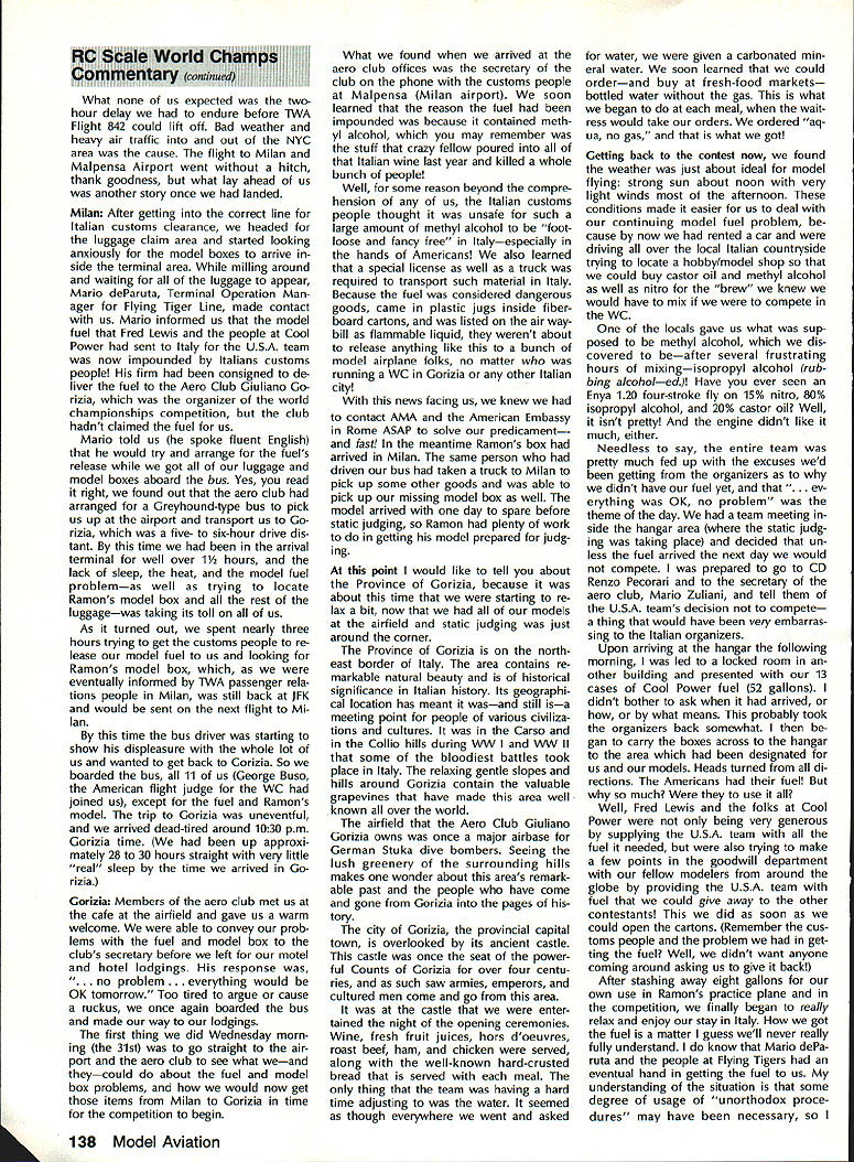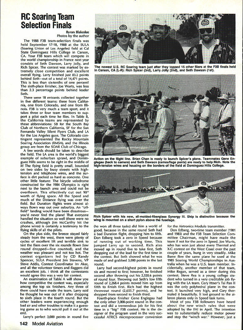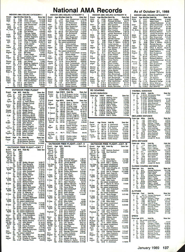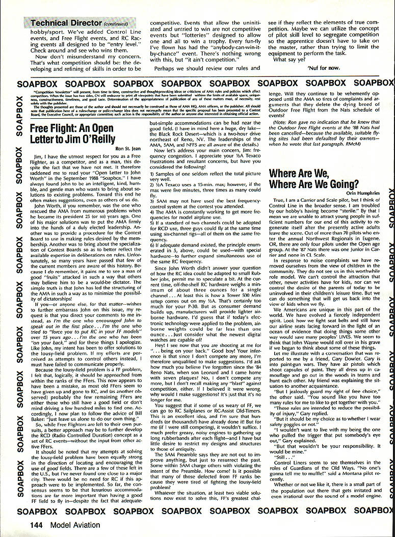 COMPETI T&* NEWSLETTi1 ACADEMY OF MODEL AERONAUTICS Note Pro Technical m Director Bob Underwood 1 [hose read last months Tech nical Directors column probably fall two groups have contacted about its content make style bundle readers has responded Interest ing presentation needed message other gaggle asked question Huh must confess having caught blinding brainstorms may have served mankind far better staying locked within writers white-haired head case its done feel should provide literal translation ma terial set out last months Fable deal ing picket fences cottage family Marvin Molly Melvin Mary Literal translation time radio-controlled models flown 27 MHz During CB craze some years ago frequencies became almost impossible use safely AMA addressed concern FCC granted six frequencies 72 MHz band 75 MHz band mod els seven frequencies shared commercial users addition sharing some frequencies between airplanes model cars boats early years revealed few prob lems soon became evident commer cial use dominating frequencies clearly problem muchhigher-power radiators granted use pagers beepers etc Since operate very low power designated secondary users interfere ba sis placed precarious po sition early Eighties Academy peti tioned FCC relief may have possible acquire exclusive use band well removed 72 MHz suggestion looked upon great favor since would immediately result equip ment becoming obsolete overnight What FCC offered some 80 exclusive-use frequencies utilized 50 aircraft 30 surface-bound models between commercial users number far excess what re quested done since FCC realized specifications allowed equipment some frequenciesat some locationsmight unusable due commercial users point now seeking achieve standard equipment field will survive harsher environment exists have members long time Continued page 141 U IBiD SAMUEL MORSE DRIVE RESTON VA 22090 Observations andCL Scale World Comments 1988 F4C Champs Report World Champs John R Guenther Team Manager August 29 1988 knew everything go ing too smoothly flight out Louisville KY time wife Mary Ann son Diedrich carry-on articles air line tickets ready Upon arrival JFK Airport headed im mediately departure flight area sought rest team members families Victoria Ramond Torres traveling Ramon first world championships Laverne Hanft ac companying husband Bob first international competition too other team member Stephen Sauger wife Joanne him veterans past WCs sort knew ropes what ex pect point forward Continued page 138 Mike Gretz Team Manager Last year Italian Aero Club pro posed hold 1988 Scale World Champi onships country decided put F4B CL Scale event sched ule due own lack interest event Since offer host 88 Scale World Champs ClAM no choice accept Italian proposal looked like would CL Scale WC 1988 Luckily F4B en thusiasts around world Soviet Union stepped offered host CL Scale competition same time would hosting traditional F2-class Control Line World Championships Speed Aerobatics Team Race Combat FAI gave its stamp approval thus born first-ever joint F2 CL F4B Scale World Championships held Kiev USSR early August January 1989 135 WORLD CHAMPIONSHIPS COMMENTS Continued page 140 Revisions 1990-91 Rules Proposals course Contest Board activity respect latest rule proposal sub missions some proposers have asked make revisions proposals before being voted Contest Boards Brief descriptions revisions follow issue Model Aviation will reach readers after Contest Boards have con ducted Initial Vote results vote expected published March 1989 issue After see pro posals have survived Initial Vote can make opinions desires rele vant to local Contest Board member addresses appear Competi tion Directory section Competition Newsletter Free Flight Proposals FF-90-7R R Linwood Cochran Adds re striction models must monoplanes reduces number classes seven four previously proposed classes B C D would eliminated class would motors displacing 051 cu larger definition what meant CO2 power expanded FF-90-15R John Oldenkamp Revise Mulvi hill Rubber model description such proposed design restric tions rtains surface area del eted Flyoff flight rules changed scheme whereby minute added max time succesive flyoff flight categories until winner established FF-90-16R John Oldenkamp Clarify classi fication Outdoor FF Power models such seaplane landplane cate gories FF-90-17R John Oldenkamp Additional definitions restrictions flights ex cept ROW will hand-launched ROW flights will given additional second engine run VTO launches allowed being unsafe ROW engine run onesecond extension also allowed flyoff flights FF-90-19R John Oldenkamp Flyoff flight maximum time definition clarified add ing 45 seconds previous flights max until winner established FF-90-20R John Oldenkamp Prohibition launching FF model within 200 ft other obstacles revised such other obstacles defined include .. such buildings refreshment stands restrooms etc CDs also advised es tablish clearly defined launch lines promote strict enforcement rule FF-90-21R John Oldenkamp round competition defined being hours duration launches counted official flights Scoring total five flights combined Flyoff flight maxes increased 45 sec succeding flight until winner declared above proposals origi nal unmodified form published December 1988 edition Competi tion Newsletter Competition Directory CONTEST COORDINATORS I Bernice Williams 347 Southarick Rd Westfield MA 01085 II R Sobrino 87-2688th St Woodhaven Queens NY 11421 RC Ernest Nikodem 407 Willow St Lockport NY 14094 RC Bill Fuori 28 Fernwood Dr Commack NY 11725 Ill Nelson Gould 1944 S Idaho St Allentown PA 18103 East M Weisenbach 4588 W 140th cleveland OH 44135 West lv Warms Sanders Jr 9735 52nd Ave Coltege Park MD 20741 RC Ed Byarley 200 Commander Cove Stafford vA 22554 v RC Ralph Bailey PO Boa 1287 Orangeburg sc 29118-1287 FF W Johnson 4112 White Acres Rd Montgomery AL 36106 CL Joseph Mead 1339 Rermsalaer St Jacksonville FL 32205 VI RC C Gray 201 Human Siam Rd Terw Haste 